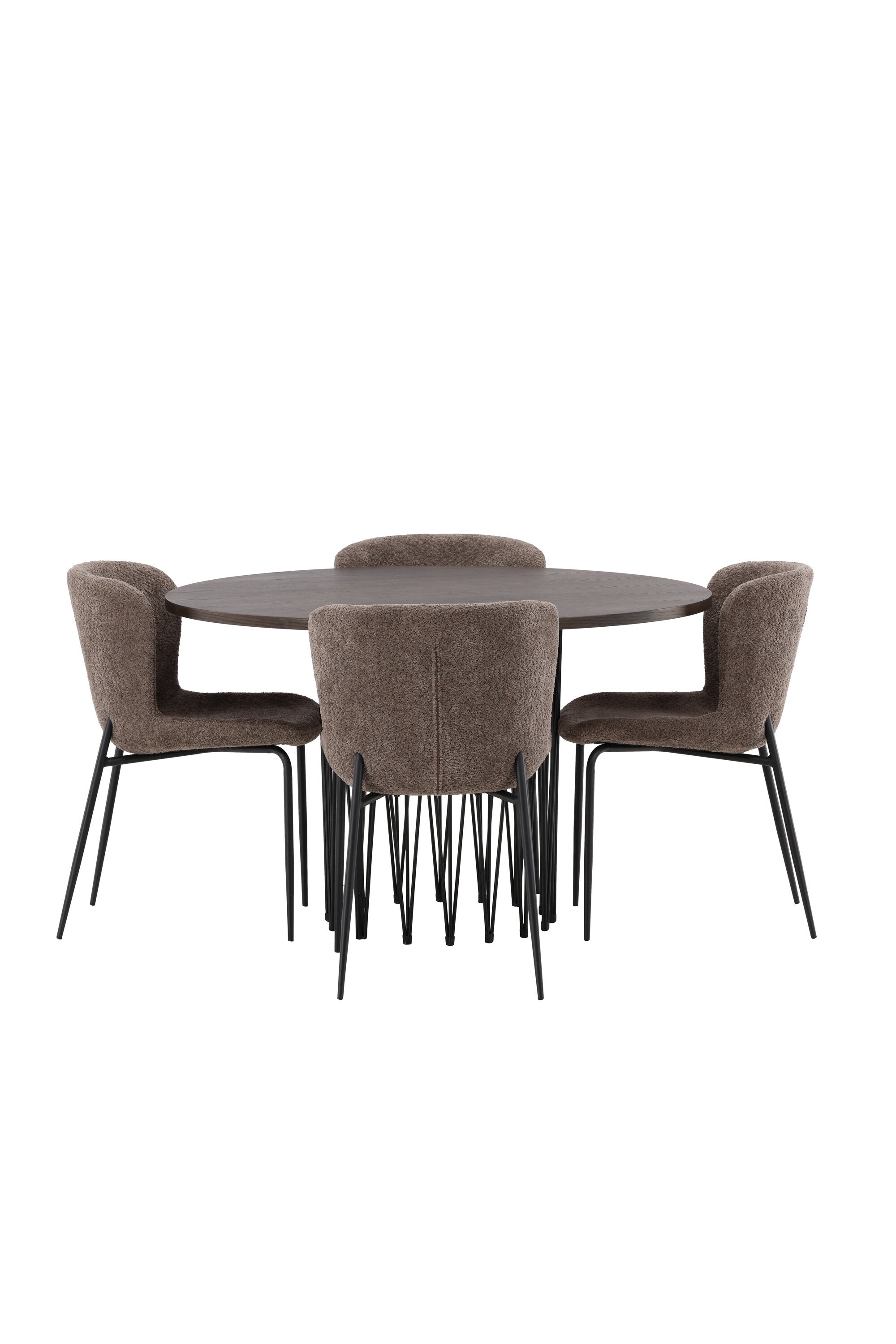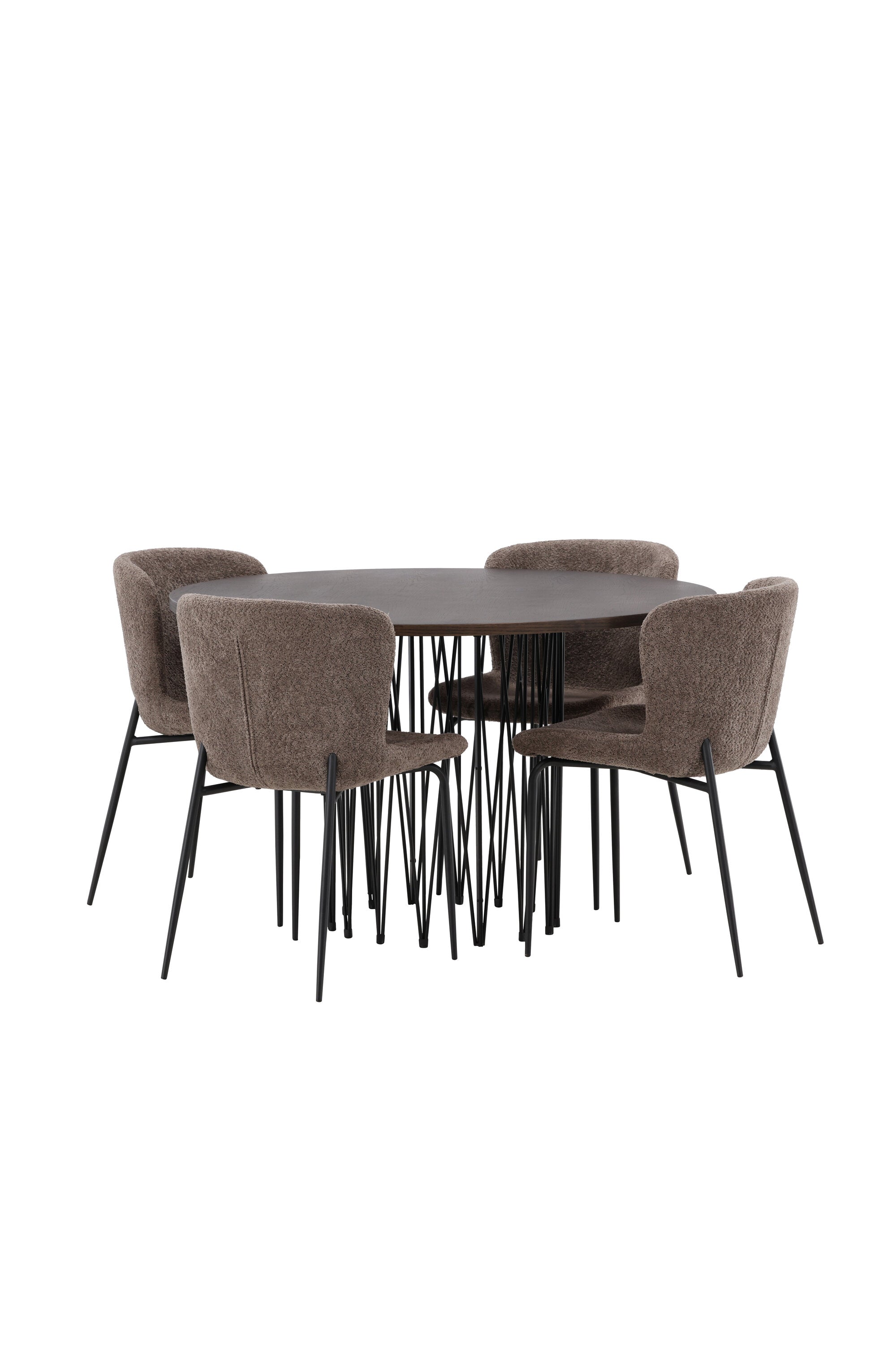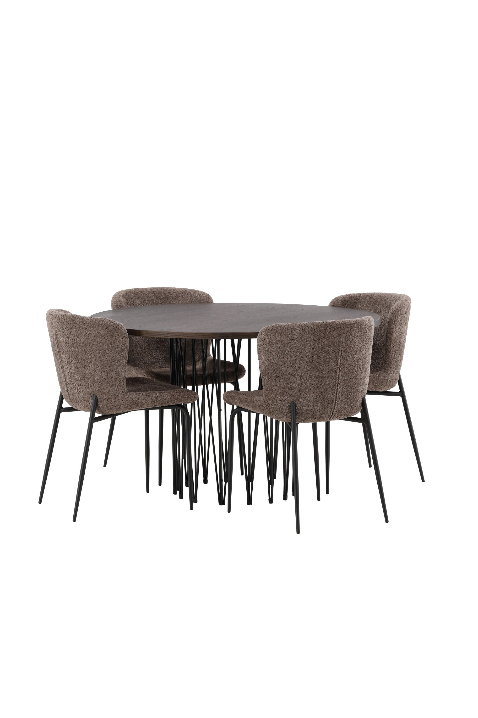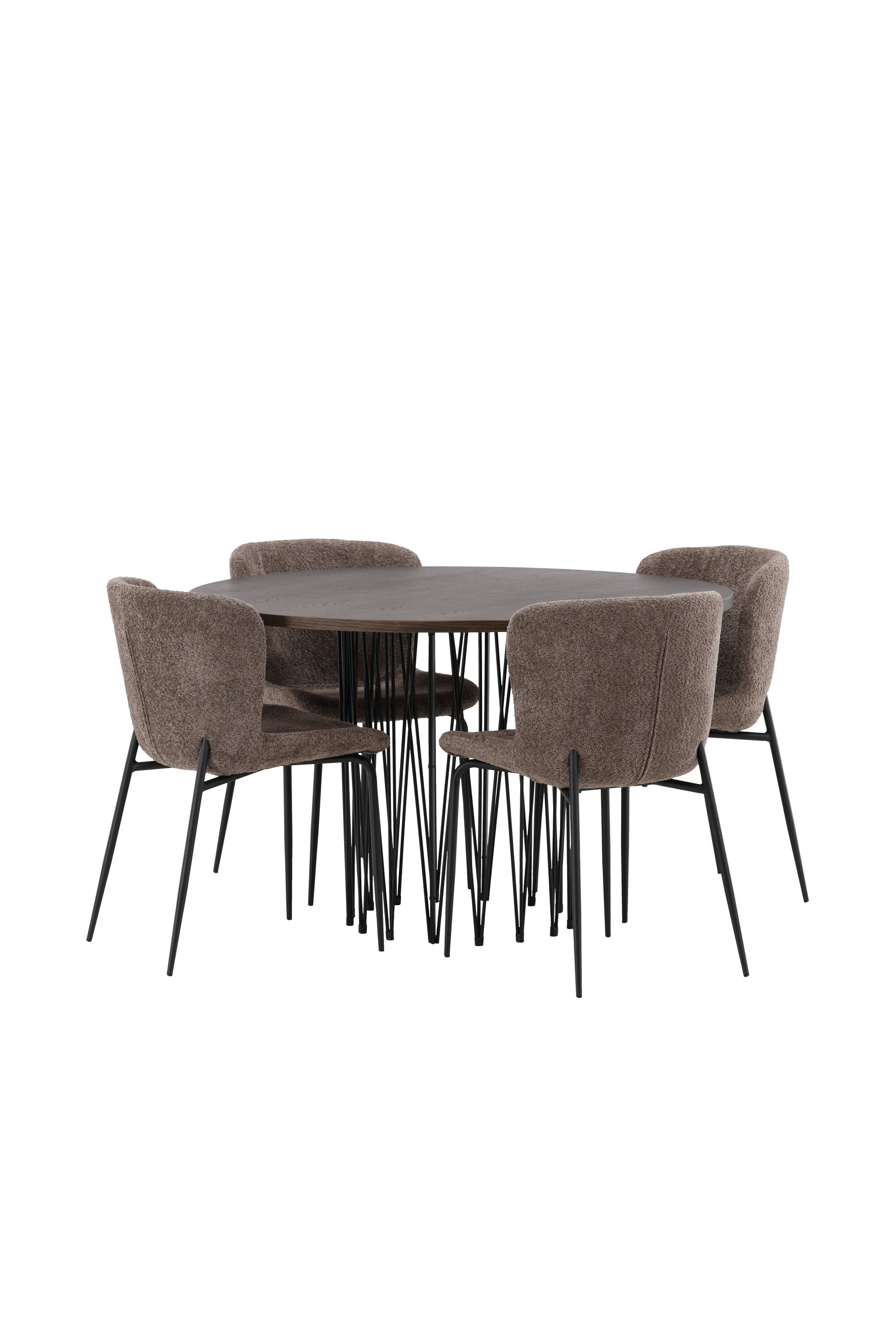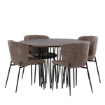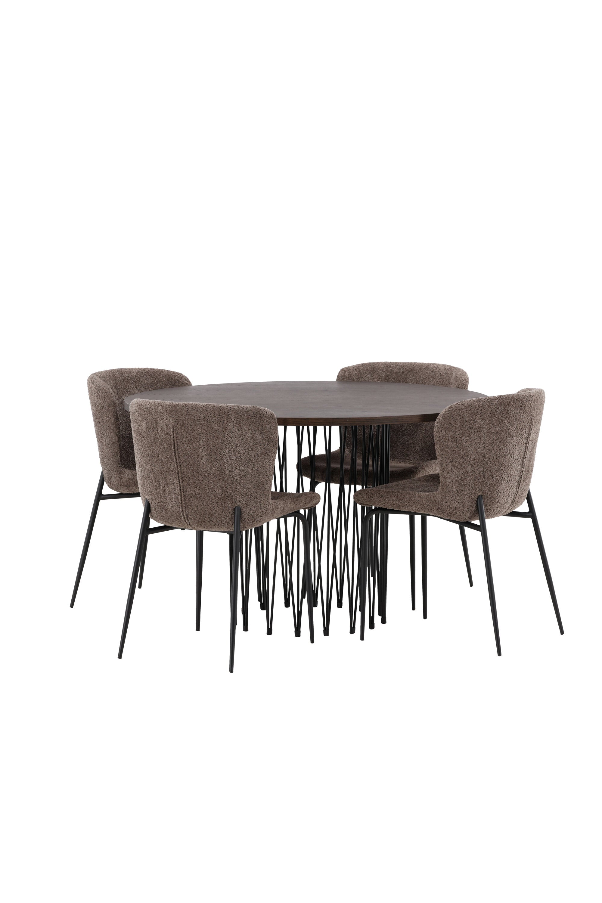 Tato jídelní sestava vyzařuje pohodlí, moderní design a elegantní tvary! Náš kulatý jídelní stůl Stone má fantastický skandinávský design, který se hodí k davu. Stůl má krásnou hnědou desku z MDF s dýhou a ozdobný rám ve tvaru válce z černého kovu. Zde v dokonalé kombinaci s našimi pohodlnými jídelními židlemi ze série Modesto. Židle je celočalouněná šedou látkou bouclé se stylovými minimalistickými nohami v černém kovu. Mírně zaoblená záda a čalouněný sedák poskytují extra pohodlí a rozšiřují příjemné jídlo kolem jídelního stolu. Mělo by být příjemné si na chvíli sednout!