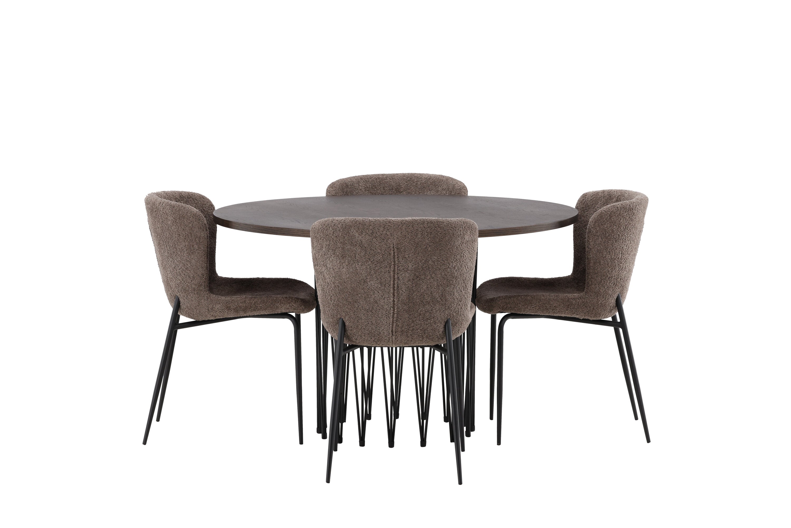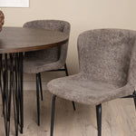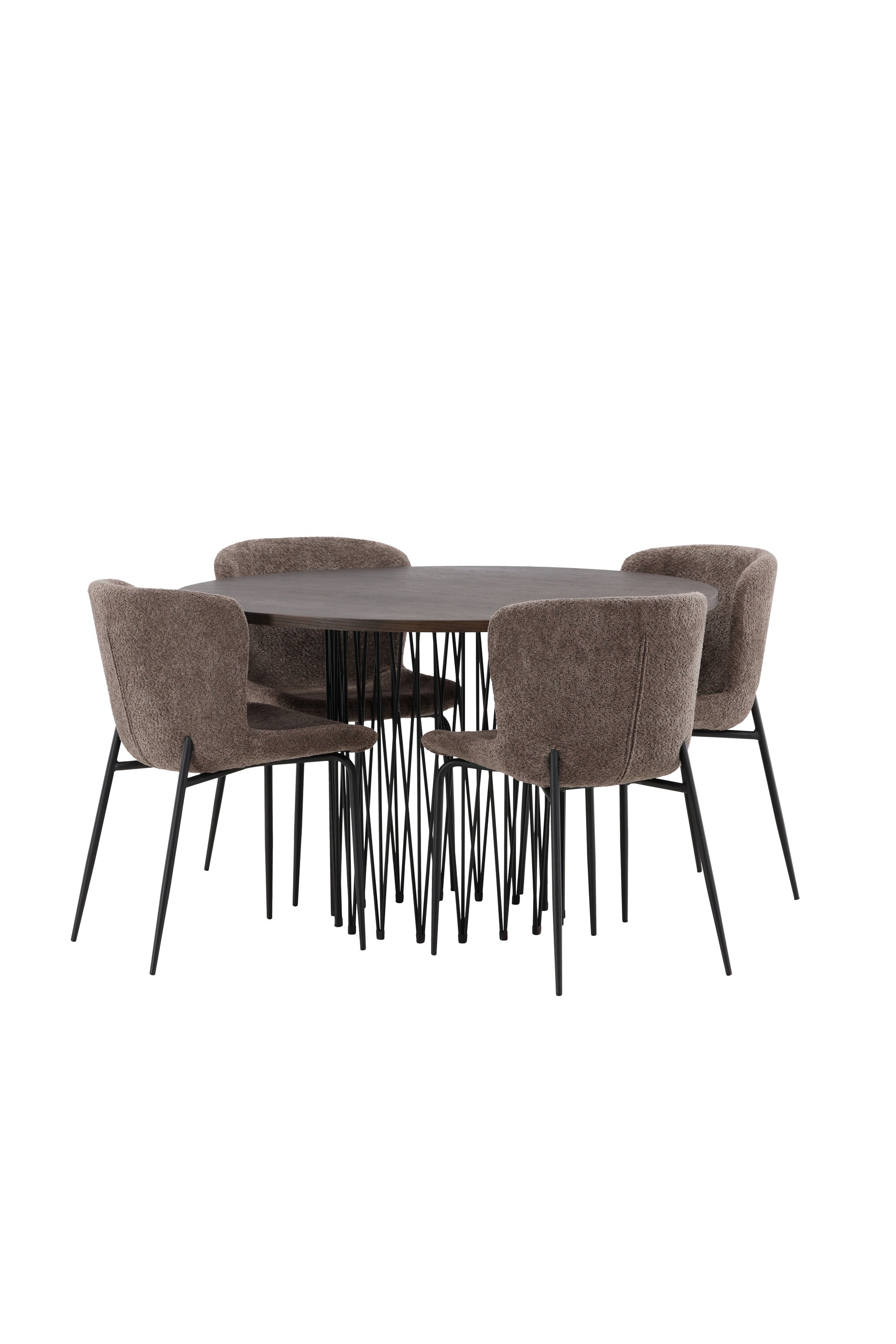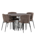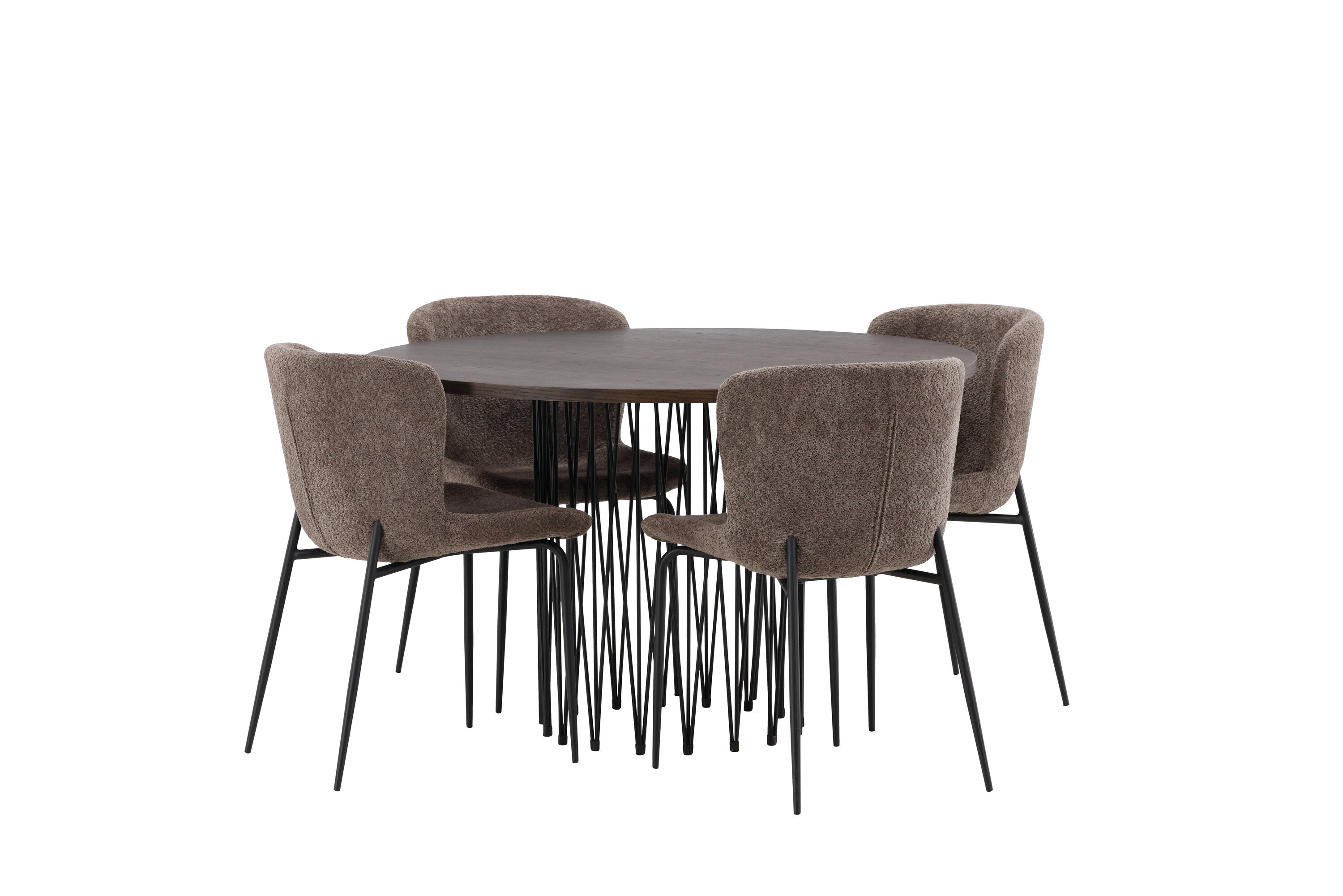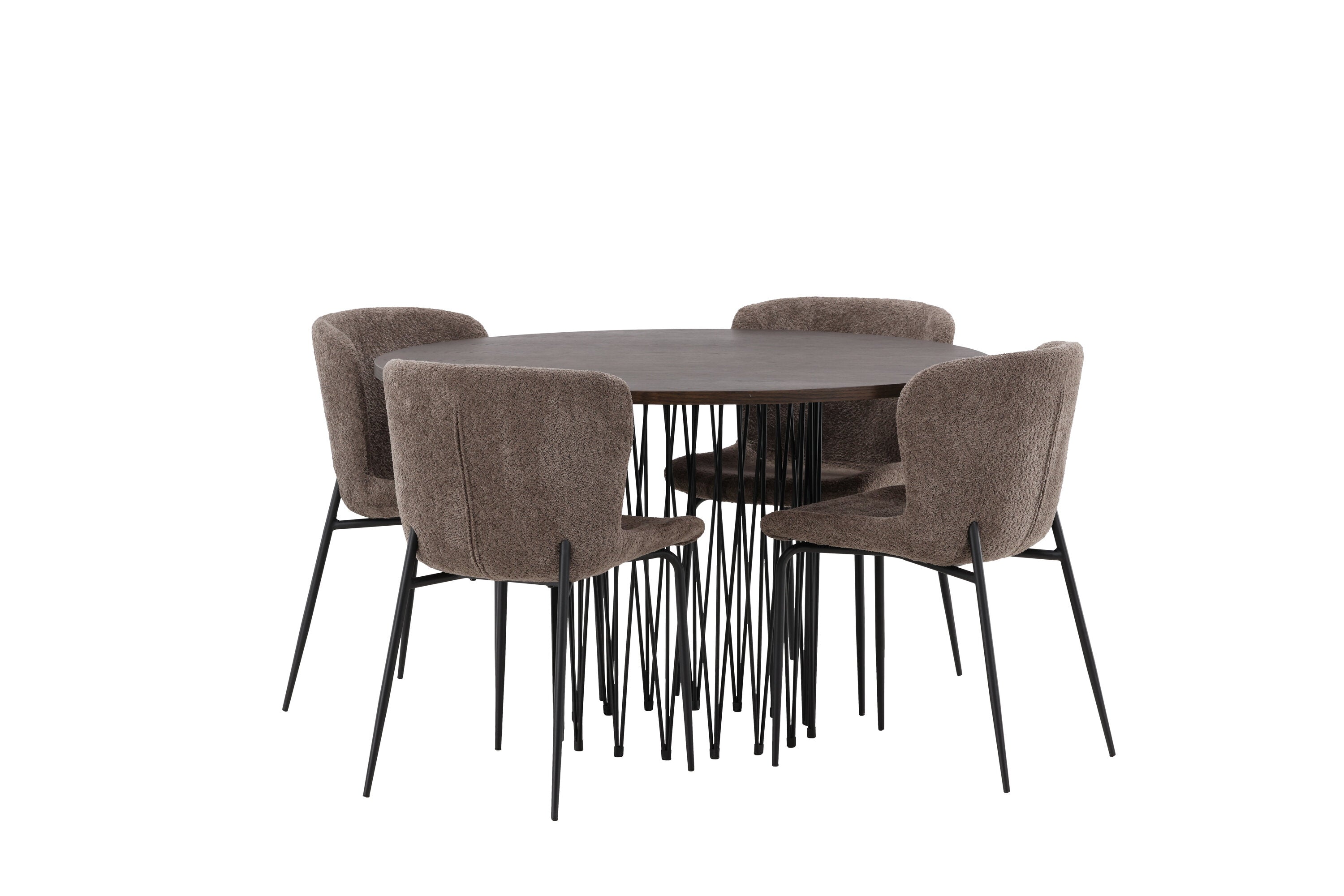 Tato jídelní sestava vyzařuje pohodlí, moderní design a elegantní tvary! Náš kulatý jídelní stůl Stone má fantastický skandinávský design, který se hodí k davu. Stůl má krásnou hnědou desku z MDF s dýhou a ozdobný rám ve tvaru válce z černého kovu. Zde v dokonalé kombinaci s našimi pohodlnými jídelními židlemi ze série Modesto. Židle je celočalouněná šedou látkou bouclé se stylovými minimalistickými nohami v černém kovu. Mírně zaoblená záda a čalouněný sedák poskytují extra pohodlí a rozšiřují příjemné jídlo kolem jídelního stolu. Mělo by být příjemné si na chvíli sednout!