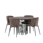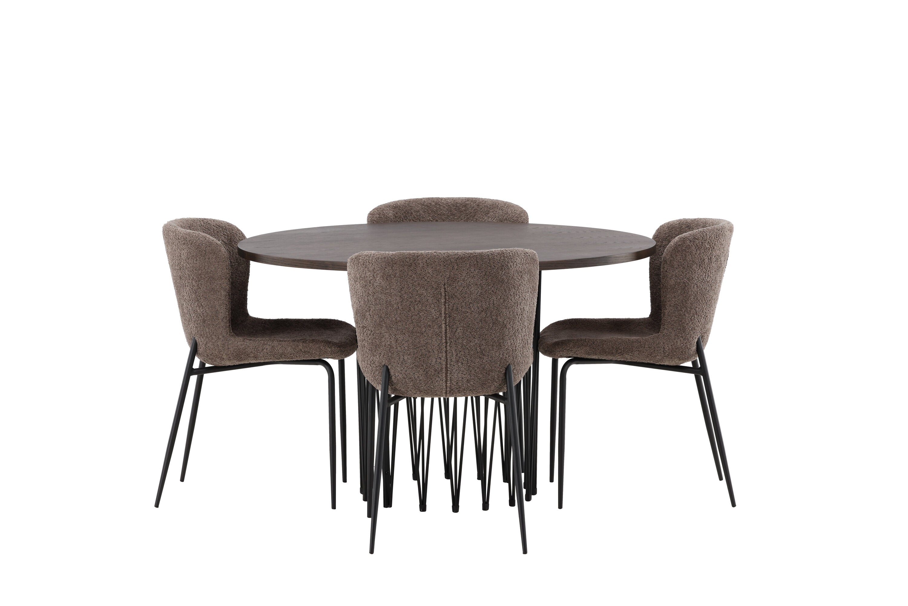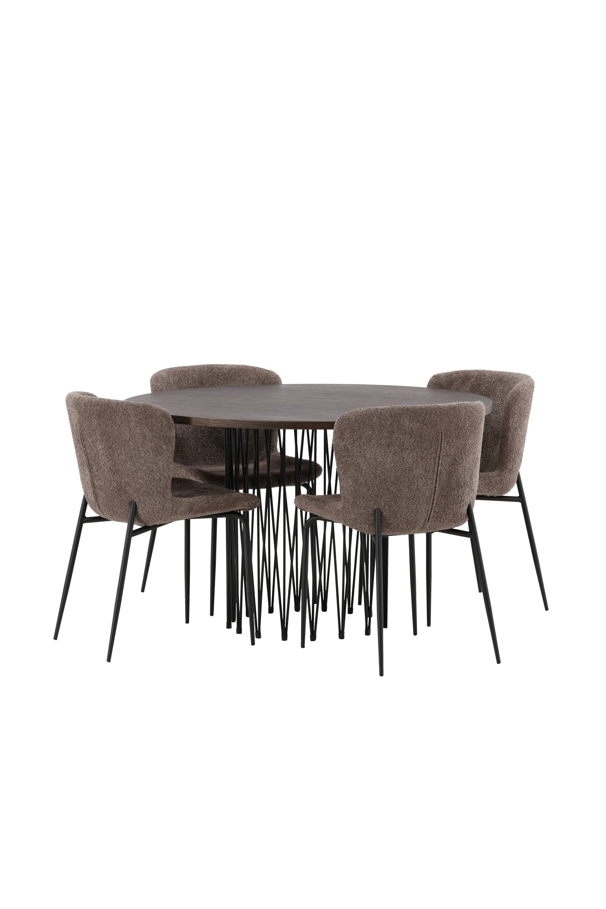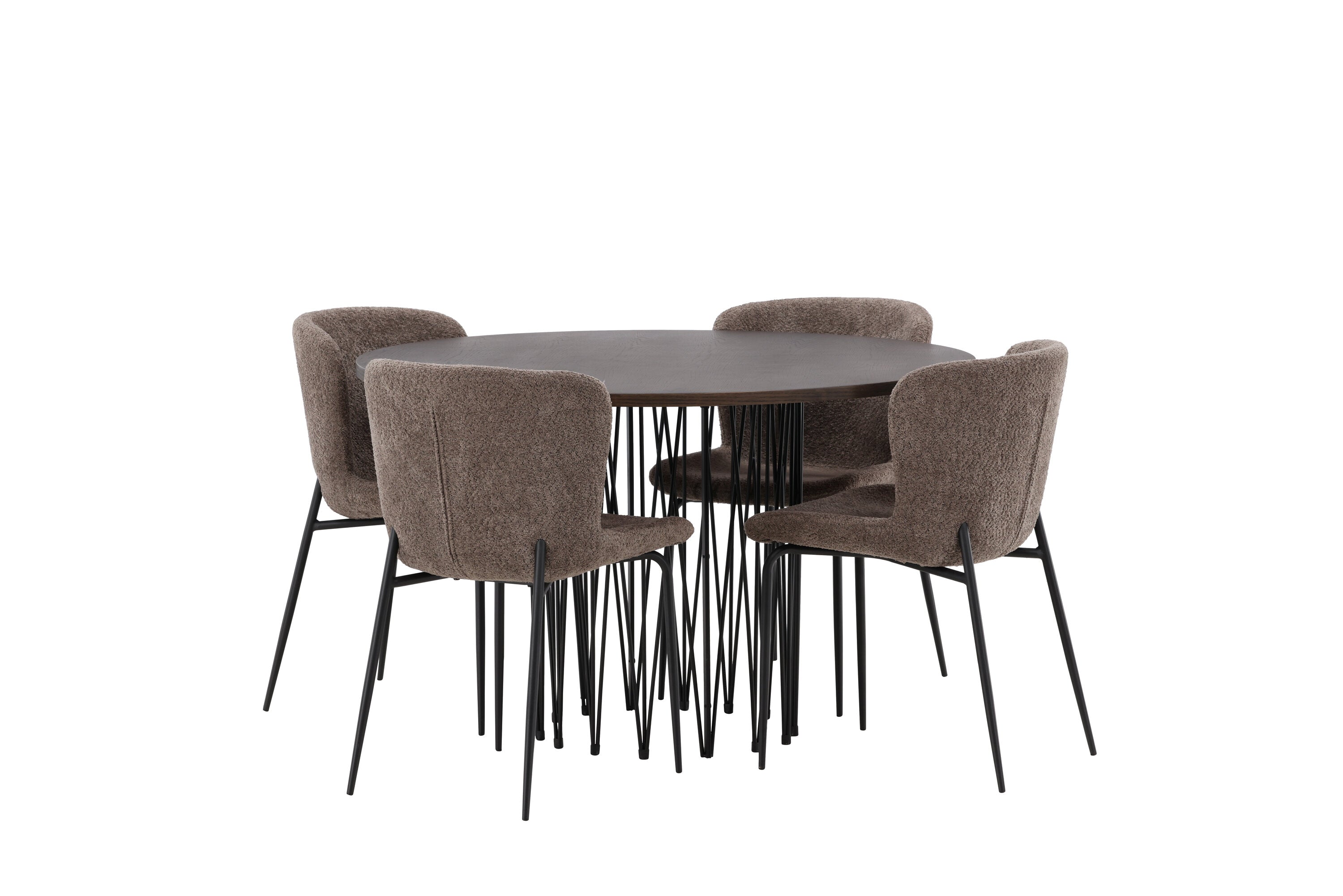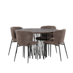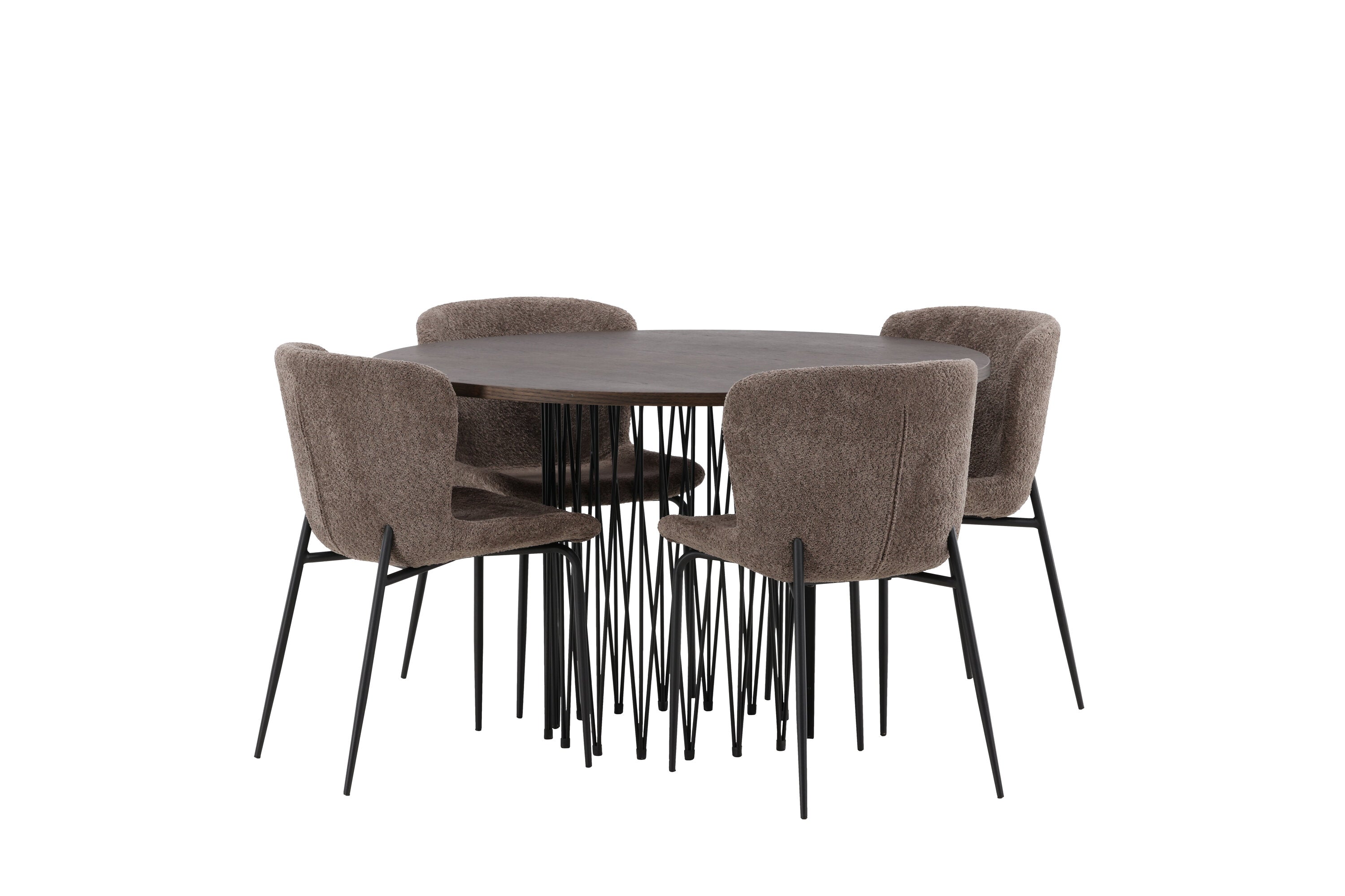 Tato jídelní sestava vyzařuje pohodlí, moderní design a elegantní tvary! Náš kulatý jídelní stůl Stone má fantastický skandinávský design, který se hodí k davu. Stůl má krásnou hnědou desku z MDF s dýhou a ozdobný rám ve tvaru válce z černého kovu. Zde v dokonalé kombinaci s našimi pohodlnými jídelními židlemi ze série Modesto. Židle je celočalouněná šedou látkou bouclé se stylovými minimalistickými nohami v černém kovu. Mírně zaoblená záda a čalouněný sedák poskytují extra pohodlí a rozšiřují příjemné jídlo kolem jídelního stolu. Mělo by být příjemné si na chvíli sednout!