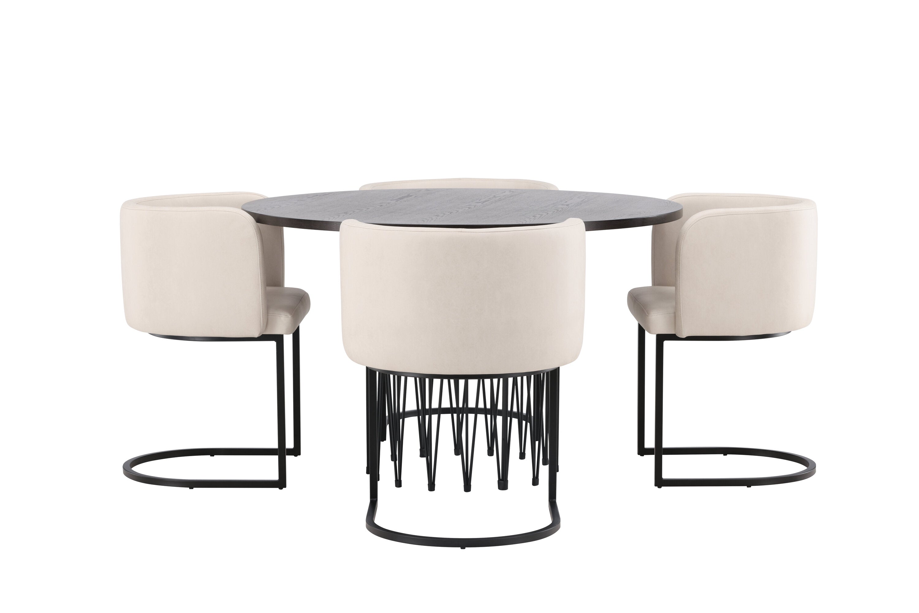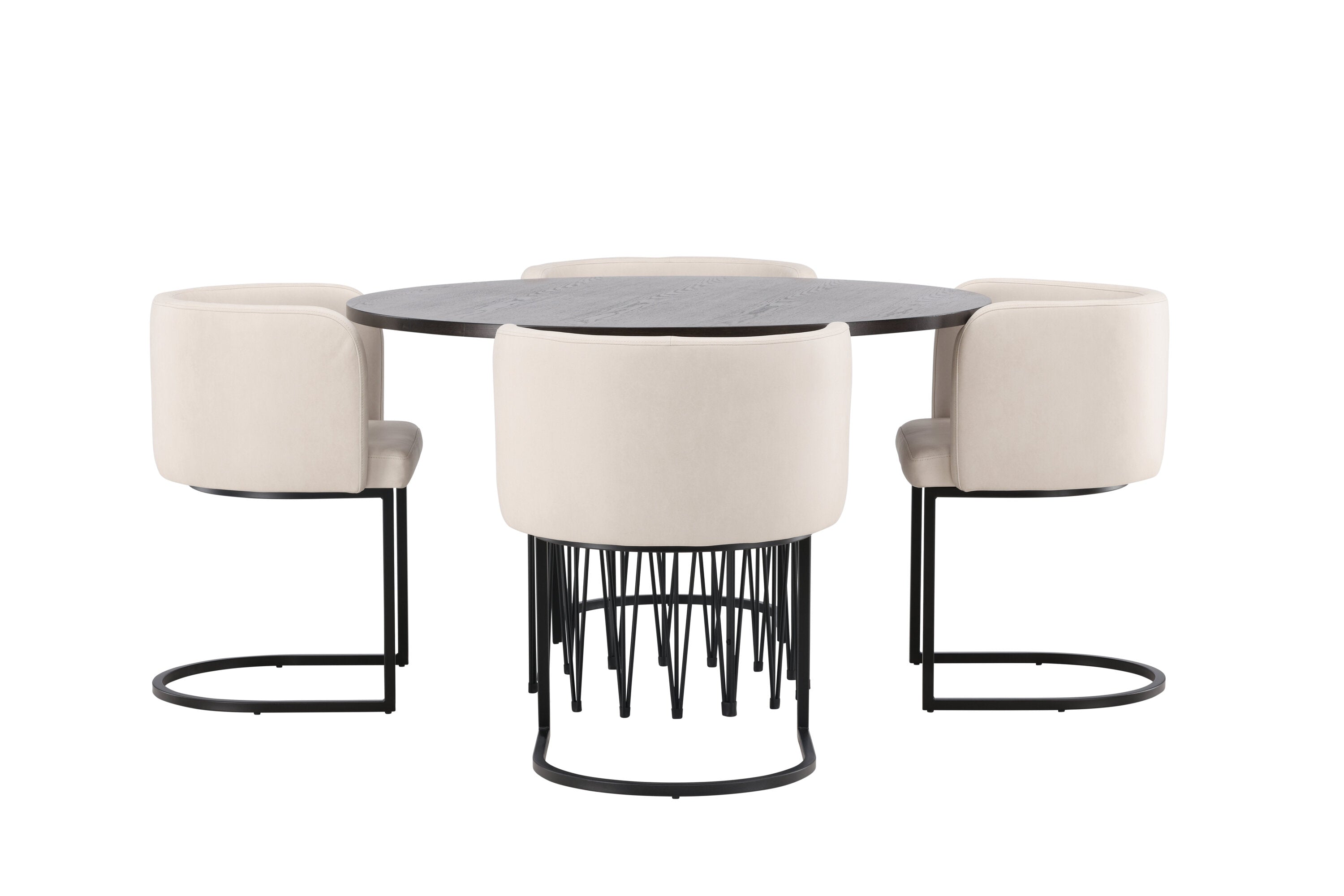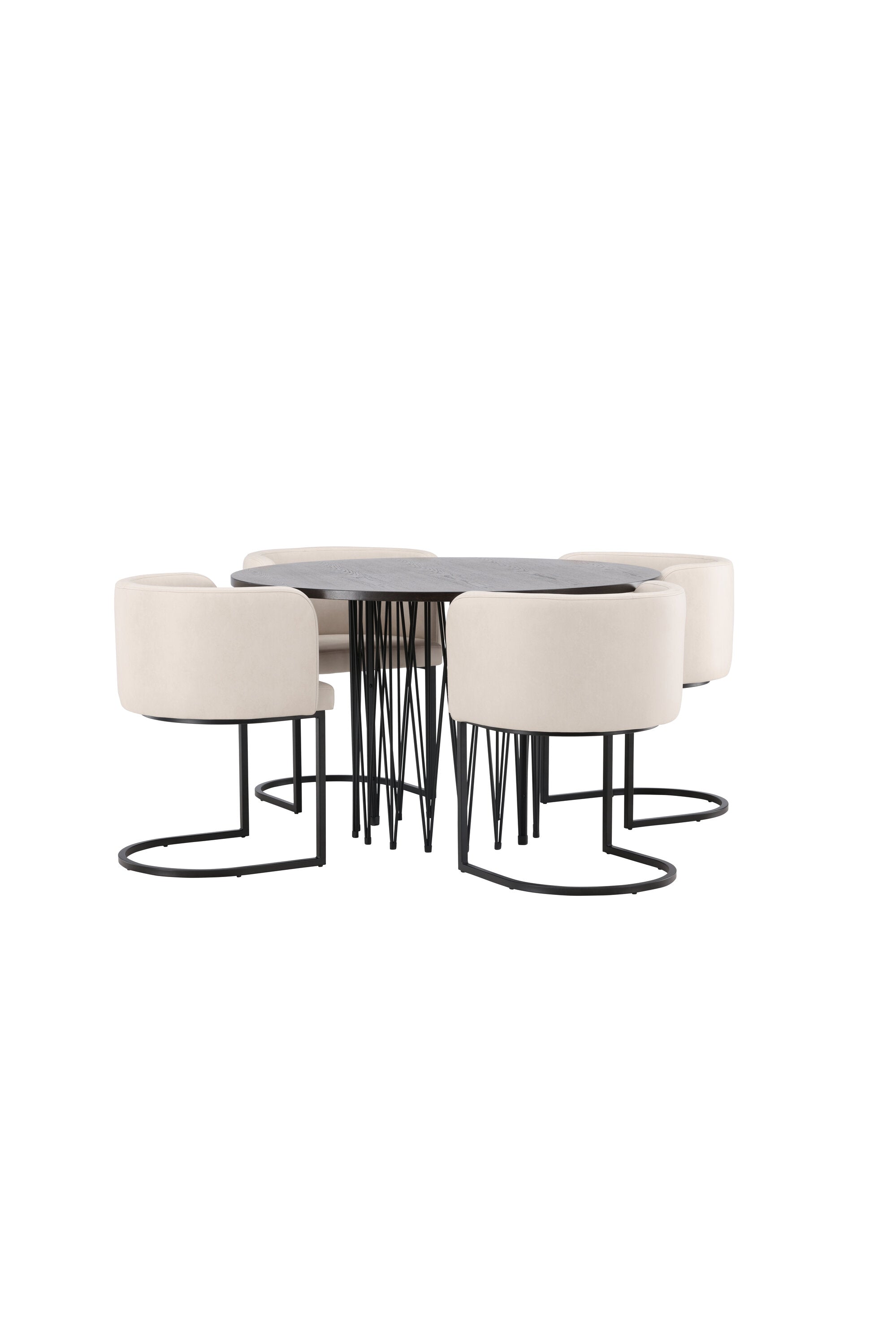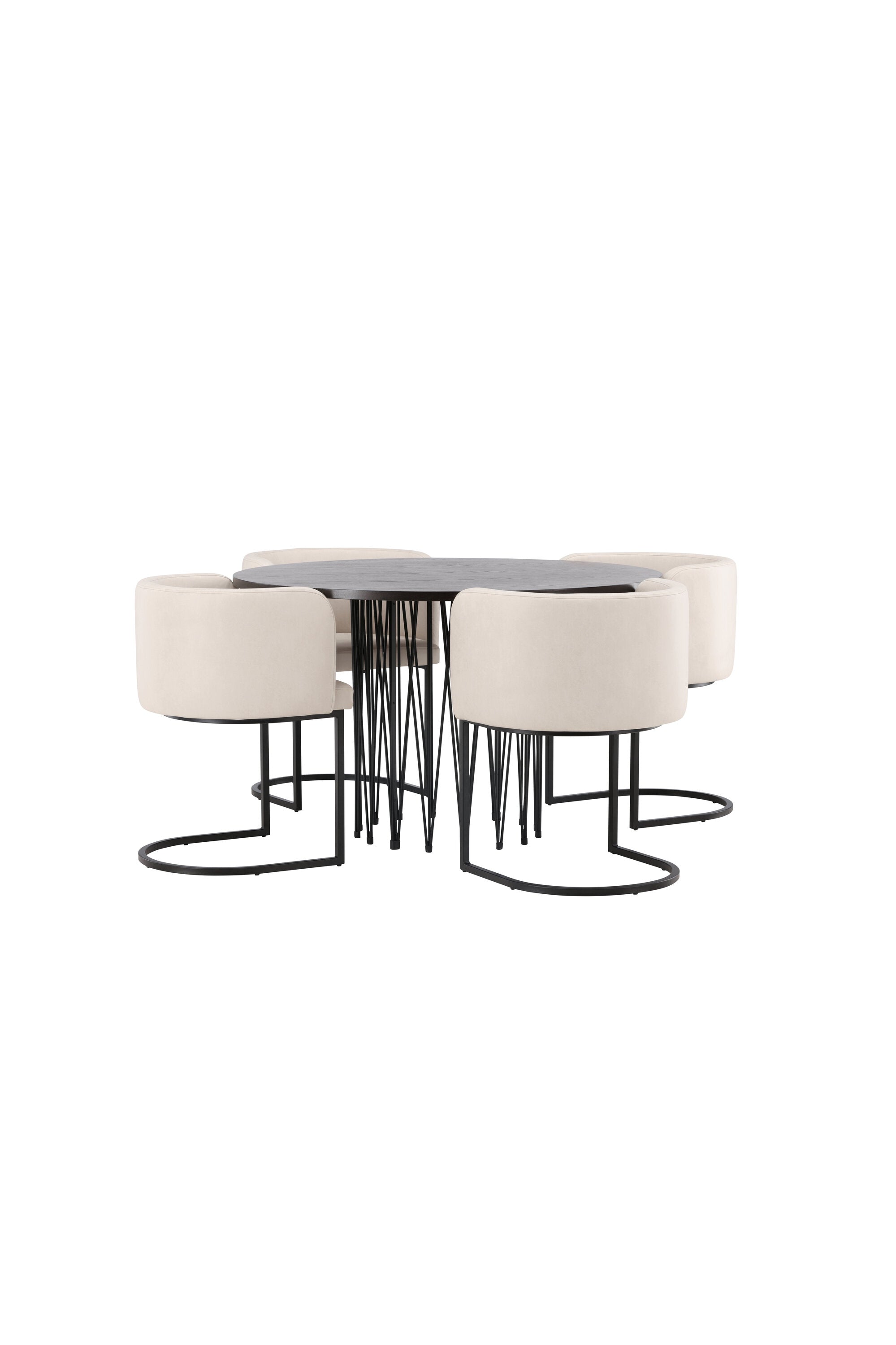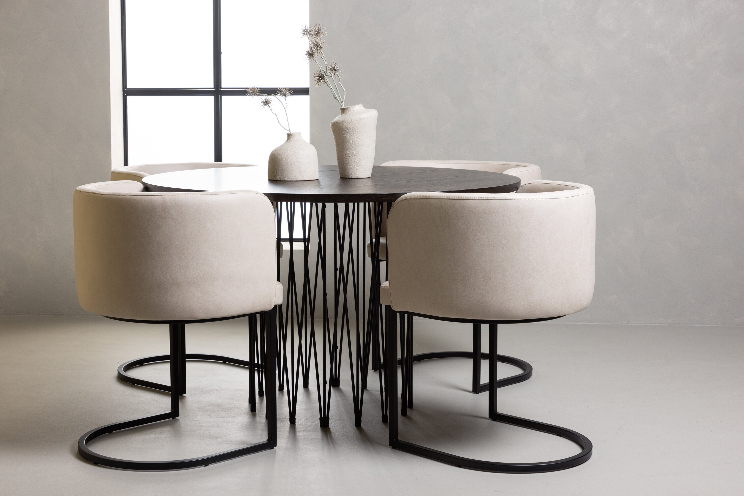 Tento jídelní set vyzařuje eleganci a pohodlí! Kulatý jídelní stůl Stone impresses má módní design s krásnou hnědou MDF deskou s dýhou a ozdobnou válcovou základnou v černém kovu. Zde společně s našimi elegantními jídelními židlemi ze série Simrishamn. Židle má celočalouněný sedák se zaobleným opěradlem z béžové látky TC a dekorativní, minimalistickou konstrukcí nohou z černé oceli. Přijít domů by se mělo cítit luxusně! Rozměry stolu: 120 cm.