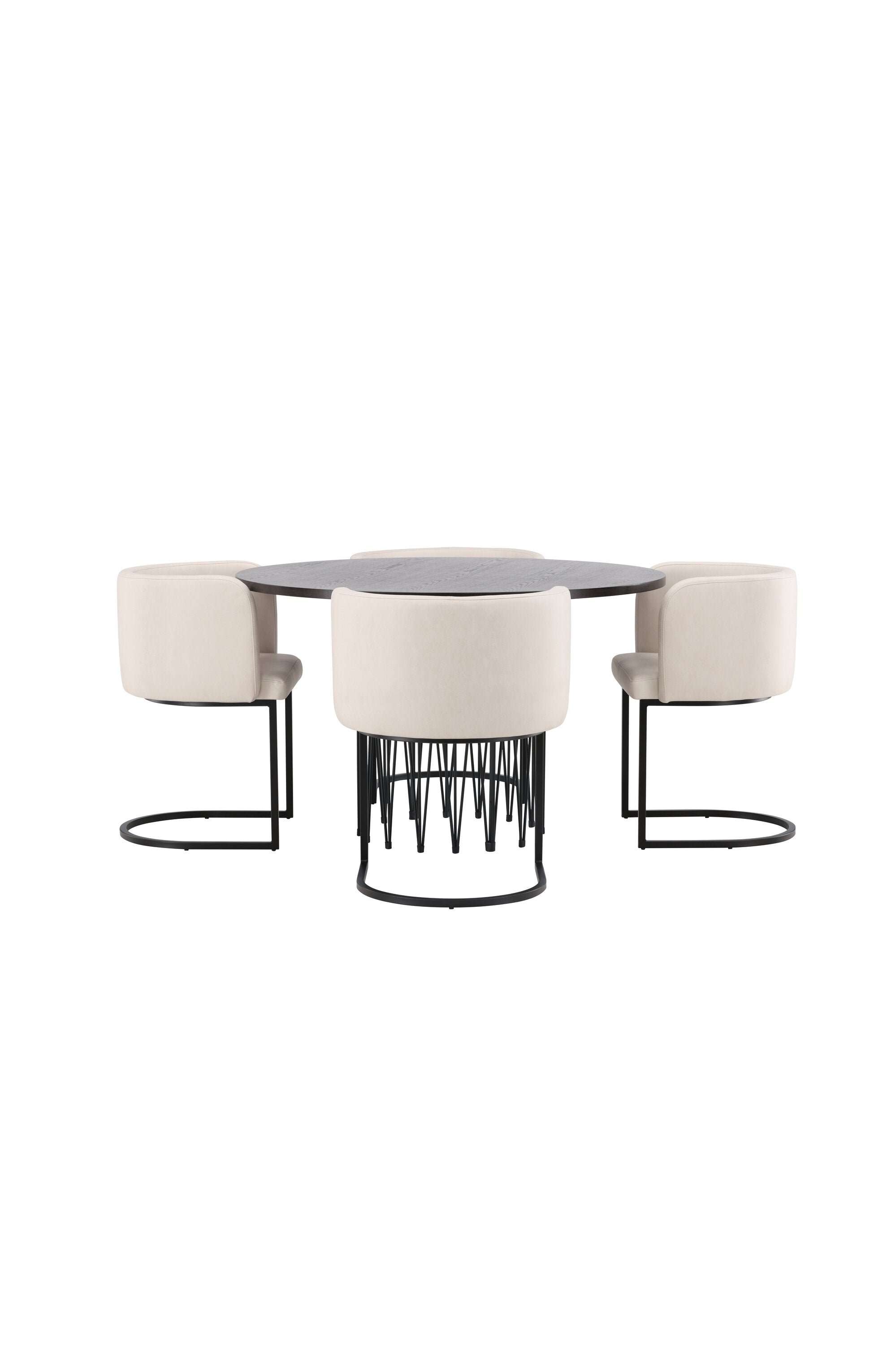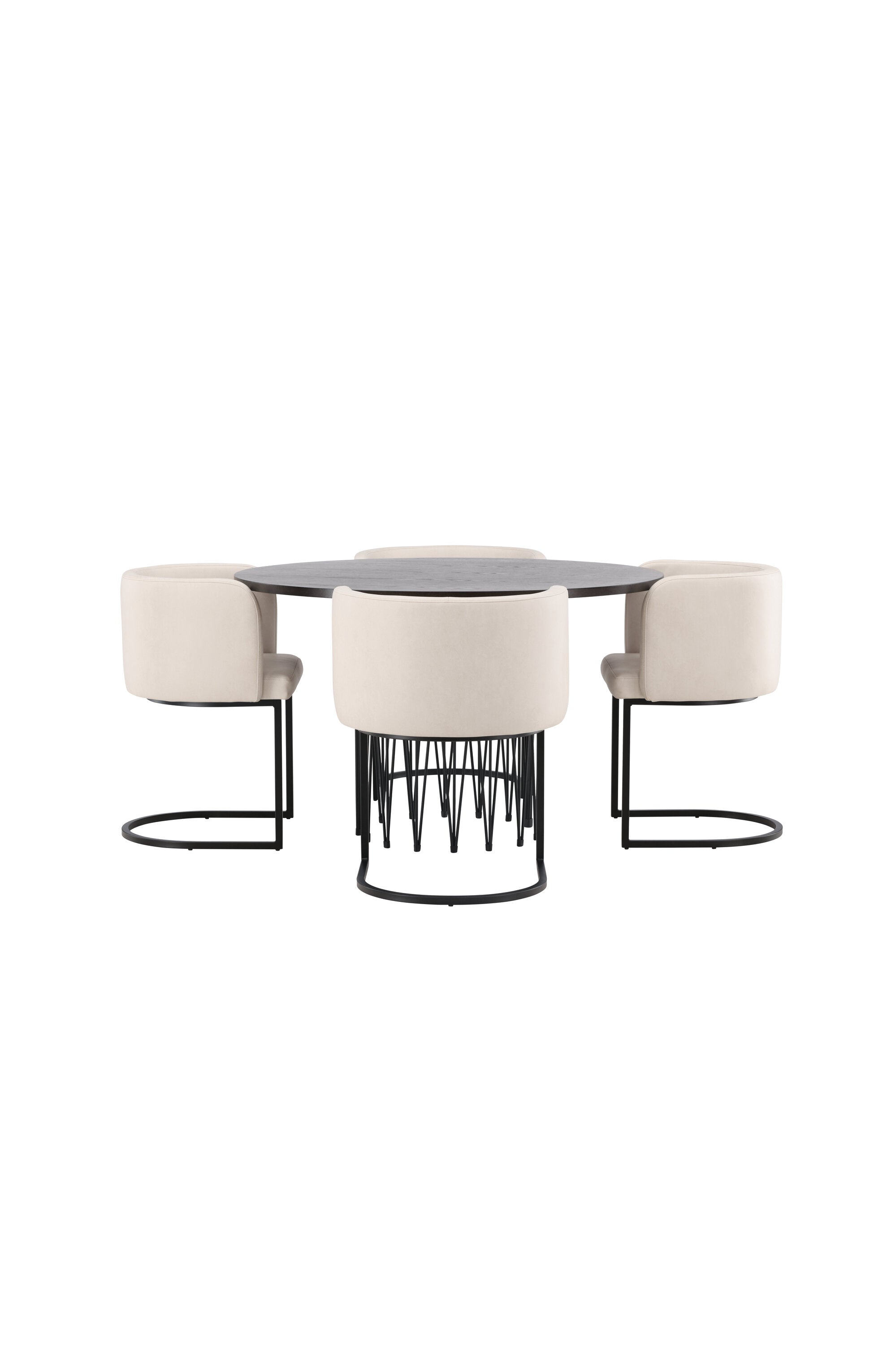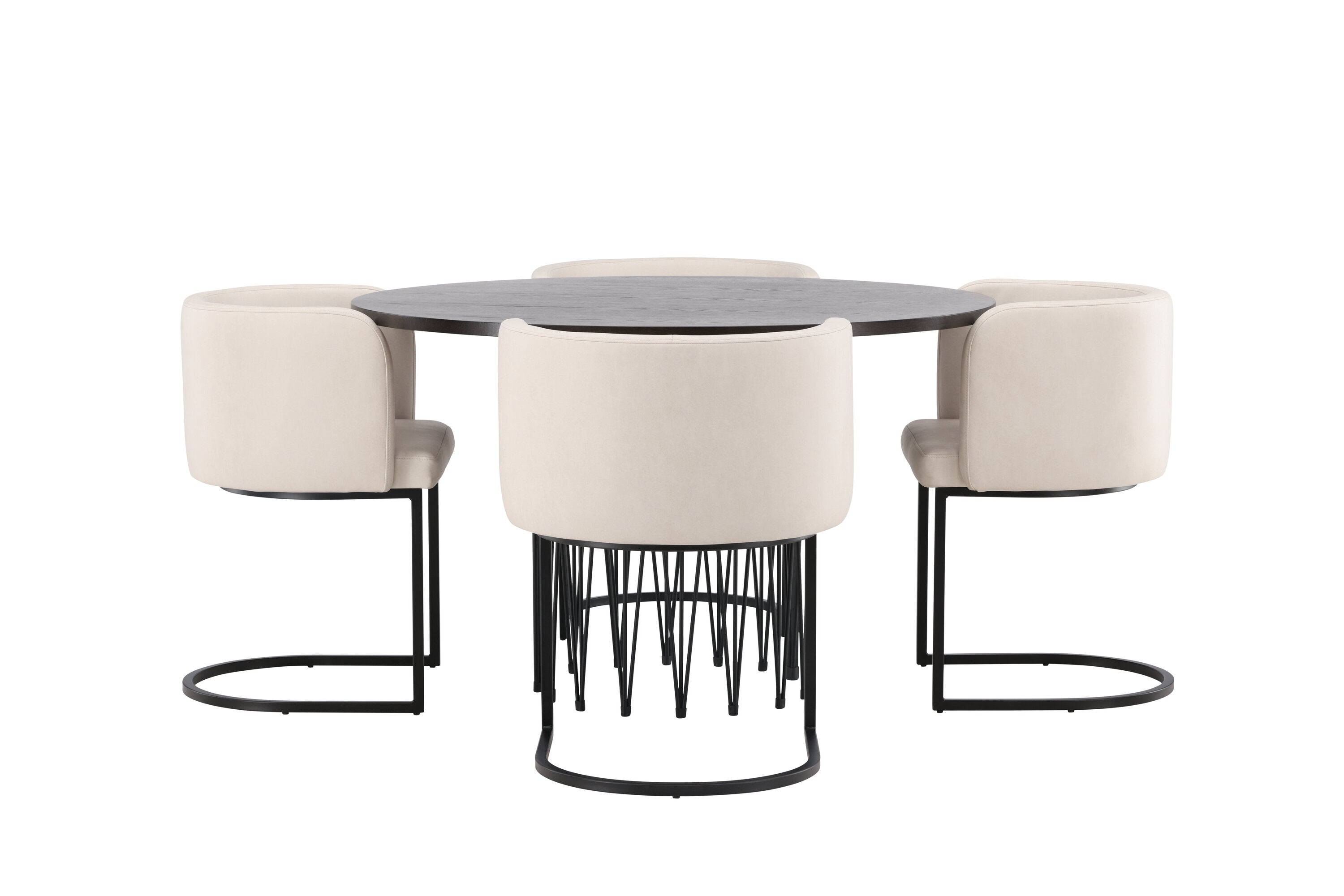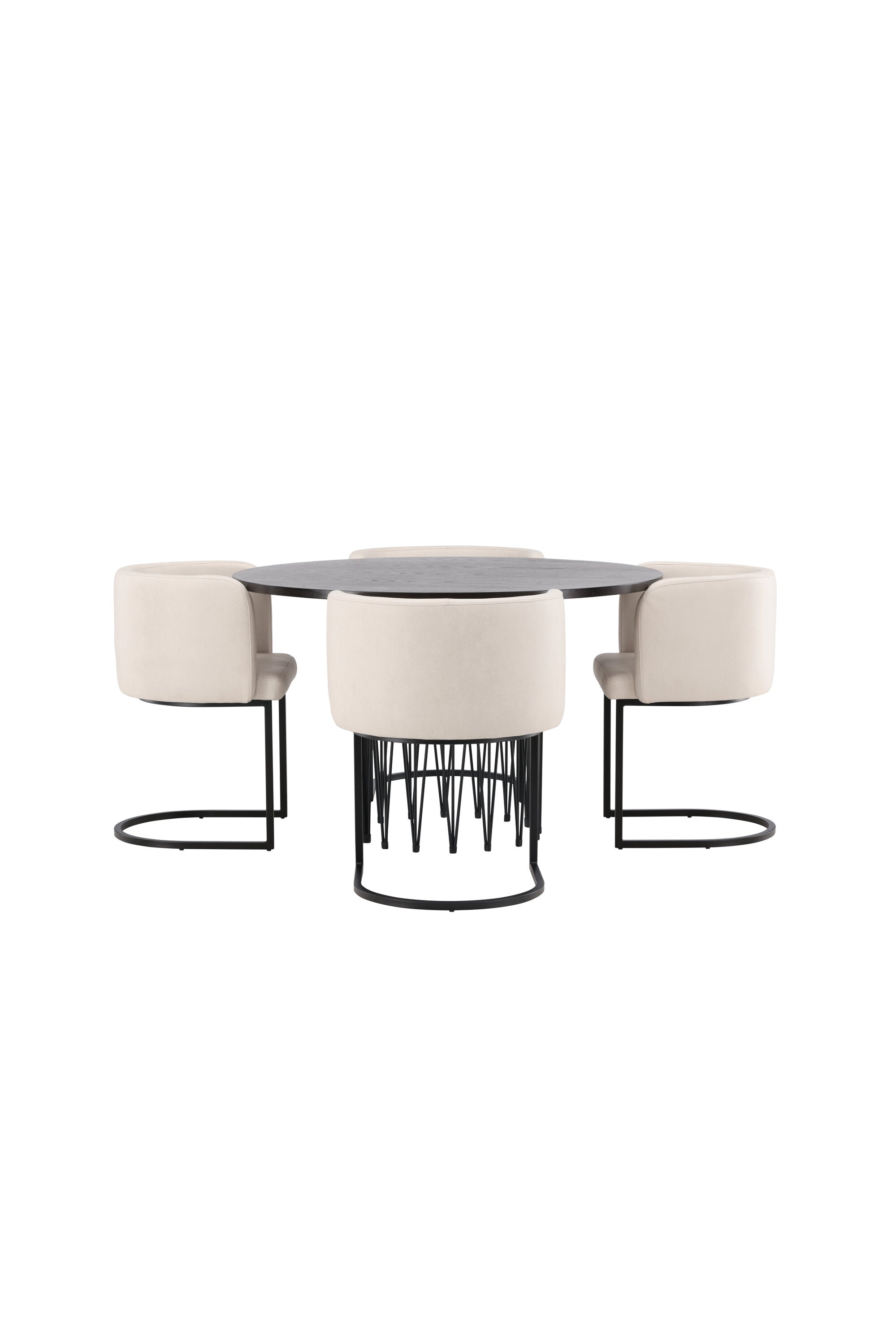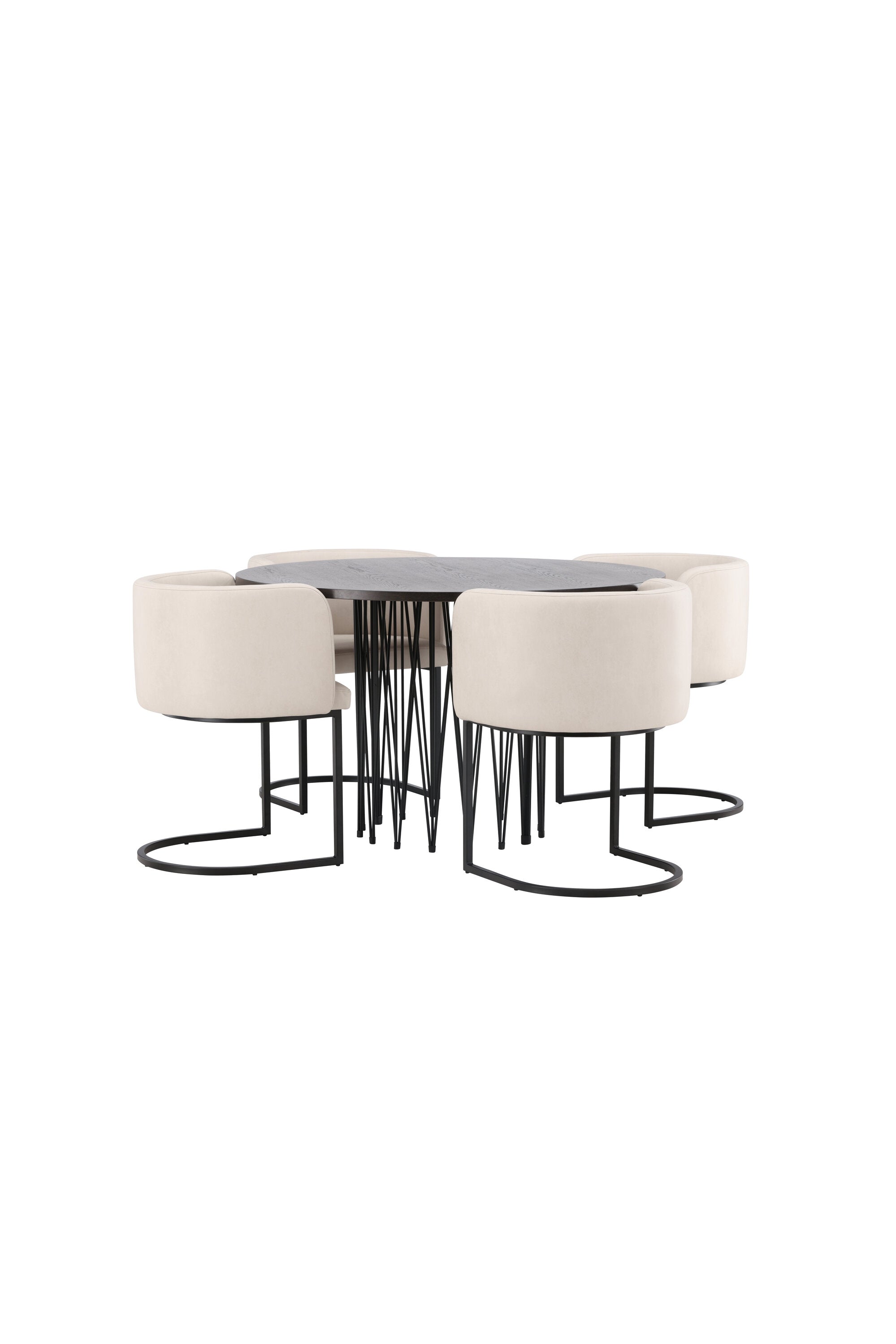 Tento jídelní set vyzařuje eleganci a pohodlí! Kulatý jídelní stůl Stone impresses má módní design s krásnou hnědou MDF deskou s dýhou a ozdobnou válcovou základnou v černém kovu. Zde společně s našimi elegantními jídelními židlemi ze série Simrishamn. Židle má celočalouněný sedák se zaobleným opěradlem z béžové látky TC a dekorativní, minimalistickou konstrukcí nohou z černé oceli. Přijít domů by se mělo cítit luxusně! Rozměry stolu: 120 cm.