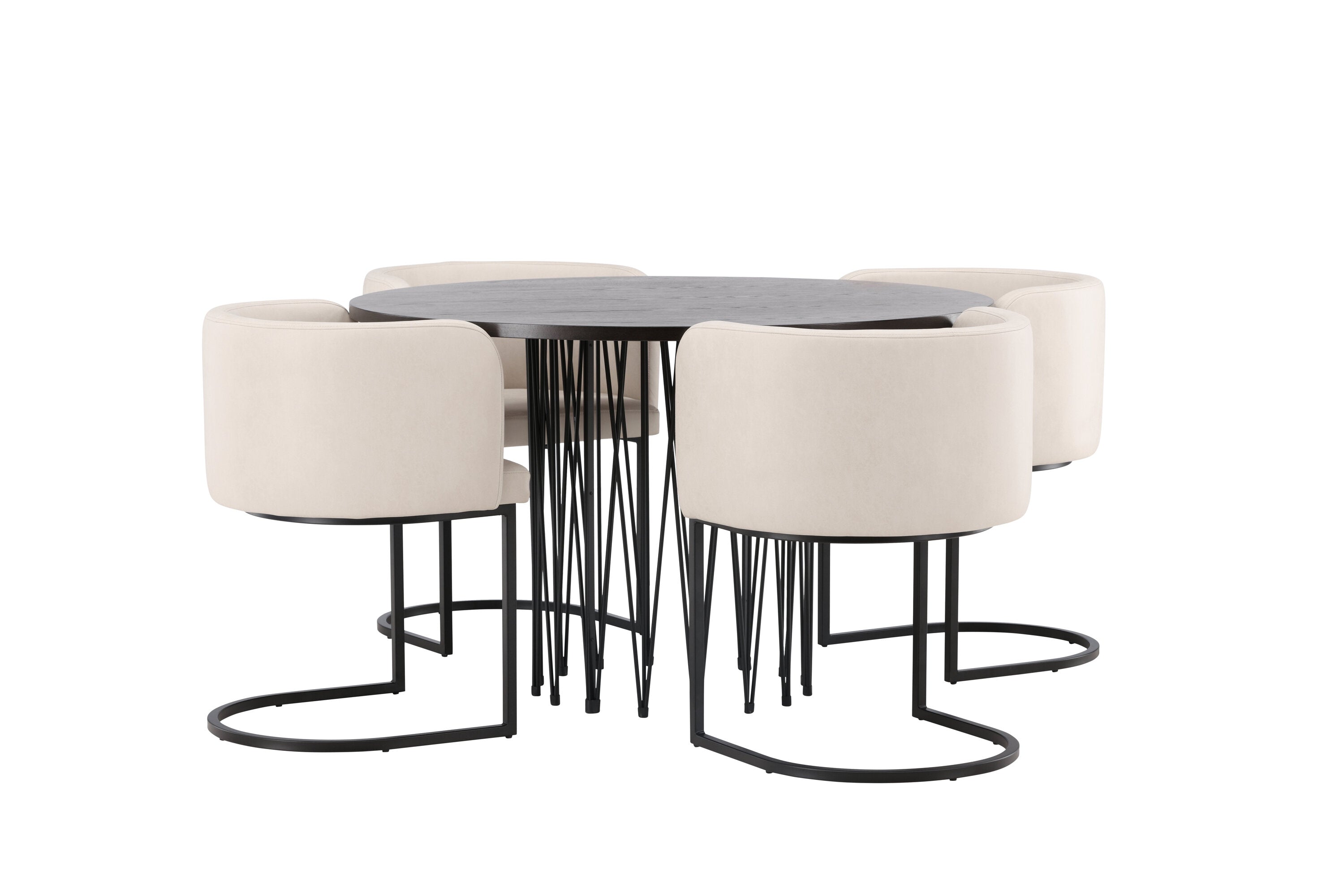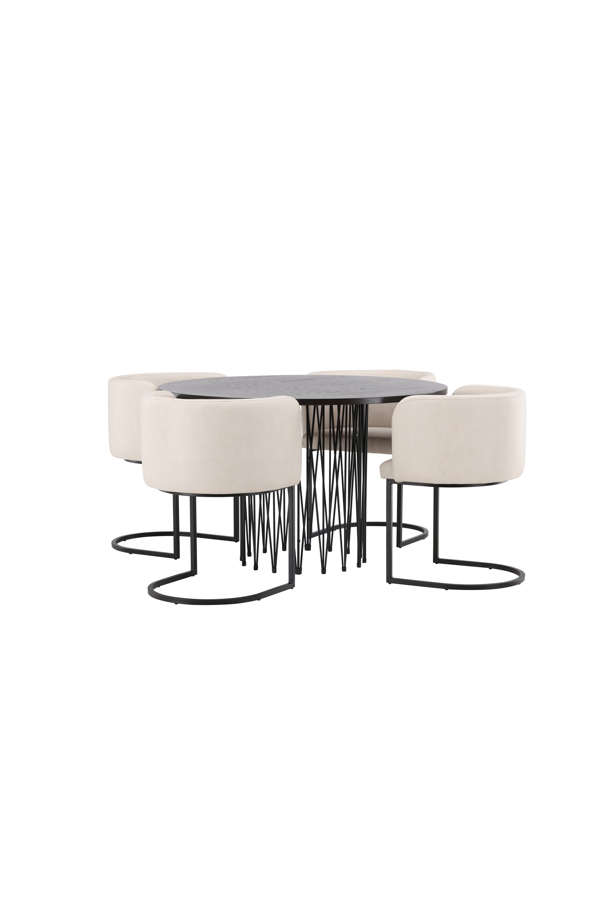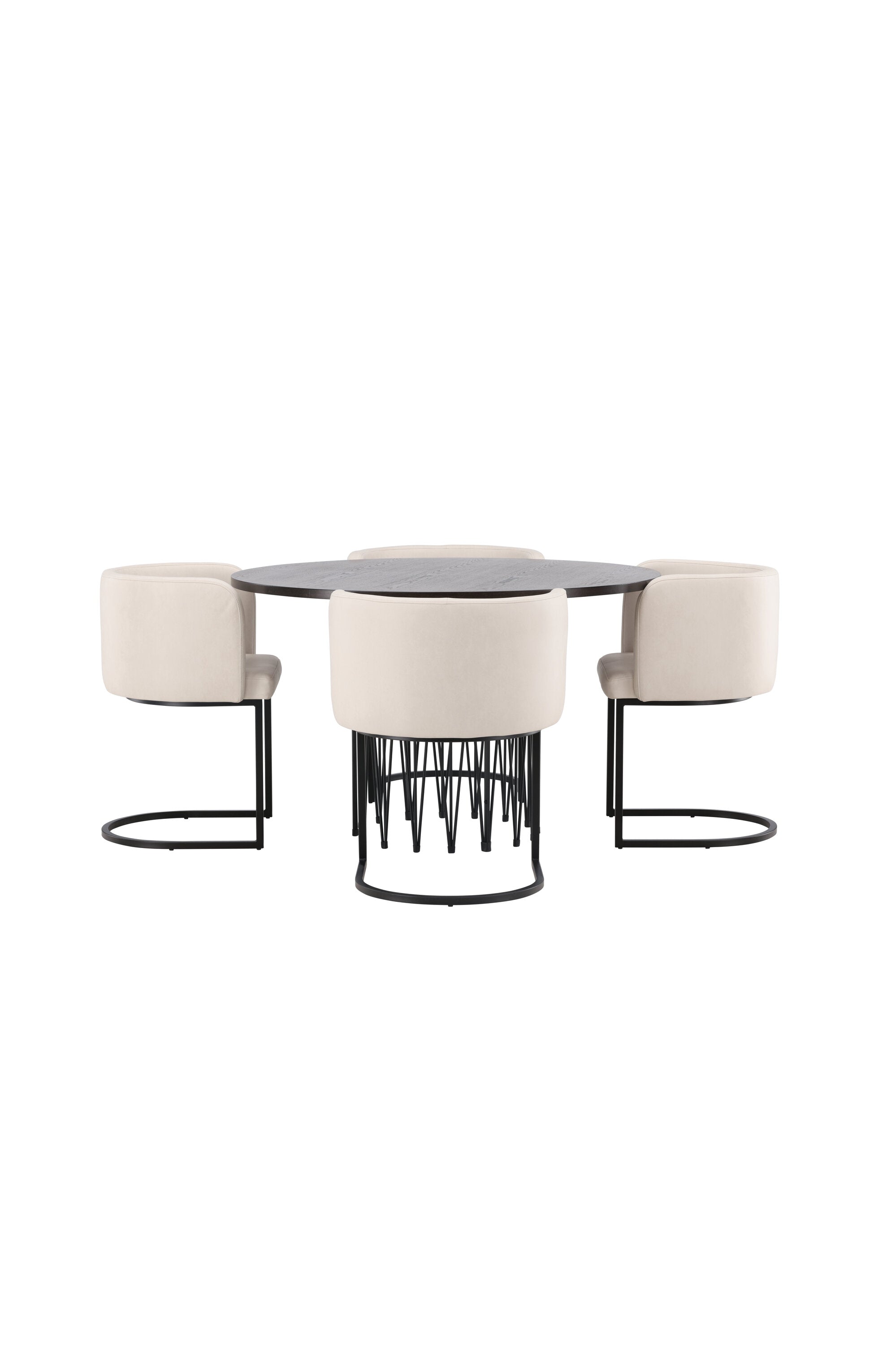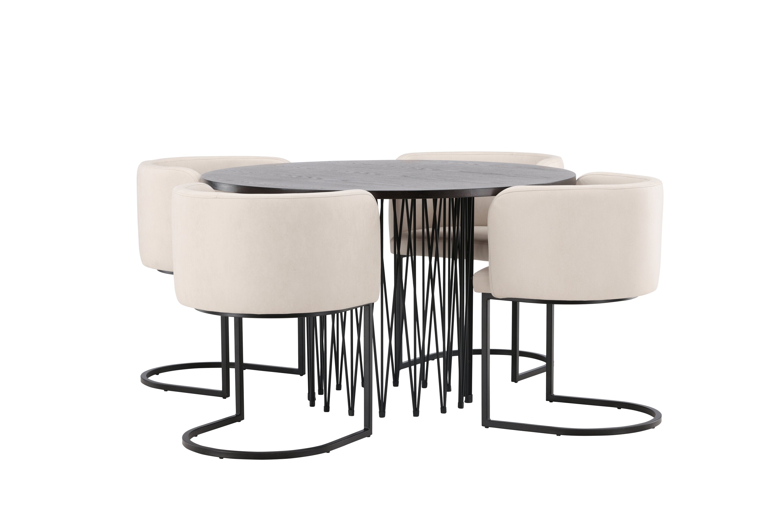 Tento jídelní set vyzařuje eleganci a pohodlí! Kulatý jídelní stůl Stone impresses má módní design s krásnou hnědou MDF deskou s dýhou a ozdobnou válcovou základnou v černém kovu. Zde společně s našimi elegantními jídelními židlemi ze série Simrishamn. Židle má celočalouněný sedák se zaobleným opěradlem z béžové látky TC a dekorativní, minimalistickou konstrukcí nohou z černé oceli. Přijít domů by se mělo cítit luxusně! Rozměry stolu: 120 cm.