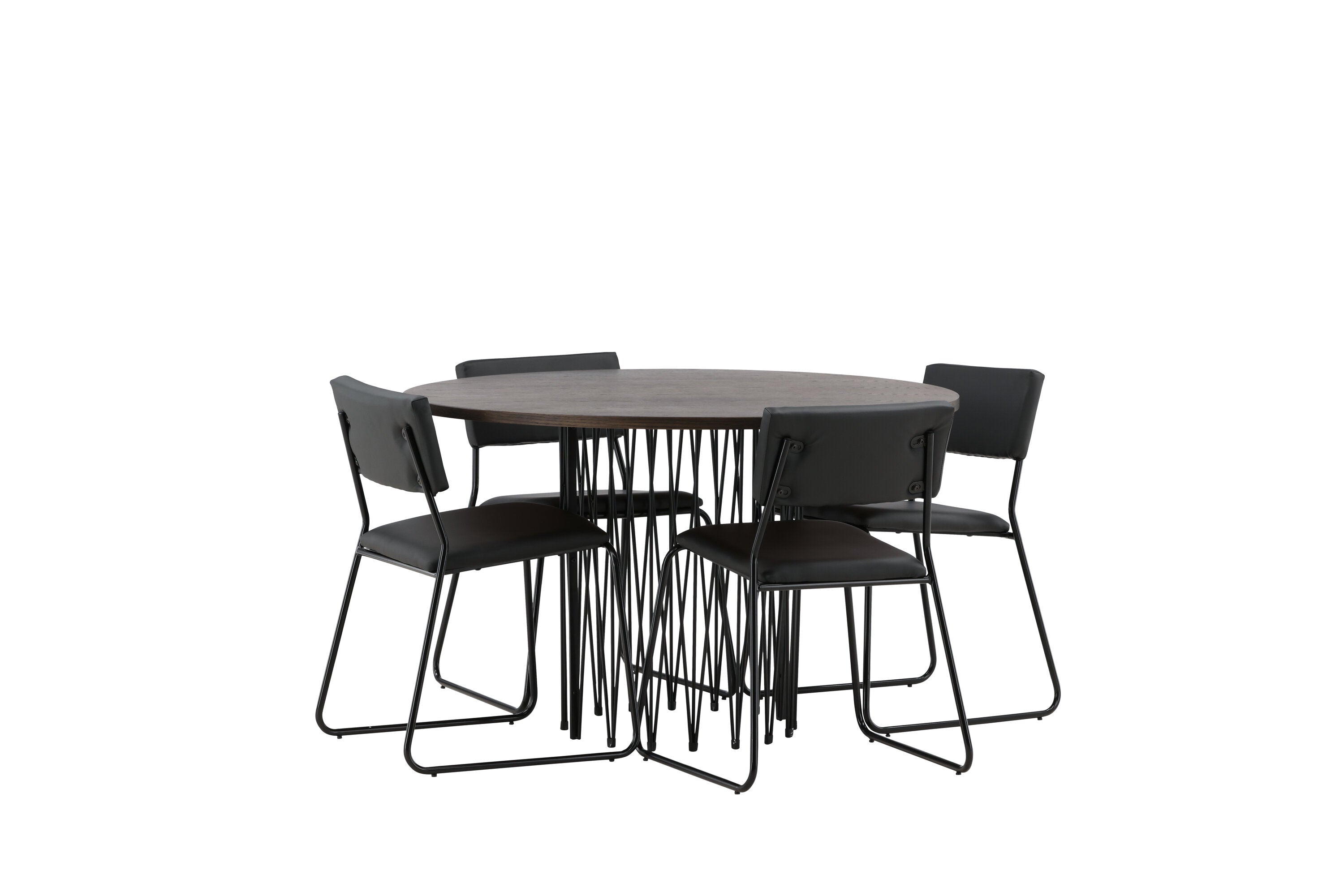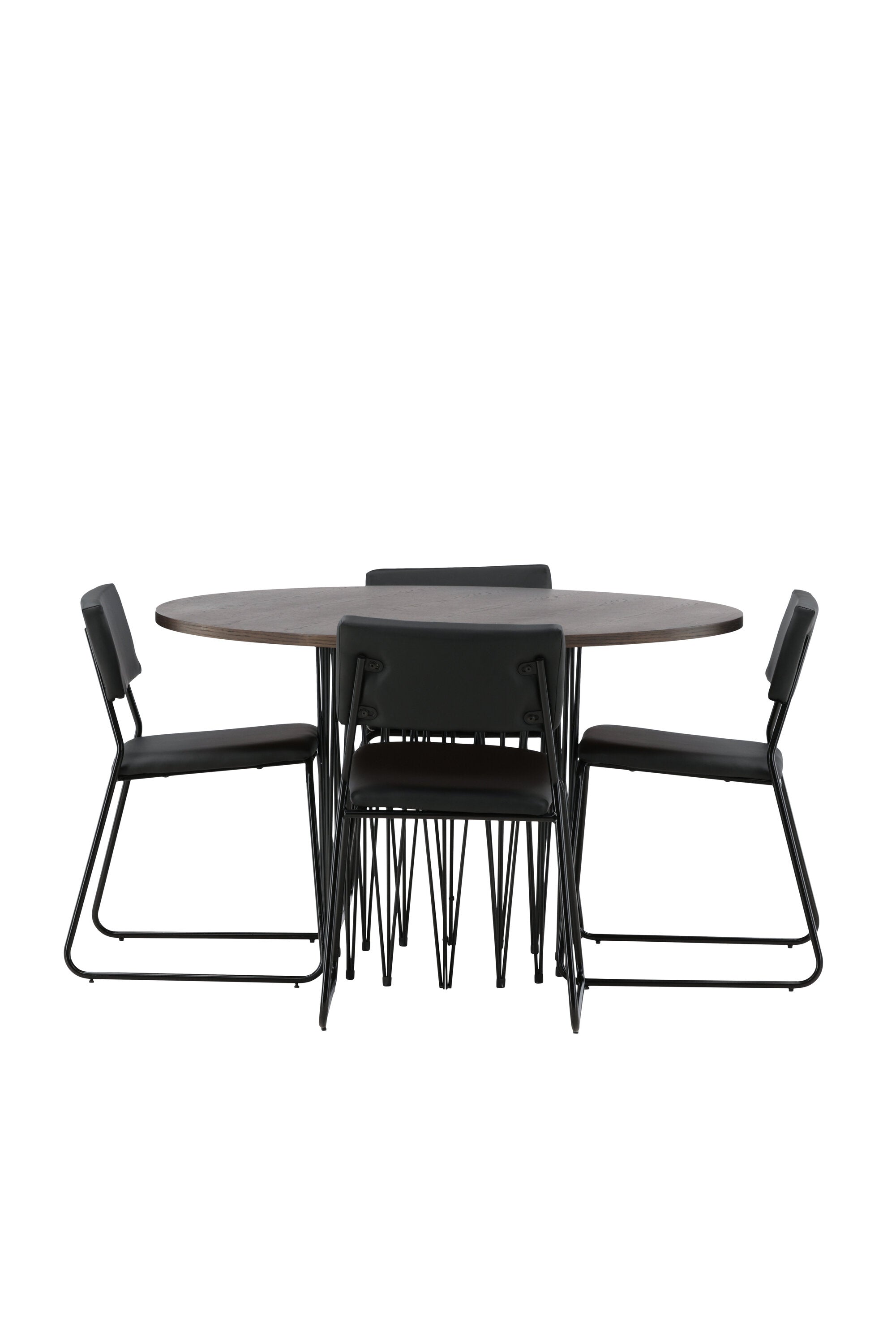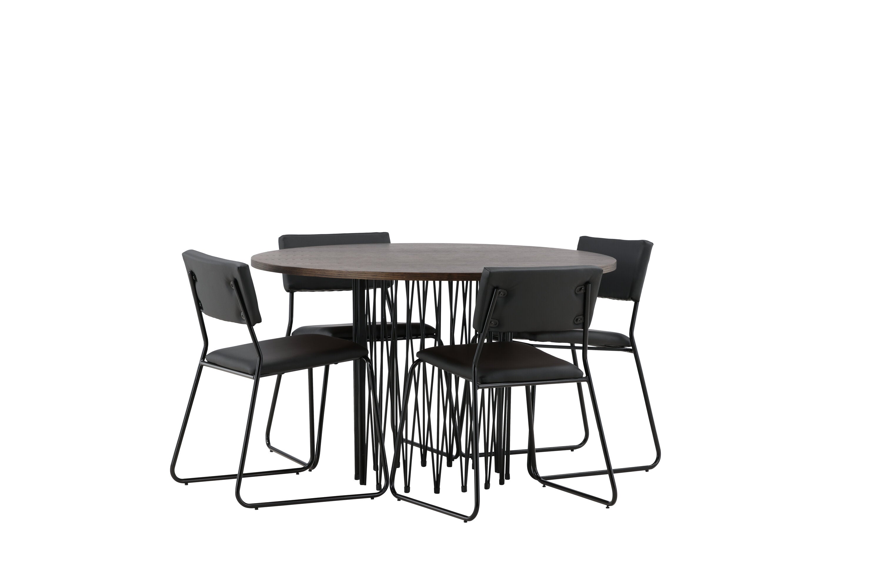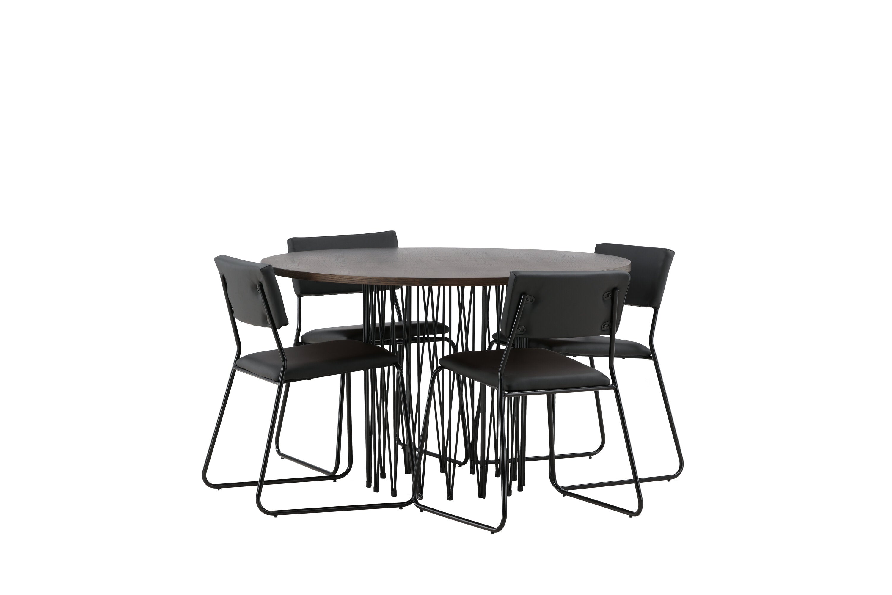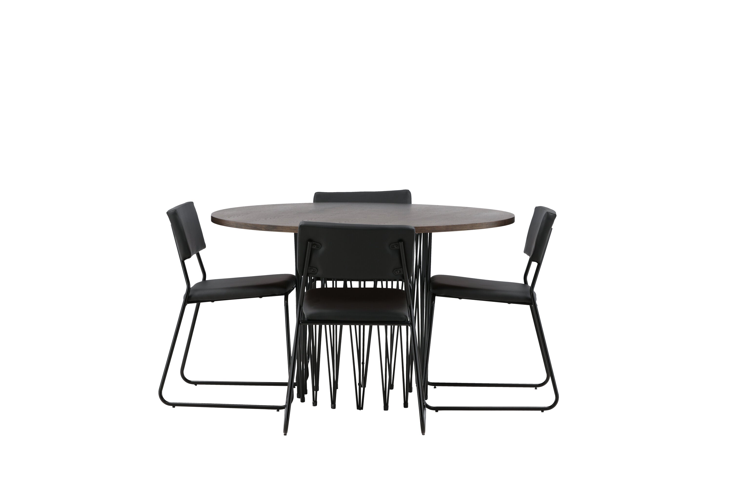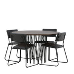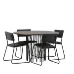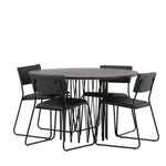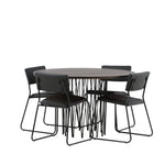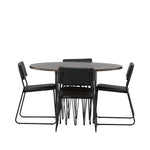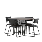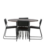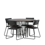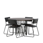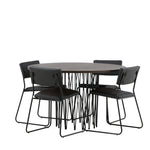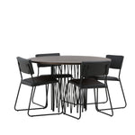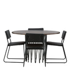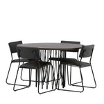 Jídelní skupina, která vyzařuje moderní design a jemné tvary! Náš kulatý jídelní stůl Stone má fantastický skandinávský design, který se hodí k davu. Stůl má krásnou hnědou desku z MDF s dýhou a ozdobný rám ve tvaru válce z černého kovu. Zde společně s našimi oblíbenými jídelními židlemi Kenth. Židle má minimalistický, moderní design, který vytváří vzdušný pocit v místnosti. Opěradlo a sedák jsou z černé PU kůže a polyesteru a úzké nohy židle jsou ze železa. Užijte si v budoucnu příjemná jídla – tady nikdo nekončí na hraně!