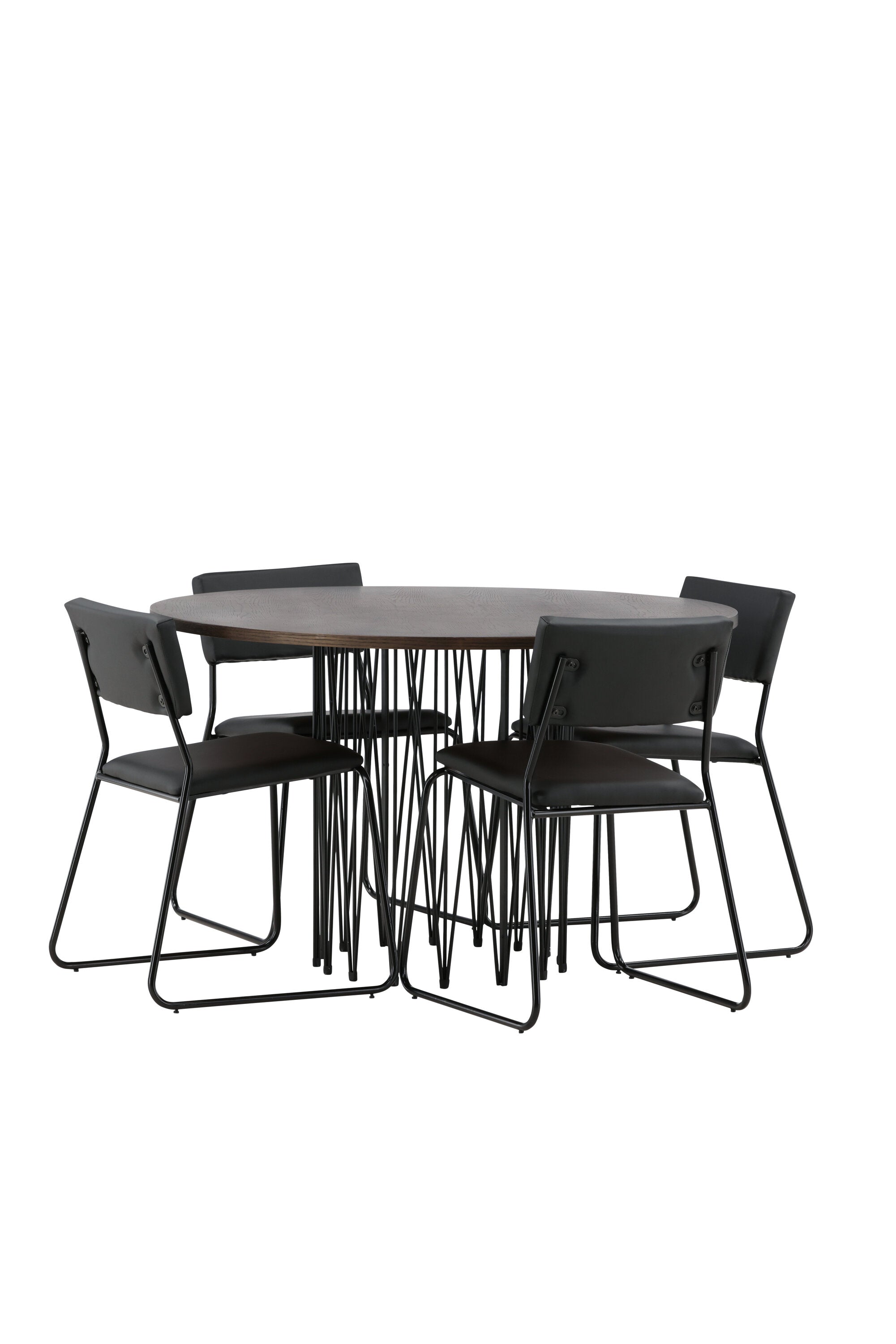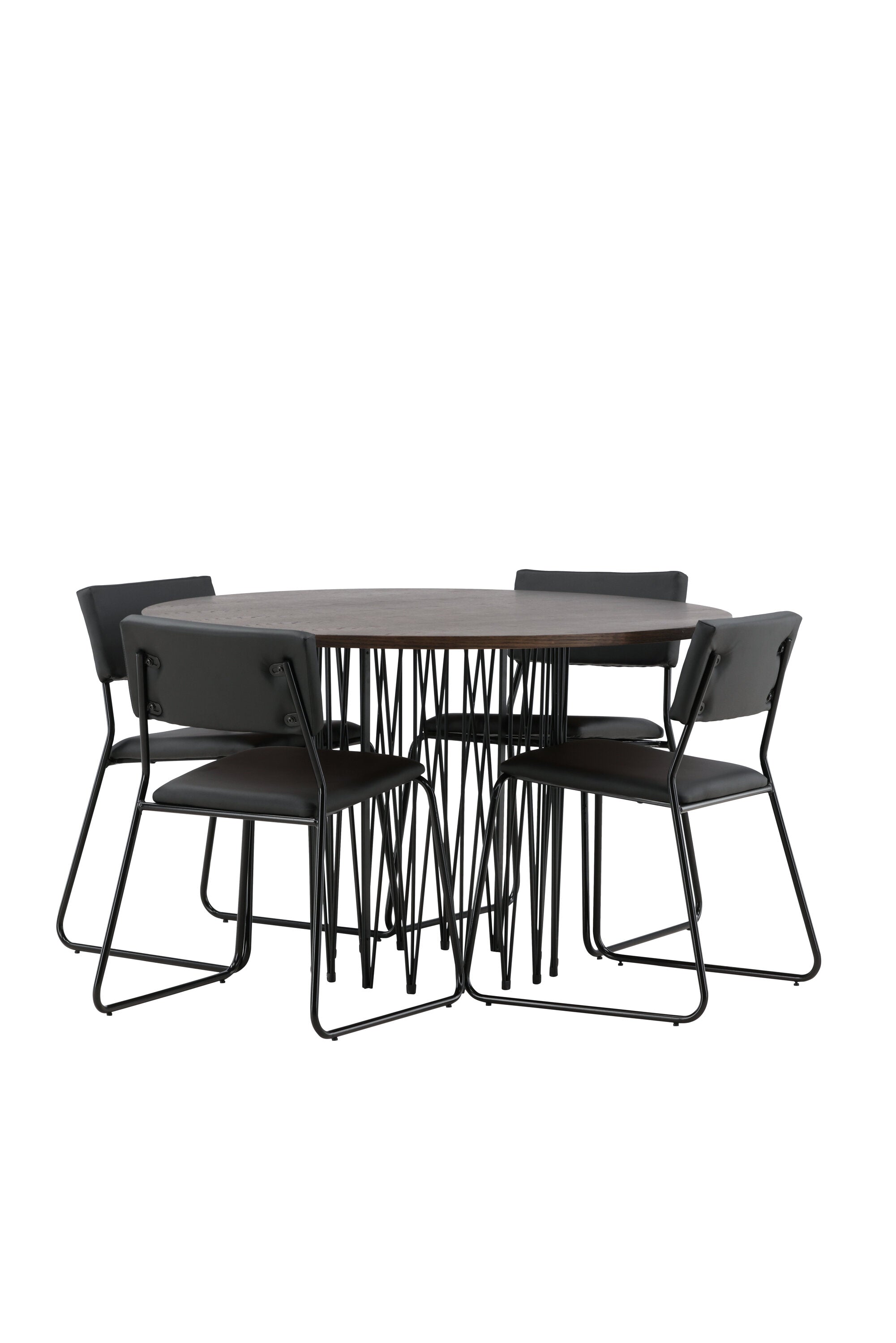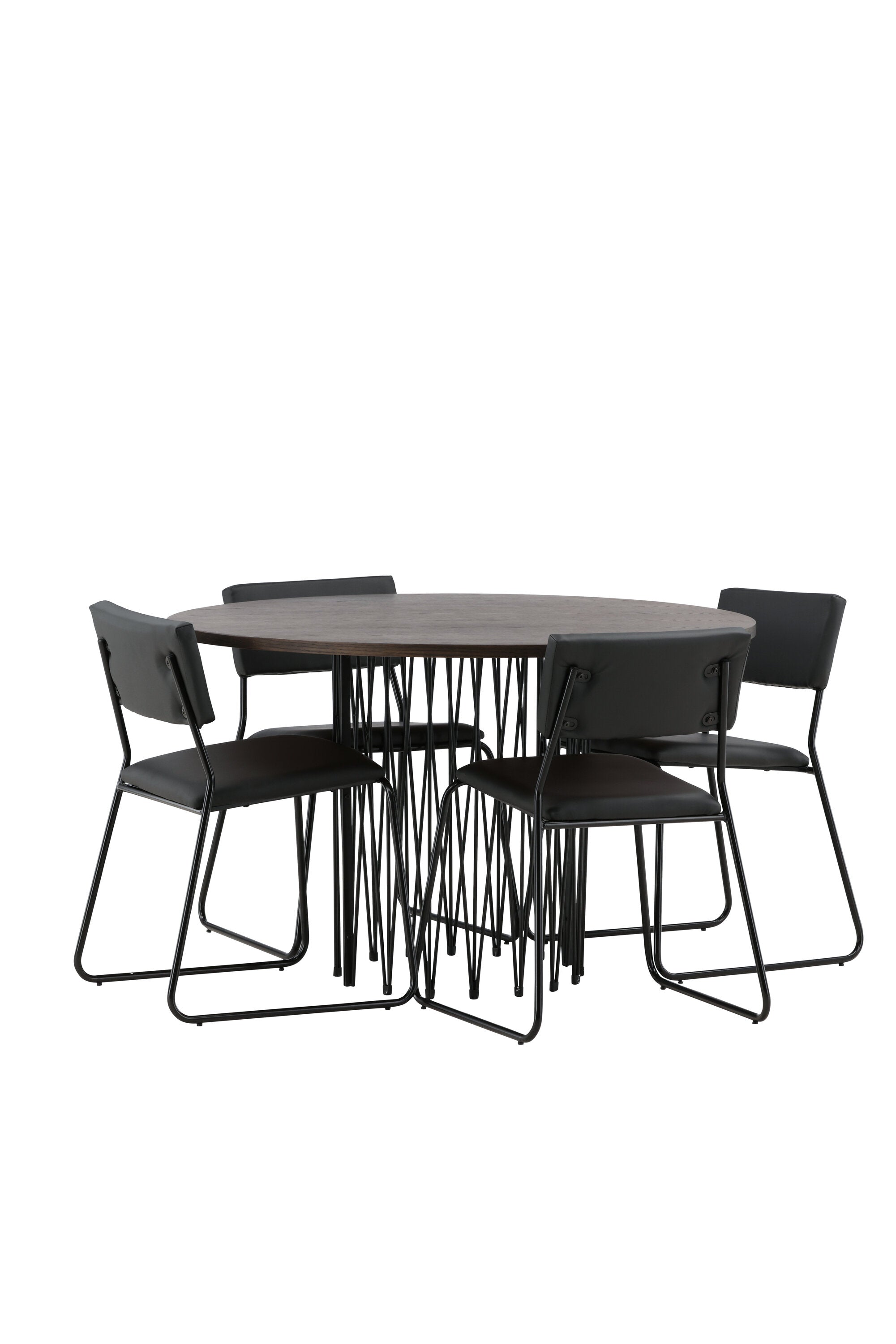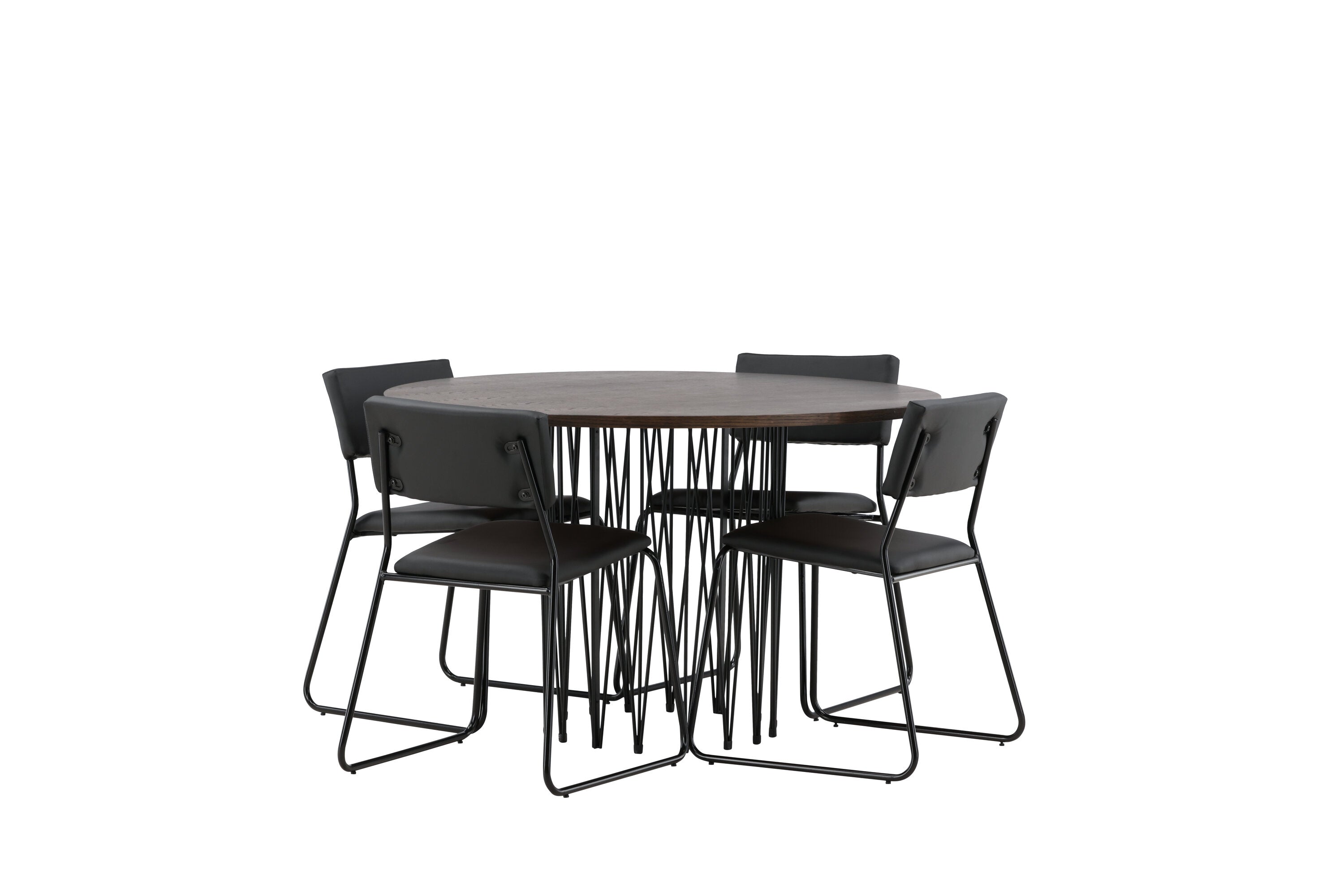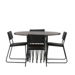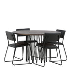 Jídelní skupina, která vyzařuje moderní design a jemné tvary! Náš kulatý jídelní stůl Stone má fantastický skandinávský design, který se hodí k davu. Stůl má krásnou hnědou desku z MDF s dýhou a ozdobný rám ve tvaru válce z černého kovu. Zde společně s našimi oblíbenými jídelními židlemi Kenth. Židle má minimalistický, moderní design, který vytváří vzdušný pocit v místnosti. Opěradlo a sedák jsou z černé PU kůže a polyesteru a úzké nohy židle jsou ze železa. Užijte si v budoucnu příjemná jídla – tady nikdo nekončí na hraně!