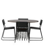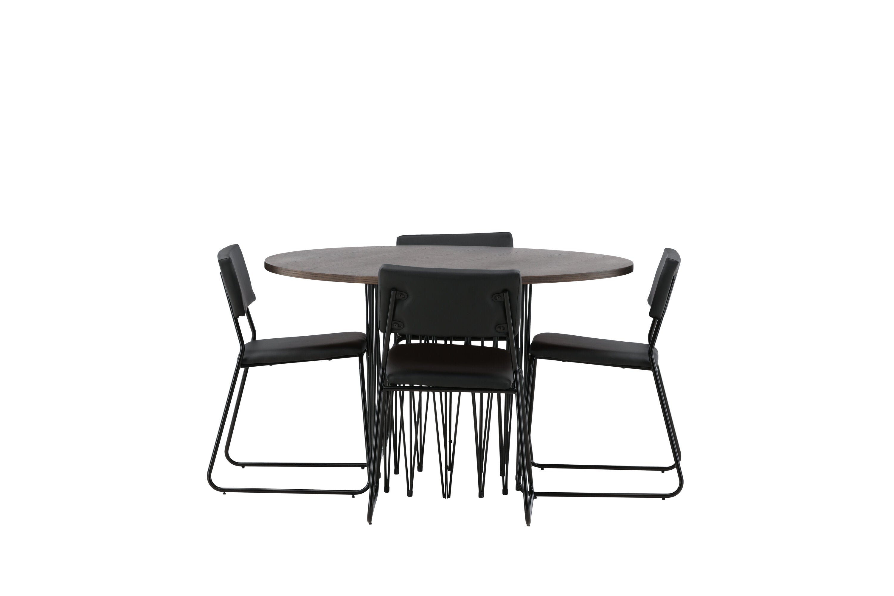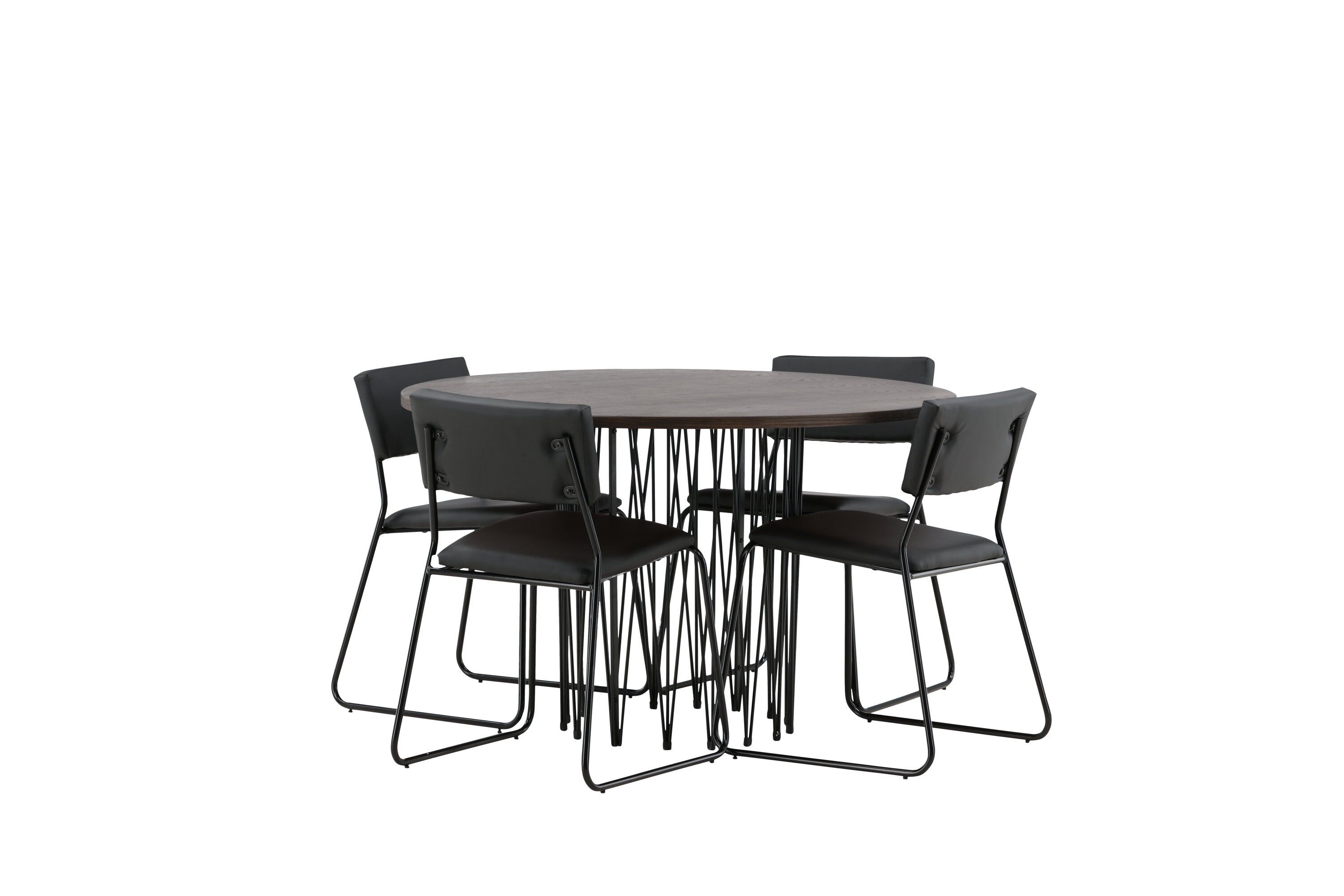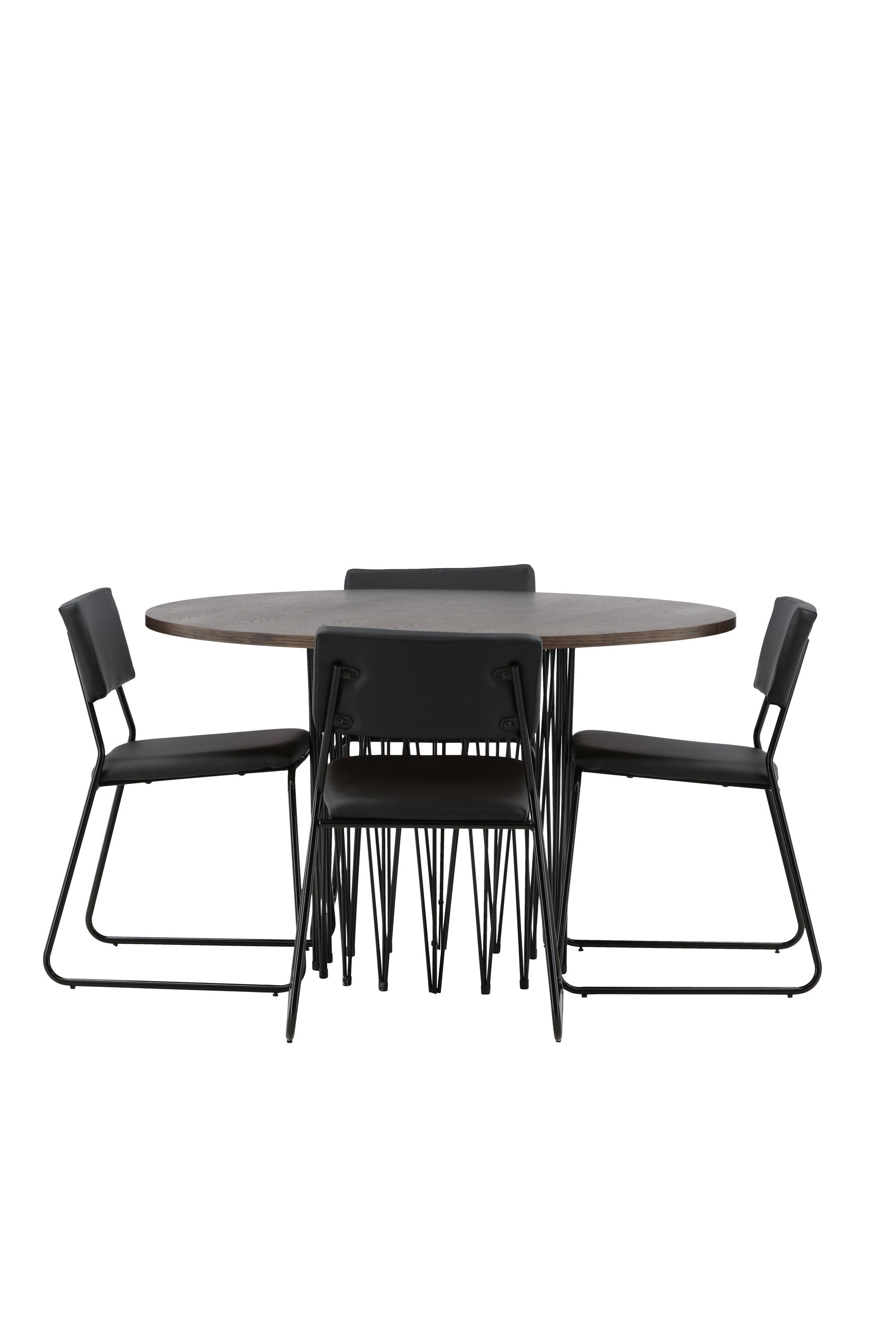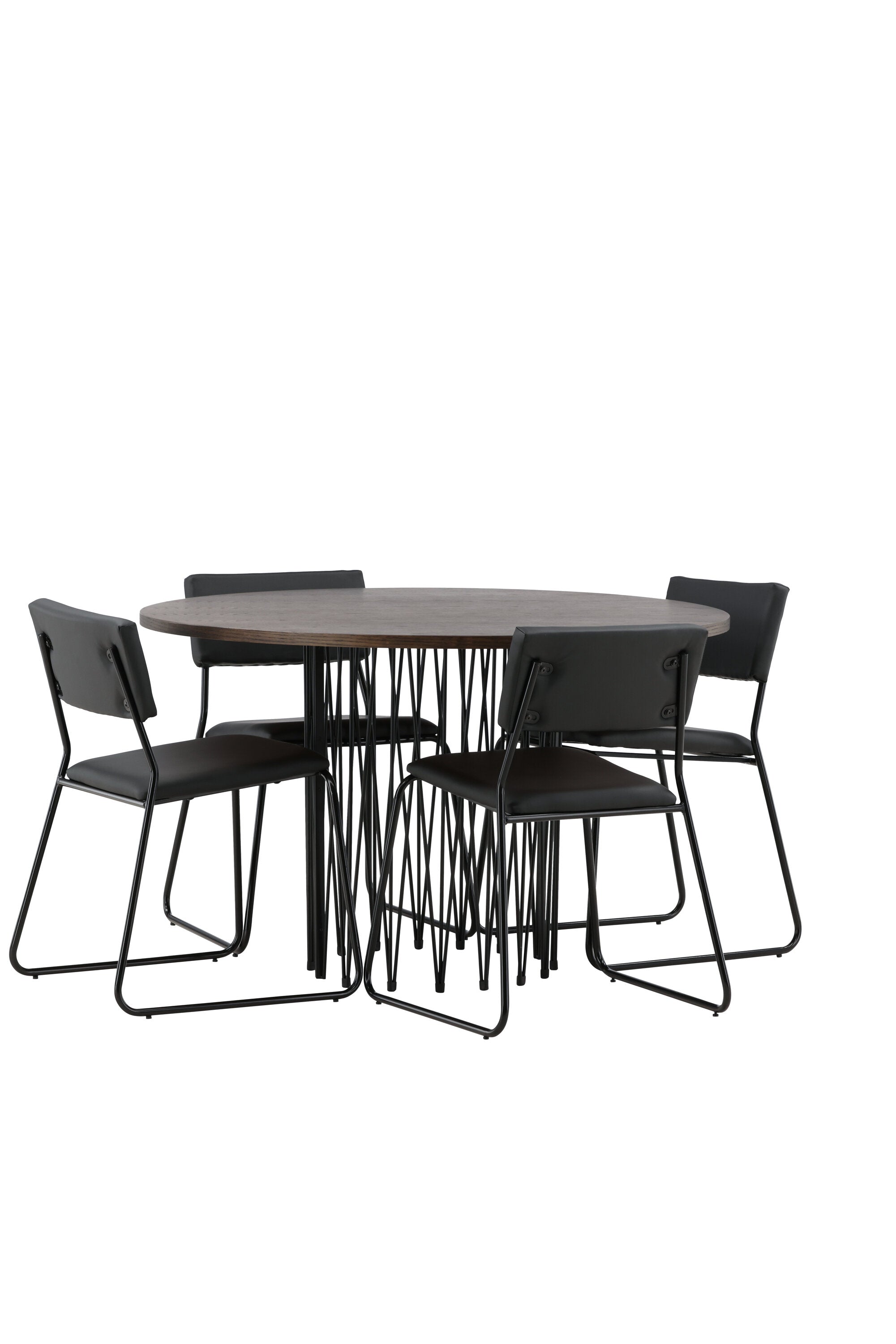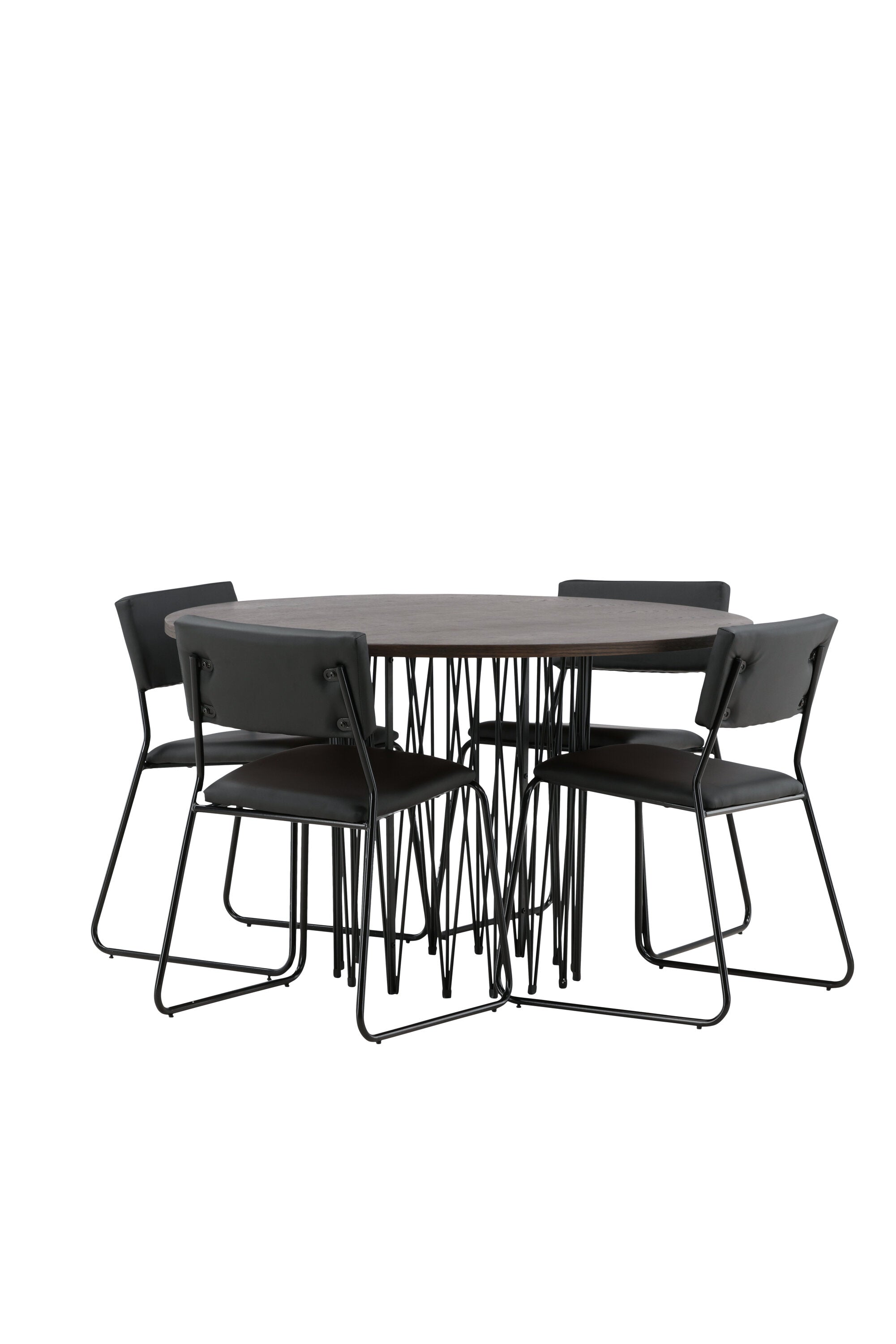 Jídelní skupina, která vyzařuje moderní design a jemné tvary! Náš kulatý jídelní stůl Stone má fantastický skandinávský design, který se hodí k davu. Stůl má krásnou hnědou desku z MDF s dýhou a ozdobný rám ve tvaru válce z černého kovu. Zde společně s našimi oblíbenými jídelními židlemi Kenth. Židle má minimalistický, moderní design, který vytváří vzdušný pocit v místnosti. Opěradlo a sedák jsou z černé PU kůže a polyesteru a úzké nohy židle jsou ze železa. Užijte si v budoucnu příjemná jídla – tady nikdo nekončí na hraně!