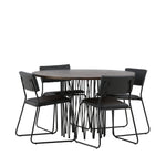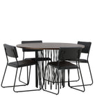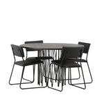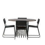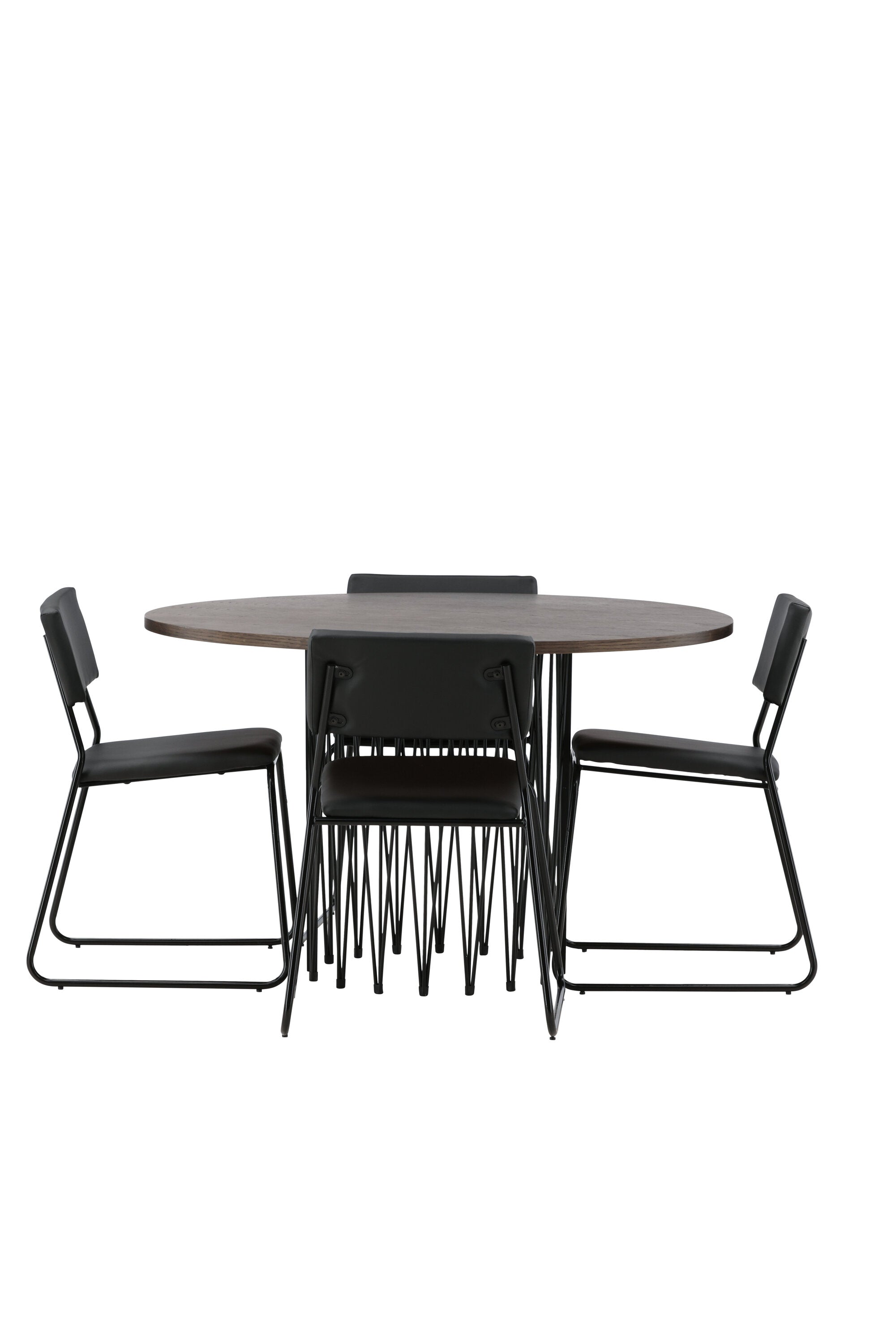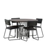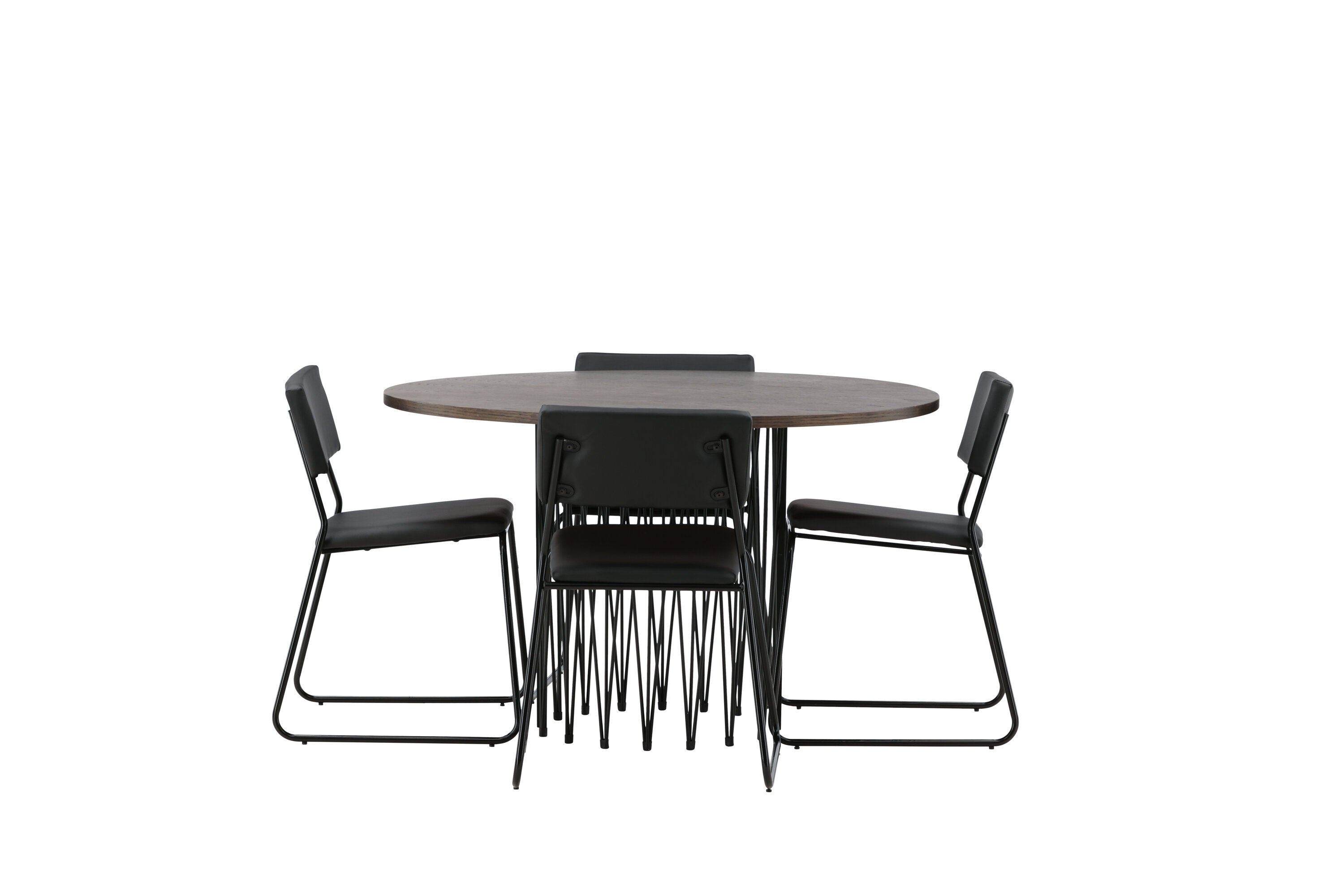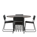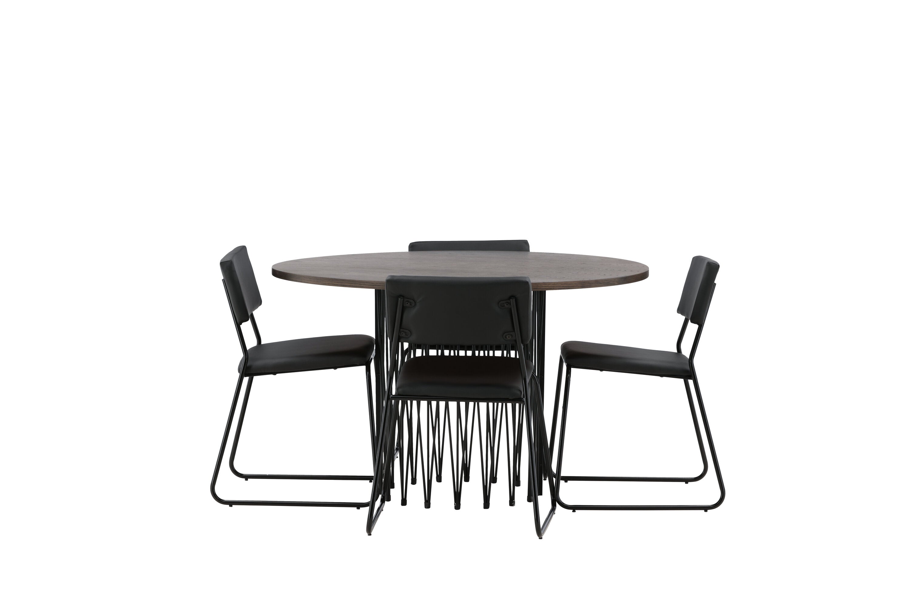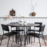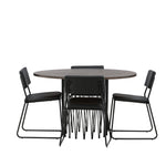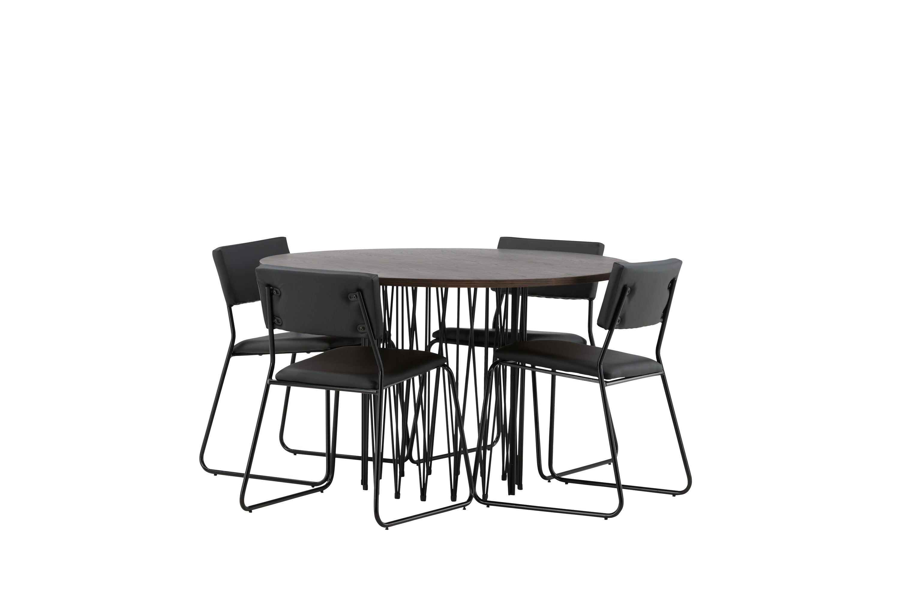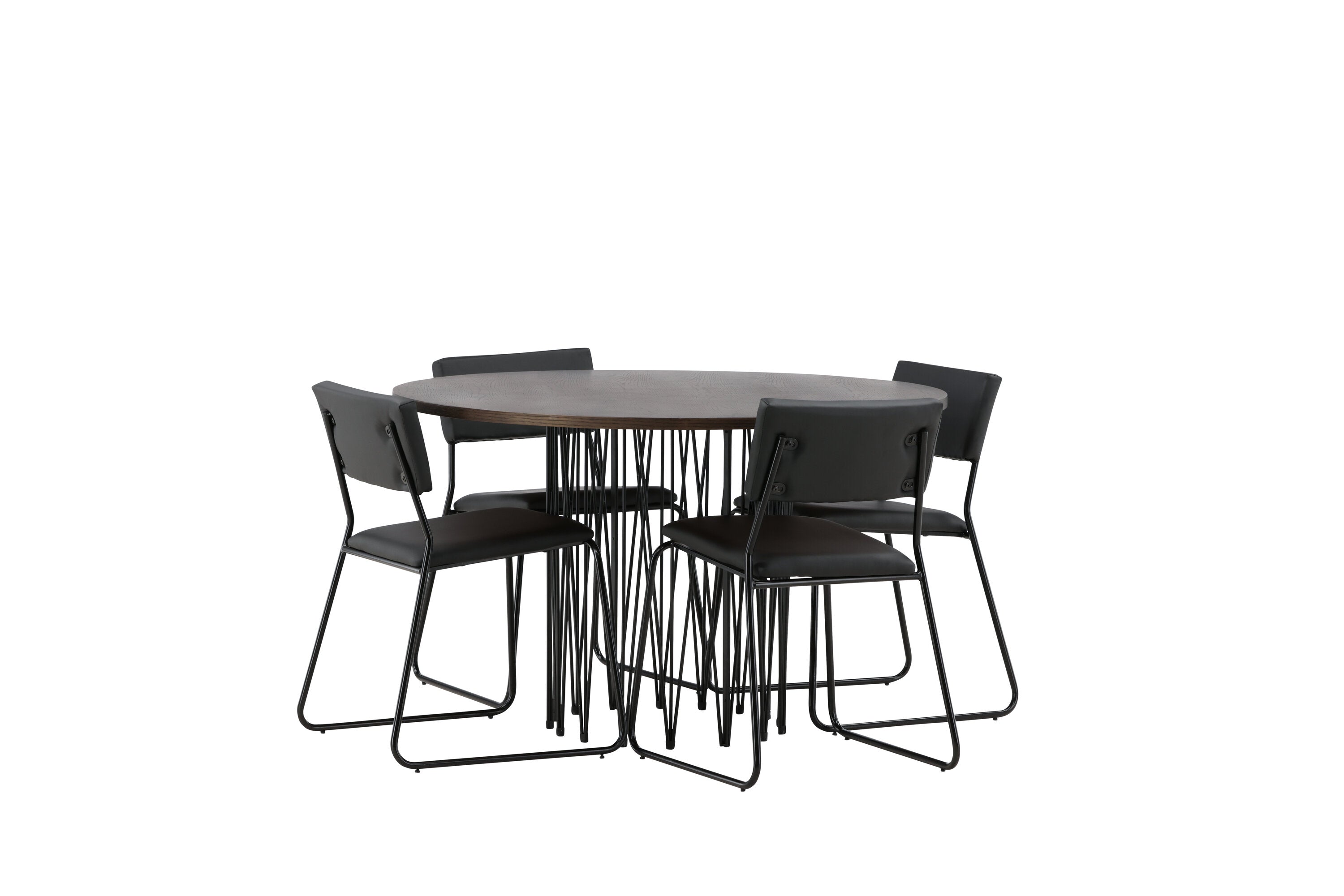 Jídelní skupina, která vyzařuje moderní design a jemné tvary! Náš kulatý jídelní stůl Stone má fantastický skandinávský design, který se hodí k davu. Stůl má krásnou hnědou desku z MDF s dýhou a ozdobný rám ve tvaru válce z černého kovu. Zde společně s našimi oblíbenými jídelními židlemi Kenth. Židle má minimalistický, moderní design, který vytváří vzdušný pocit v místnosti. Opěradlo a sedák jsou z černé PU kůže a polyesteru a úzké nohy židle jsou ze železa. Užijte si v budoucnu příjemná jídla – tady nikdo nekončí na hraně!