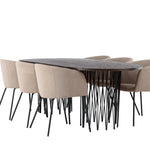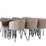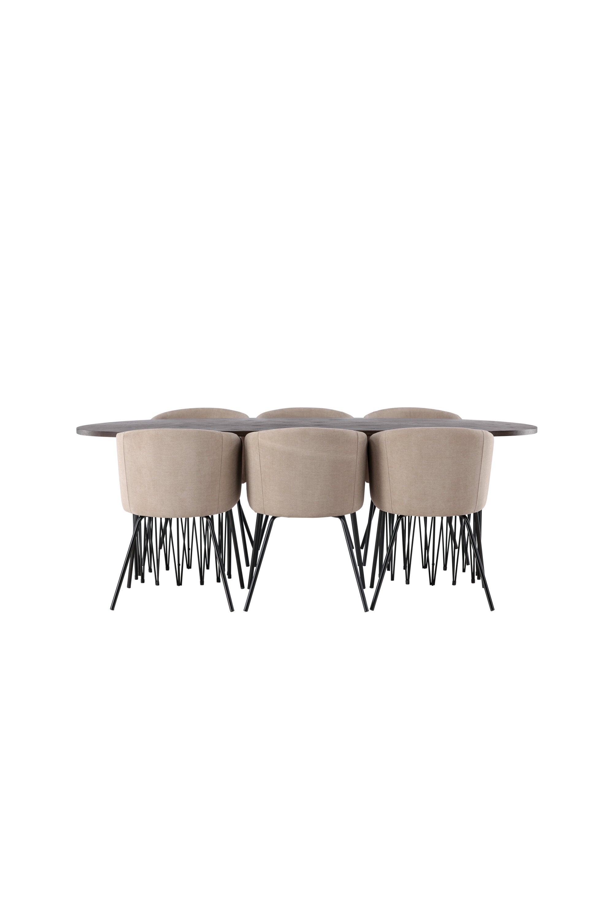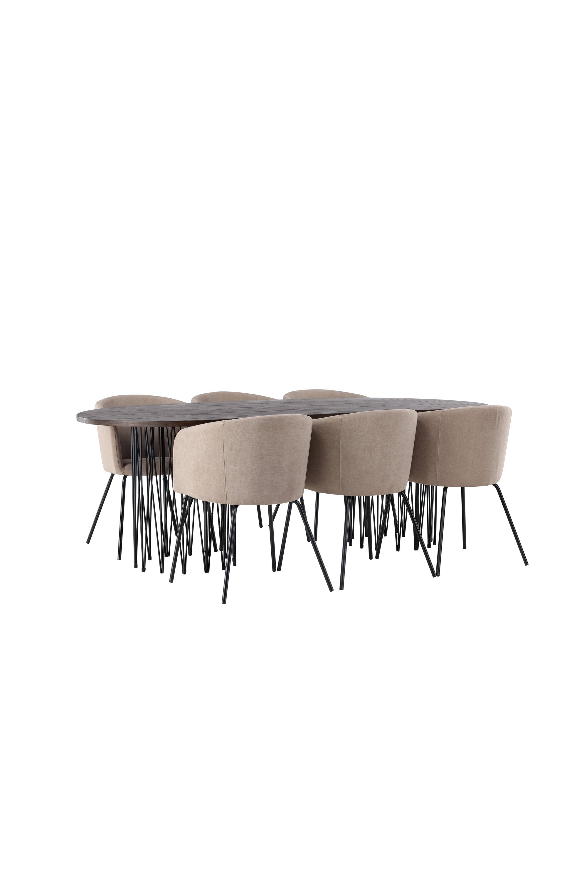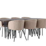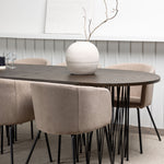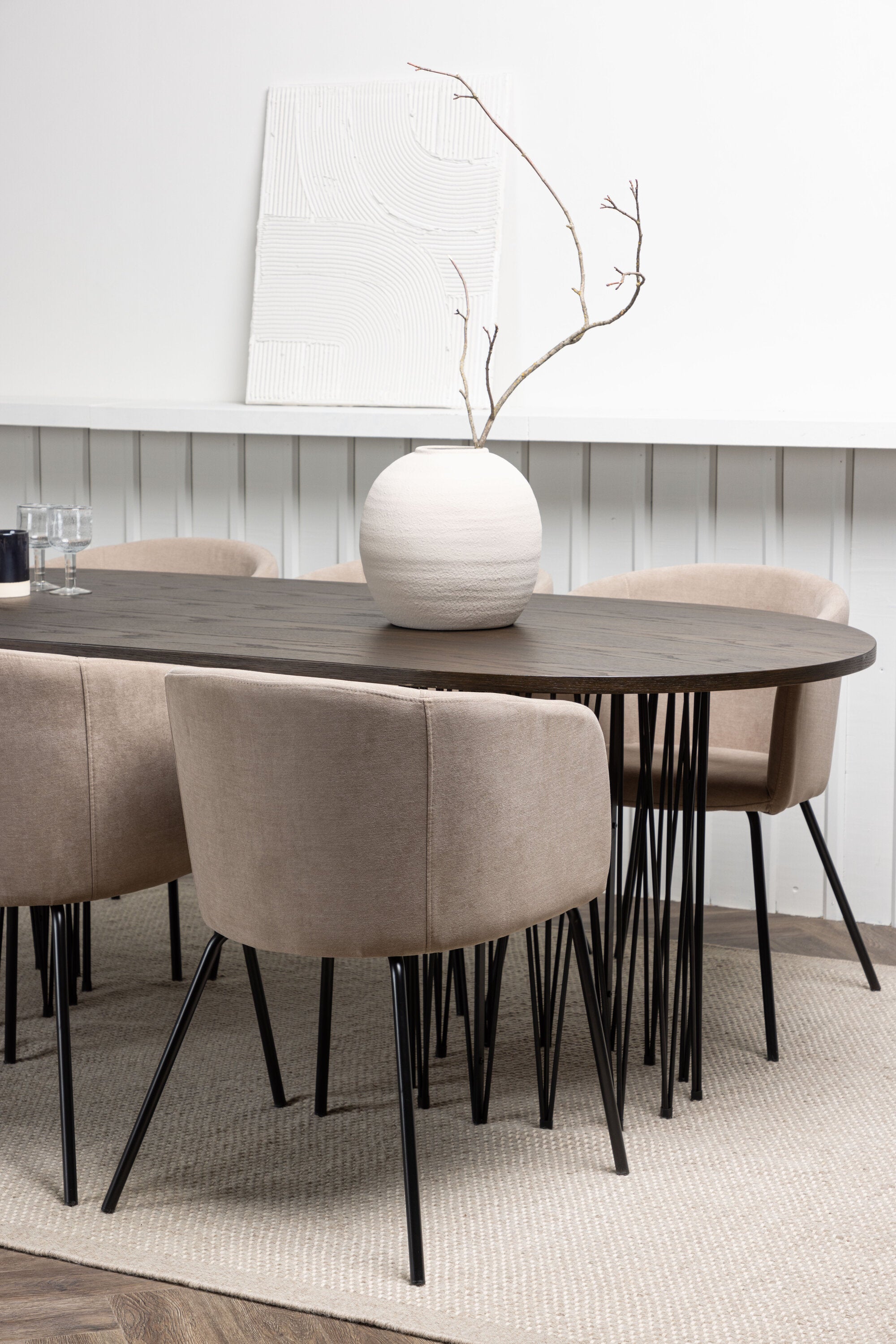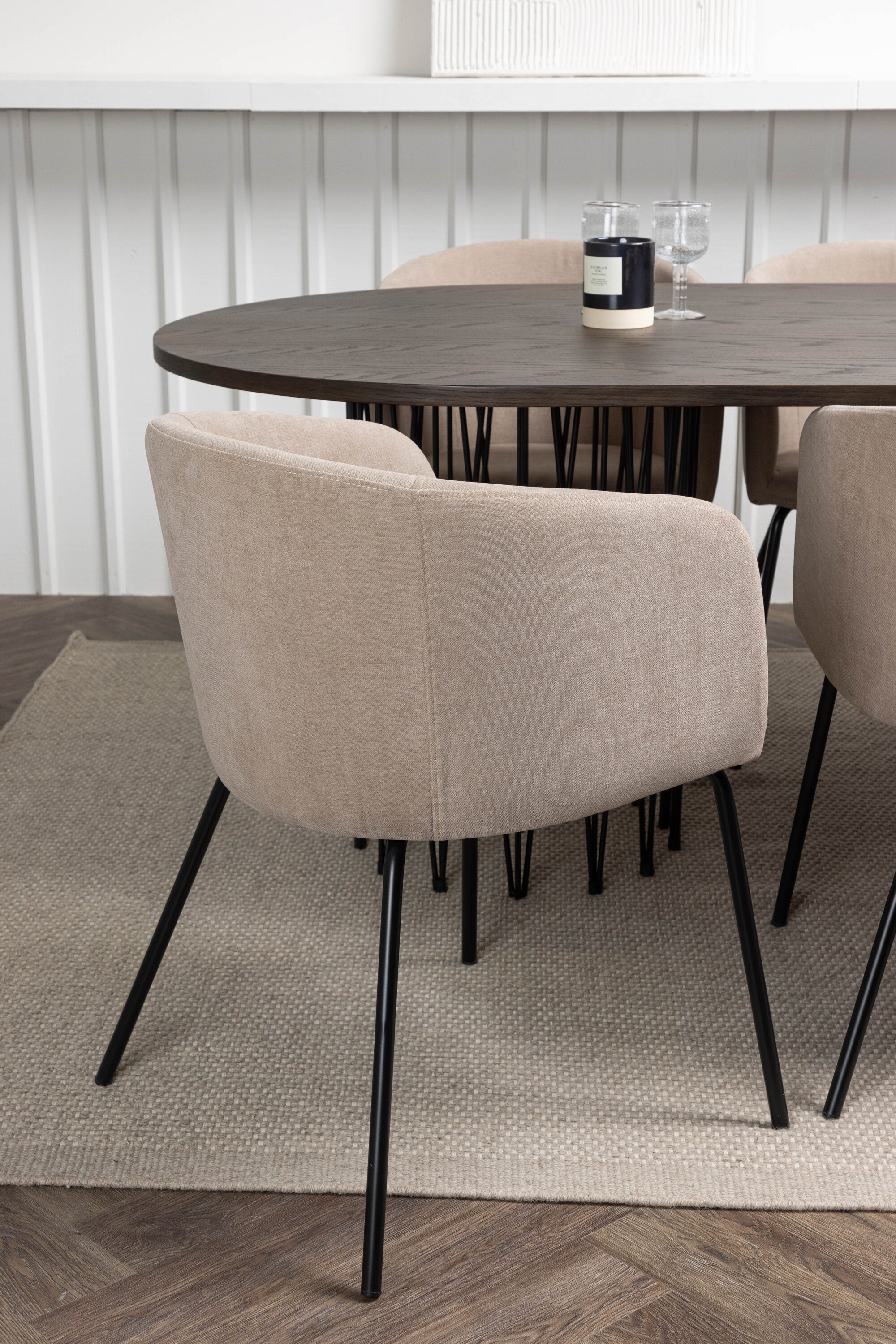 Jídelní skupina v zemitých tónech! Náš oválný jídelní stůl Stone zaujme svým módním designem. Stůl má krásnou hnědou desku z MDF s dýhou a dva ozdobné válcové rámy v černém kovu. Zde spolu s našimi pohodlnými jídelními židlemi Berit. Židle má celočalouněný design s mírně zaobleným opěradlem a sedákem z polyesterového lnu a úzkými nohami z černého železa. Stejně chytré jako stylové! Rozměry stolu: 220x100cm.
