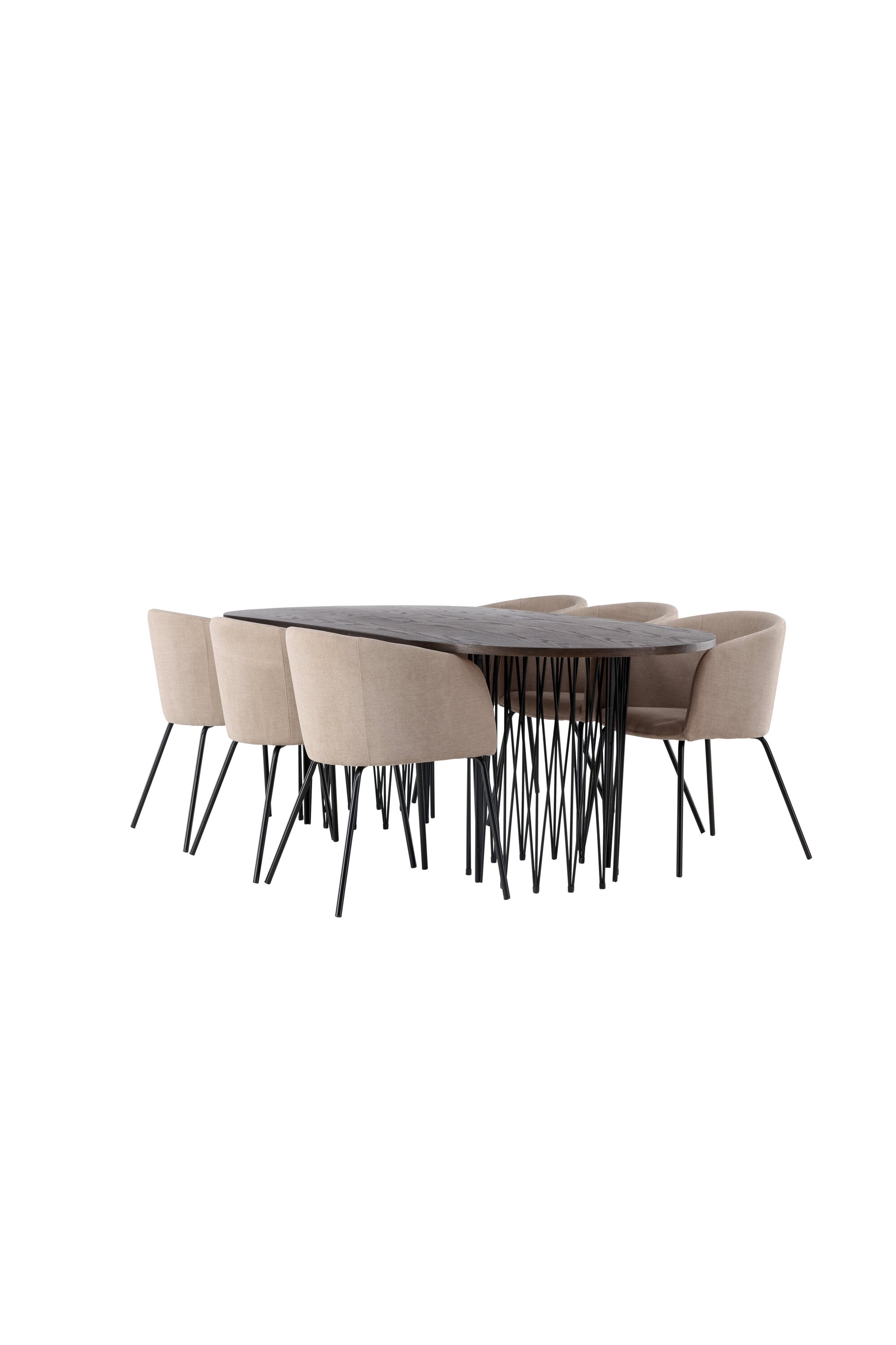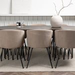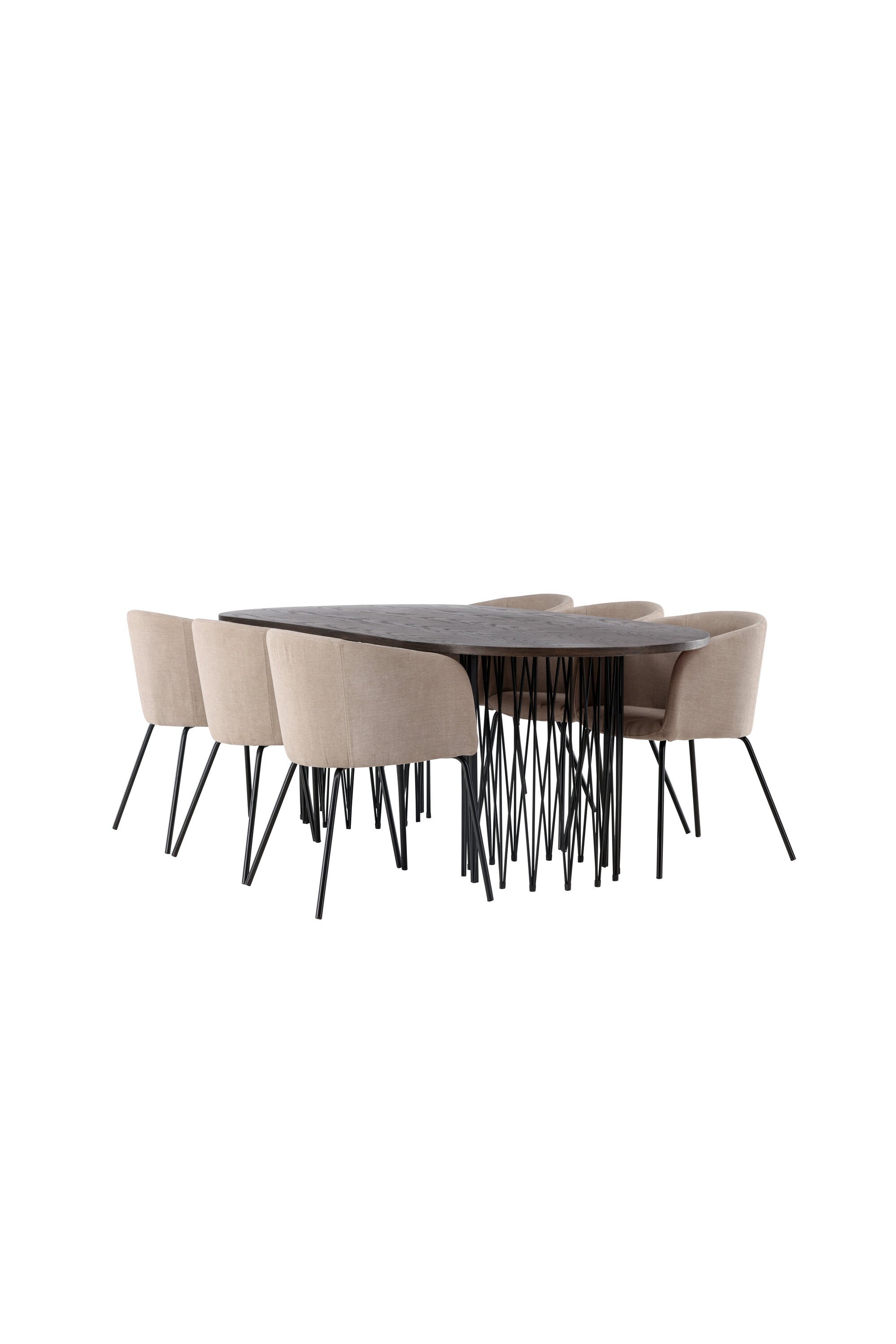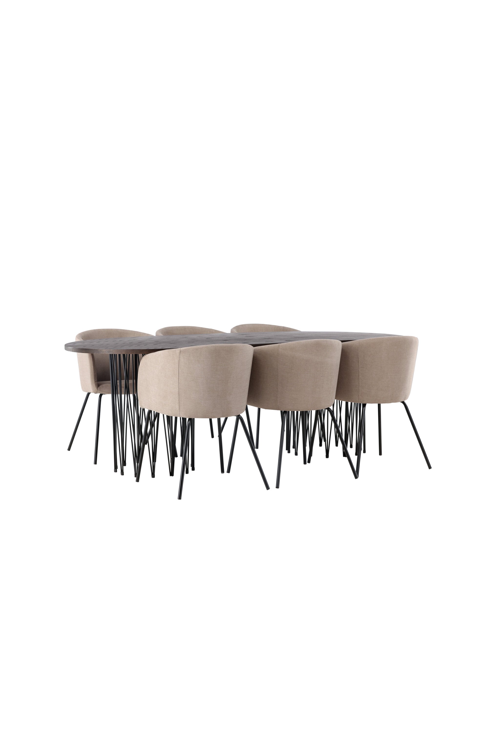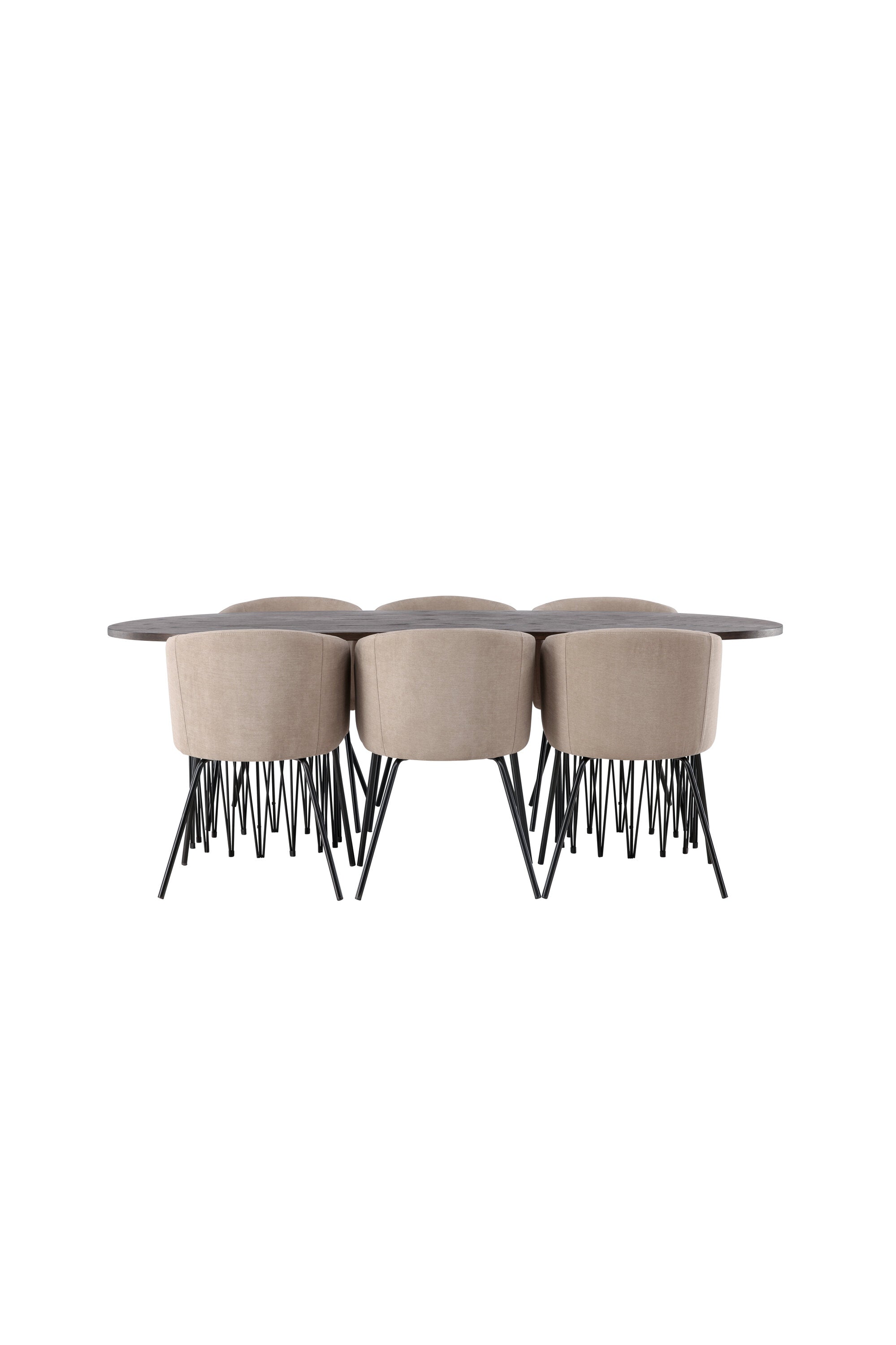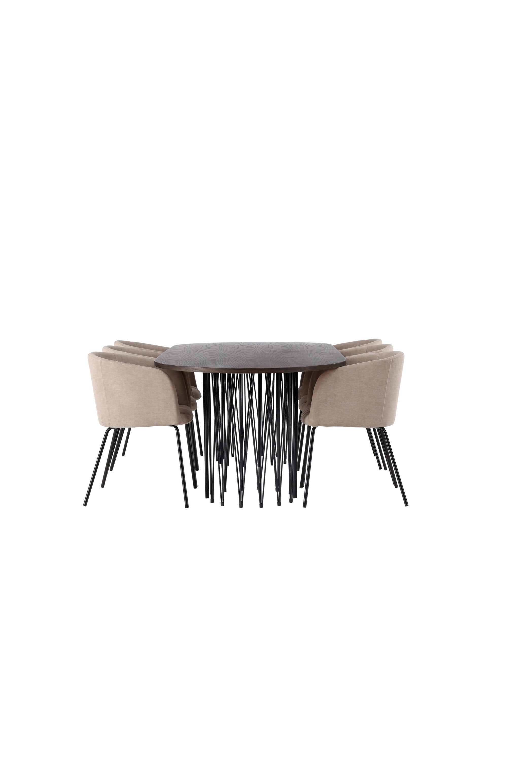Jídelní skupina v zemitých tónech! Náš oválný jídelní stůl Stone zaujme svým módním designem. Stůl má krásnou hnědou desku z MDF s dýhou a dva ozdobné válcové rámy v černém kovu. Zde spolu s našimi pohodlnými jídelními židlemi Berit. Židle má celočalouněný design s mírně zaobleným opěradlem a sedákem z polyesterového lnu a úzkými nohami z černého železa. Stejně chytré jako stylové! Rozměry stolu: 220x100cm.