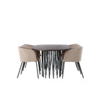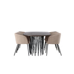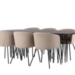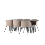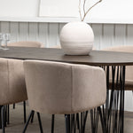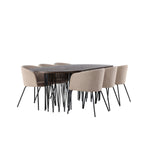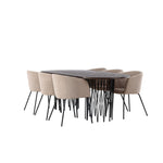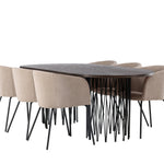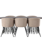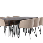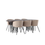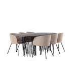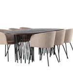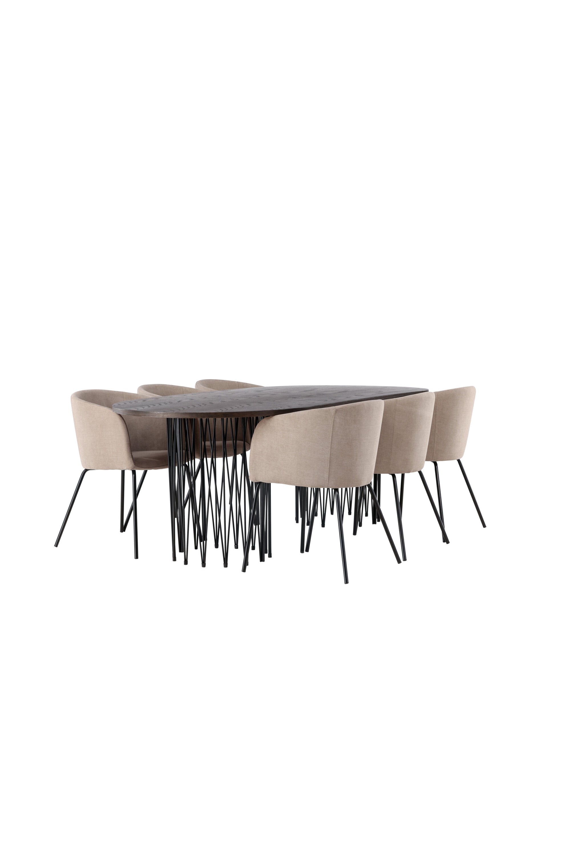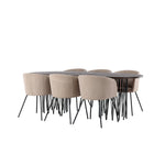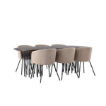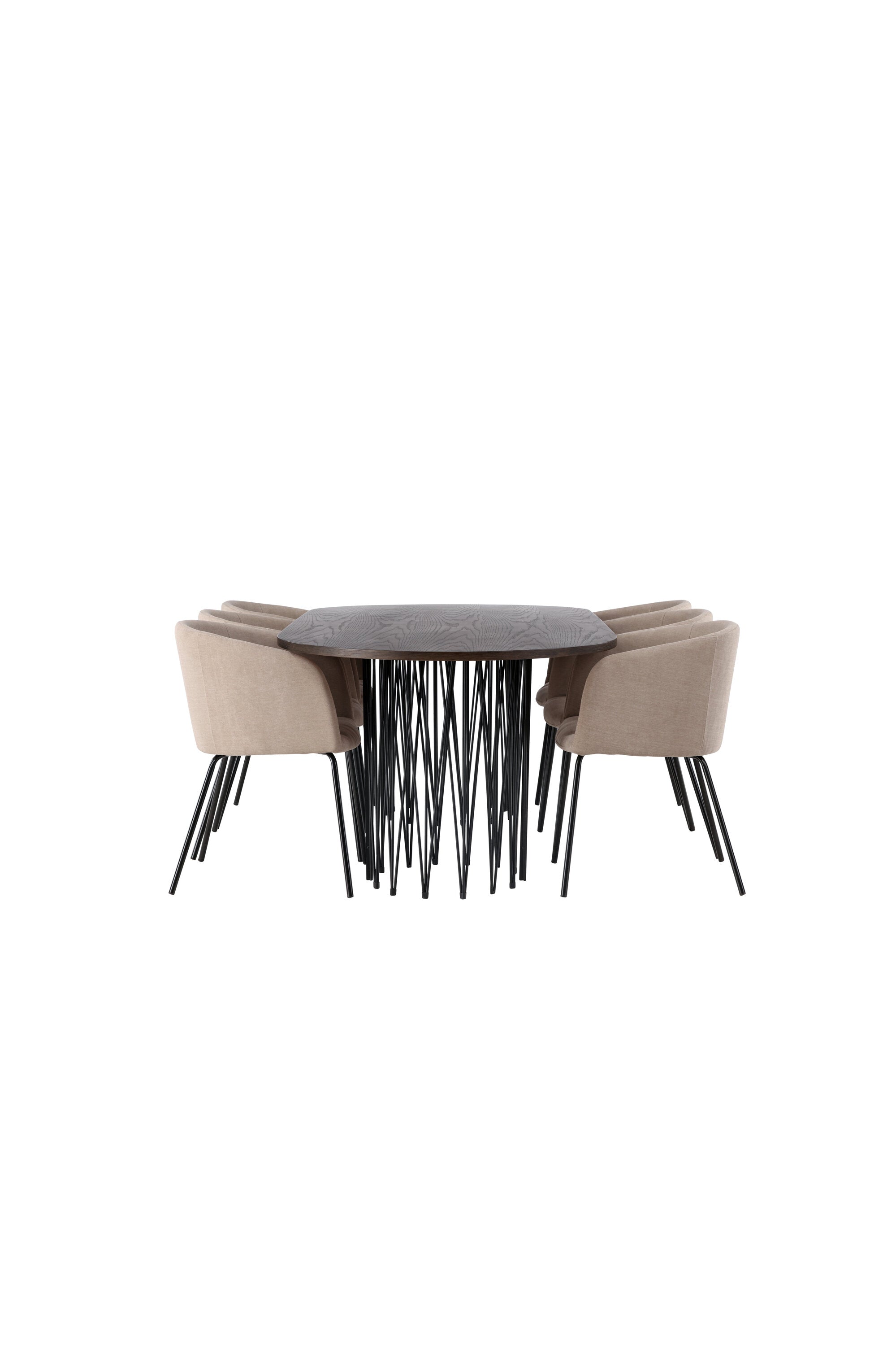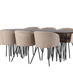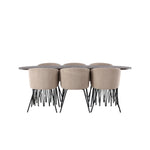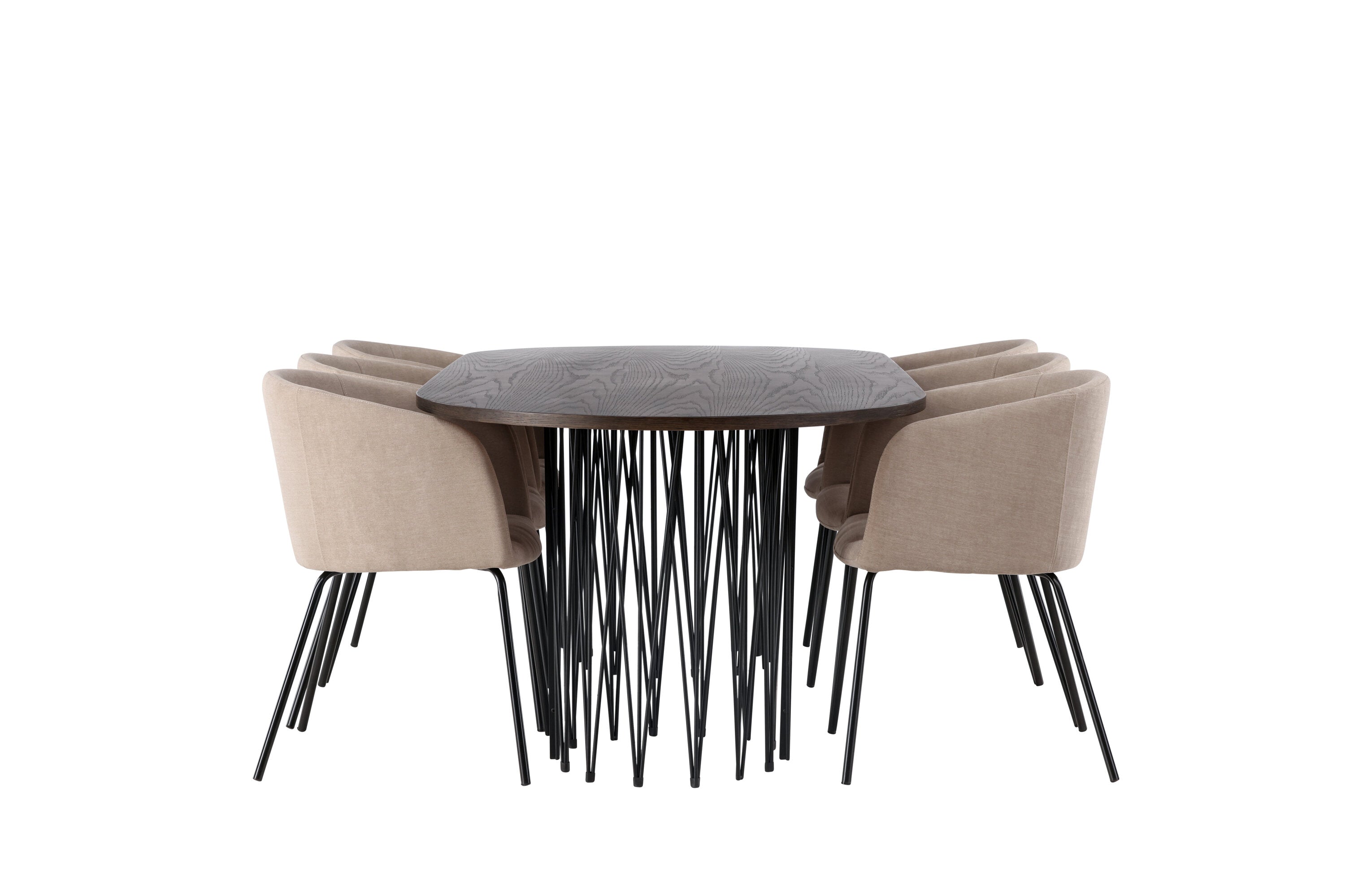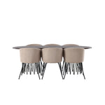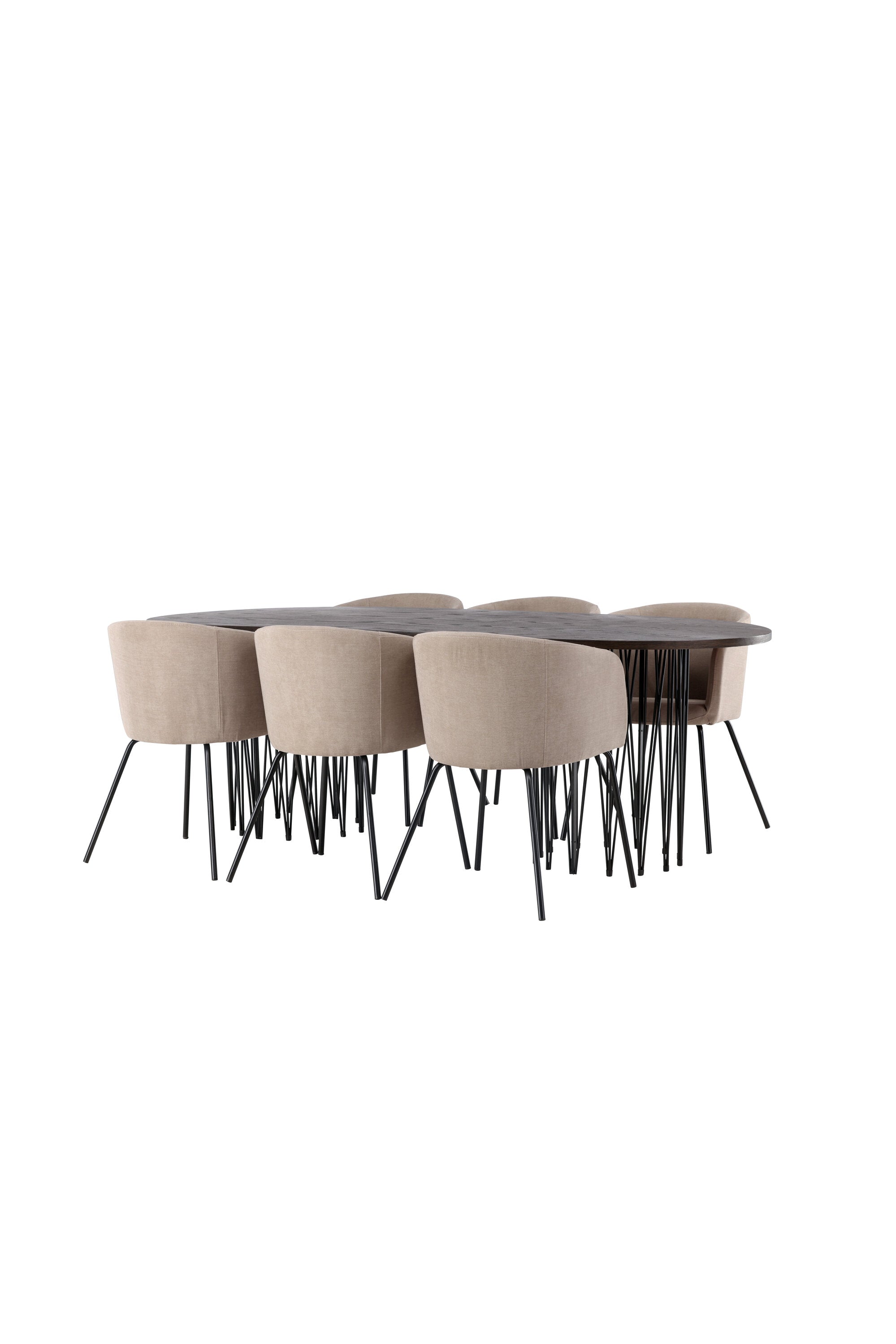 Jídelní skupina v zemitých tónech! Náš oválný jídelní stůl Stone zaujme svým módním designem. Stůl má krásnou hnědou desku z MDF s dýhou a dva ozdobné válcové rámy v černém kovu. Zde spolu s našimi pohodlnými jídelními židlemi Berit. Židle má celočalouněný design s mírně zaobleným opěradlem a sedákem z polyesterového lnu a úzkými nohami z černého železa. Stejně chytré jako stylové! Rozměry stolu: 220x100cm.