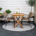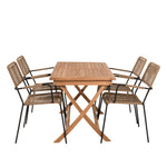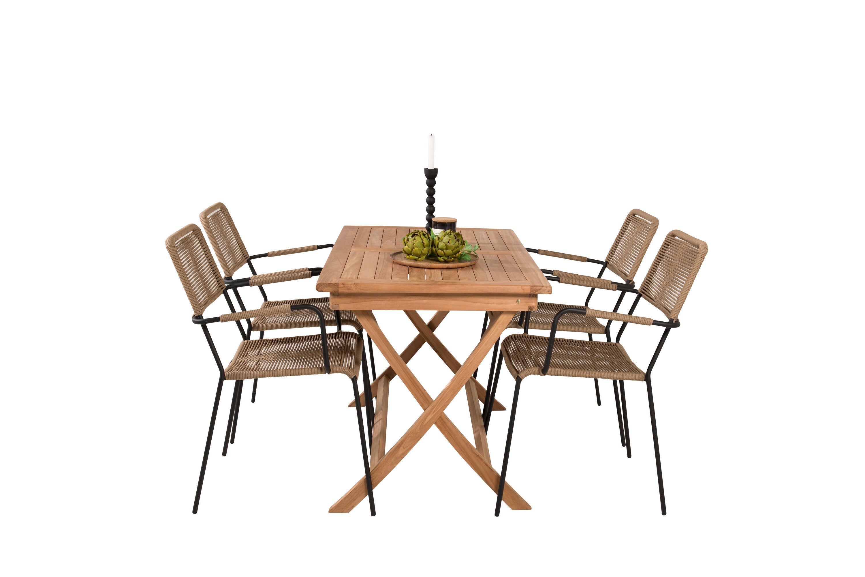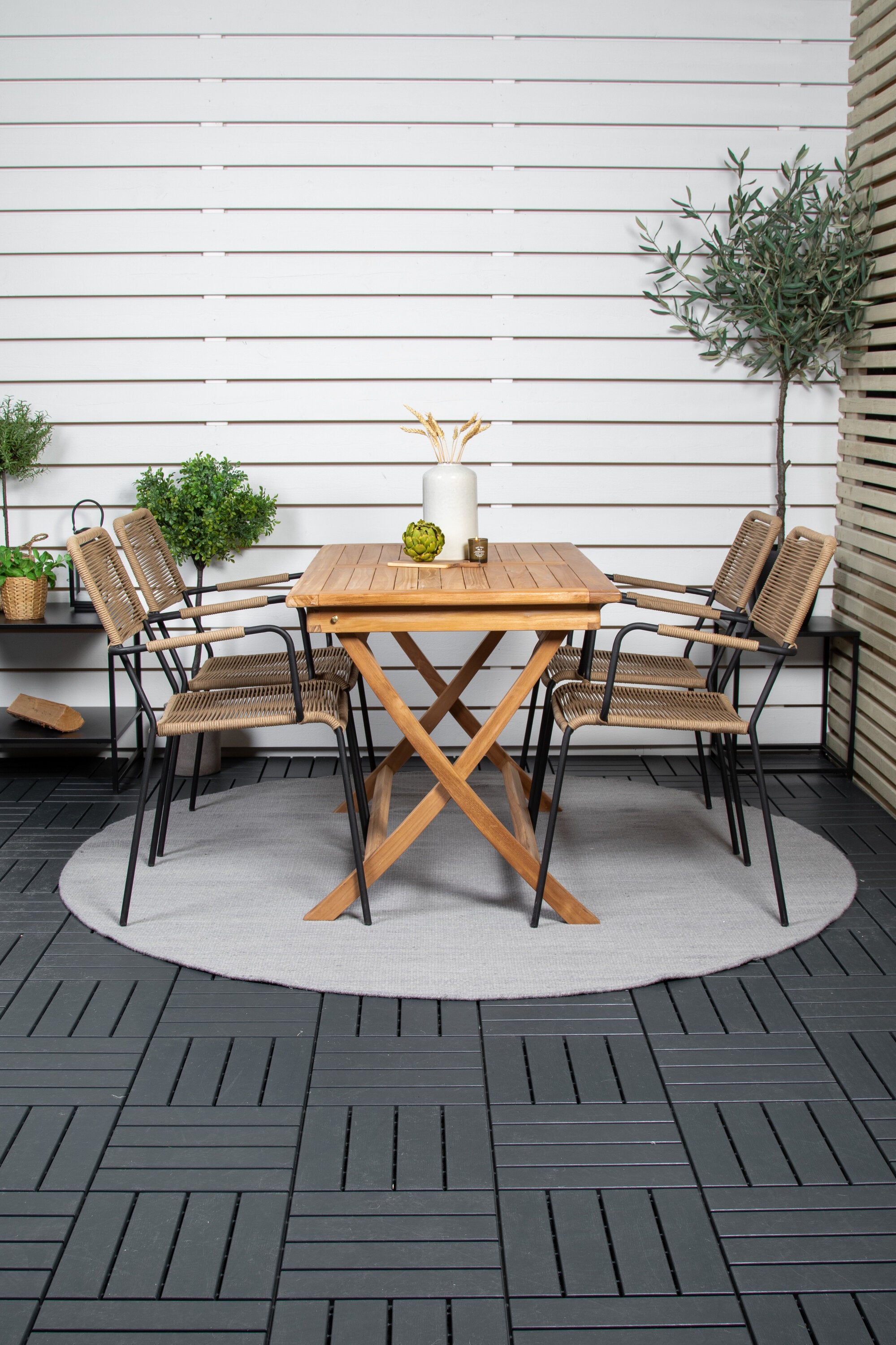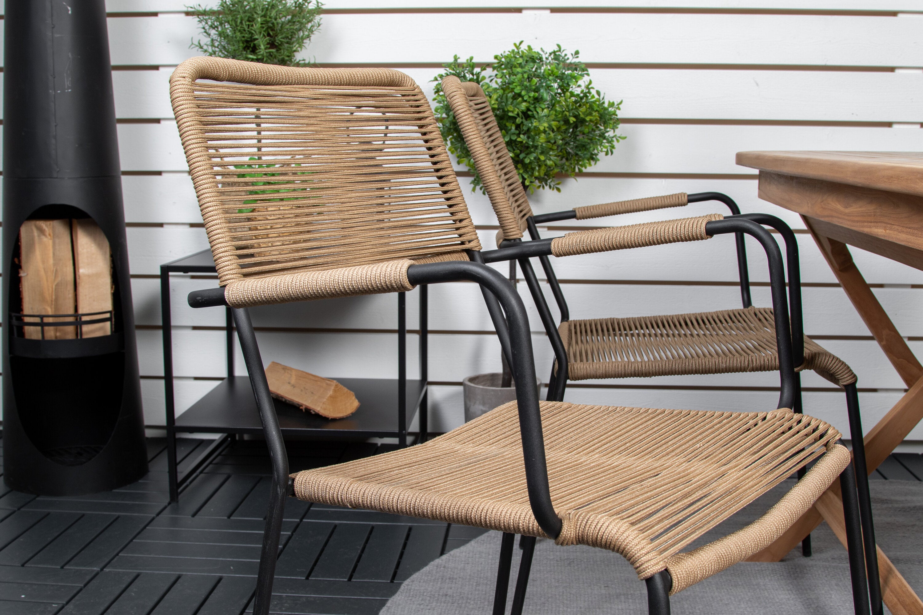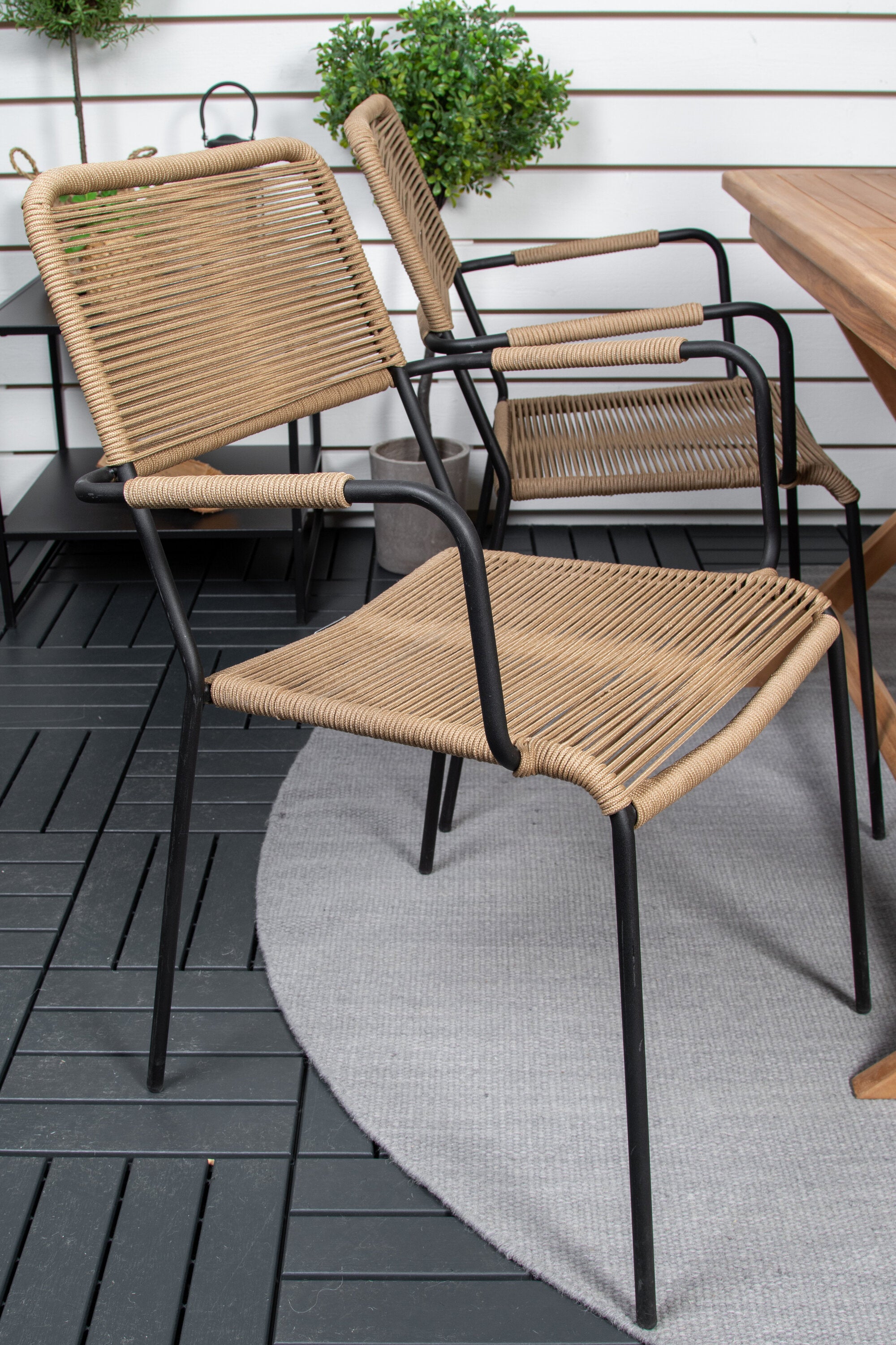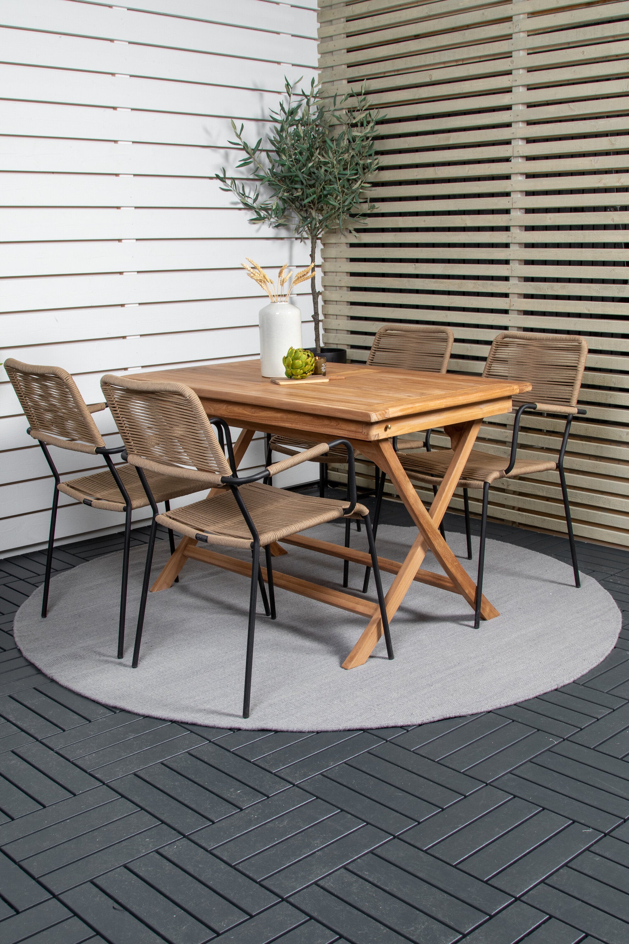 Zařiďte terasu v zemitých barvách se skupinou jídel ve skandinávském designu! Náš oblíbený obdélníkový jídelní stůl Kenya má nadčasový design s žebrovanou verzí ve vkusném teaku. Křížové nohy působí pevným a okouzlujícím dojmem. Rozměry: 120x70 cm. Zde v štíhlé kombinaci s lahodnými jídelními židlemi ze série Lindos. Židle mají integrované područky z černé oceli a sedák z odolného lana v barvě latte. Zařiďte nádvoří příjemně a vytvořte poutač, který zaujme!
