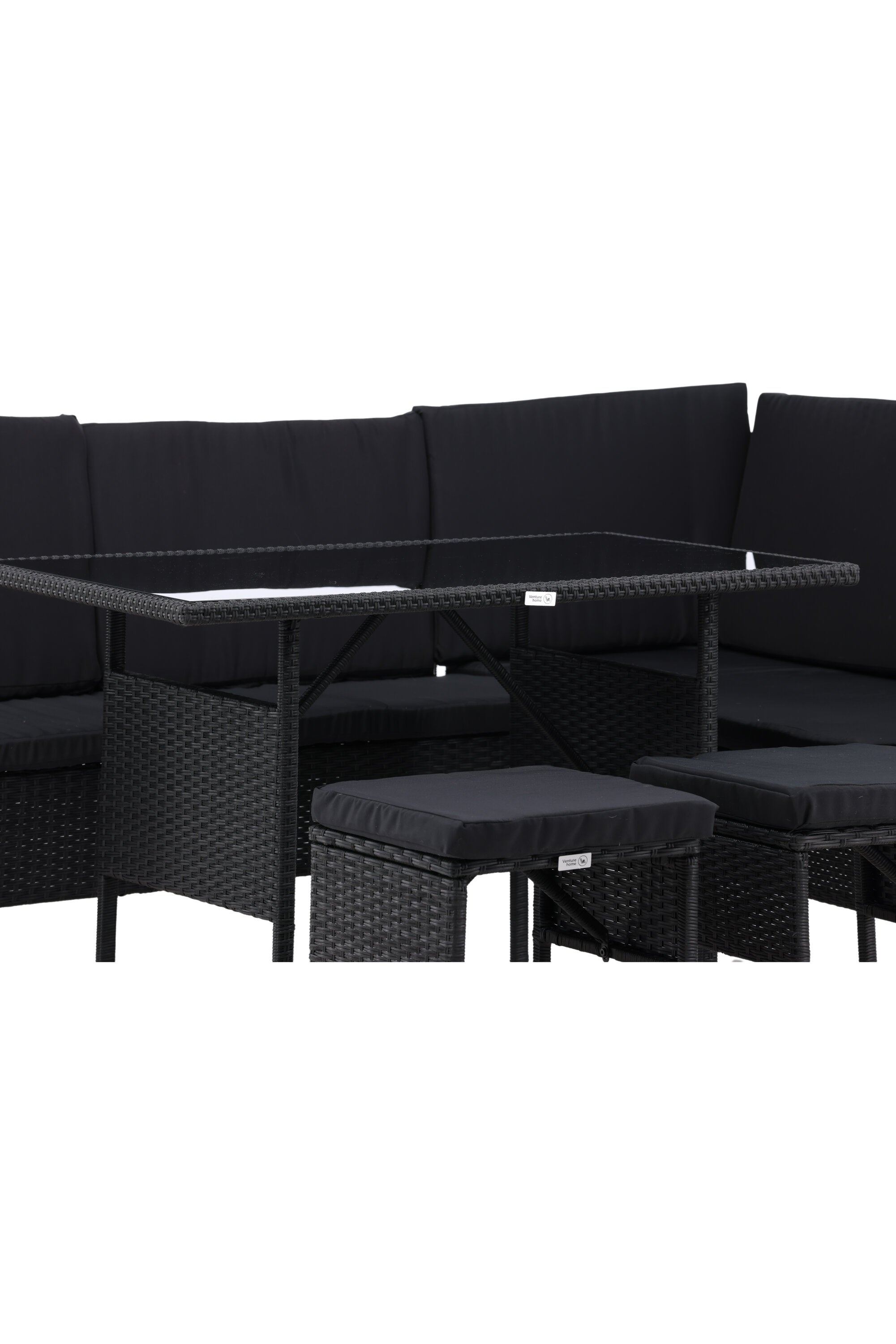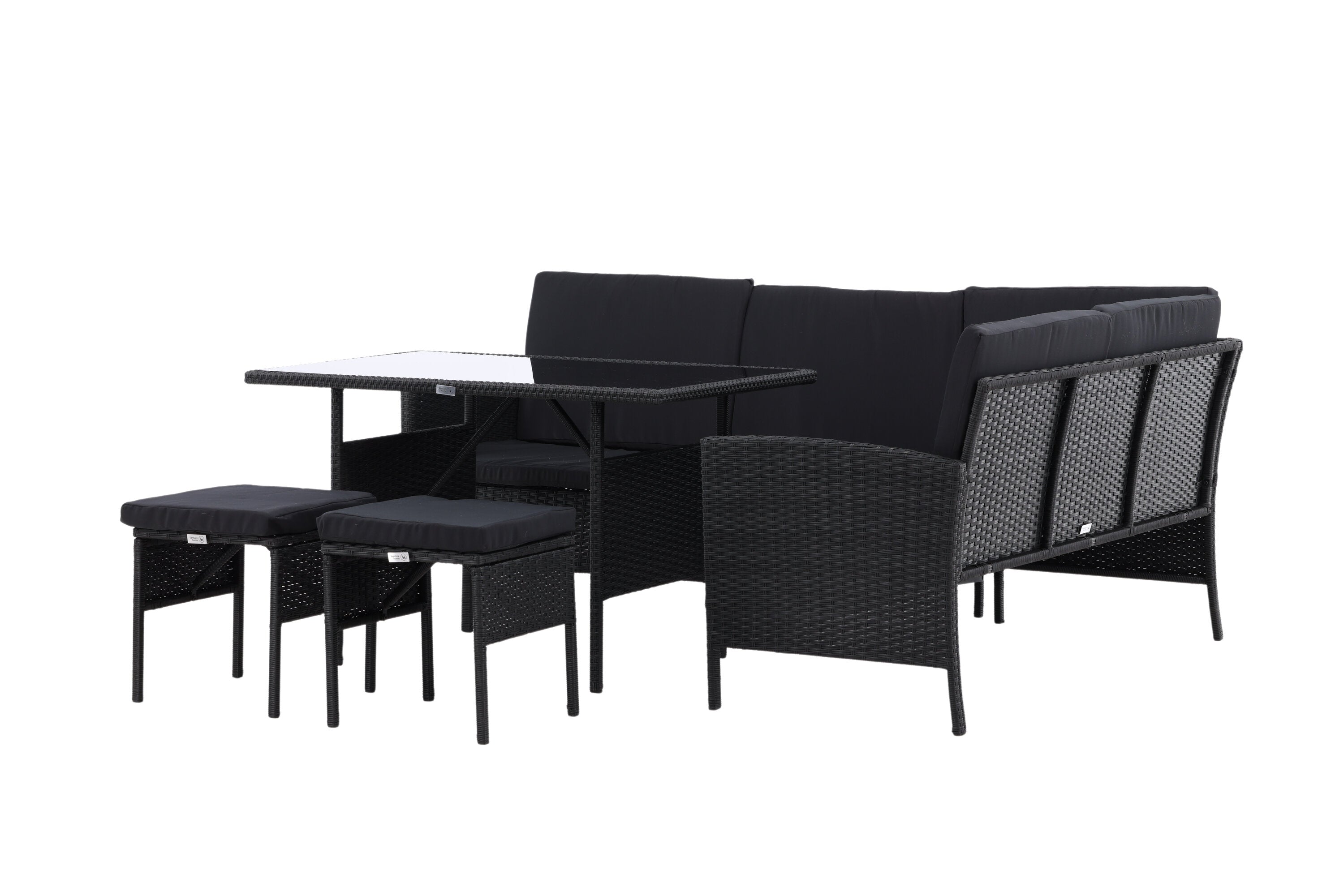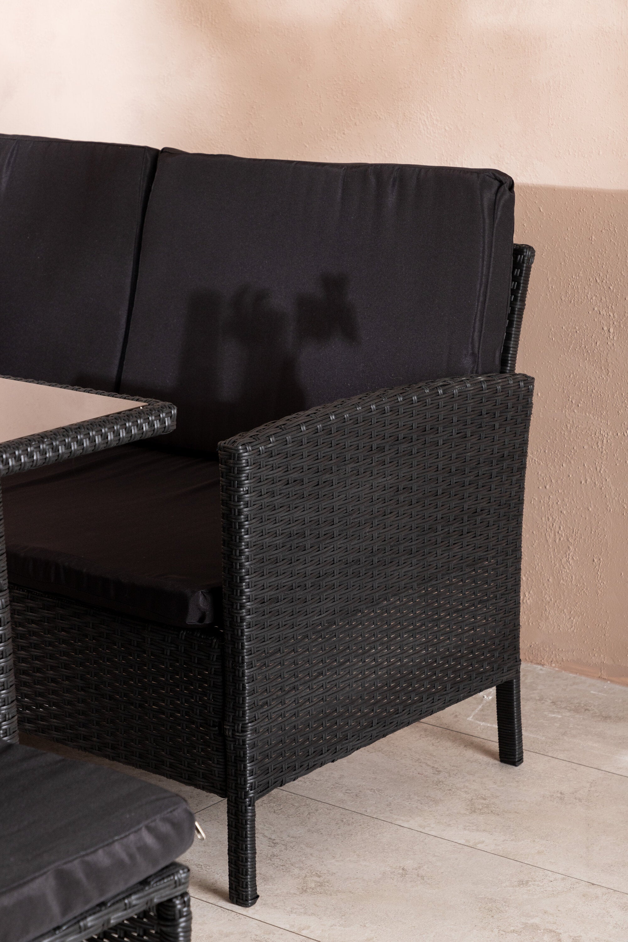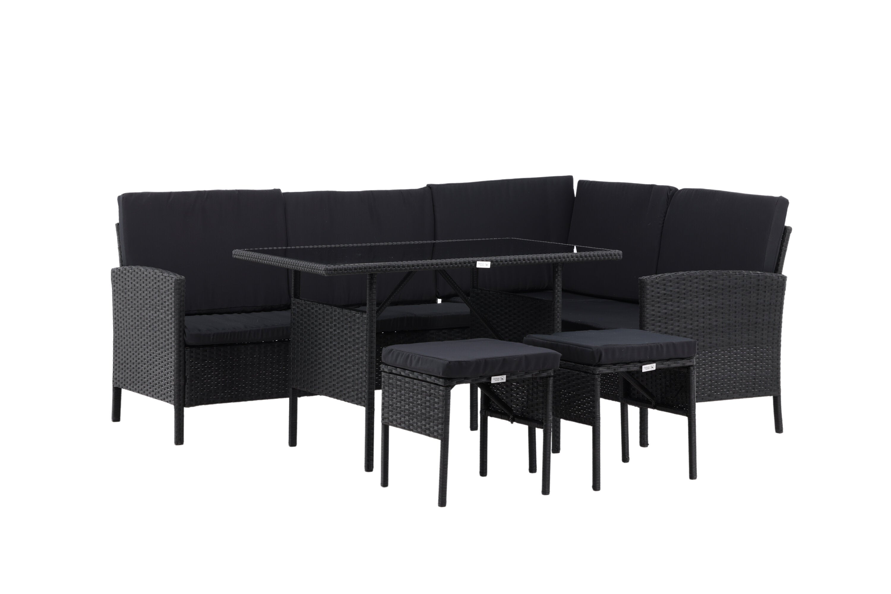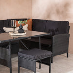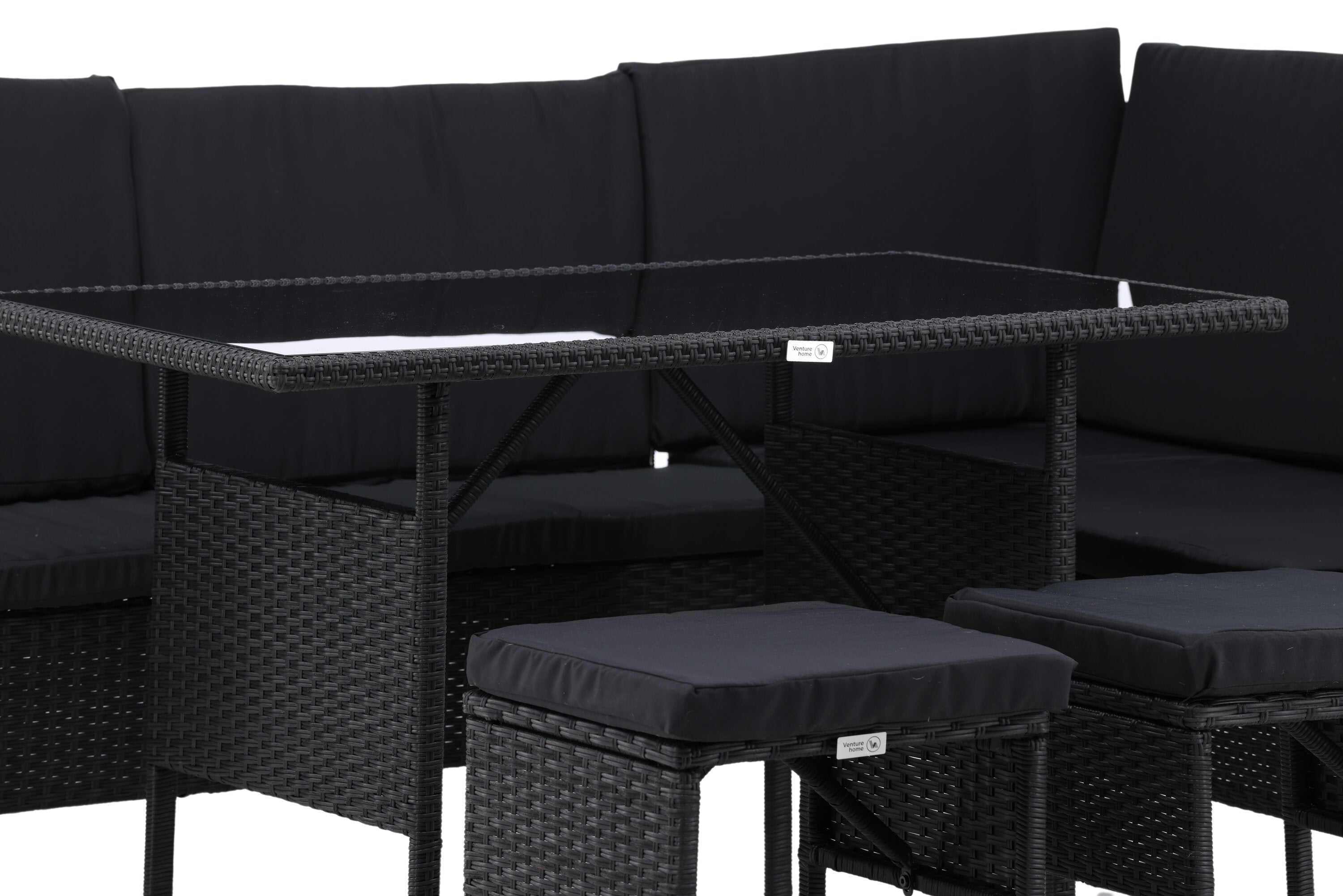 Skupina pohovek Knock je skvělá pro vaši terasu nebo terasu a je vytvořena s důrazem na pohodlí a nadčasový design. Sedací soupravu tvoří rohová sedací souprava v černém umělém ratanu se čtyřmi sedáky a jedním rohovým dílem, dvěma kohouty a vyšším stolem z umělého ratanu se skleněným stolem. Černé polštáře jsou součástí skupiny pohovek a přispívají k příjemnému pocitu!