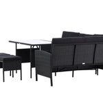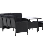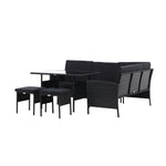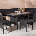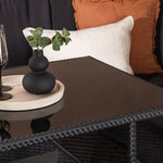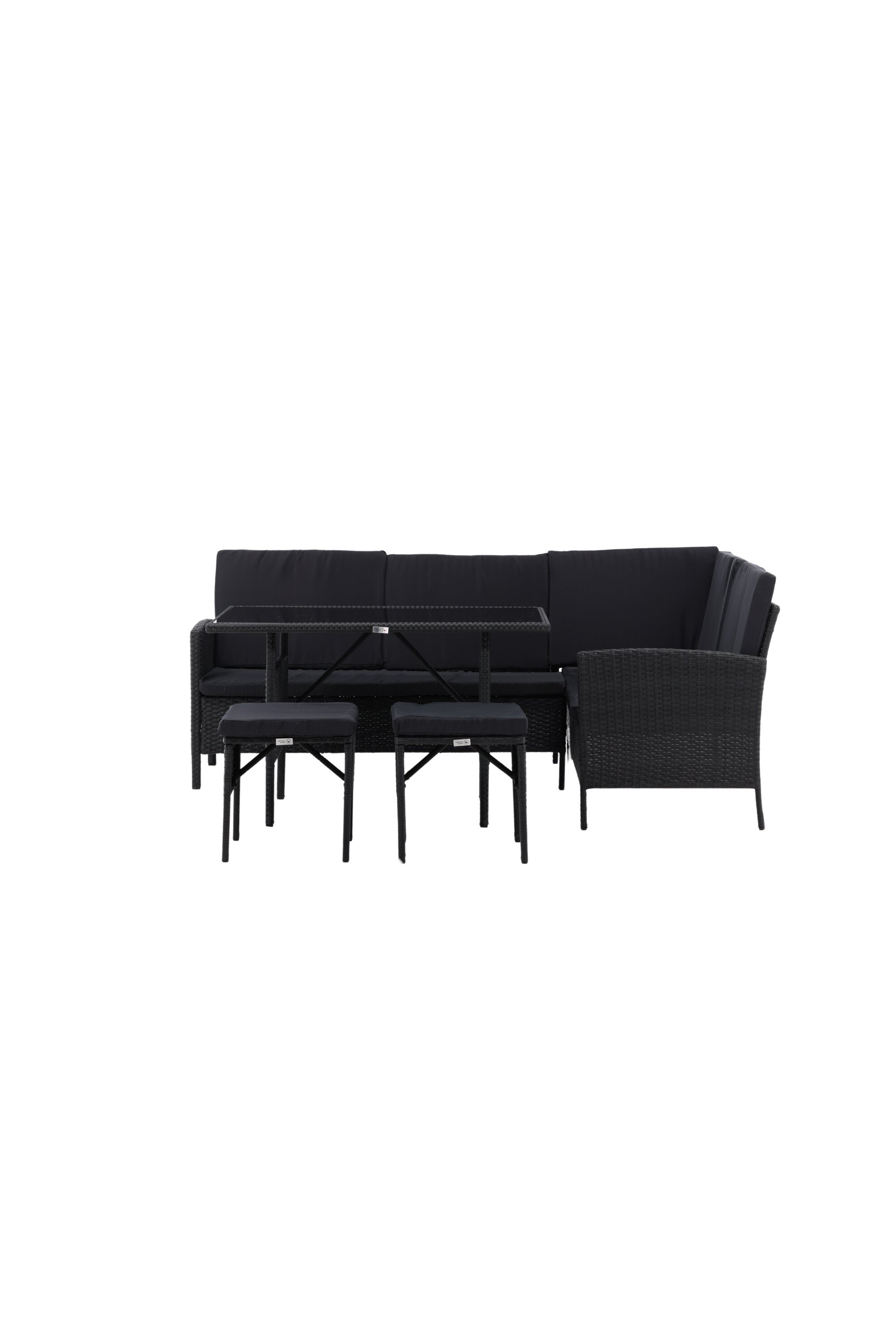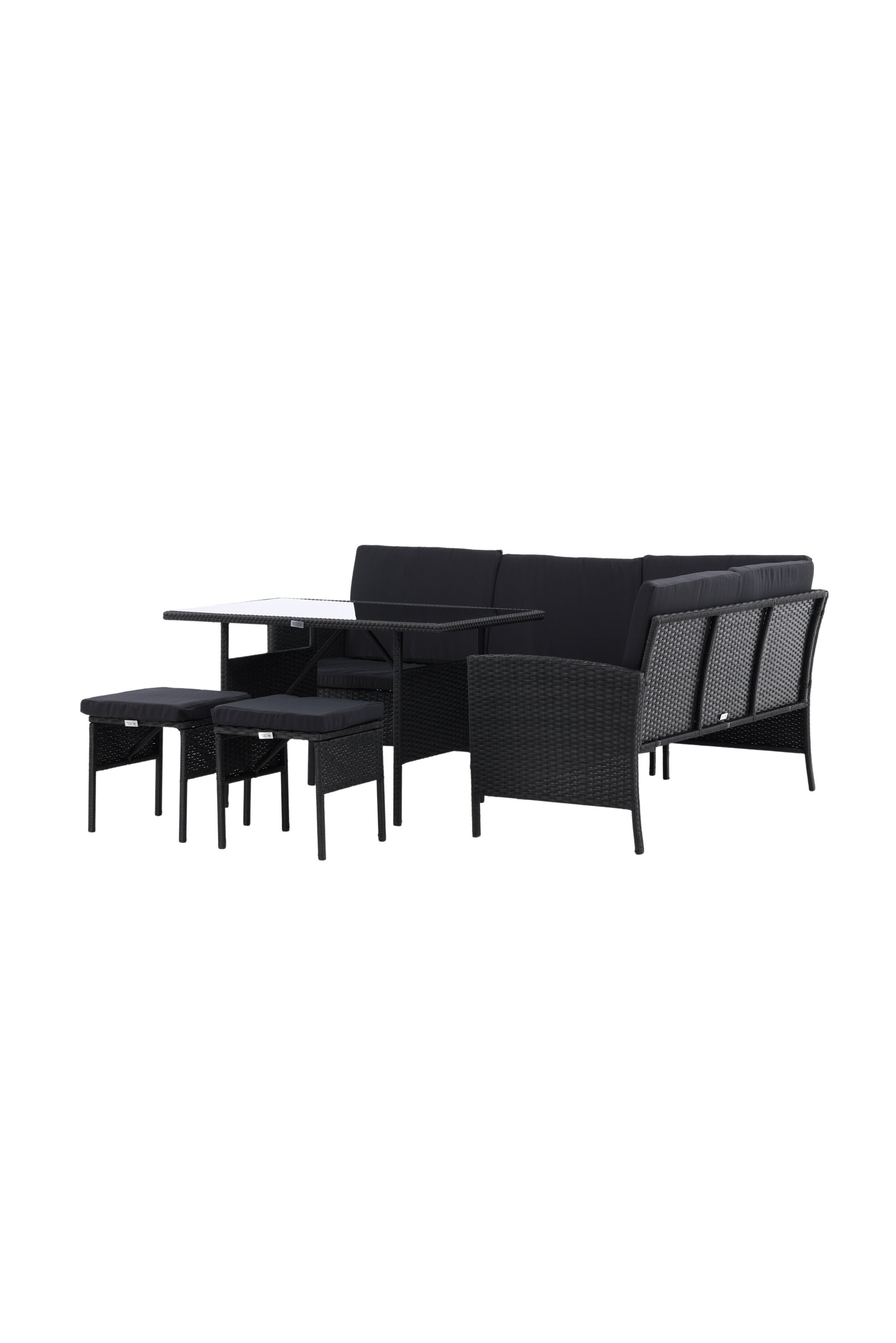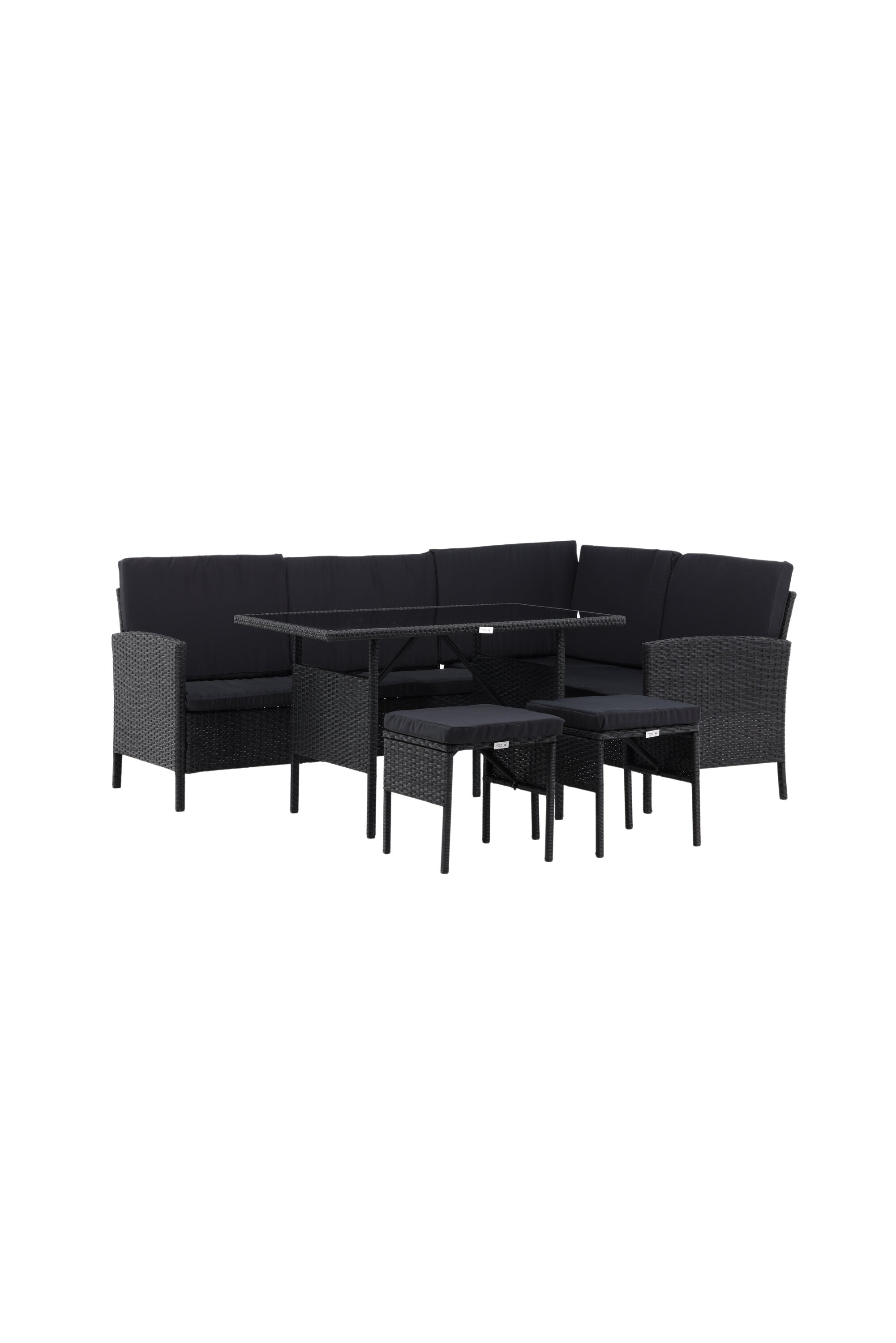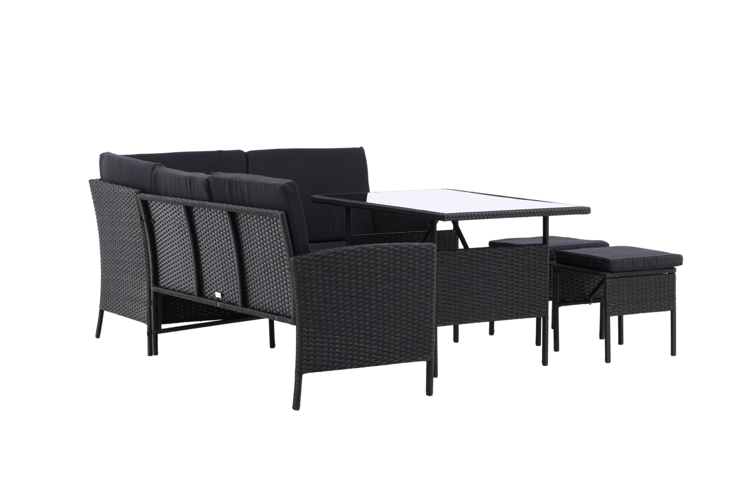 Skupina pohovek Knock je skvělá pro vaši terasu nebo terasu a je vytvořena s důrazem na pohodlí a nadčasový design. Sedací soupravu tvoří rohová sedací souprava v černém umělém ratanu se čtyřmi sedáky a jedním rohovým dílem, dvěma kohouty a vyšším stolem z umělého ratanu se skleněným stolem. Černé polštáře jsou součástí skupiny pohovek a přispívají k příjemnému pocitu!