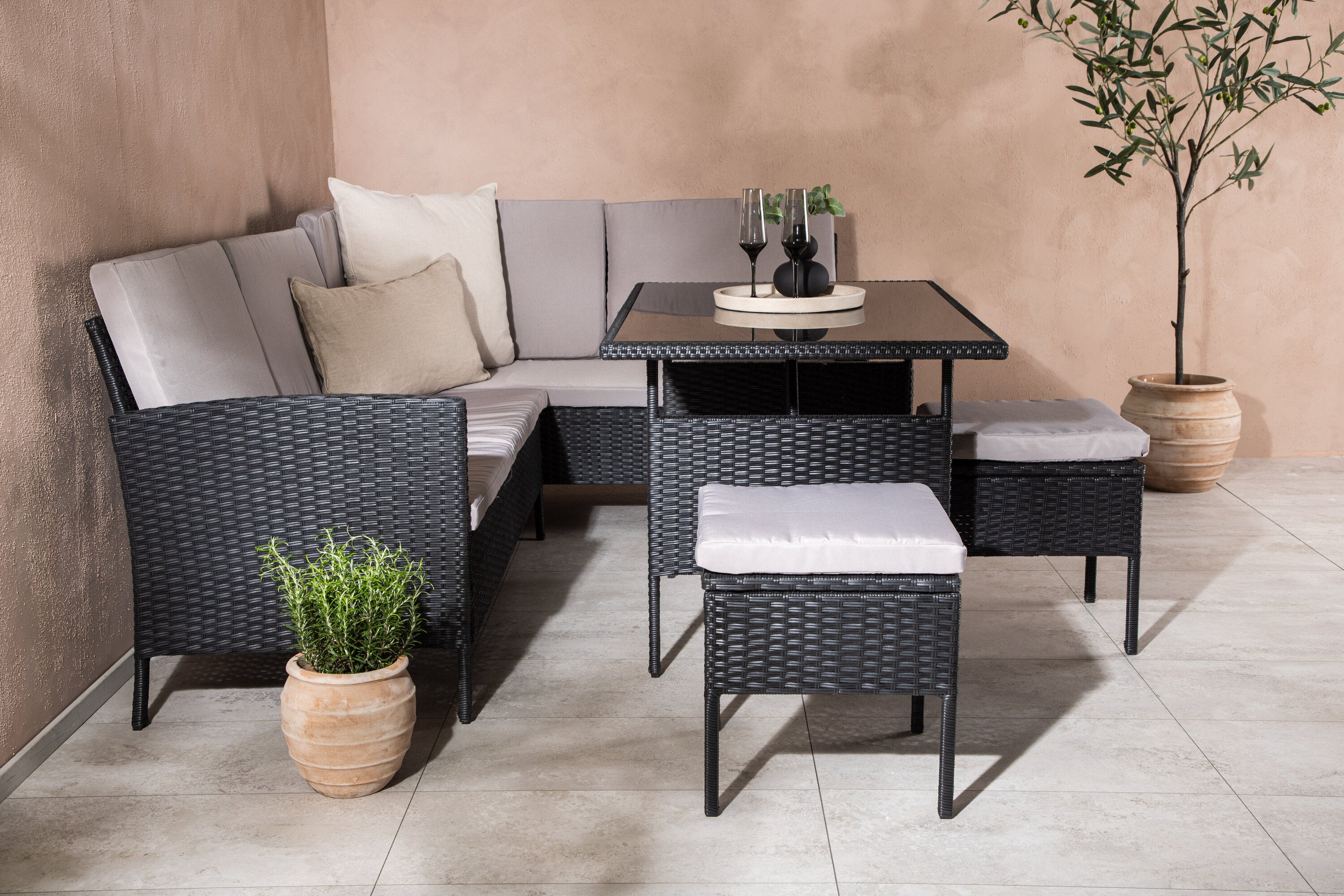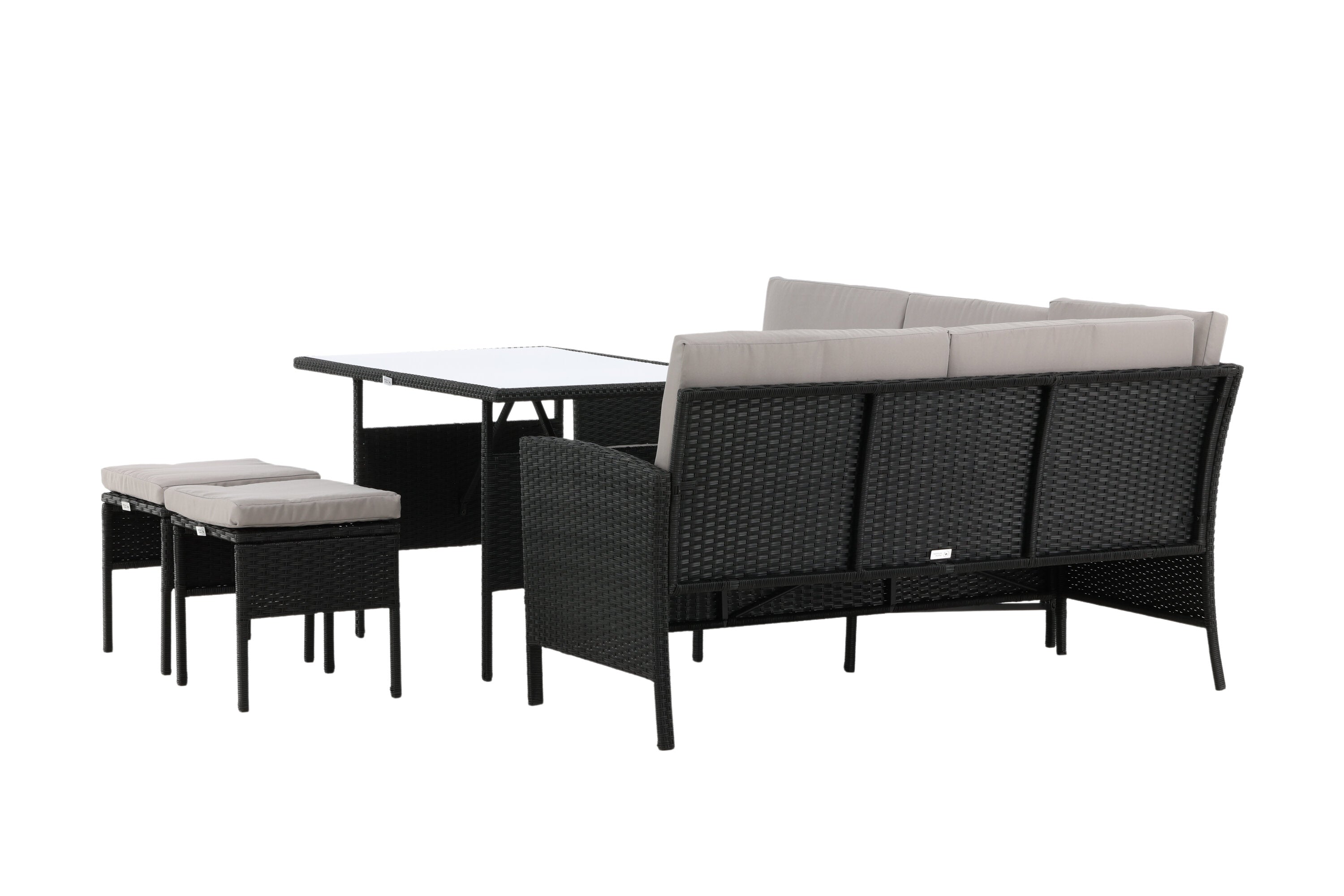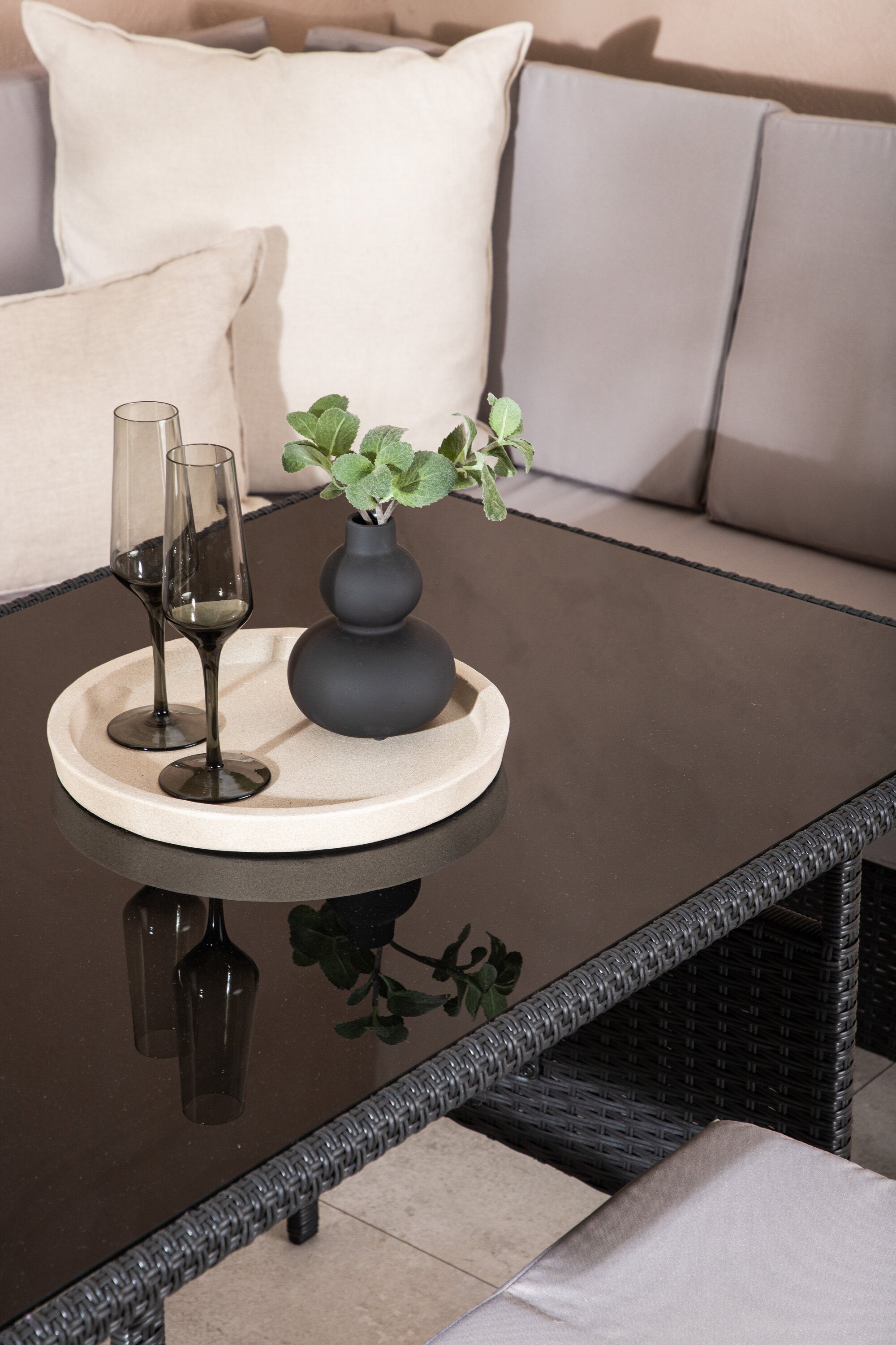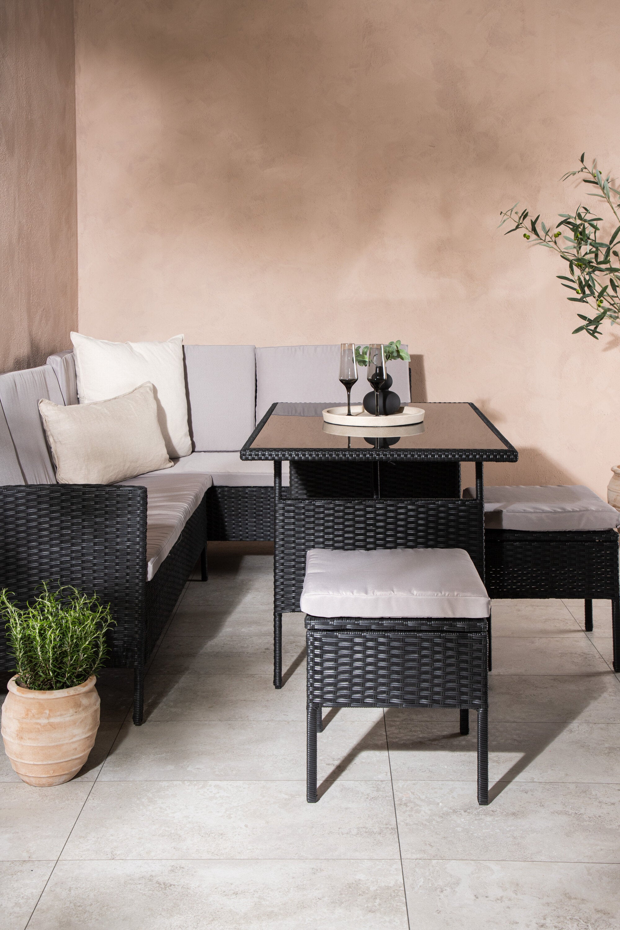 Skupina pohovek Knock je skvělá pro vaši terasu nebo terasu a je vytvořena s důrazem na pohodlí a nadčasový design. Sedací soupravu tvoří rohová sedací souprava v černém umělém ratanu se čtyřmi sedáky a jedním rohovým dílem, dvěma kohouty a vyšším stolem z umělého ratanu se skleněným stolem. Šedé polštáře jsou součástí skupiny pohovek a přispívají k příjemnému pocitu!