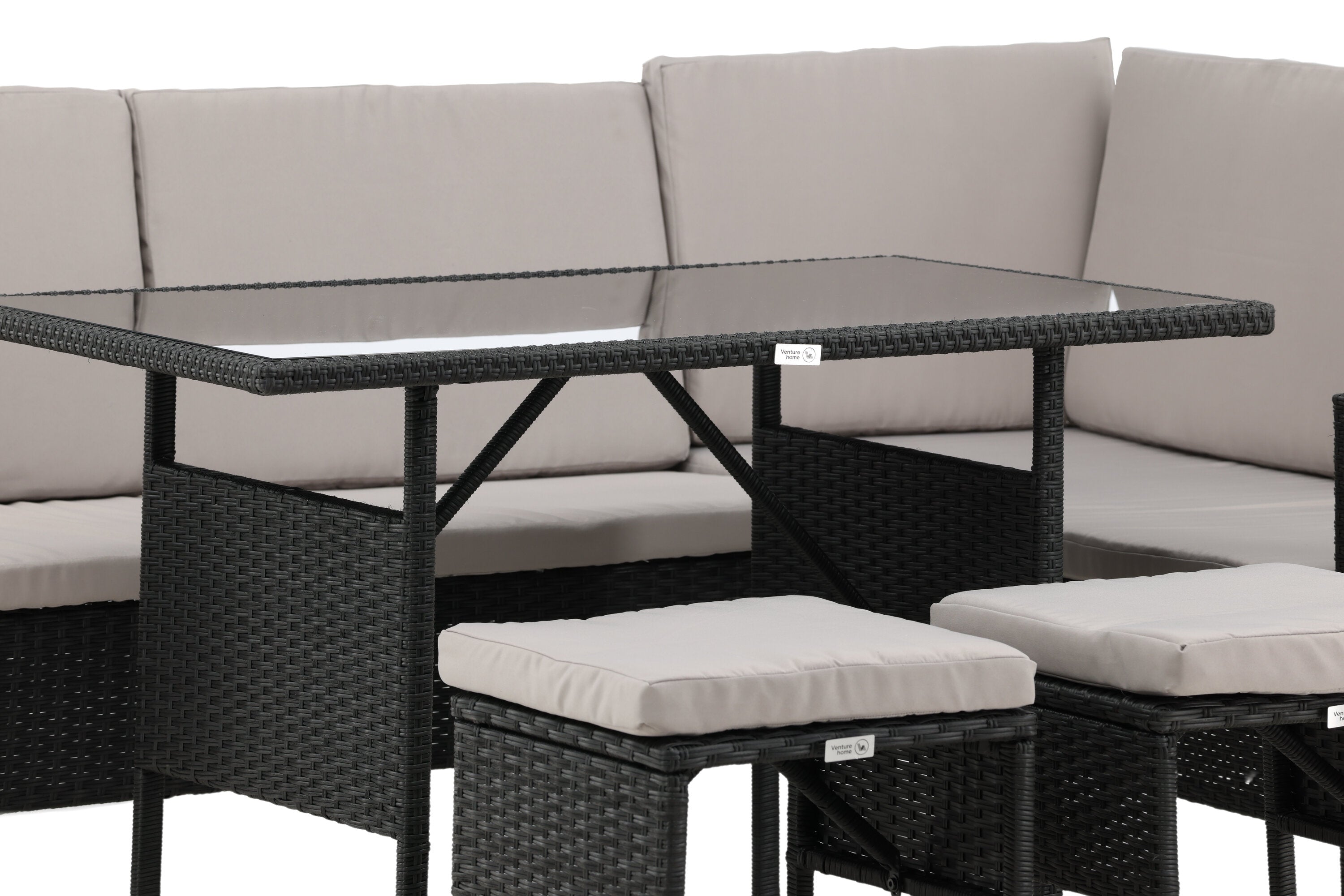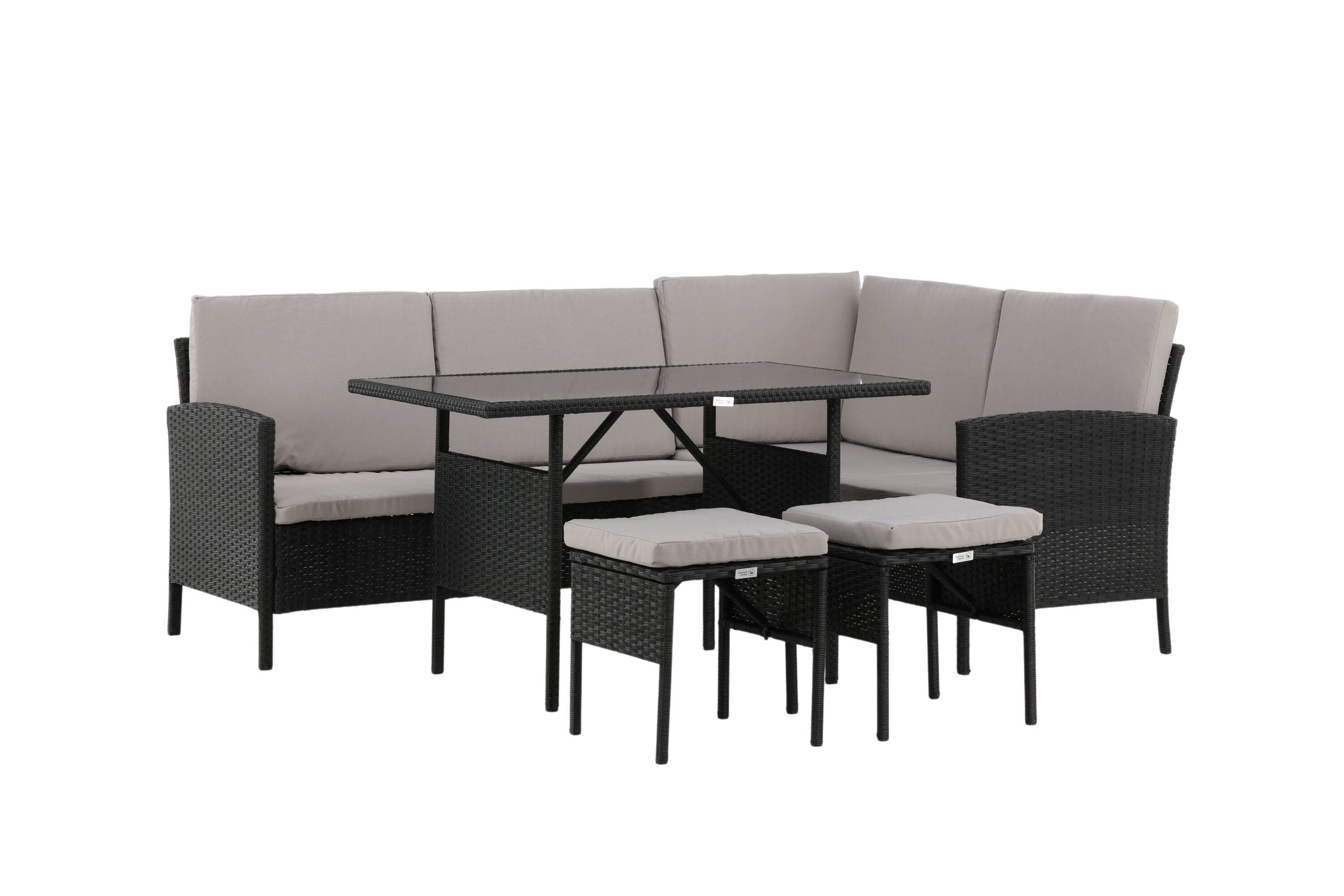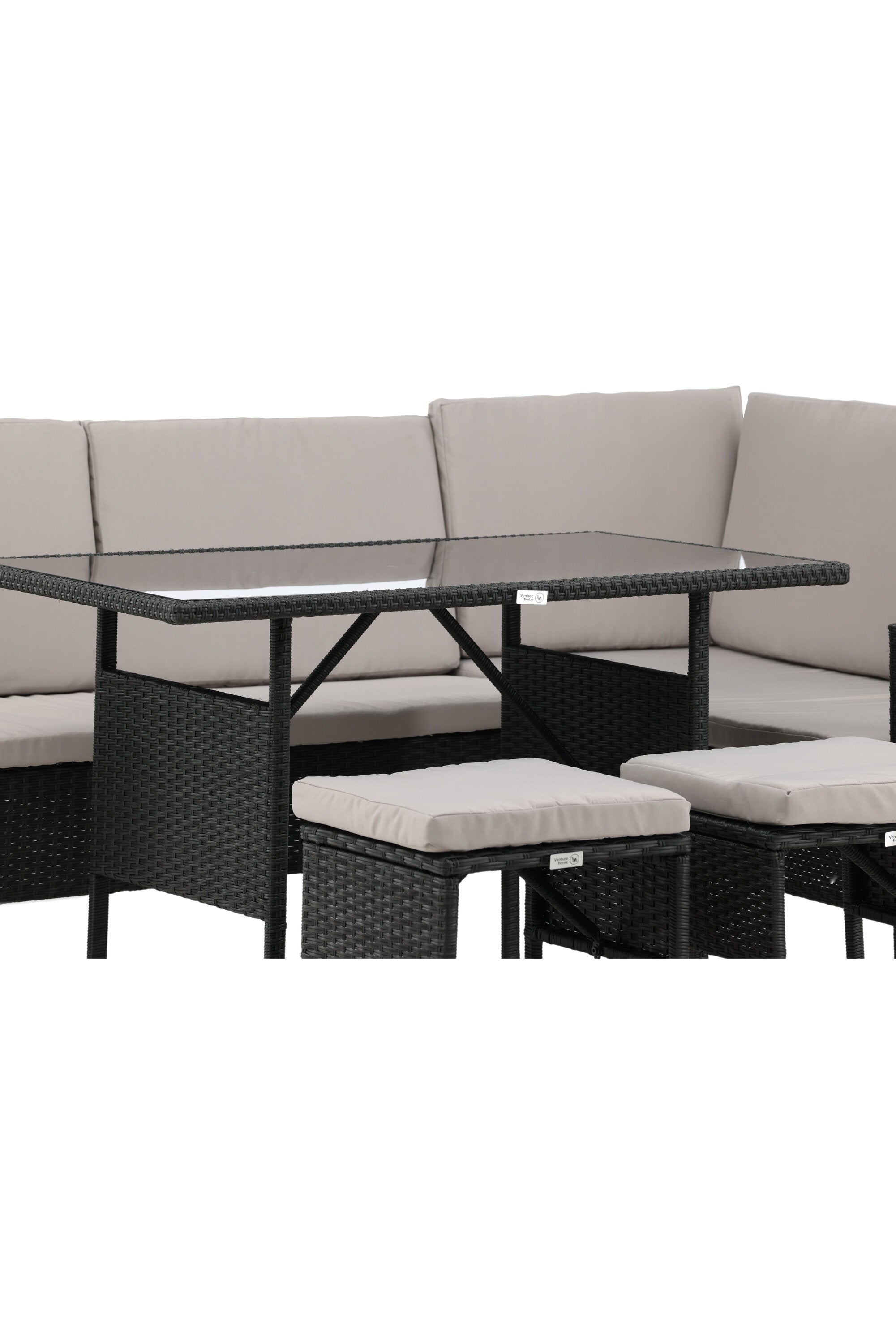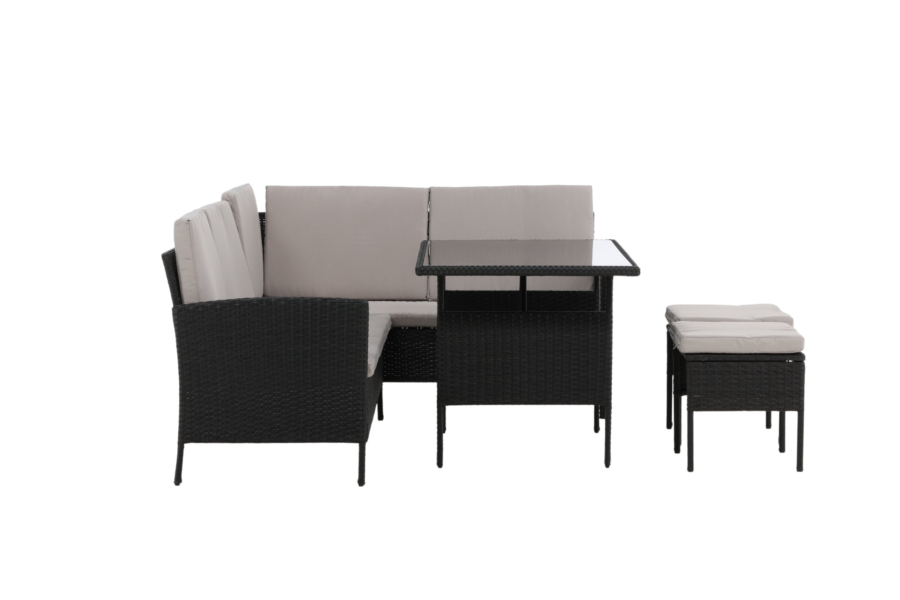 Skupina pohovek Knock je skvělá pro vaši terasu nebo terasu a je vytvořena s důrazem na pohodlí a nadčasový design. Sedací soupravu tvoří rohová sedací souprava v černém umělém ratanu se čtyřmi sedáky a jedním rohovým dílem, dvěma kohouty a vyšším stolem z umělého ratanu se skleněným stolem. Šedé polštáře jsou součástí skupiny pohovek a přispívají k příjemnému pocitu!