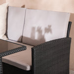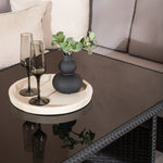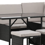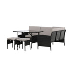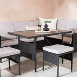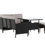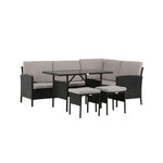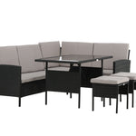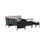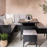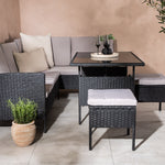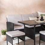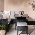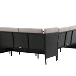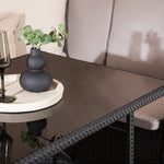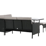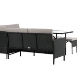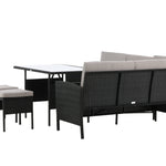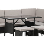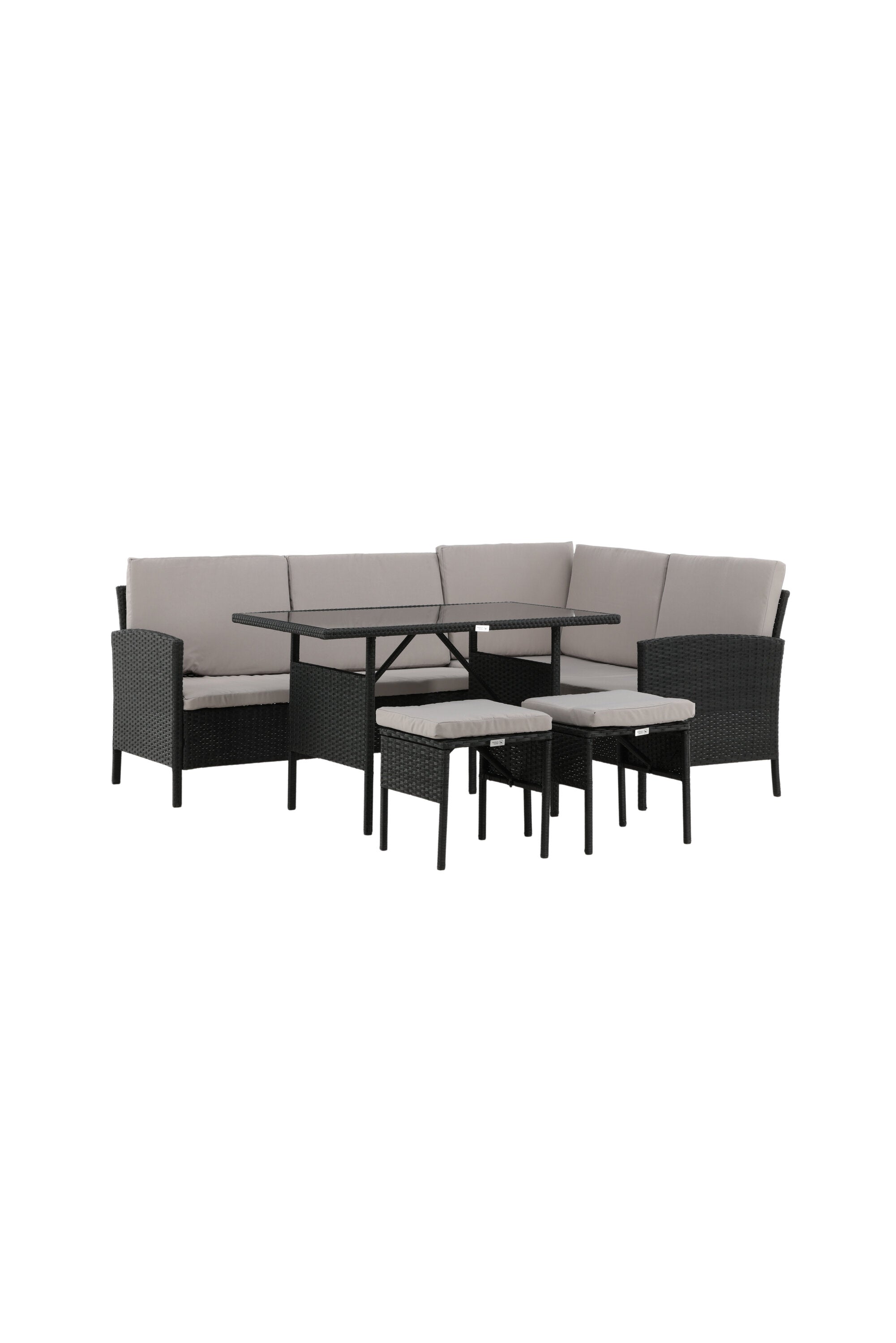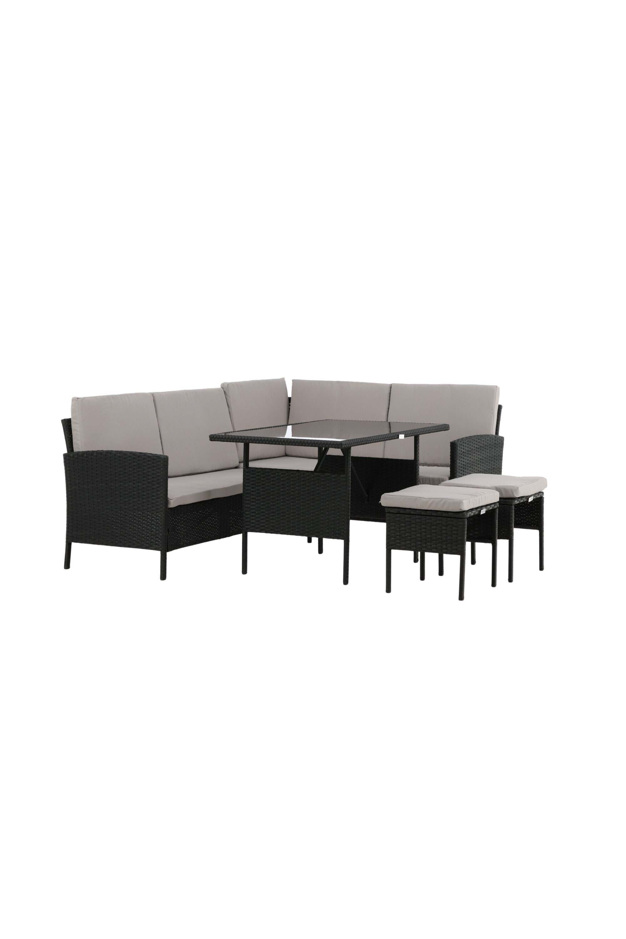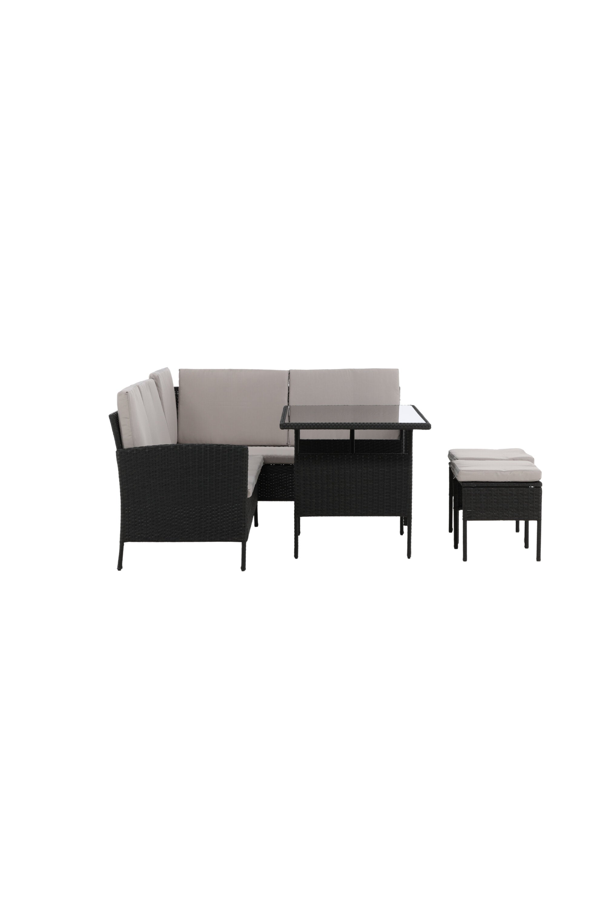Skupina pohovek Knock je skvělá pro vaši terasu nebo terasu a je vytvořena s důrazem na pohodlí a nadčasový design. Sedací soupravu tvoří rohová sedací souprava v černém umělém ratanu se čtyřmi sedáky a jedním rohovým dílem, dvěma kohouty a vyšším stolem z umělého ratanu se skleněným stolem. Šedé polštáře jsou součástí skupiny pohovek a přispívají k příjemnému pocitu!