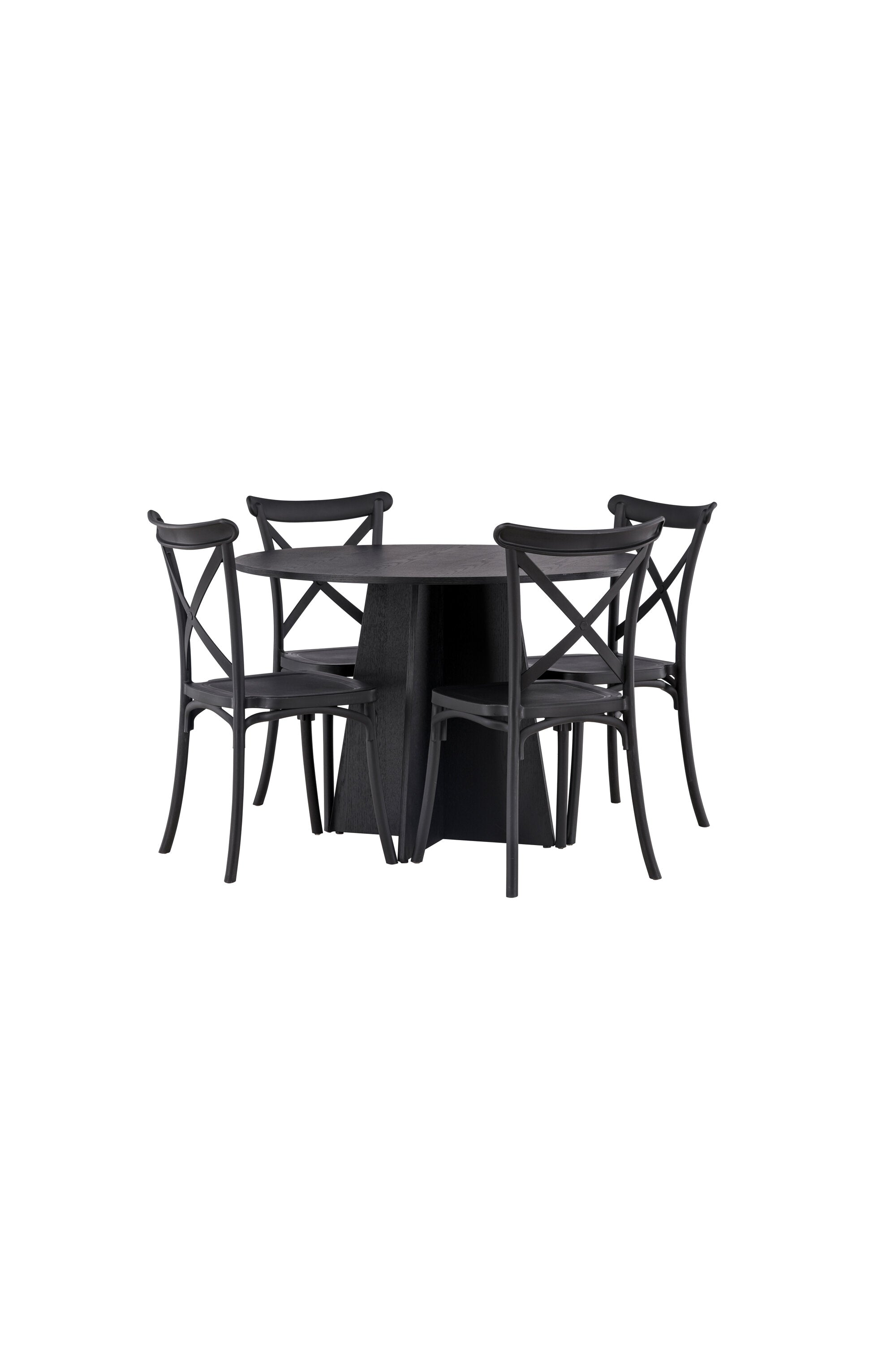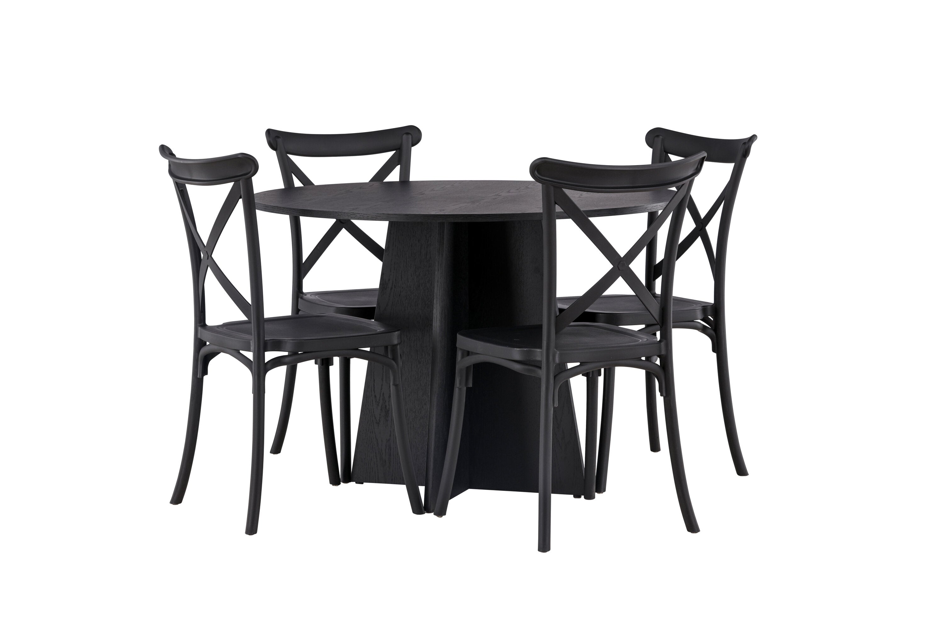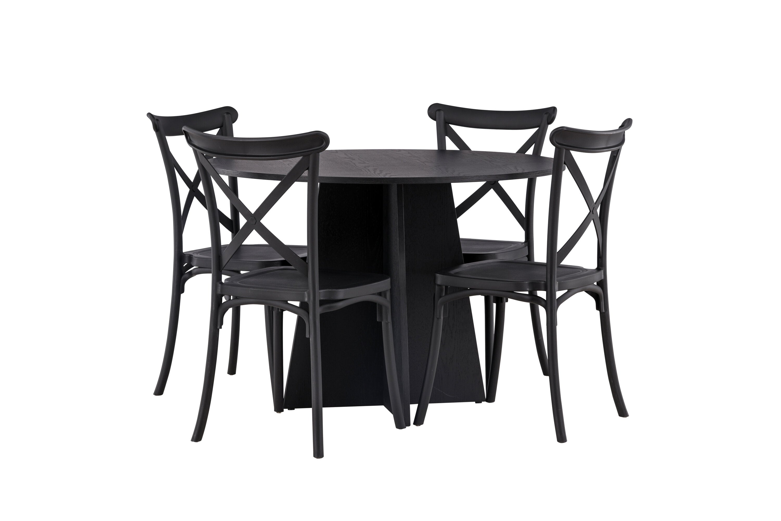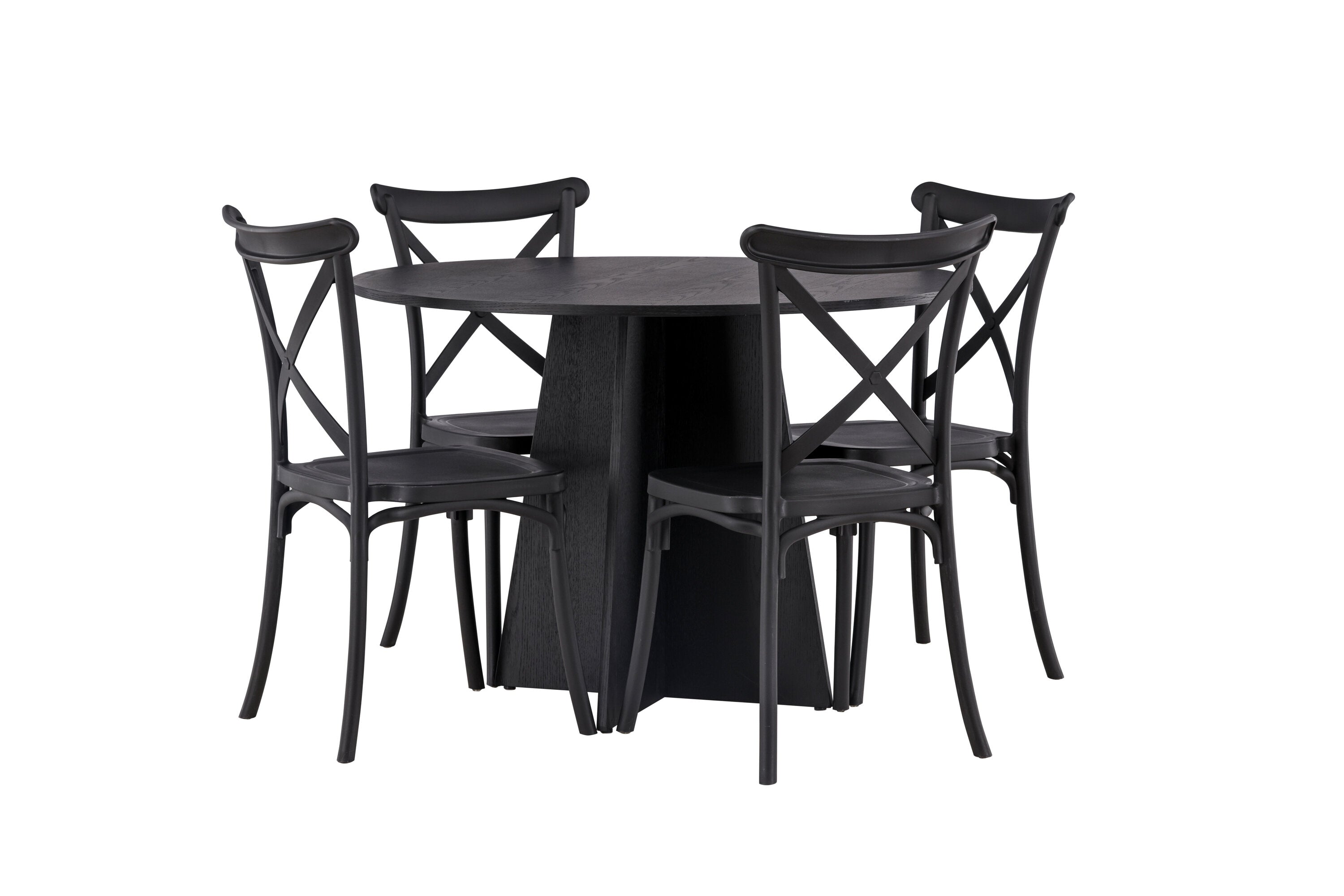 Skvělá jídelní skupina! Kulatý jídelní stůl Bootcut v konzistentně černé barvě má ​​stolní desku z MDF s dýhou a designově bohatý rám, který působí na celkový obraz příjemným dojmem. Zde spolu s černými jídelními židlemi ze série Crosett. Židle je důsledně vyrobena z praktického materiálu plast a má matnou černou barvu, která obstojí ve zkoušce času. Kruhová jídelní skupina je také ideální pro vytvoření společenské a příjemné atmosféry v místnosti! Rozměry stolu: 110 cm.