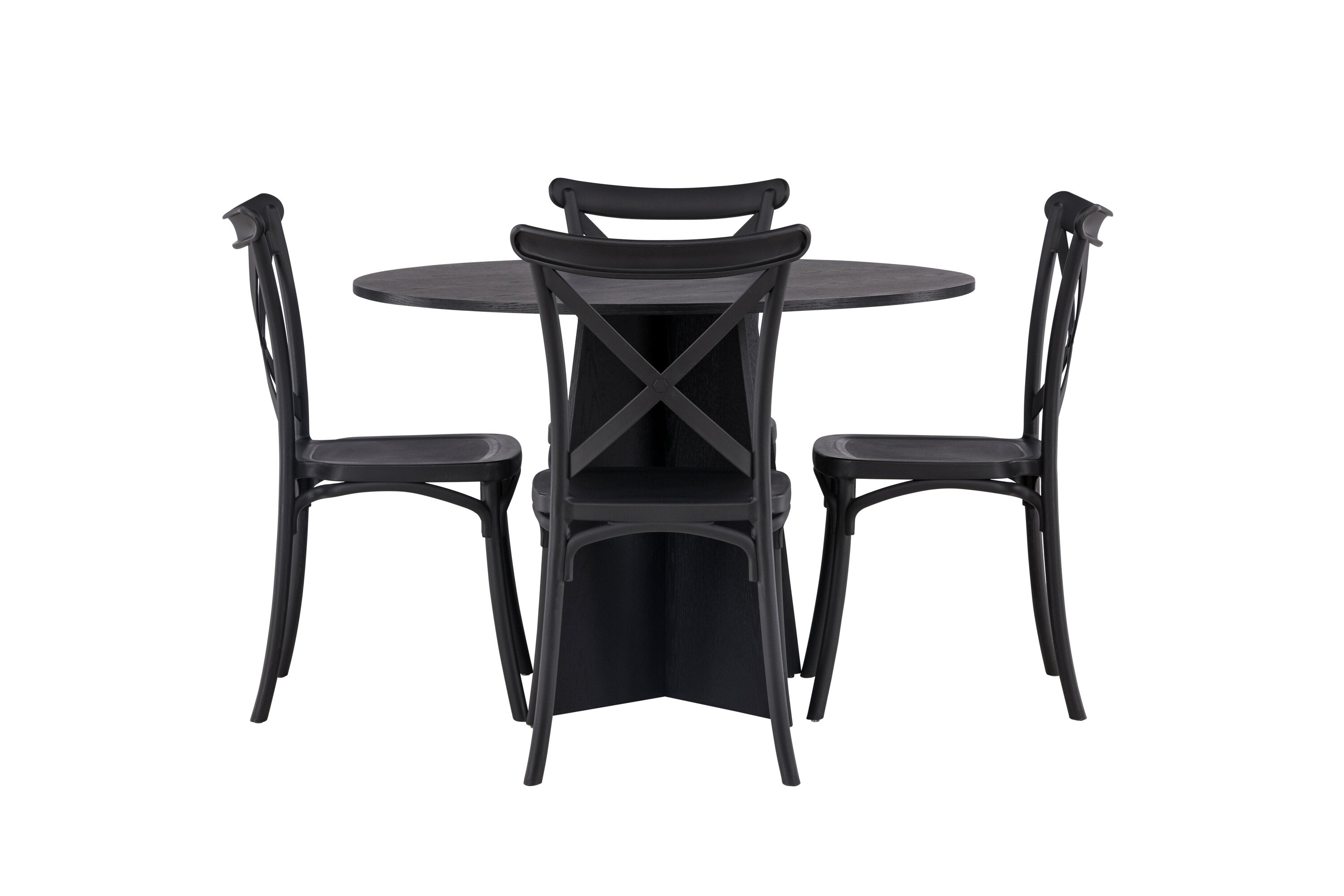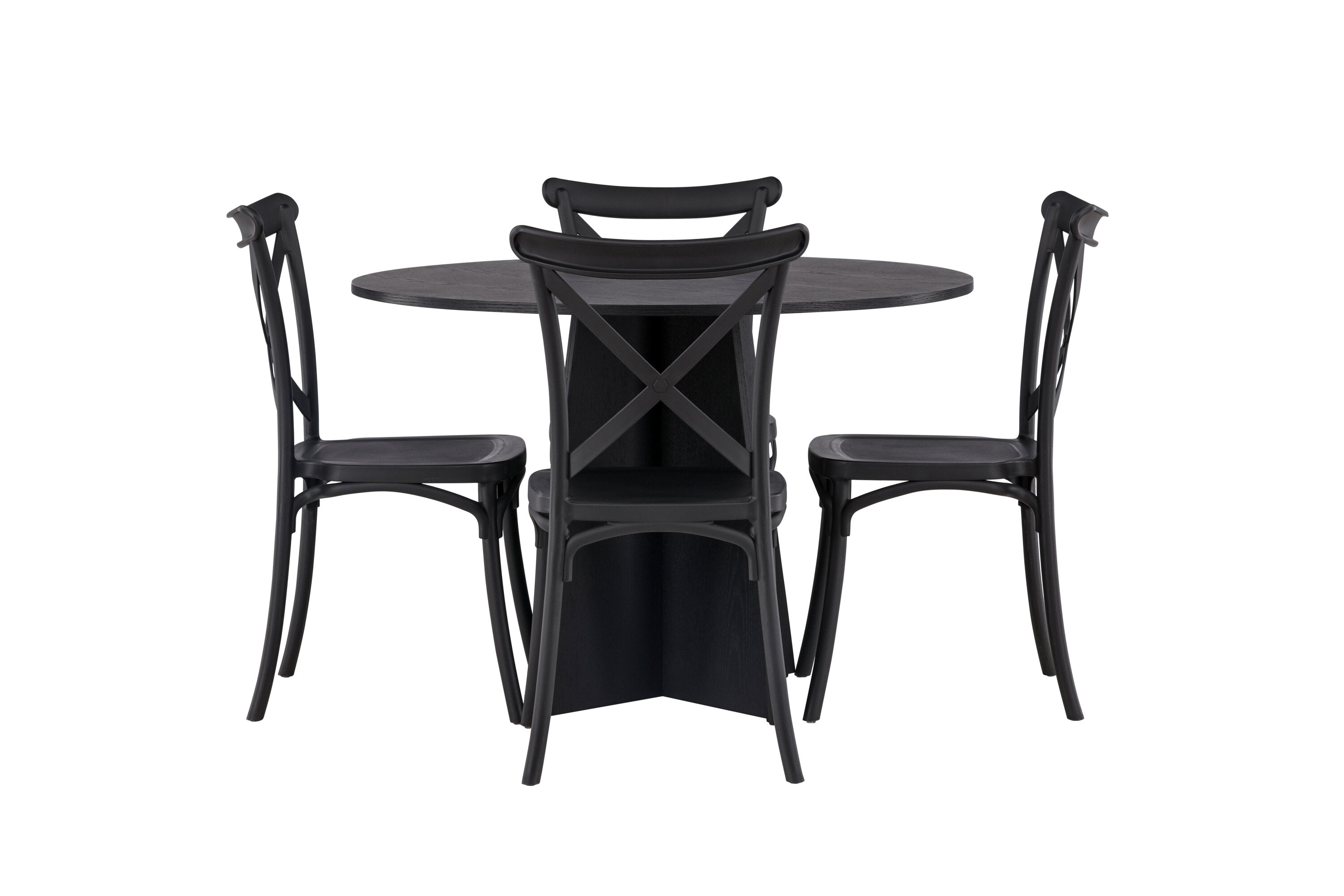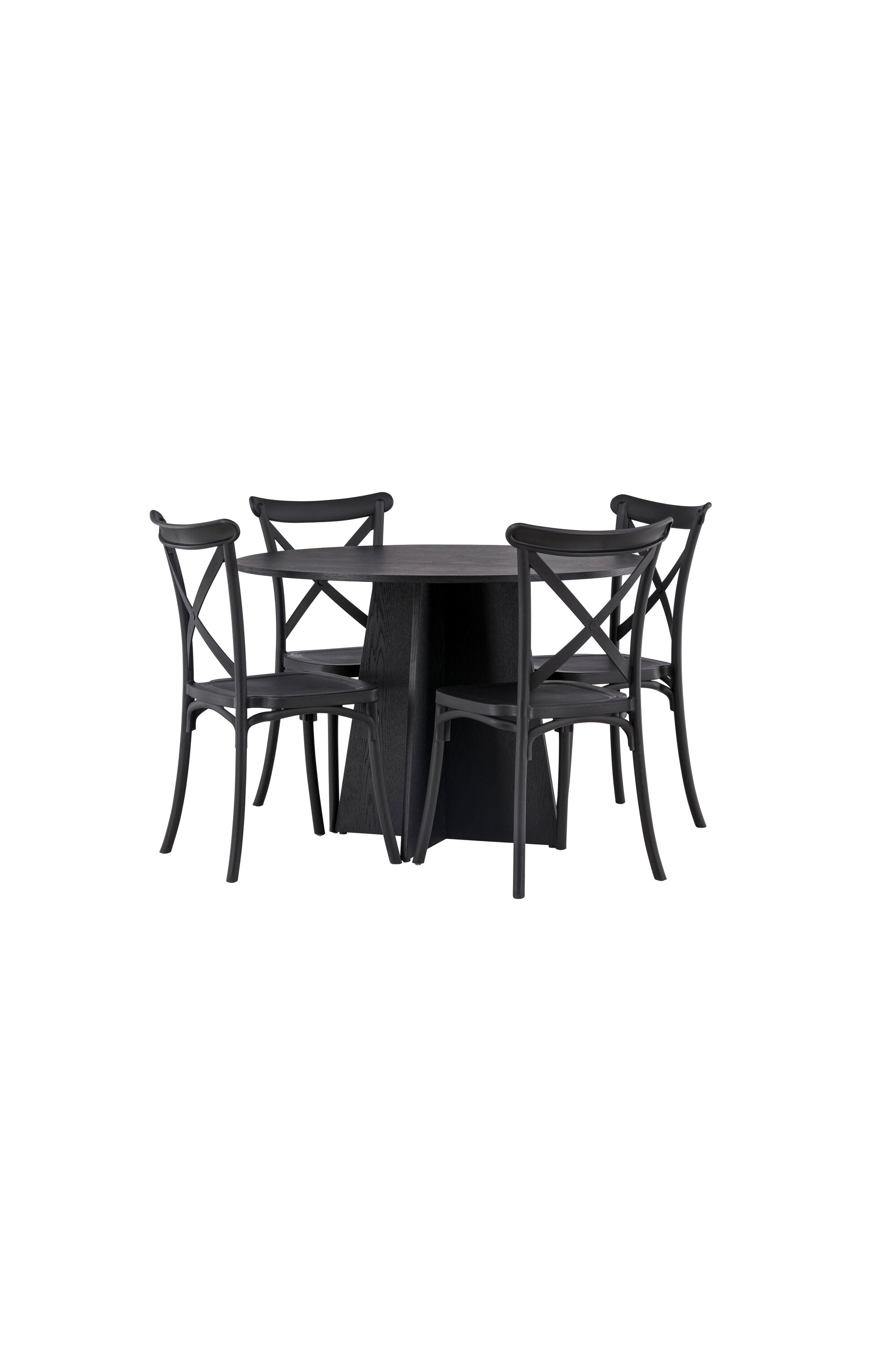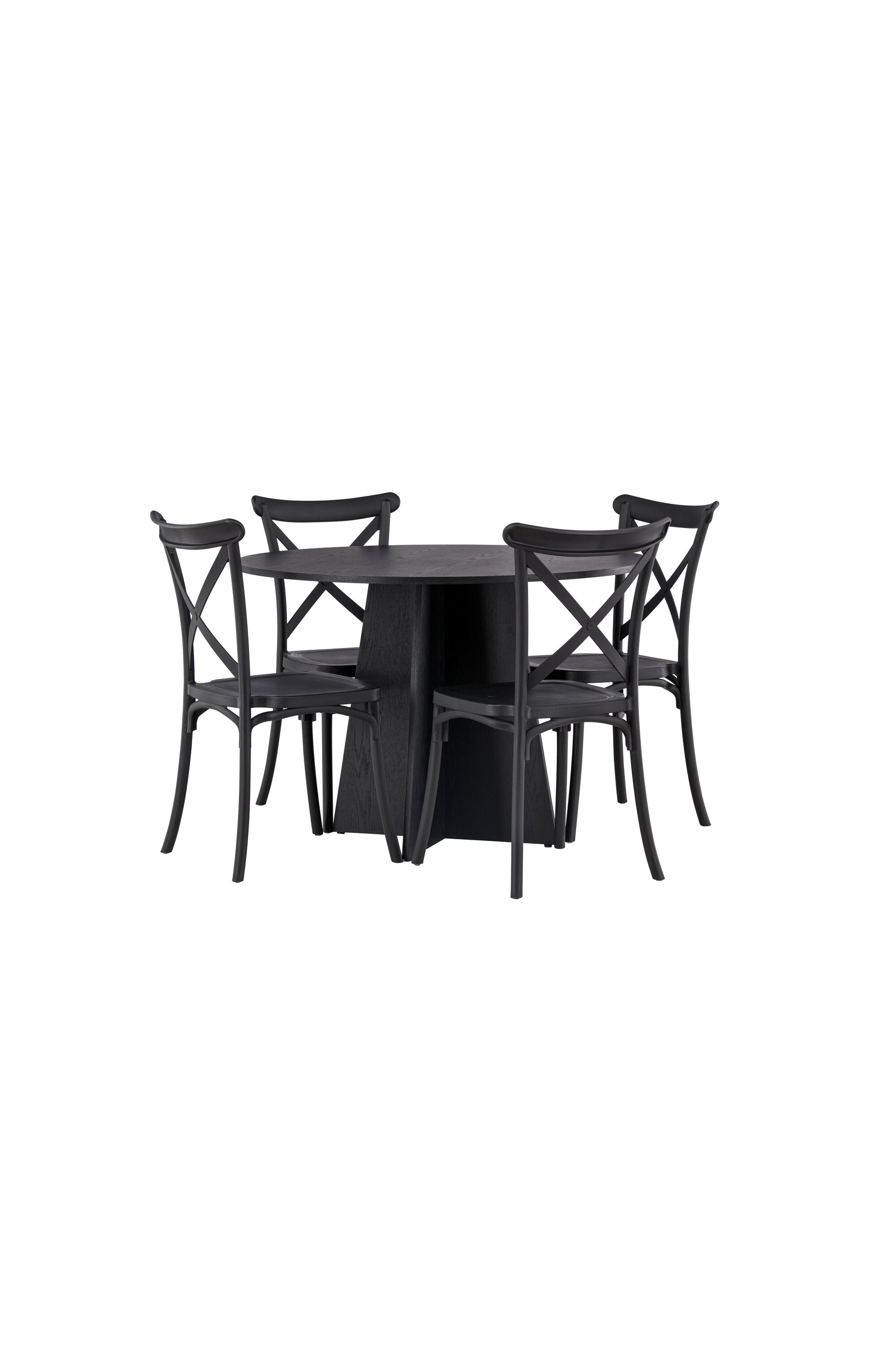 Skvělá jídelní skupina! Kulatý jídelní stůl Bootcut v konzistentně černé barvě má ​​stolní desku z MDF s dýhou a designově bohatý rám, který působí na celkový obraz příjemným dojmem. Zde spolu s černými jídelními židlemi ze série Crosett. Židle je důsledně vyrobena z praktického materiálu plast a má matnou černou barvu, která obstojí ve zkoušce času. Kruhová jídelní skupina je také ideální pro vytvoření společenské a příjemné atmosféry v místnosti! Rozměry stolu: 110 cm.