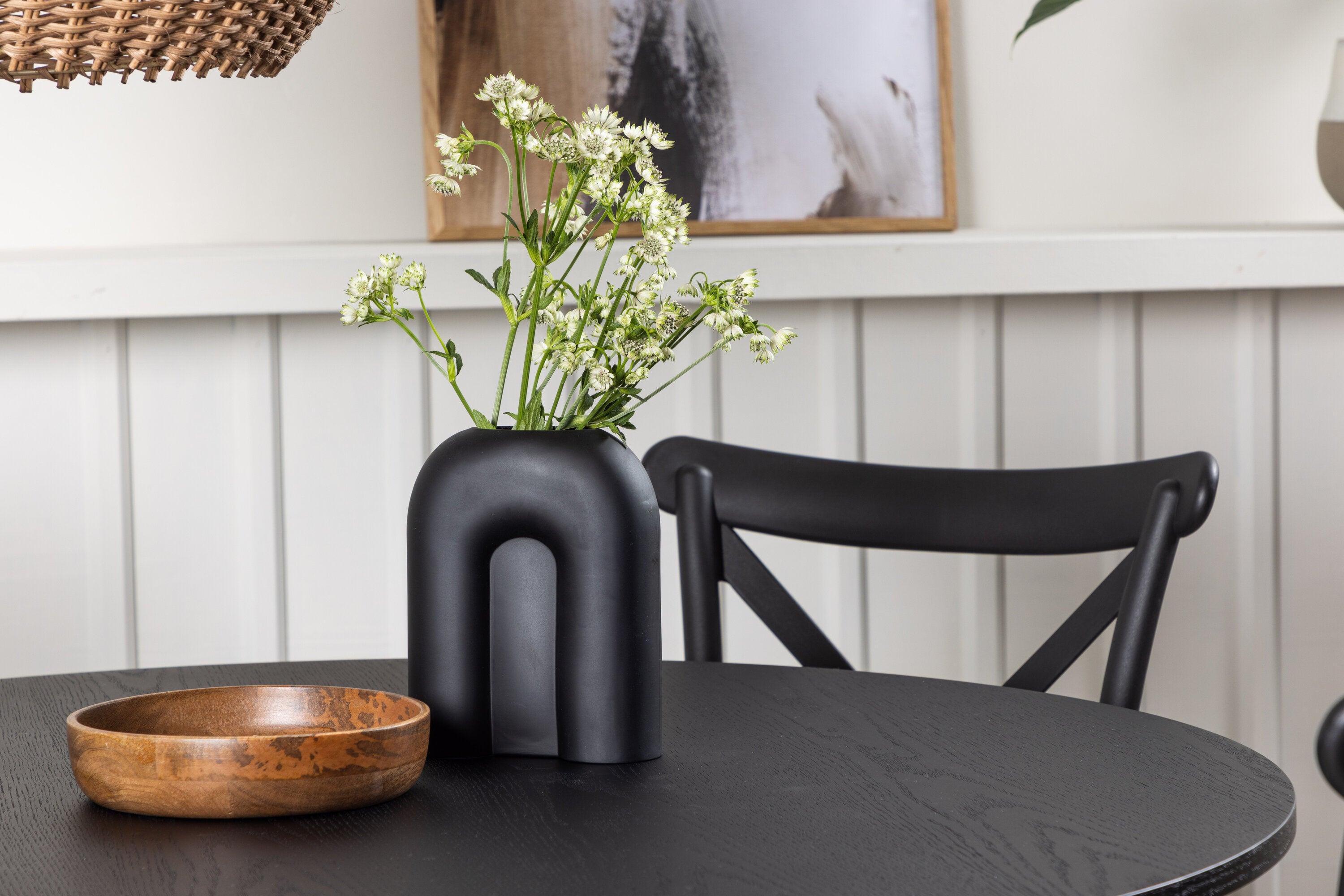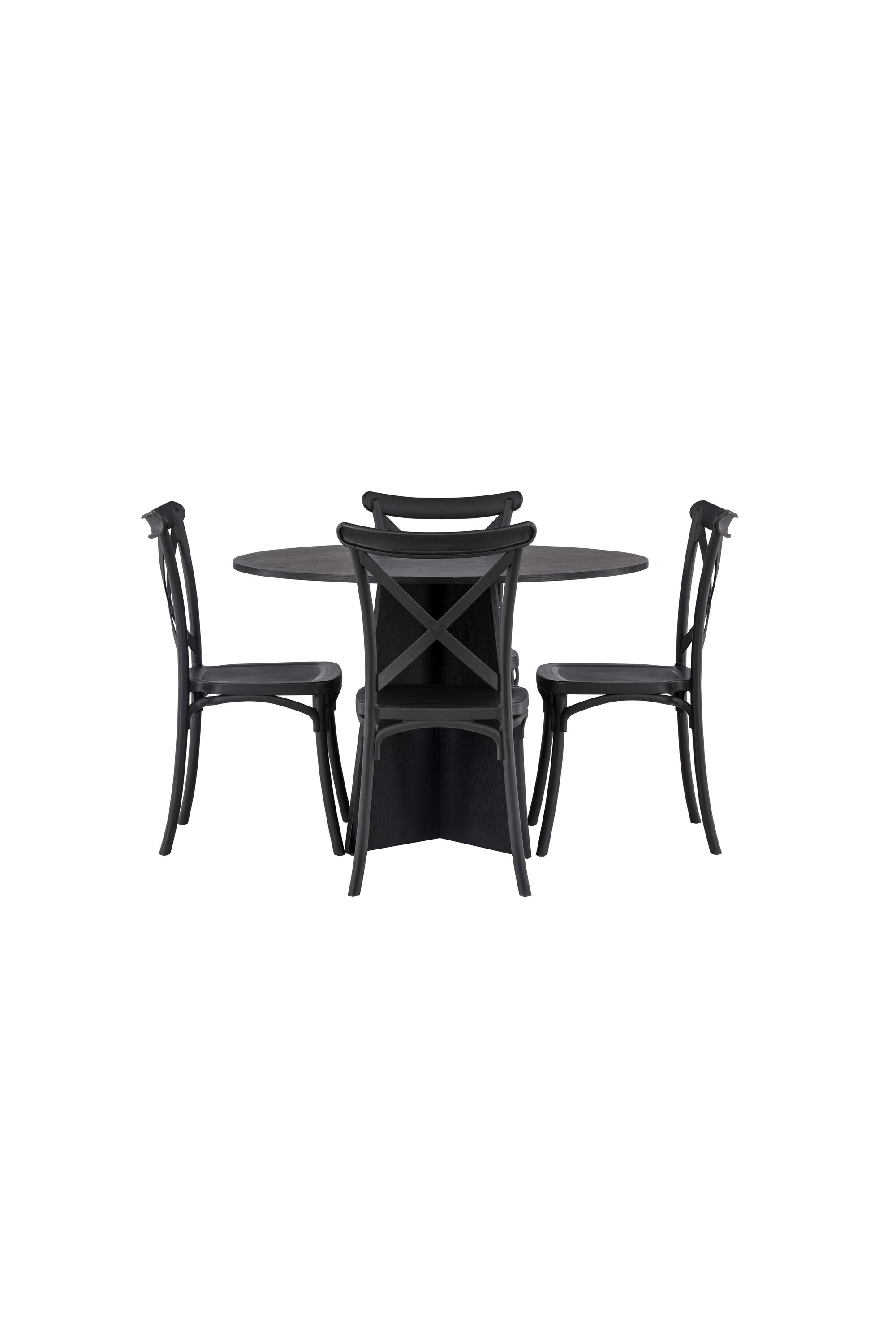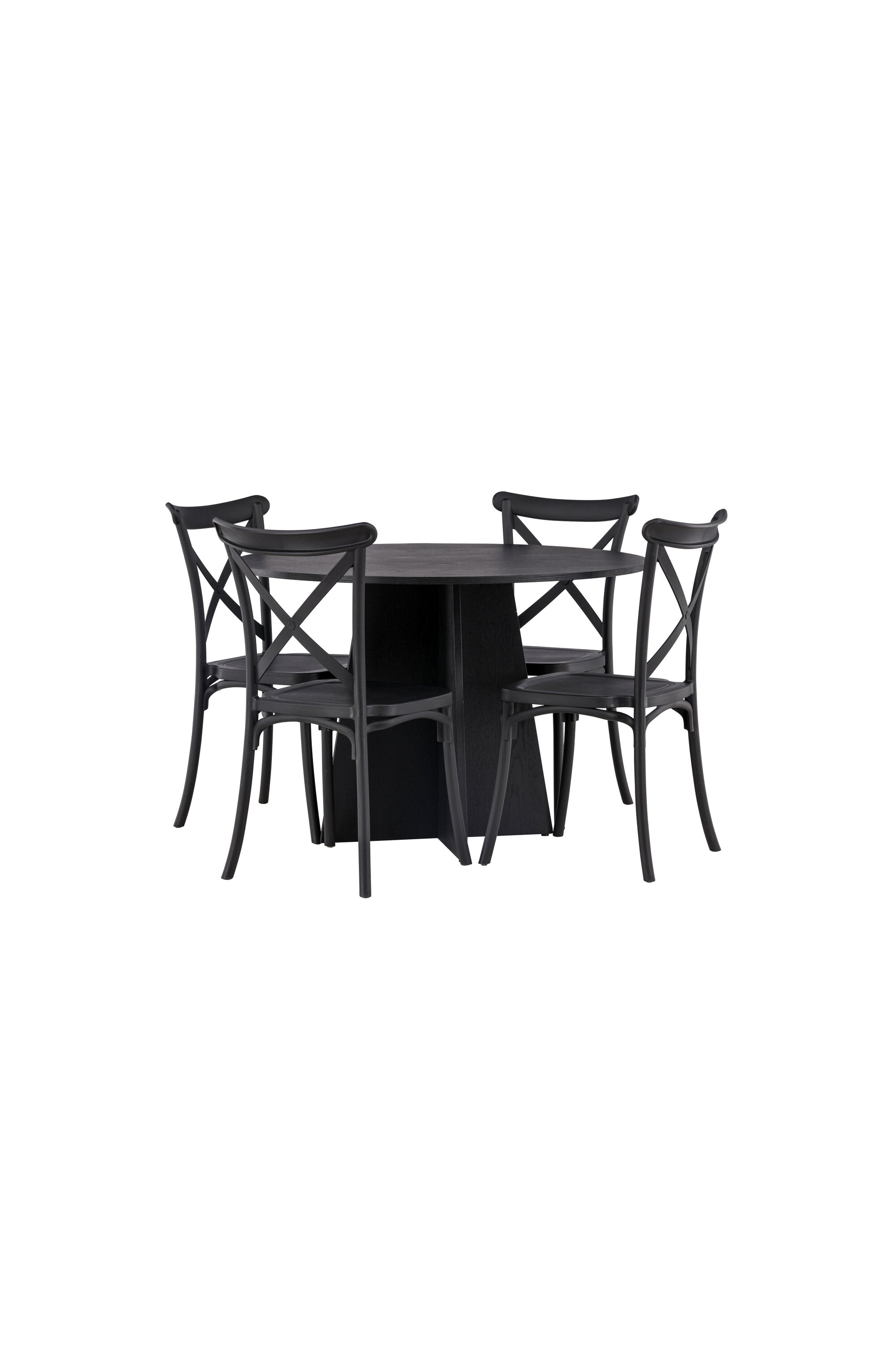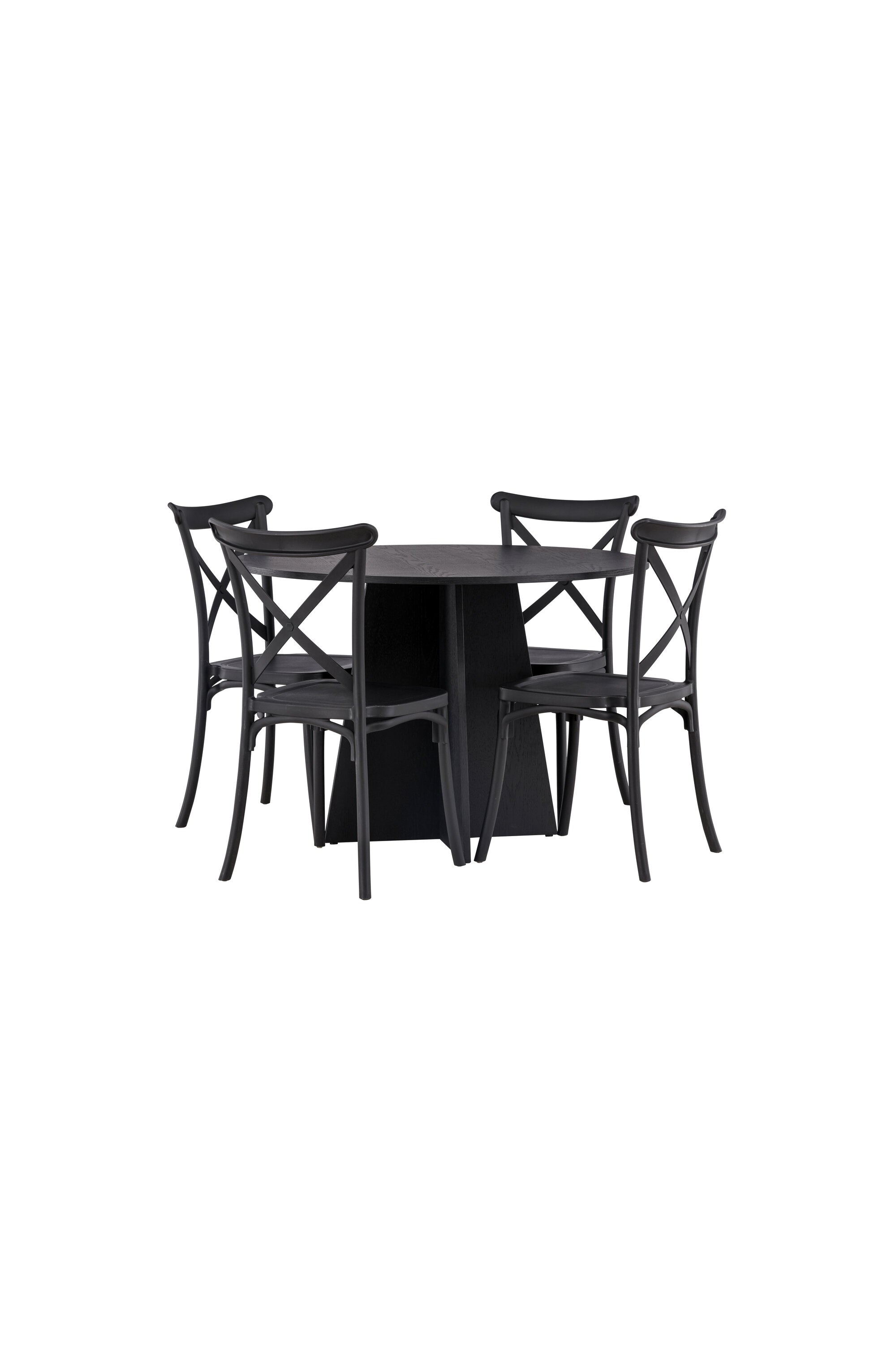 Skvělá jídelní skupina! Kulatý jídelní stůl Bootcut v konzistentně černé barvě má ​​stolní desku z MDF s dýhou a designově bohatý rám, který působí na celkový obraz příjemným dojmem. Zde spolu s černými jídelními židlemi ze série Crosett. Židle je důsledně vyrobena z praktického materiálu plast a má matnou černou barvu, která obstojí ve zkoušce času. Kruhová jídelní skupina je také ideální pro vytvoření společenské a příjemné atmosféry v místnosti! Rozměry stolu: 110 cm.