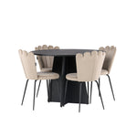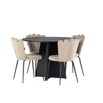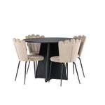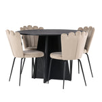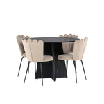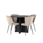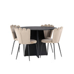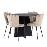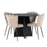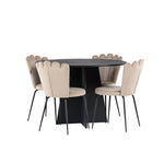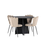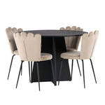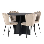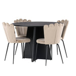Vytvořte si luxusní a lákavý poutač! Kulatý jídelní stůl Bootcut v konzistentně černé barvě má ​​stolní desku z MDF s dýhou a designově bohatý rám, který působí na celkový obraz příjemným dojmem. Zde společně s našimi oblíbenými jídelními židlemi Limhamn. Židle má lákavý design s ozdobným opěradlem ve tvaru mušle s ozdobným prošíváním a kulatým sedákem z vkusně béžové sametové látky. Nohy jsou z kovu s černou práškovou barvou. Stejně chytré jako poutavé! Rozměry stolu: 110 cm.
