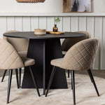 Vytvořte poutač, který zaujme! Kulatý jídelní stůl Bootcut v konzistentně černé barvě má ​​stolní desku z MDF s dýhou a designově bohatý rám, který působí na celkový obraz příjemným dojmem. Zde v trendové kombinaci s jídelními židlemi ze série Velvet Stitches. Opěradlo židle je zaoblené a stejně jako sedák je měkce čalouněno béžovým sametem a polyesterovým povlečením s dekorativním dekoračním prošíváním a šachovnicovým vzorem na zádech. Nohy jsou mírně rozšířené v černém železe a působí stabilním dojmem. Zde získáte vkusnou kombinaci stylu a pohodlí! Rozměry stolu: 110 cm.