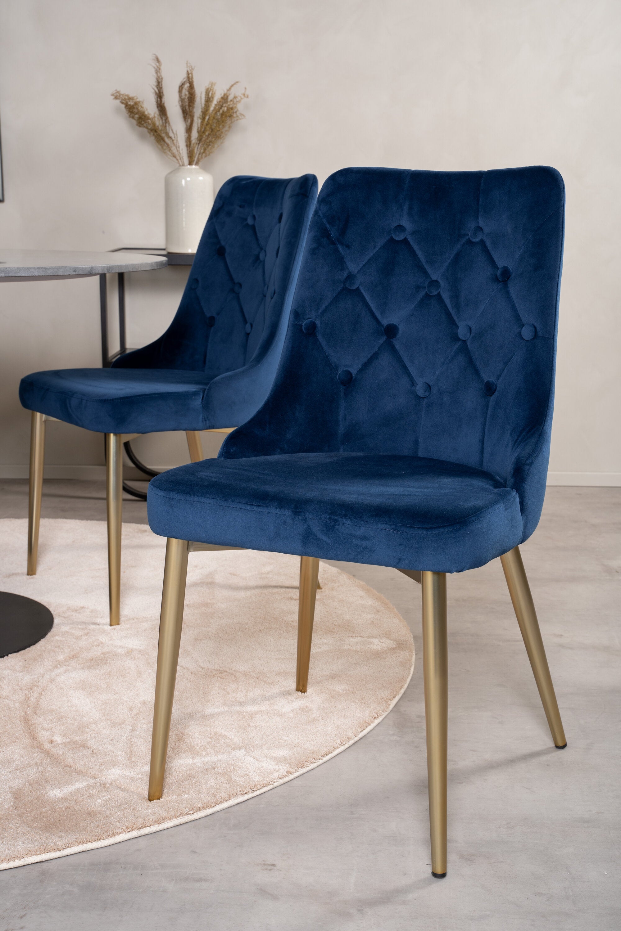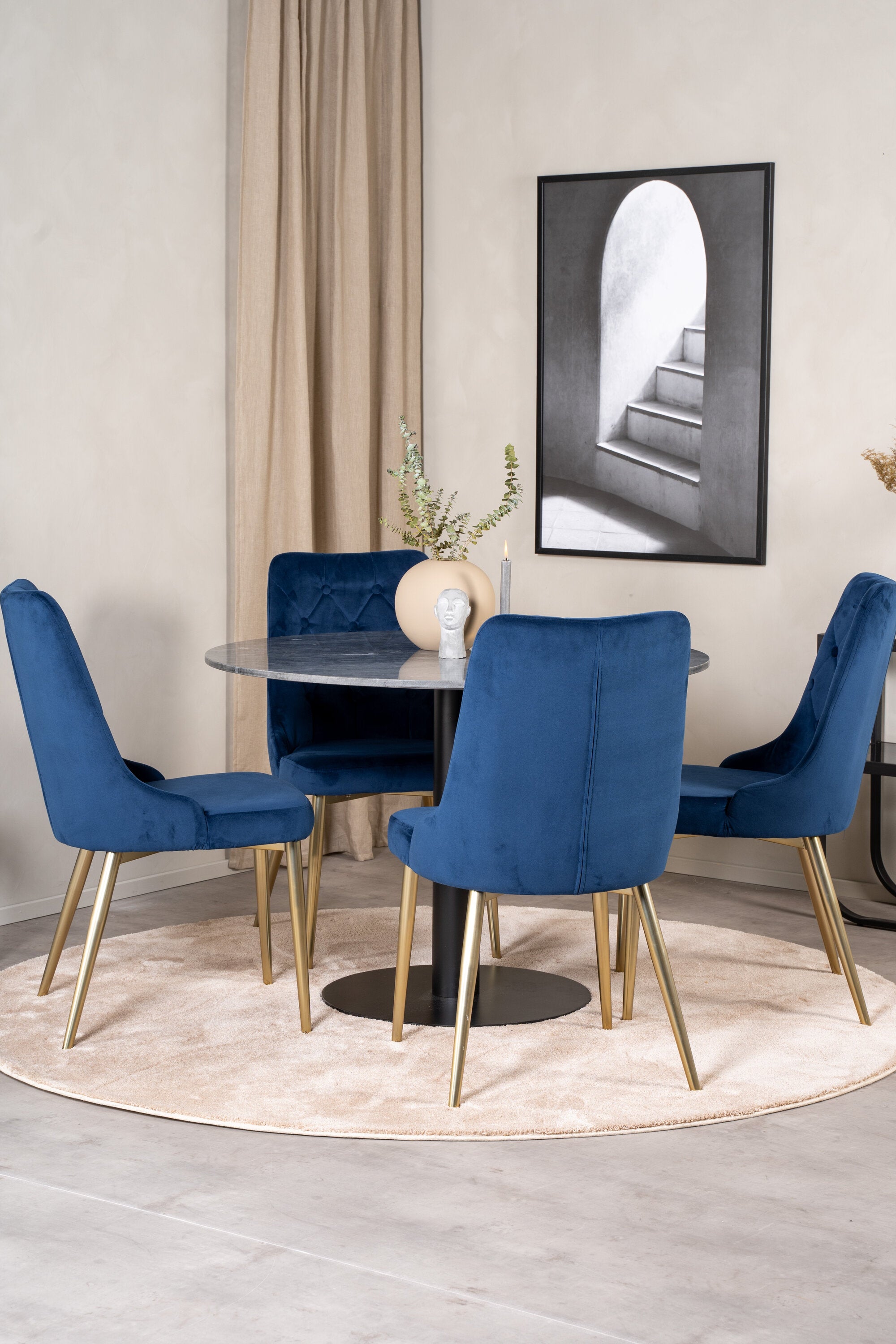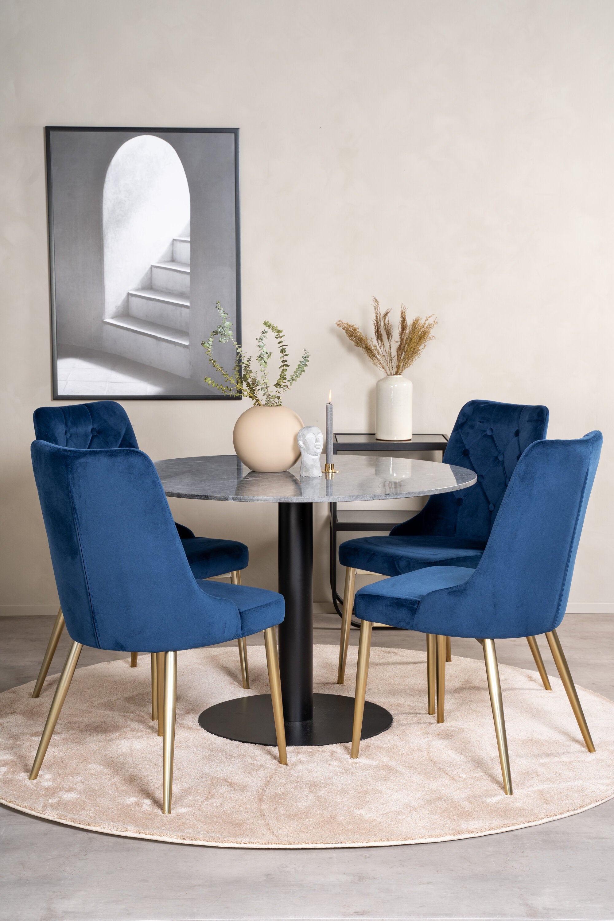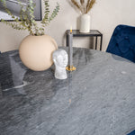 Estelle, náš elegantní jídelní stůl s lahodnou mramorovou deskou. Zde v dokonalé kombinaci s našimi pohodlnými jídelními židlemi Velvet v lahodné modré barvě. Vysoký komfort sezení na židlích zve k dlouhým a nádherným chvilkám u jídelního stolu s blízkými.