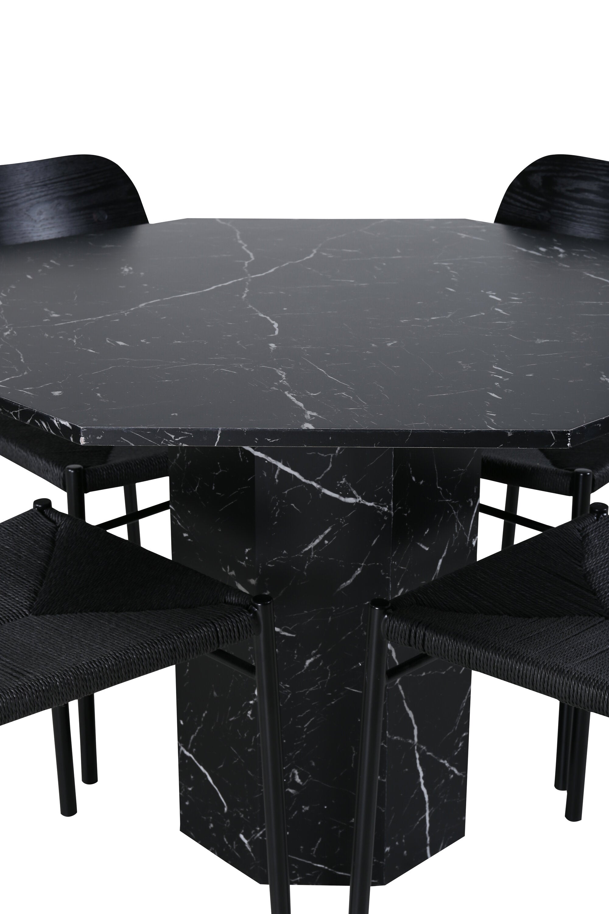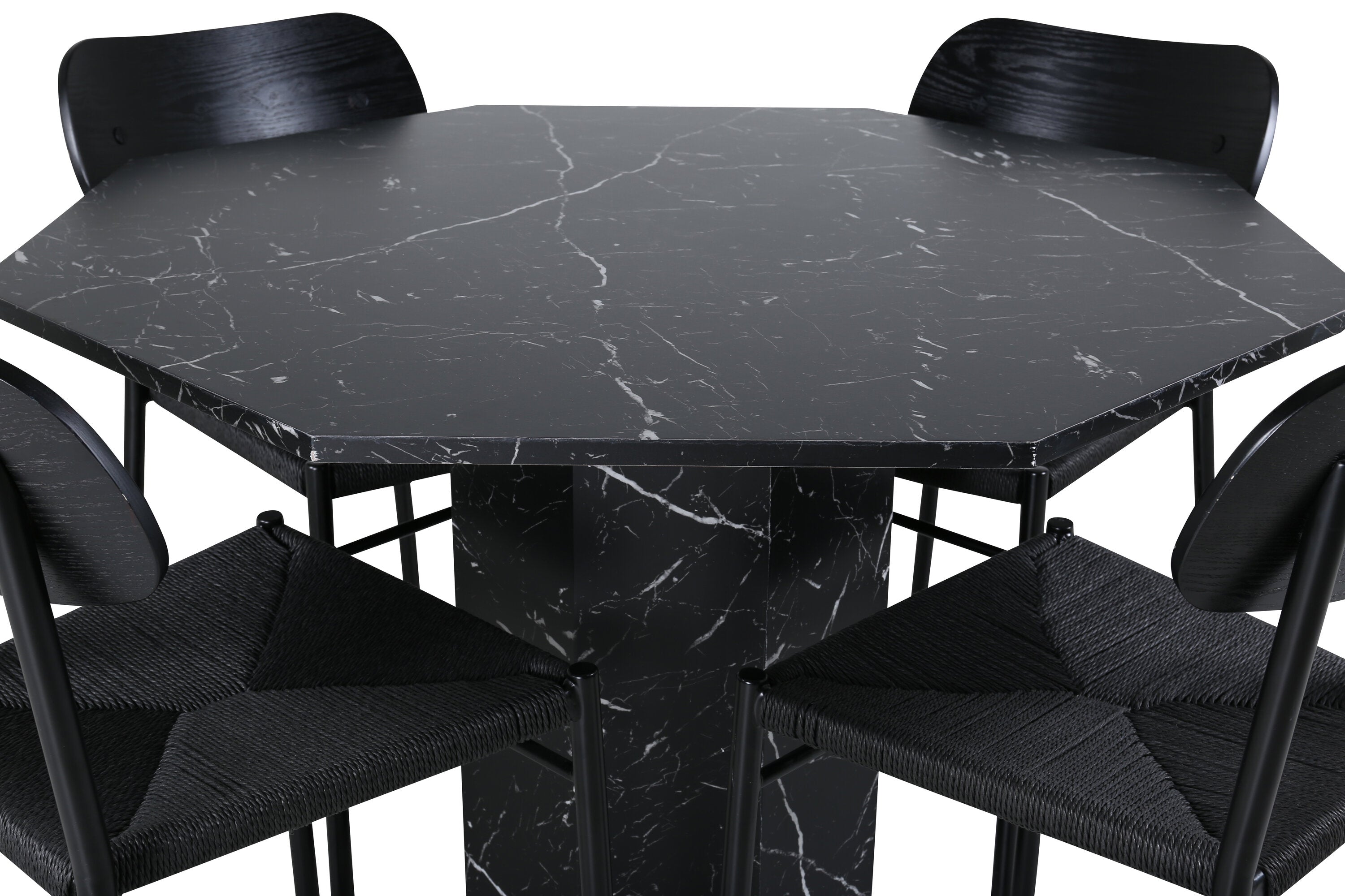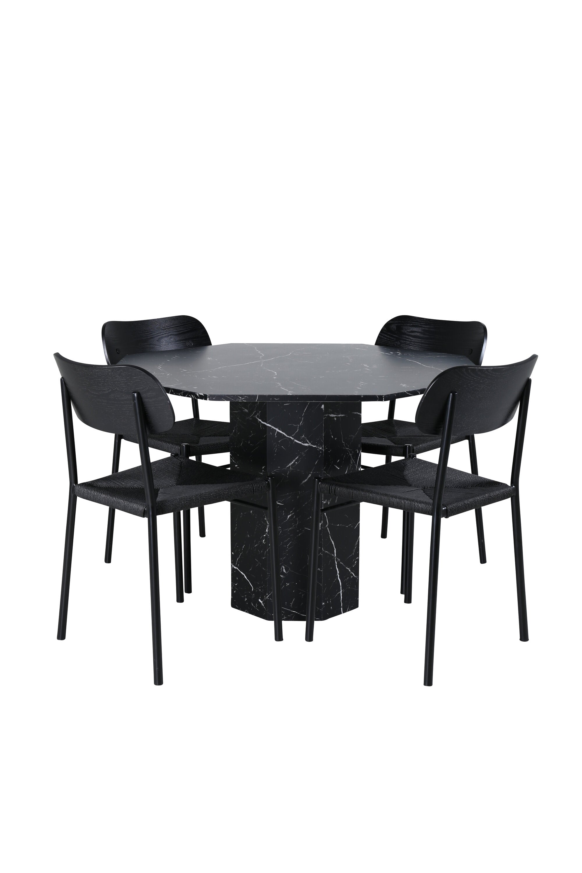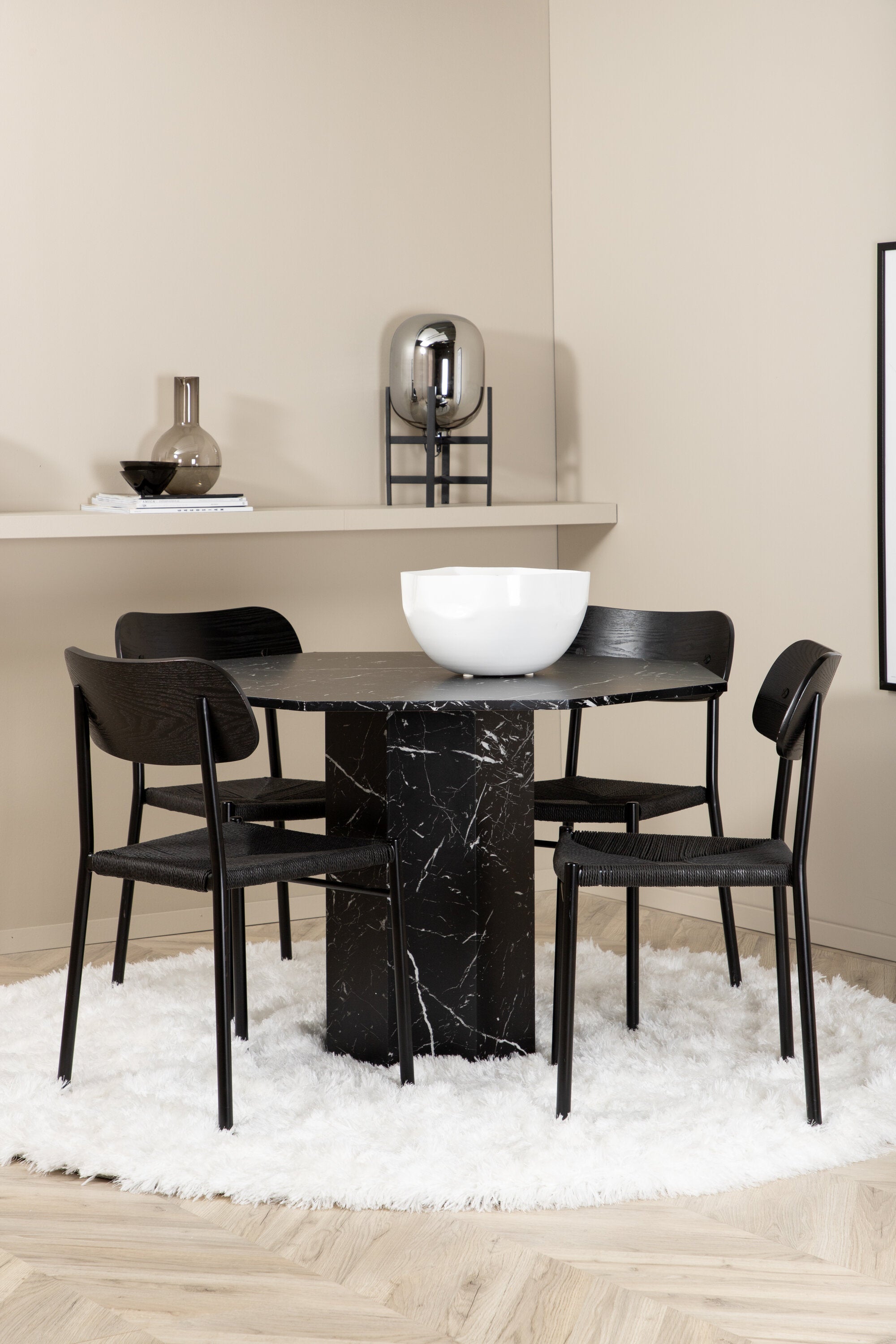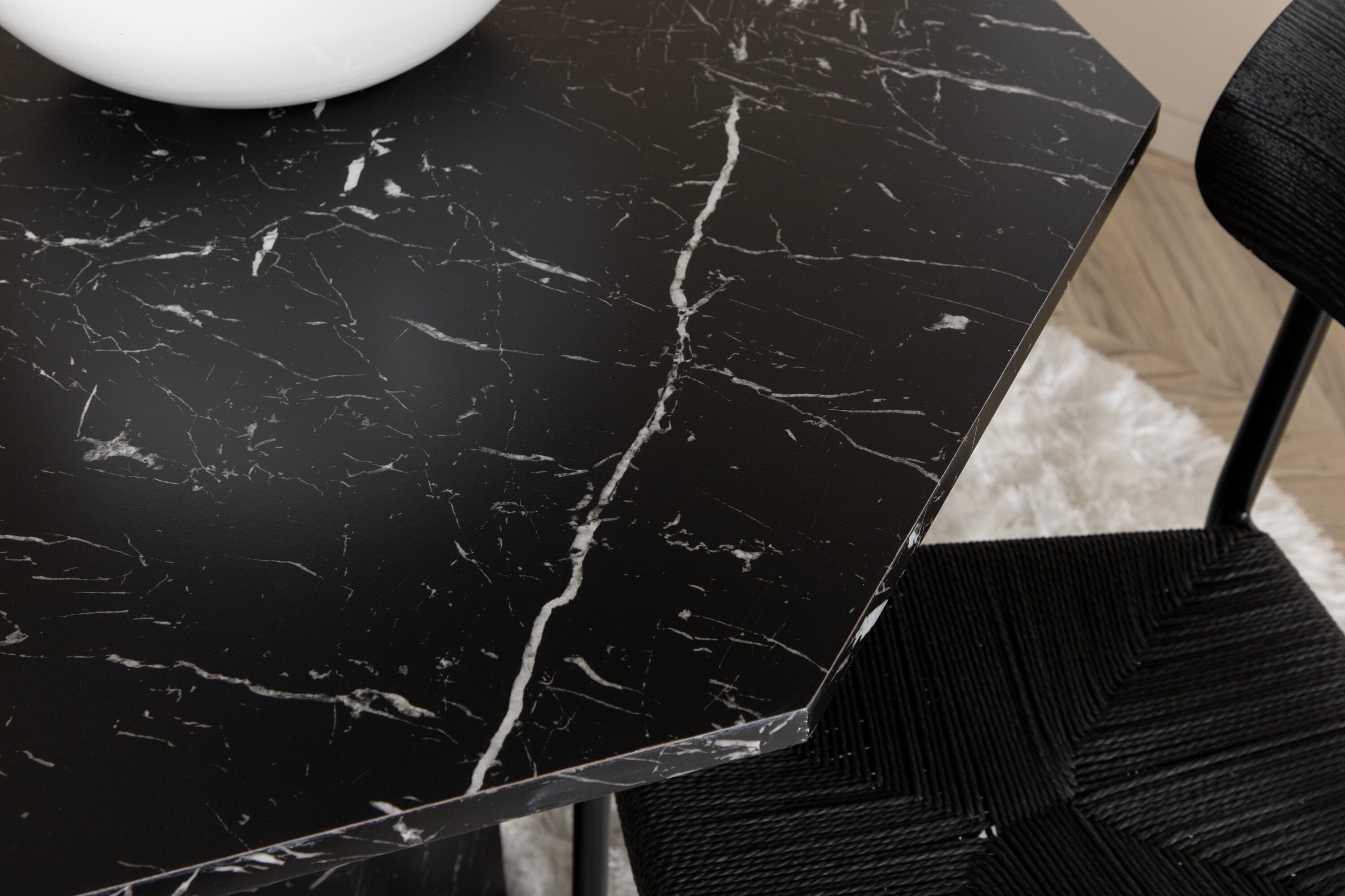 Zvyšte úroveň designu interiéru s moderní skupinou potravin v designu smack! Jídelní stůl Marbs má tvar osmiúhelníku a má celoplošný design s horní deskou z černého mramorového skla se skvrnitým bílým vzorem a nohou stolu z MDF a mramorového papíru. Rozměry stolu: Průměr: 110 cm, Výška: 75 cm. Zde je sladěn se 4 jídelními židlemi Polly v jednoduchém designu. Nohy židle jsou vzdušné a úzké z černého kovu a sedák z odolného lana. Rozměry židle: výška: 88 cm, výška sedáku: 47 cm, šířka: 42 cm, hloubka: 55 cm. Zde máme skupinu potravin, která dělá dobrý první dojem!