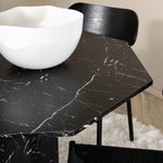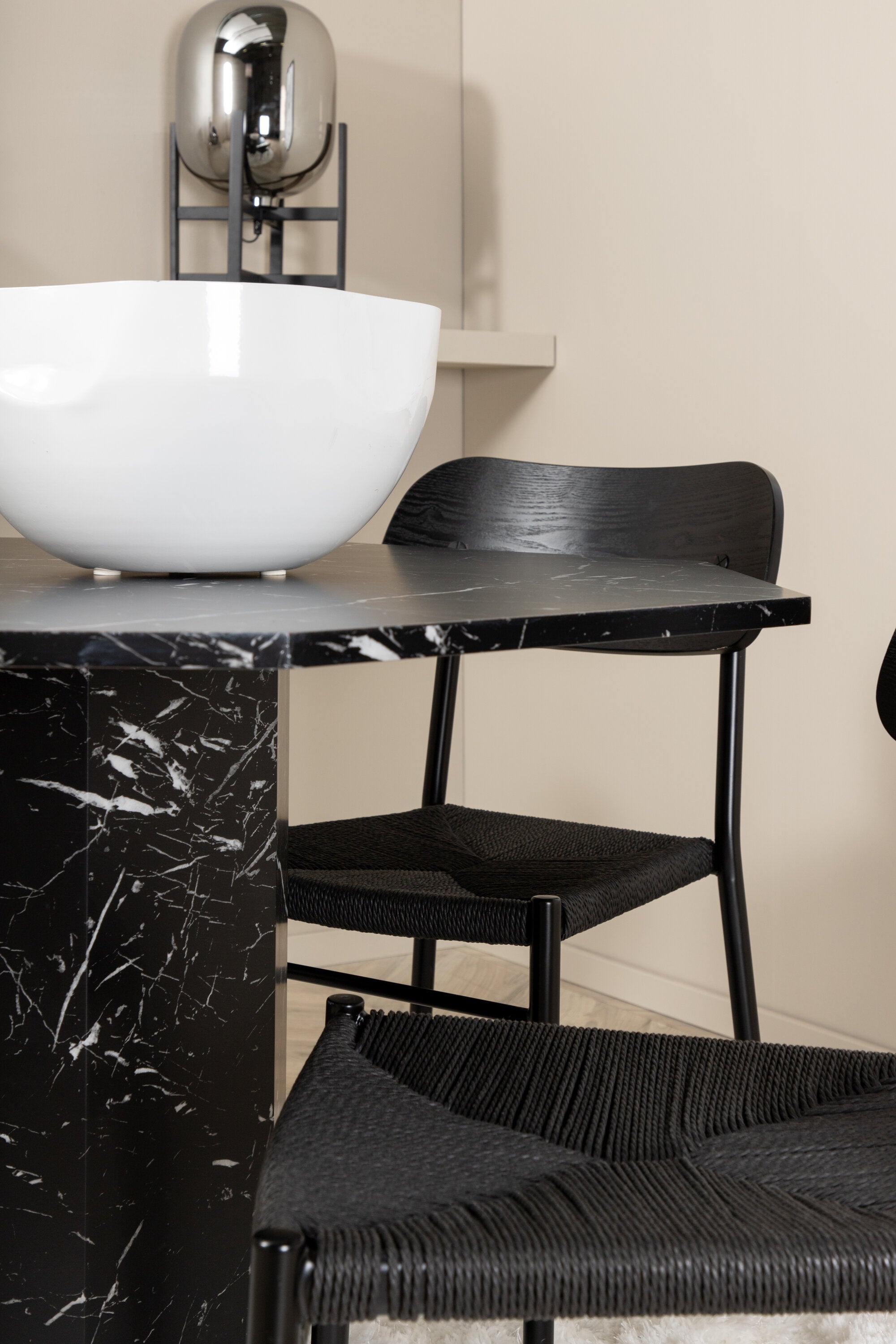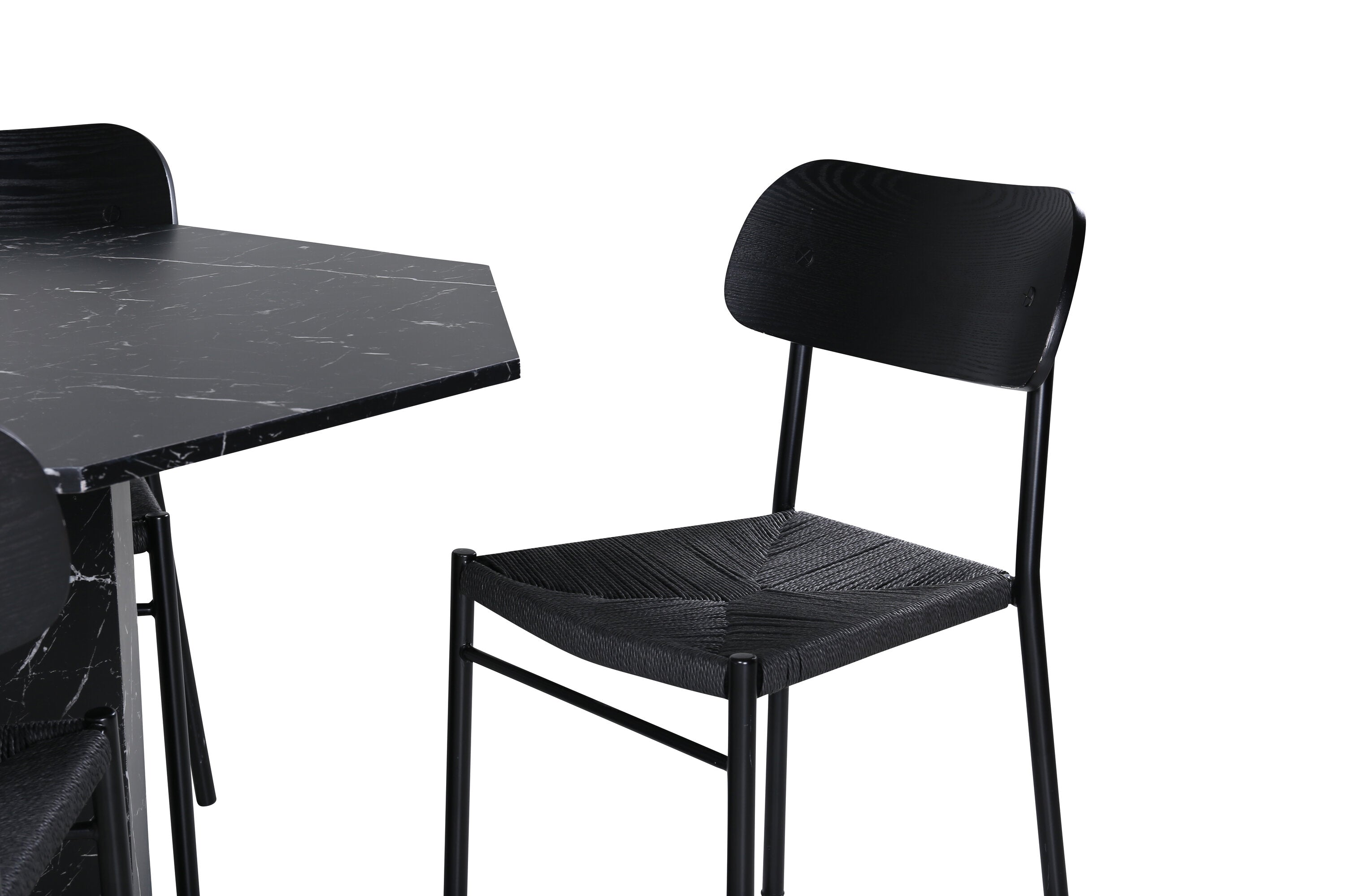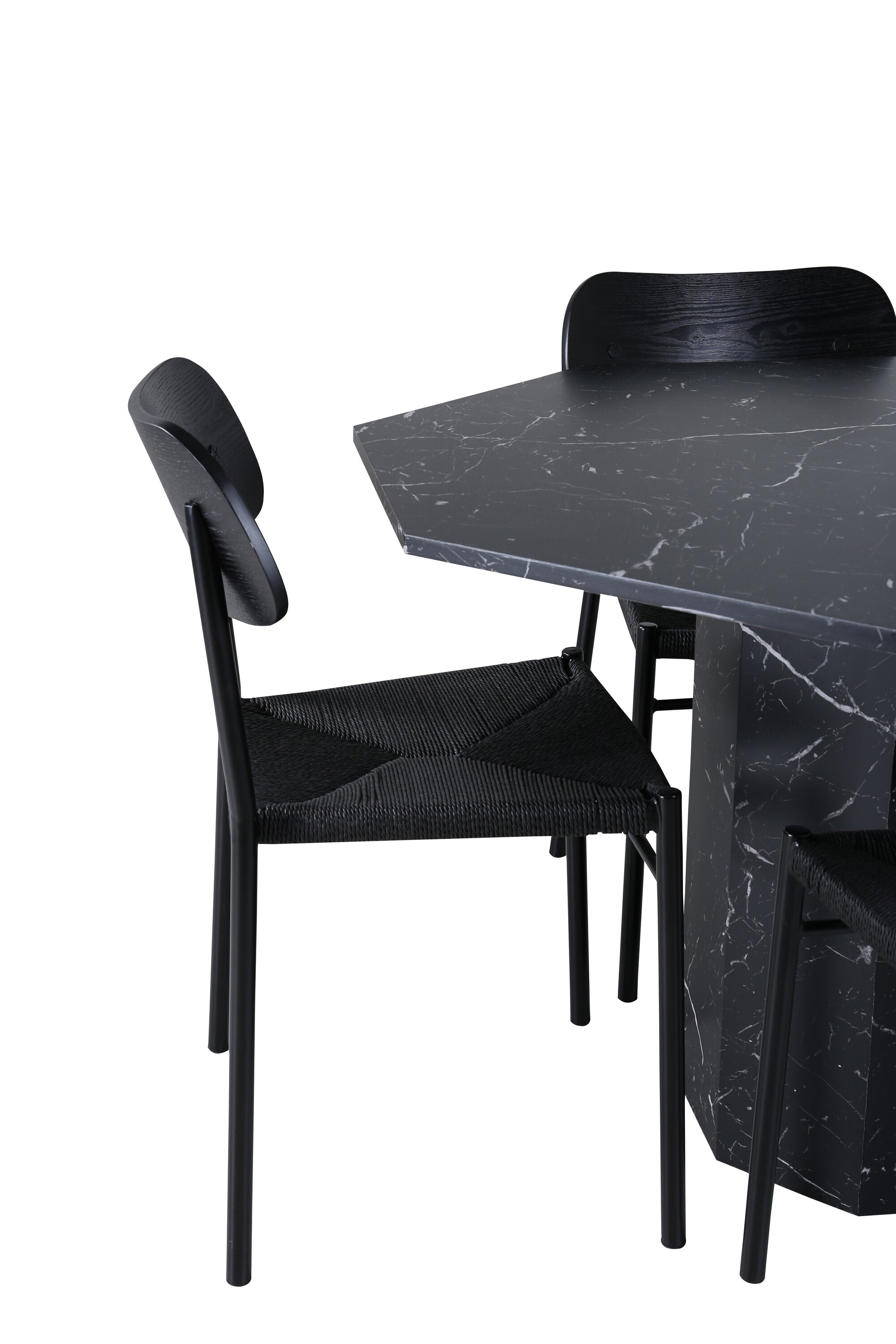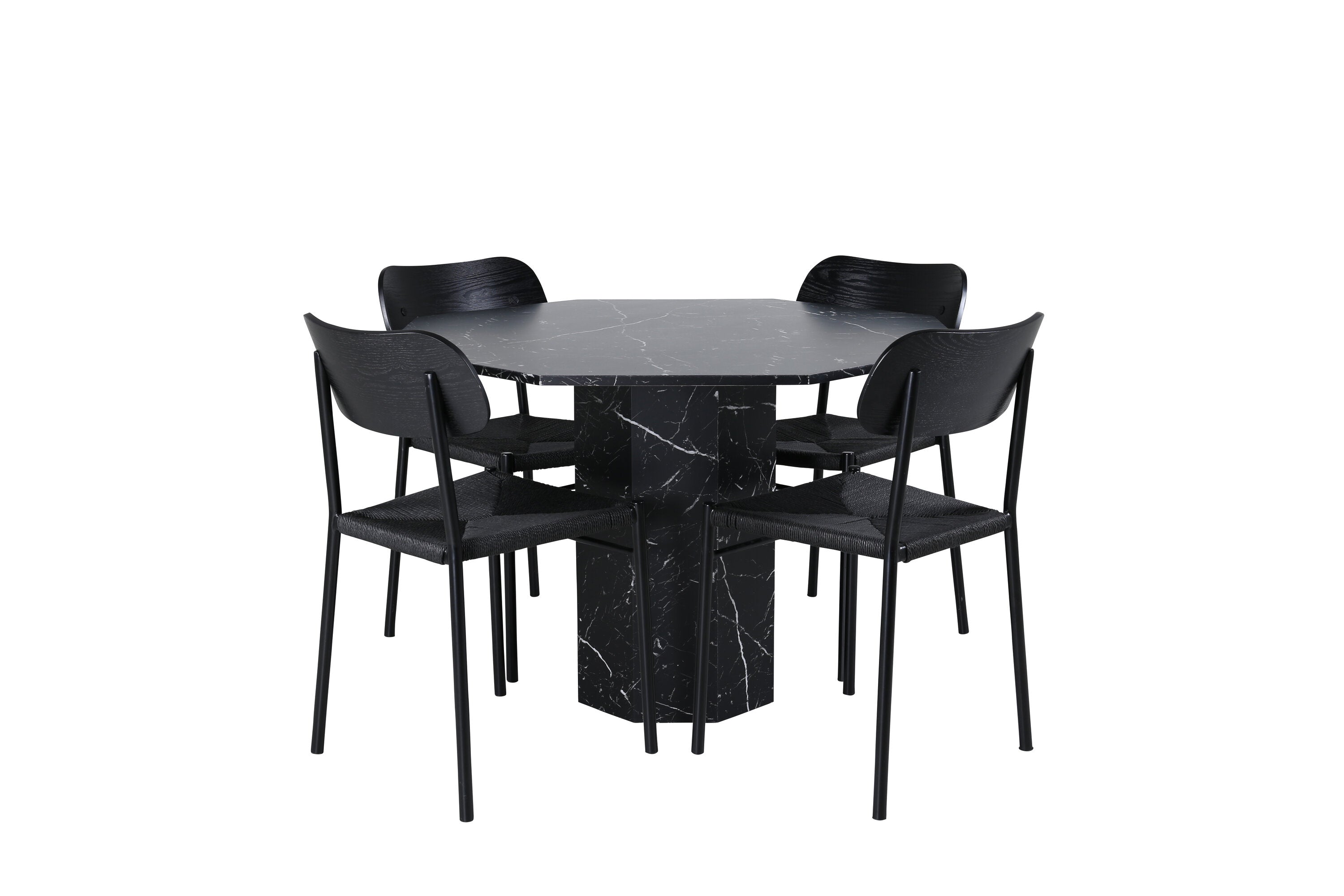 Zvyšte úroveň designu interiéru s moderní skupinou potravin v designu smack! Jídelní stůl Marbs má tvar osmiúhelníku a má celoplošný design s horní deskou z černého mramorového skla se skvrnitým bílým vzorem a nohou stolu z MDF a mramorového papíru. Rozměry stolu: Průměr: 110 cm, Výška: 75 cm. Zde je sladěn se 4 jídelními židlemi Polly v jednoduchém designu. Nohy židle jsou vzdušné a úzké z černého kovu a sedák z odolného lana. Rozměry židle: výška: 88 cm, výška sedáku: 47 cm, šířka: 42 cm, hloubka: 55 cm. Zde máme skupinu potravin, která dělá dobrý první dojem!