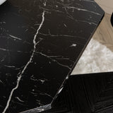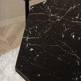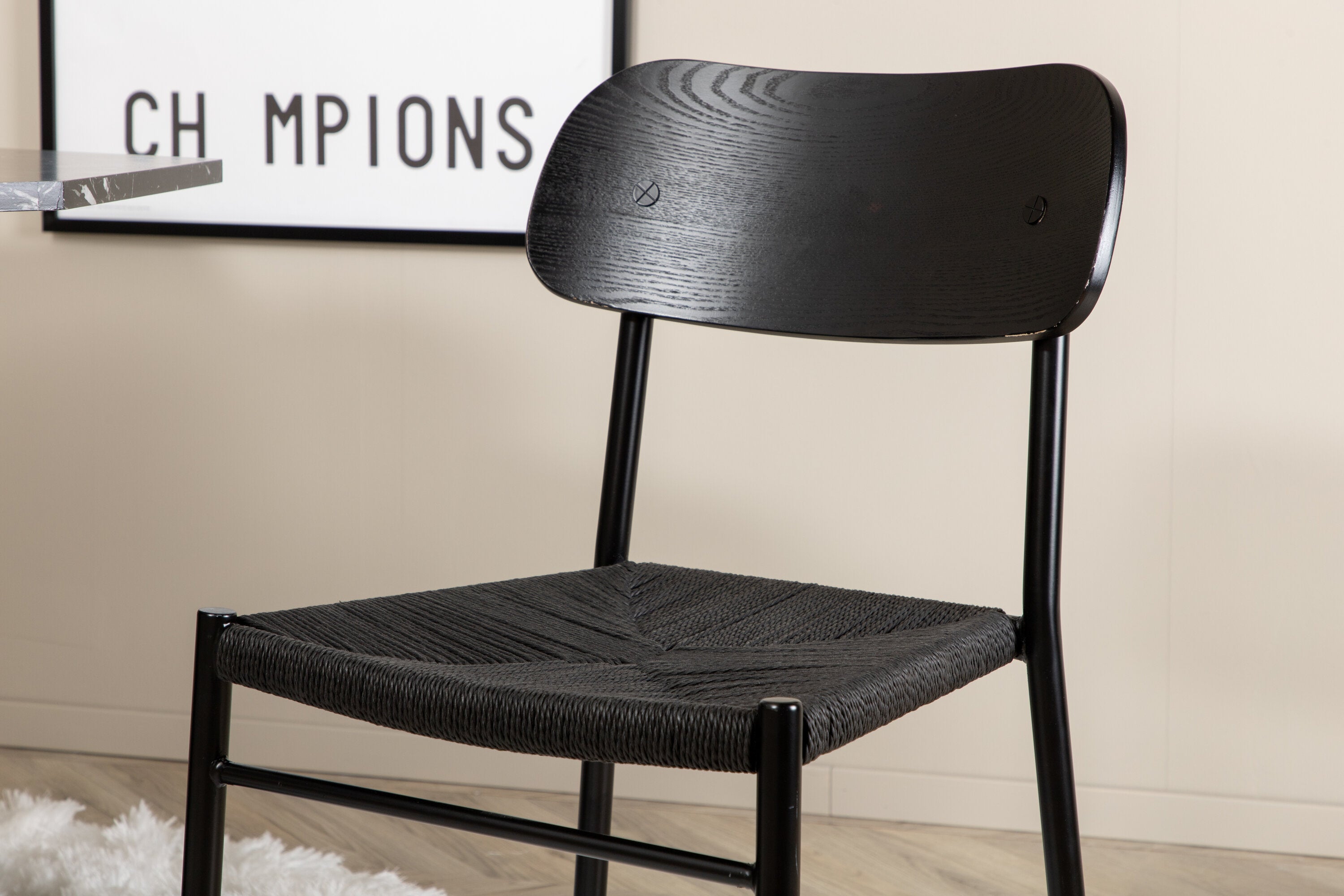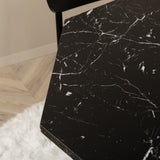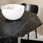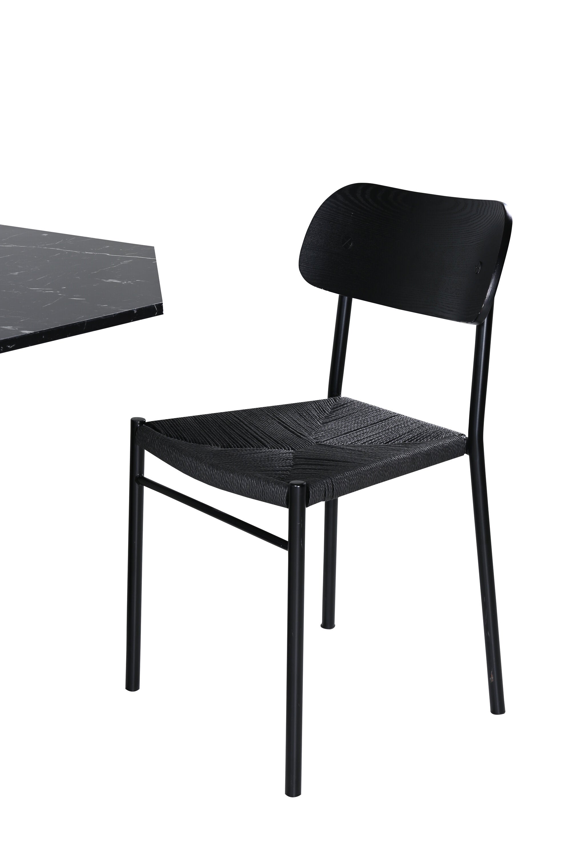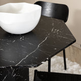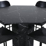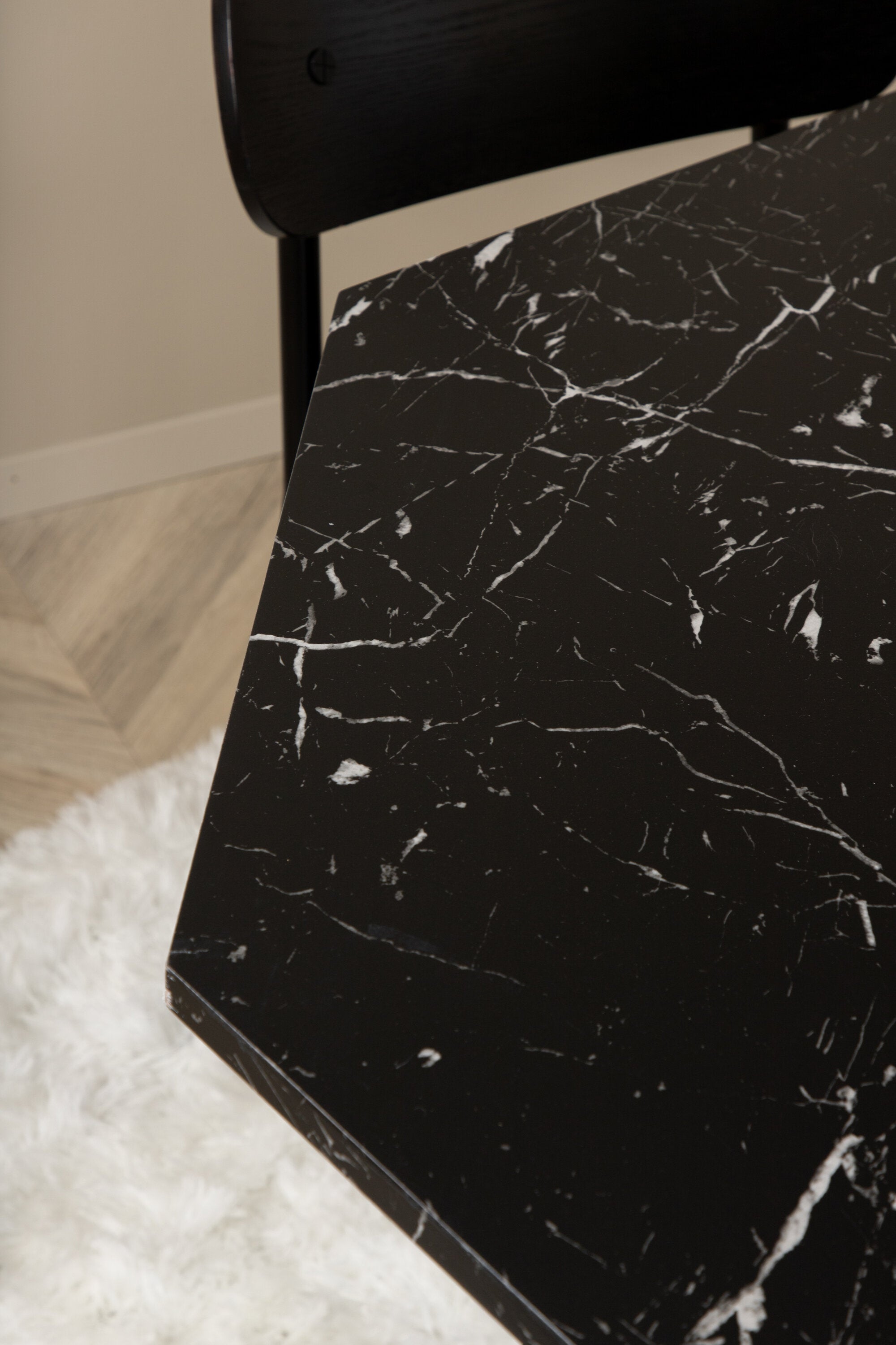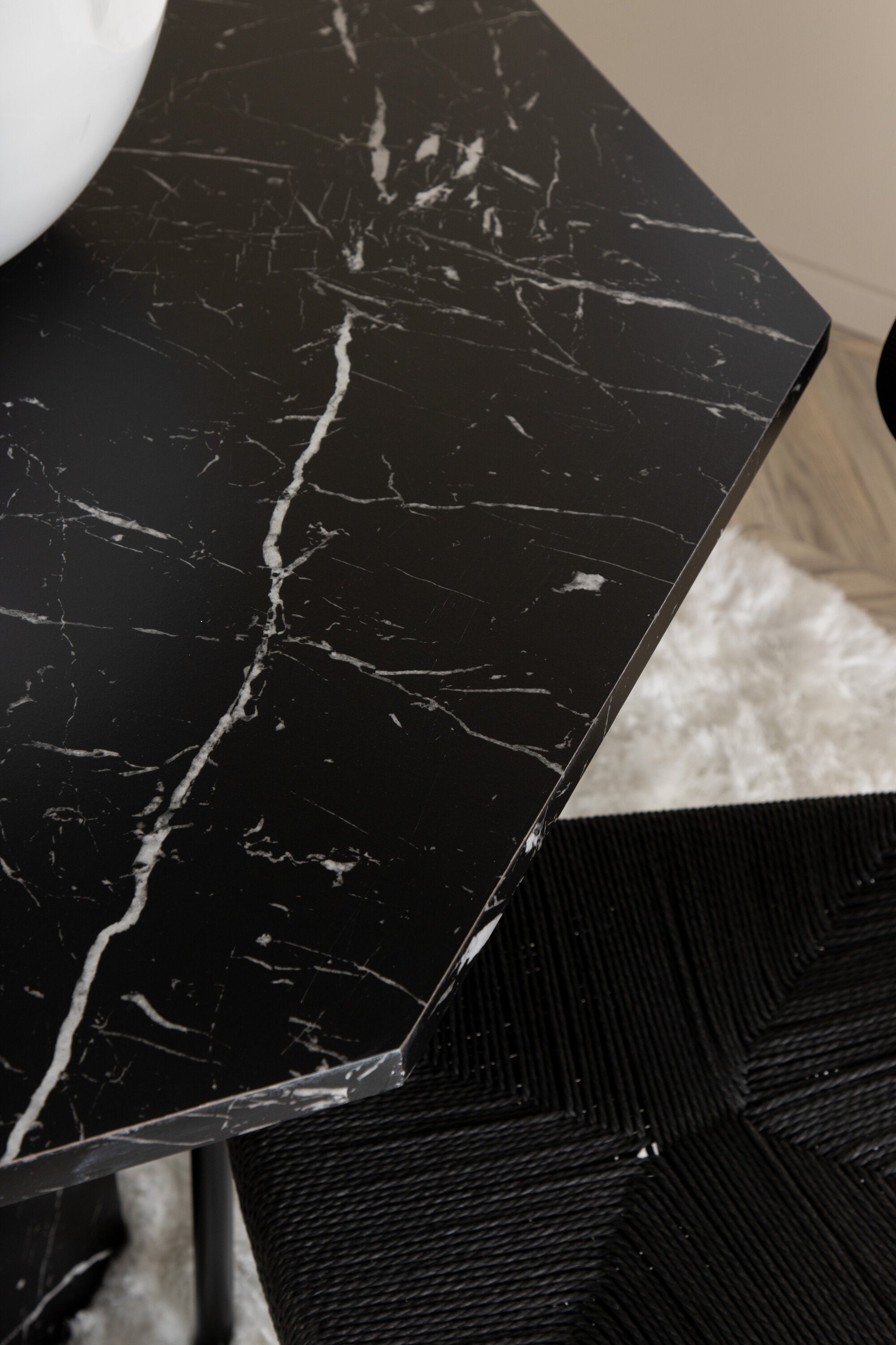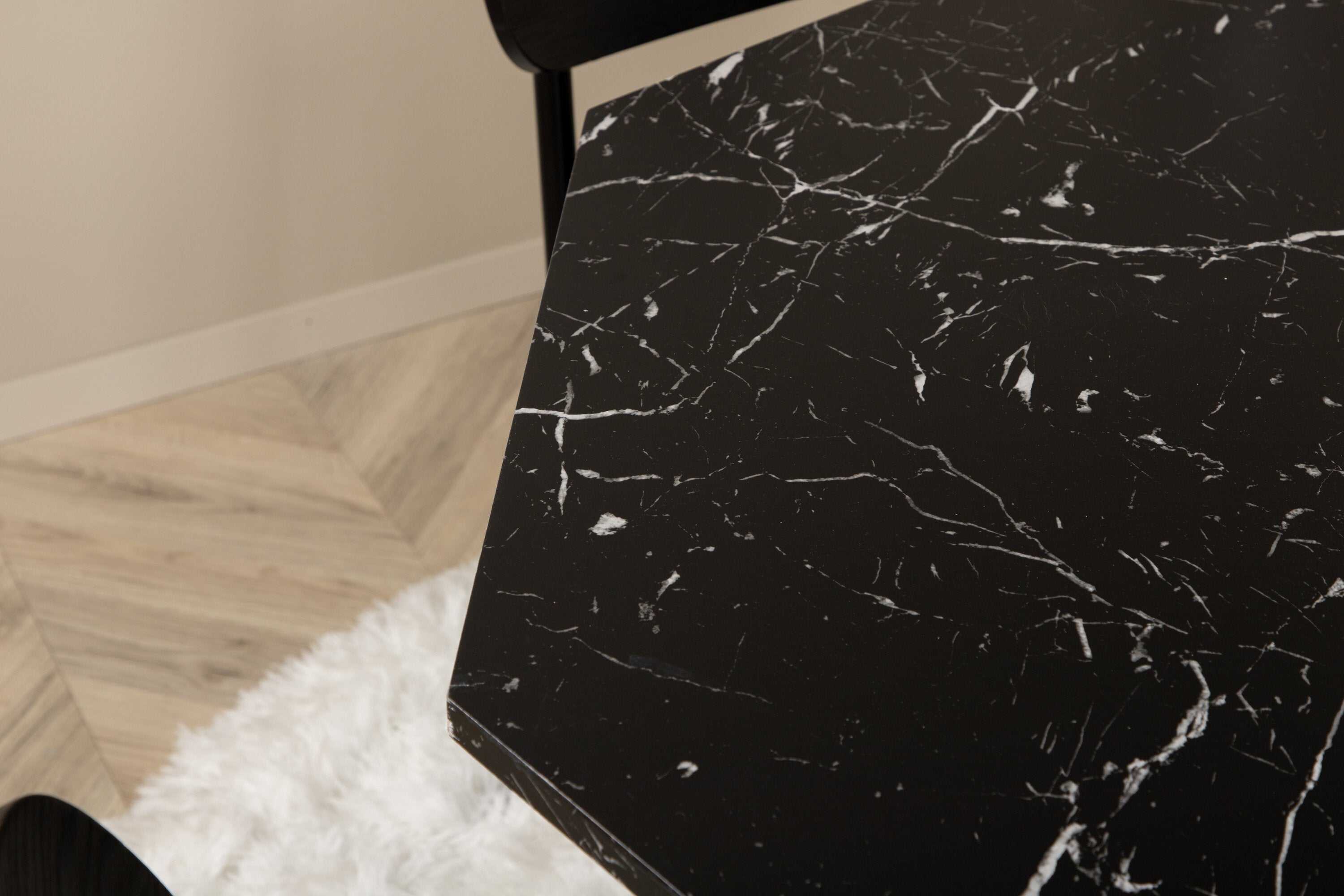 Zvyšte úroveň designu interiéru s moderní skupinou potravin v designu smack! Jídelní stůl Marbs má tvar osmiúhelníku a má celoplošný design s horní deskou z černého mramorového skla se skvrnitým bílým vzorem a nohou stolu z MDF a mramorového papíru. Rozměry stolu: Průměr: 110 cm, Výška: 75 cm. Zde je sladěn se 4 jídelními židlemi Polly v jednoduchém designu. Nohy židle jsou vzdušné a úzké z černého kovu a sedák z odolného lana. Rozměry židle: výška: 88 cm, výška sedáku: 47 cm, šířka: 42 cm, hloubka: 55 cm. Zde máme skupinu potravin, která dělá dobrý první dojem!