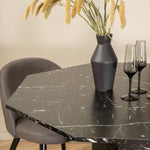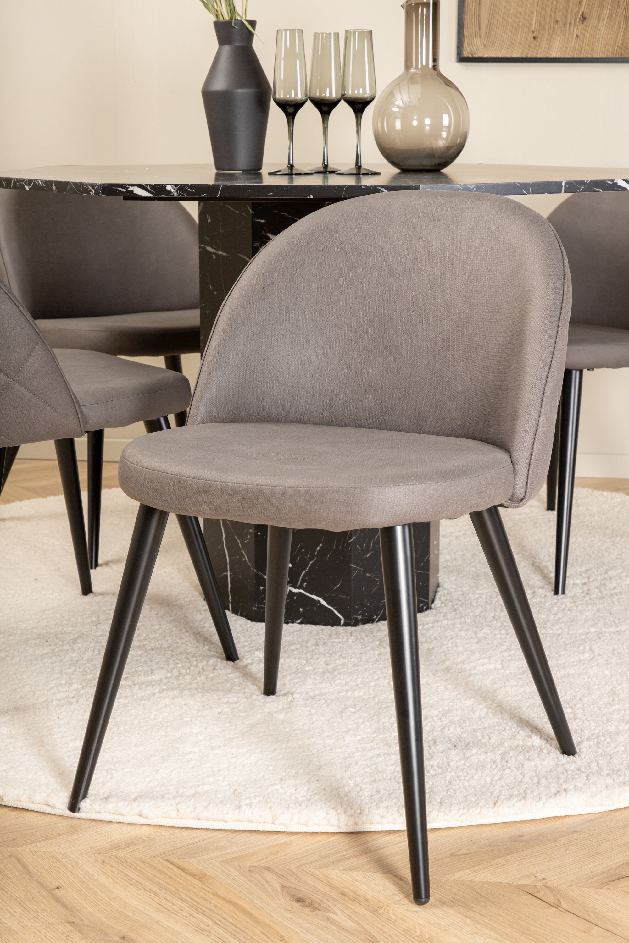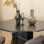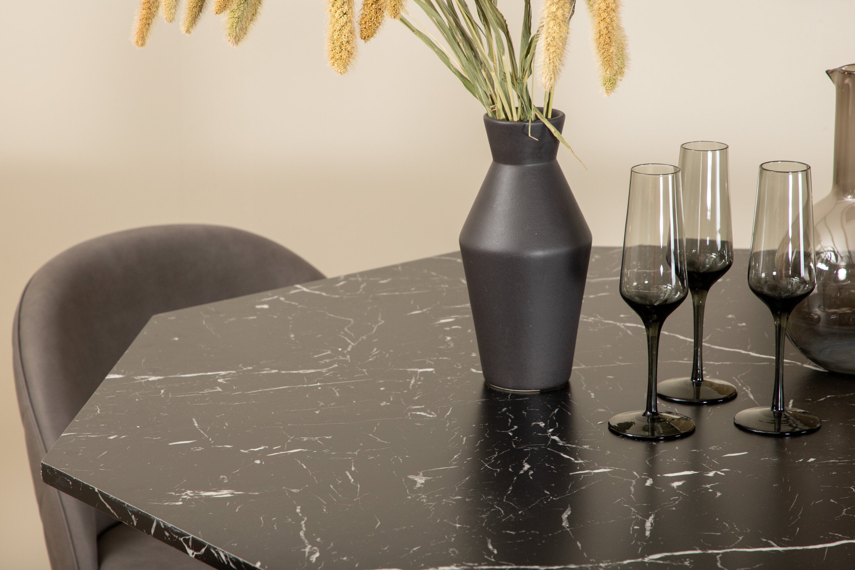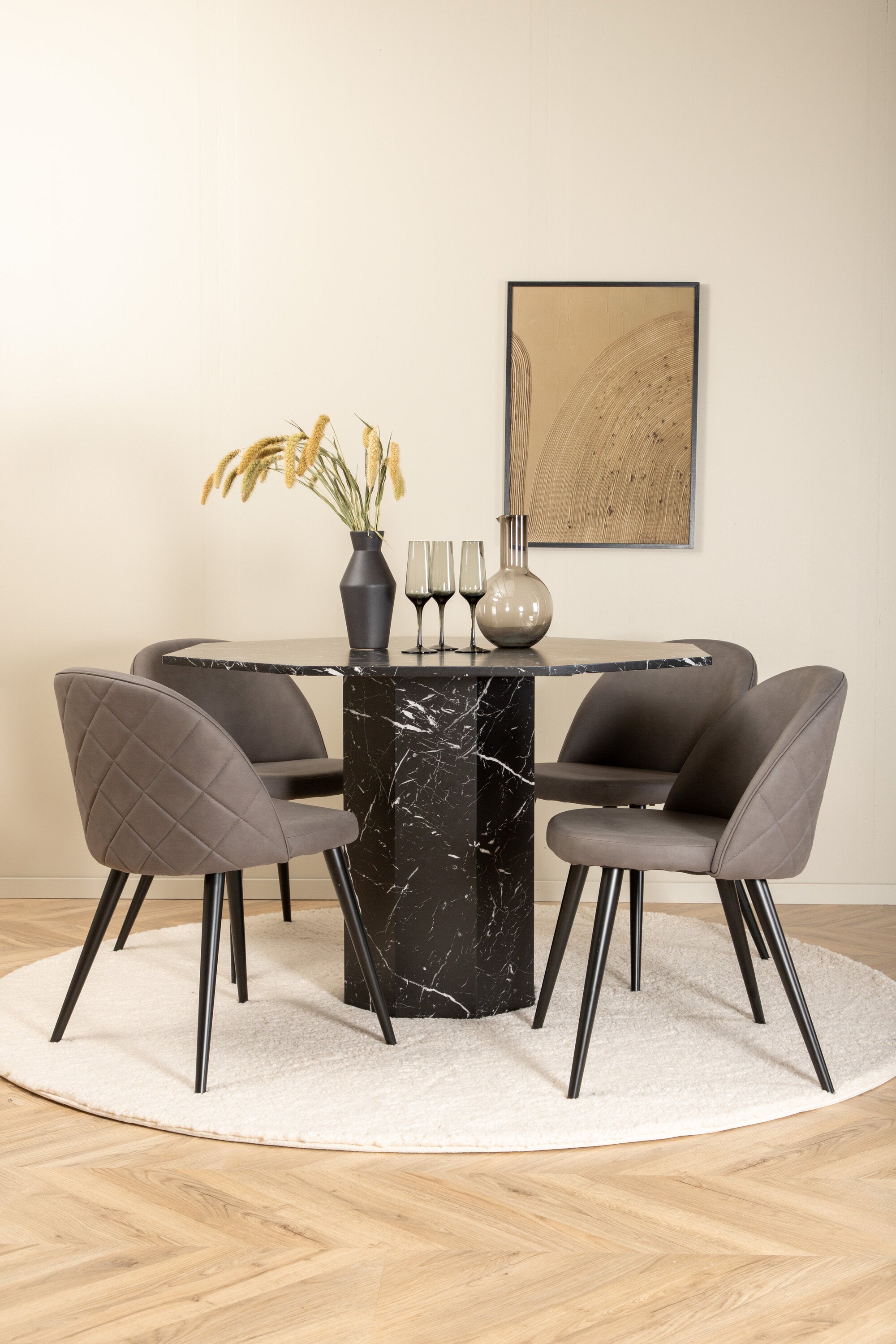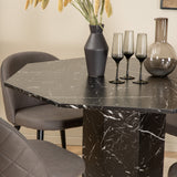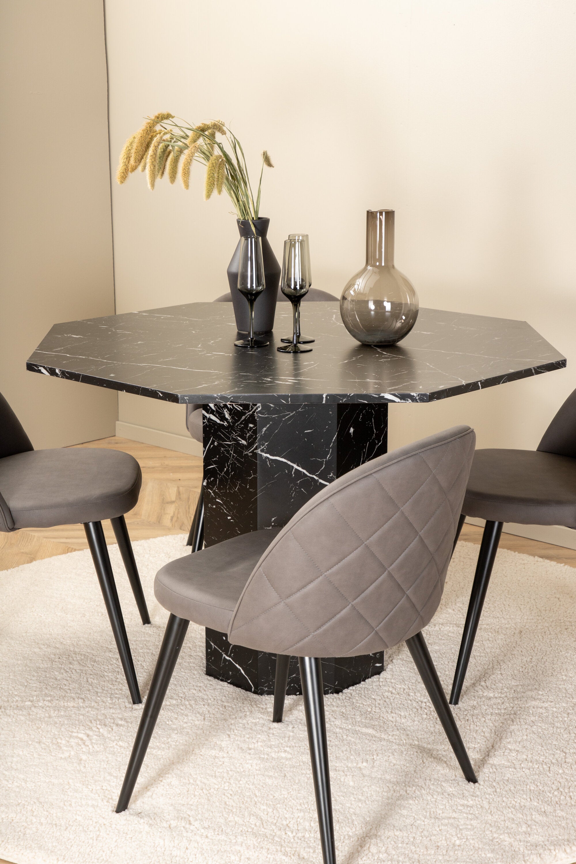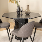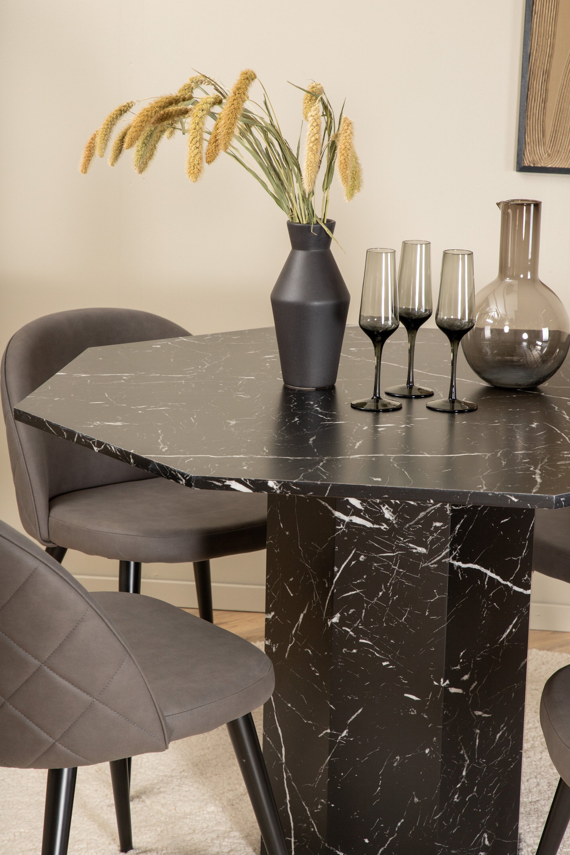 Jídelní stůl Marbs - stylová ikona pro obývací pokoj! Stůl má tvar osmiúhelníku a má celoplošný design s horní deskou z černého mramorového skla se skvrnitým bílým vzorem a nohou stolu z MDF a mramorového papíru. Rozměry stolu: Průměr: 110 cm, Výška: 75 cm. Zde v kombinaci se 4 jídelními židlemi Velvet Stitches. Židle mají lákavý design s šedými sedáky z mikrovlákna s dekorativním stehem a mírně rozšířenými nohami židle v černém kovu. Rozměry židle: Výška: 76,5 cm, výška sedáku: 46,5 cm, šířka: 50 cm, hloubka: 57 cm. Vytvořte okouzlující středobod v srdci domova!