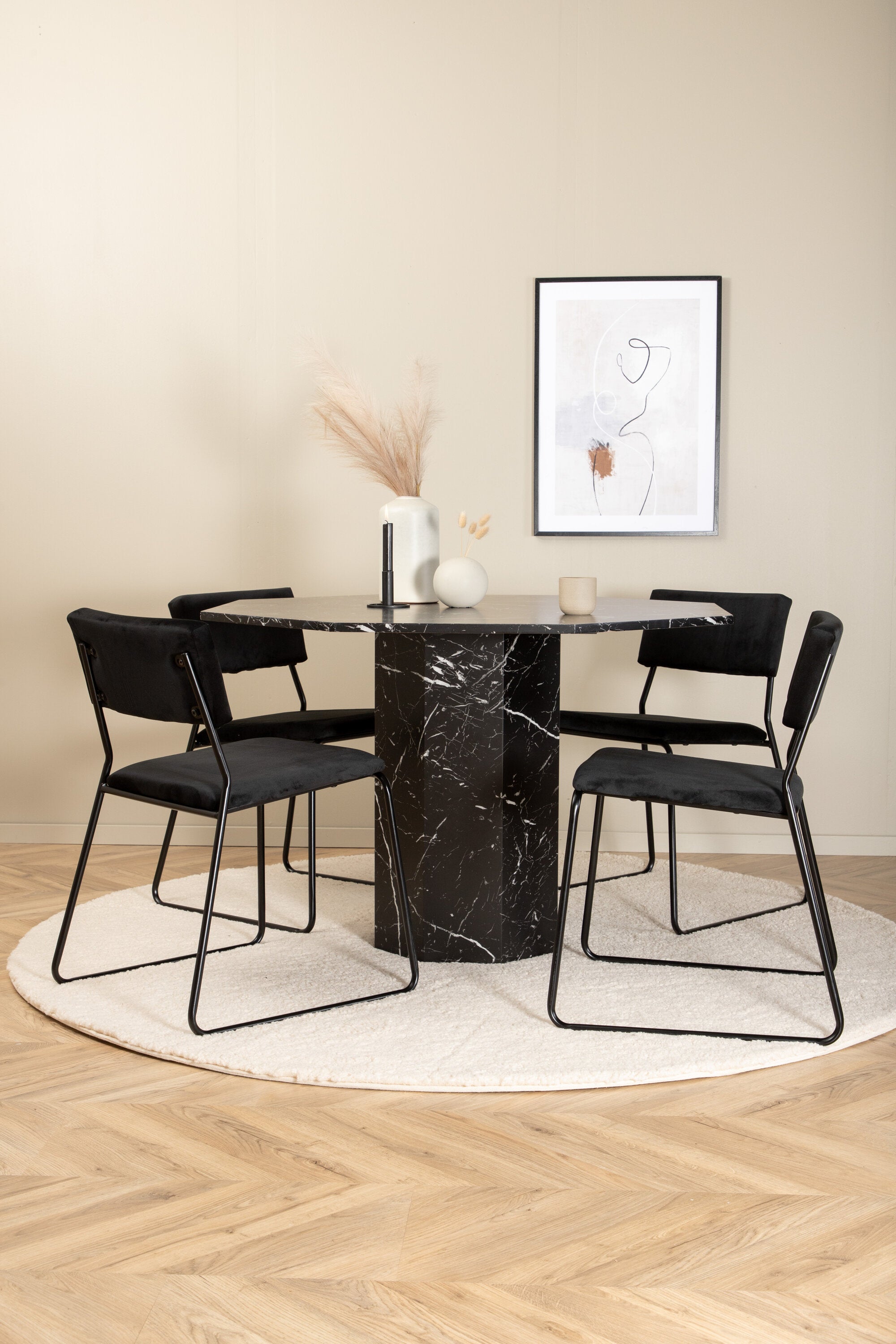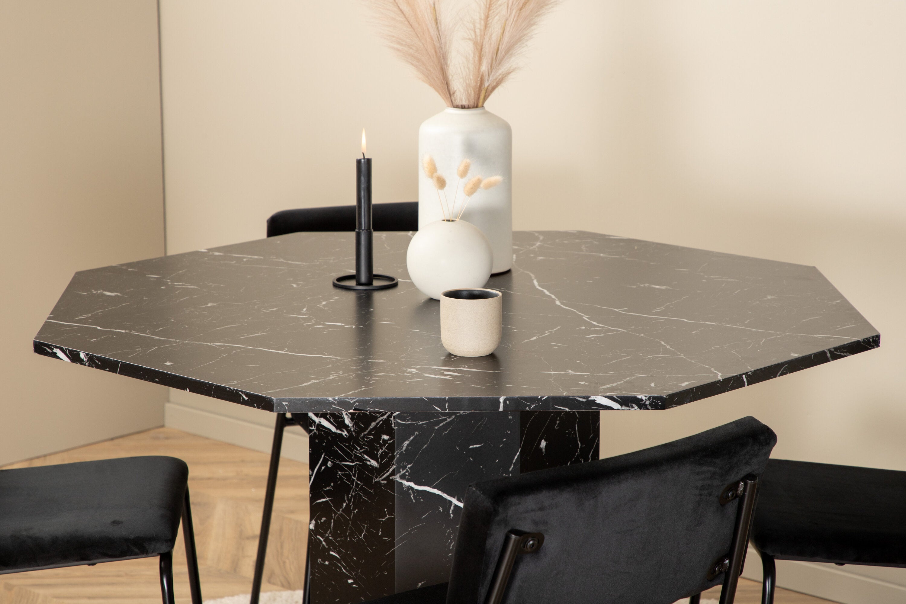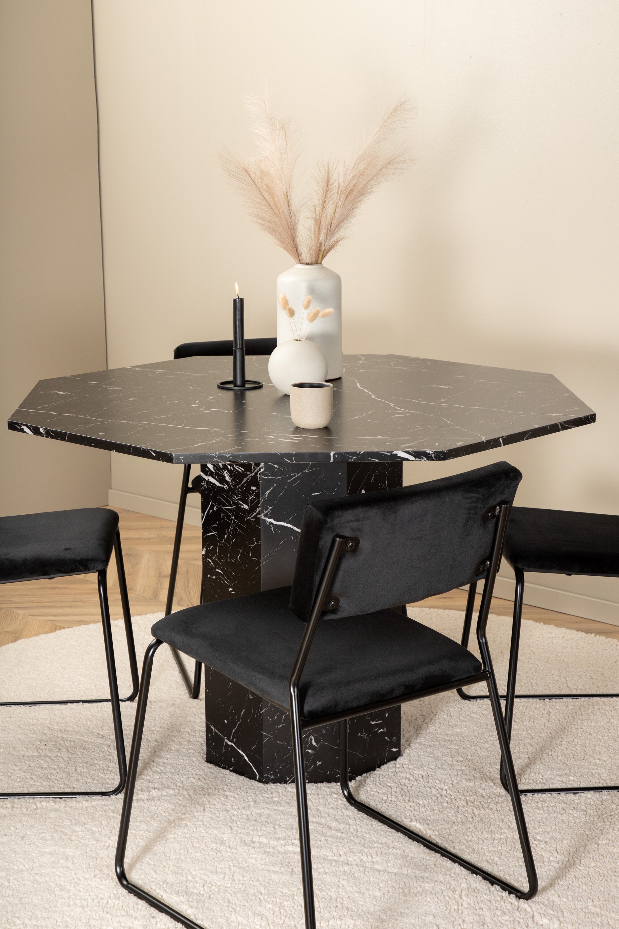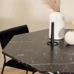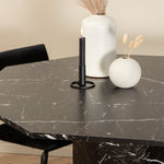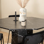 Příjemný a stylový - Jídelní stůl Marbs působí ve vašem domově módním dojmem! Stůl má tvar osmiúhelníku a má celoplošný design s horní deskou z černého mramorového skla se skvrnitým bílým vzorem a nohou stolu z MDF a mramorového papíru. Rozměry stolu: Průměr: 110 cm, Výška: 75 cm. Sladěno se 4 jídelními židlemi Kenth v černé barvě se železem a sedáky z měkké sametové látky. Rozměry židle: Výška: 76 cm, výška sedáku: 48,5 cm, šířka: 40 cm, hloubka: 52 cm. Nechte zdobit srdce domova touto poutavou skupinou jídel!