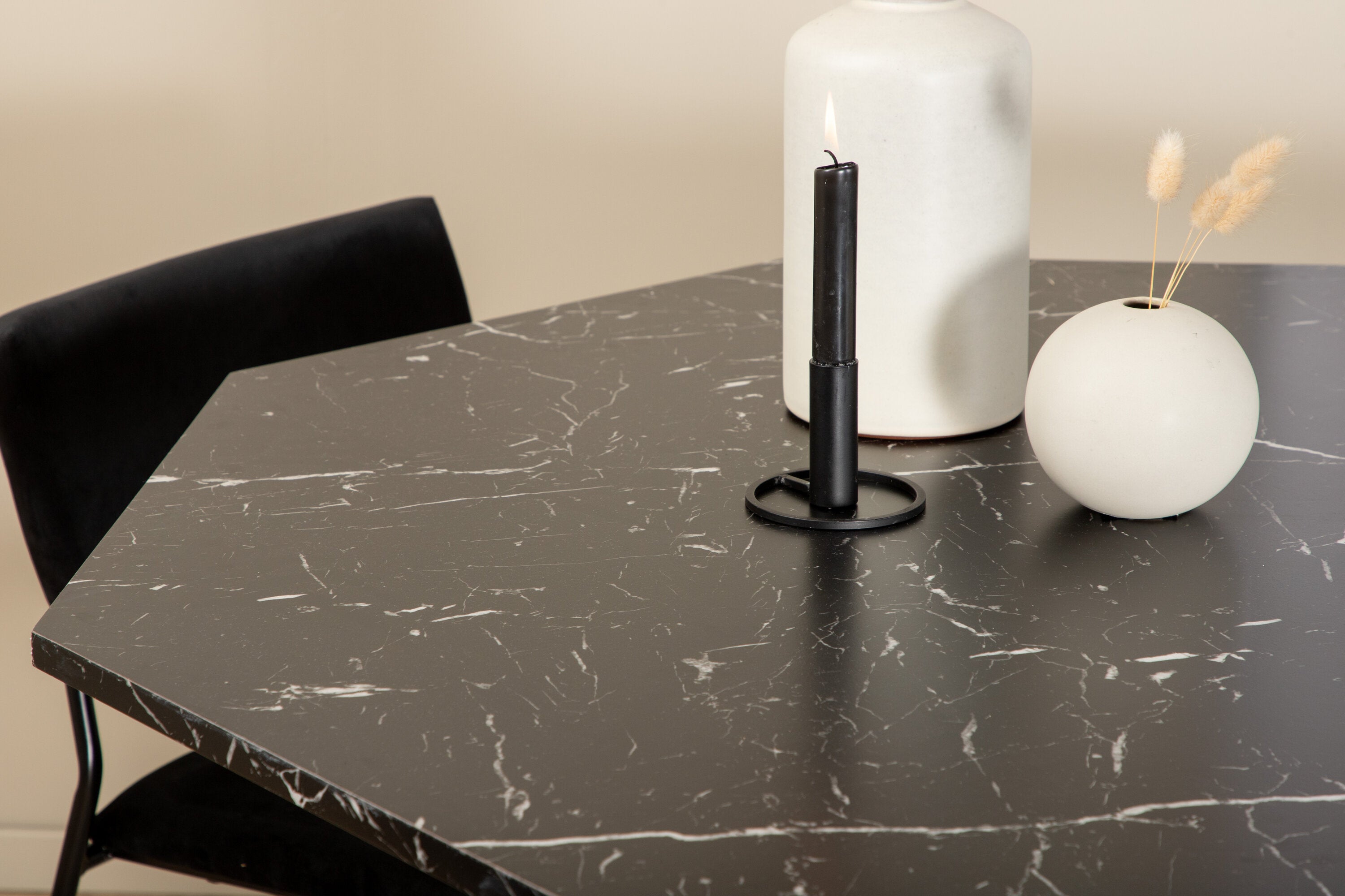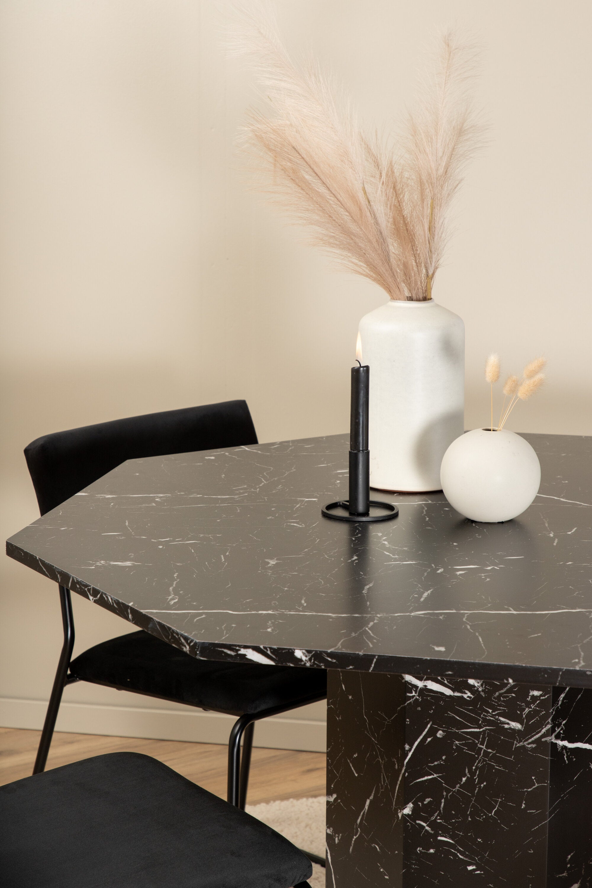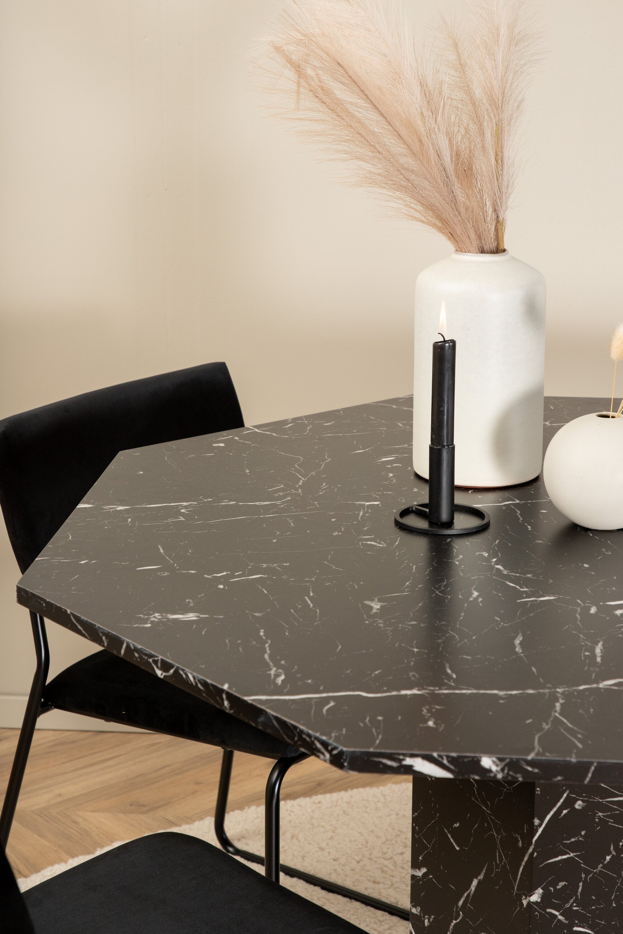 Příjemný a stylový - Jídelní stůl Marbs působí ve vašem domově módním dojmem! Stůl má tvar osmiúhelníku a má celoplošný design s horní deskou z černého mramorového skla se skvrnitým bílým vzorem a nohou stolu z MDF a mramorového papíru. Rozměry stolu: Průměr: 110 cm, Výška: 75 cm. Sladěno se 4 jídelními židlemi Kenth v černé barvě se železem a sedáky z měkké sametové látky. Rozměry židle: Výška: 76 cm, výška sedáku: 48,5 cm, šířka: 40 cm, hloubka: 52 cm. Nechte zdobit srdce domova touto poutavou skupinou jídel!