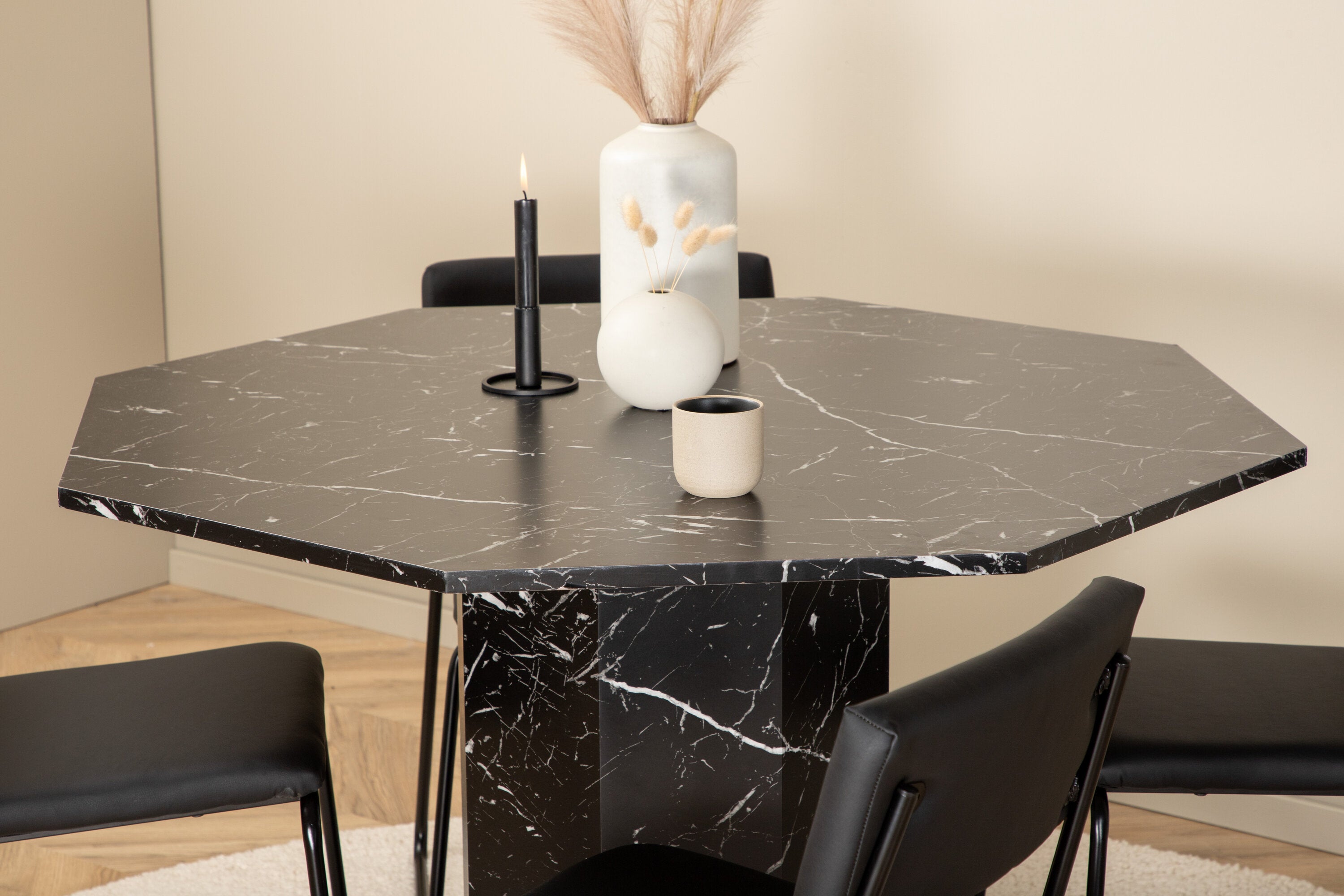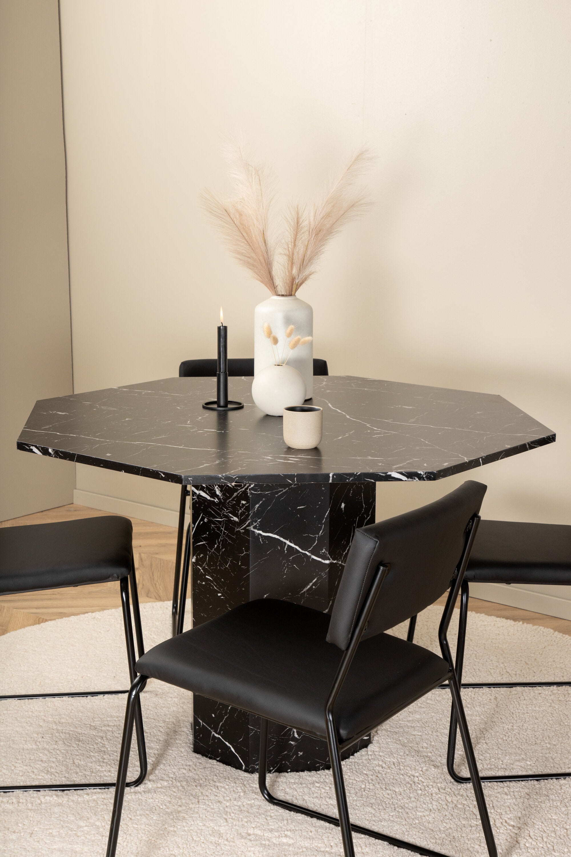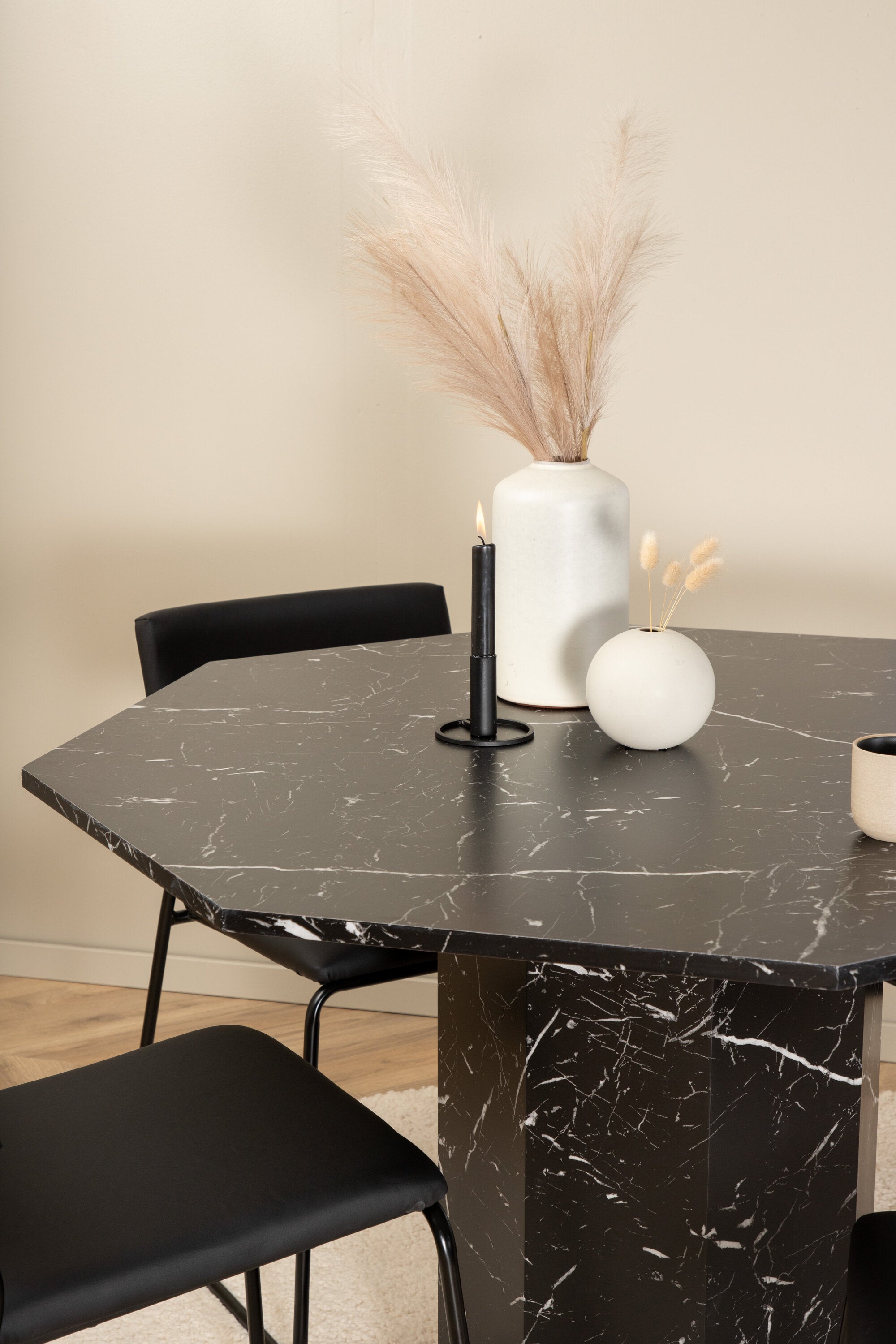 Příjemný a stylový - Jídelní stůl Marbs působí ve vašem domově módním dojmem! Stůl má tvar osmiúhelníku a má celoplošný design s horní deskou z černého mramorového skla se skvrnitým bílým vzorem a nohou stolu z MDF a mramorového papíru. Rozměry stolu: Průměr: 110 cm, Výška: 75 cm. Sladěno se 4 jídelními židlemi Kenth v černé barvě s nohami židlí ze železa a sedáky z nafoukané umělé kůže. Rozměry židle: Výška: 76 cm, výška sedáku: 48,5 cm, šířka: 40 cm, hloubka: 52 cm. Nechte zdobit srdce domova touto poutavou skupinou jídel!