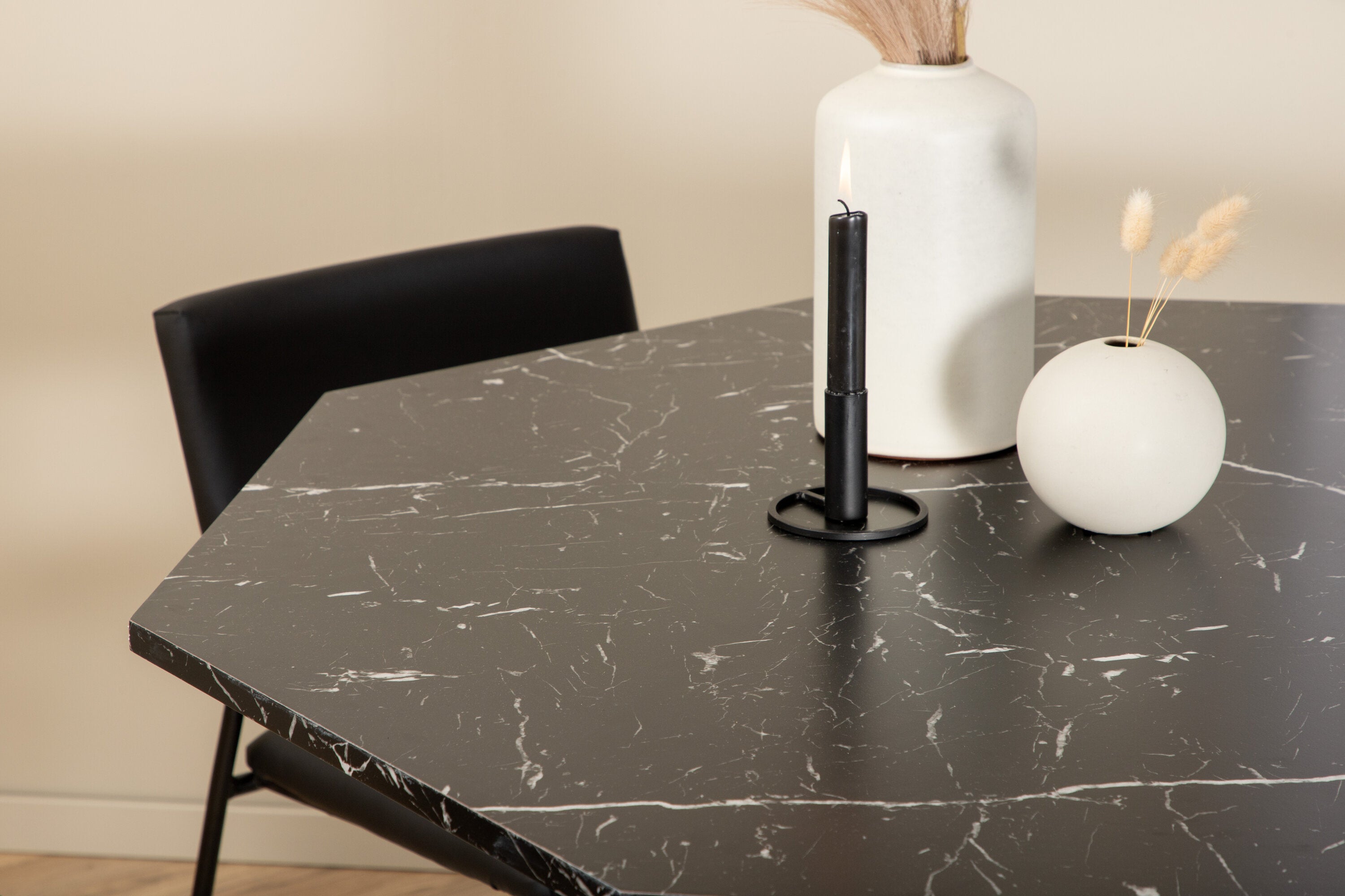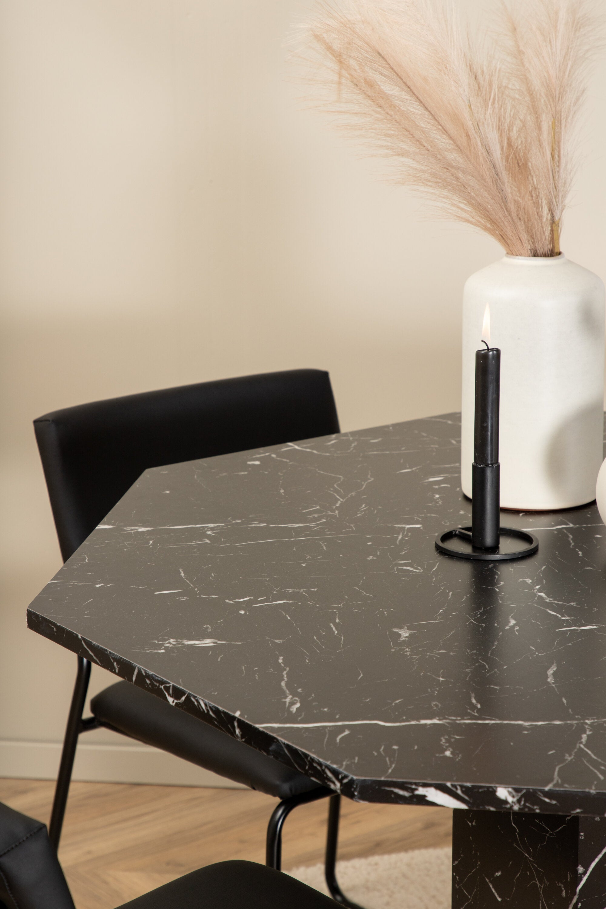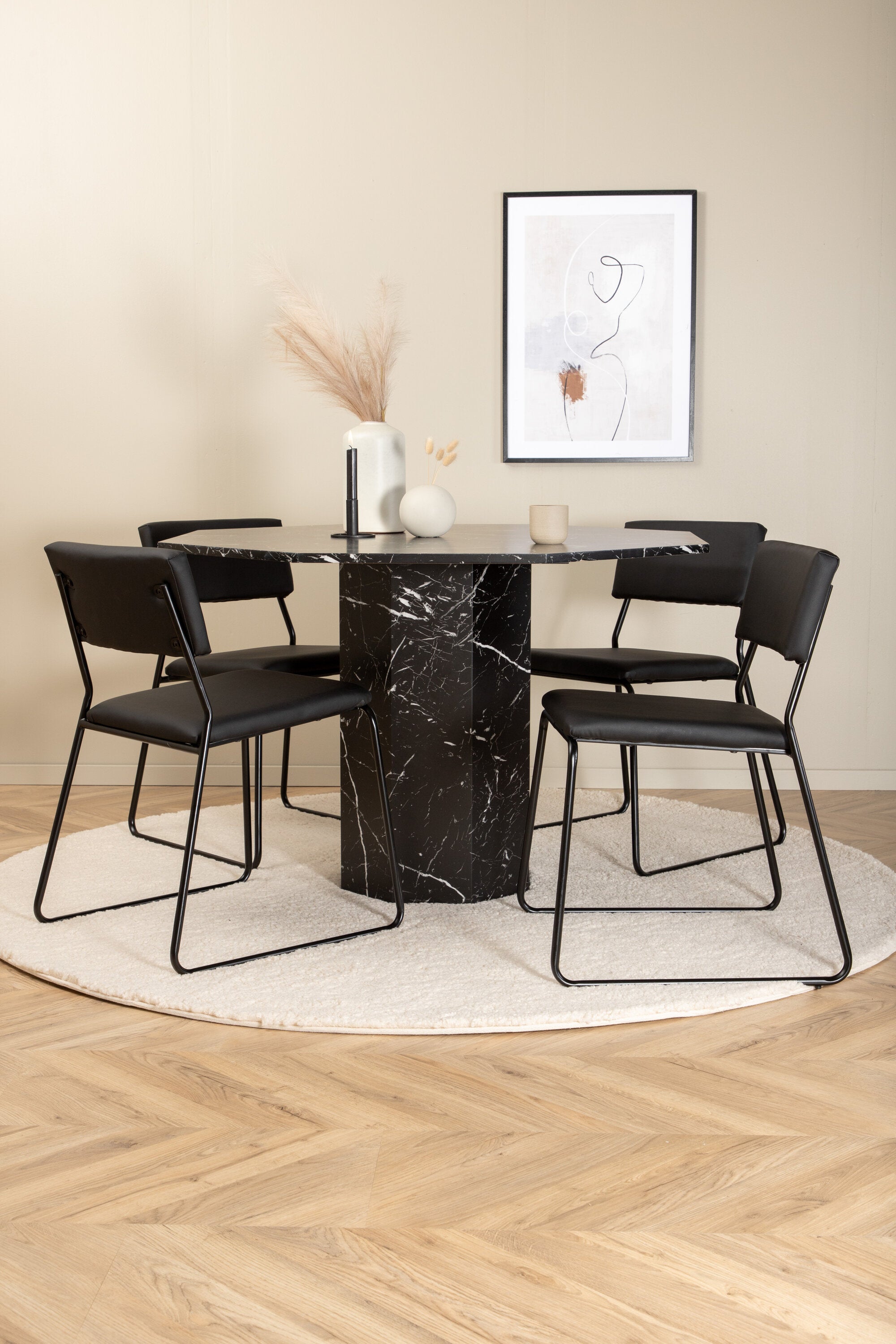 Příjemný a stylový - Jídelní stůl Marbs působí ve vašem domově módním dojmem! Stůl má tvar osmiúhelníku a má celoplošný design s horní deskou z černého mramorového skla se skvrnitým bílým vzorem a nohou stolu z MDF a mramorového papíru. Rozměry stolu: Průměr: 110 cm, Výška: 75 cm. Sladěno se 4 jídelními židlemi Kenth v černé barvě s nohami židlí ze železa a sedáky z nafoukané umělé kůže. Rozměry židle: Výška: 76 cm, výška sedáku: 48,5 cm, šířka: 40 cm, hloubka: 52 cm. Nechte zdobit srdce domova touto poutavou skupinou jídel!