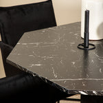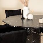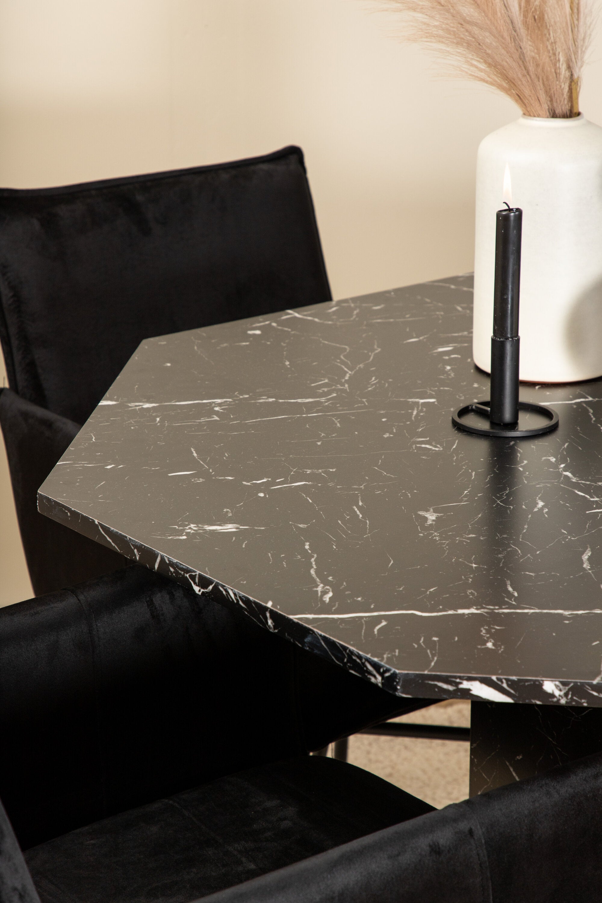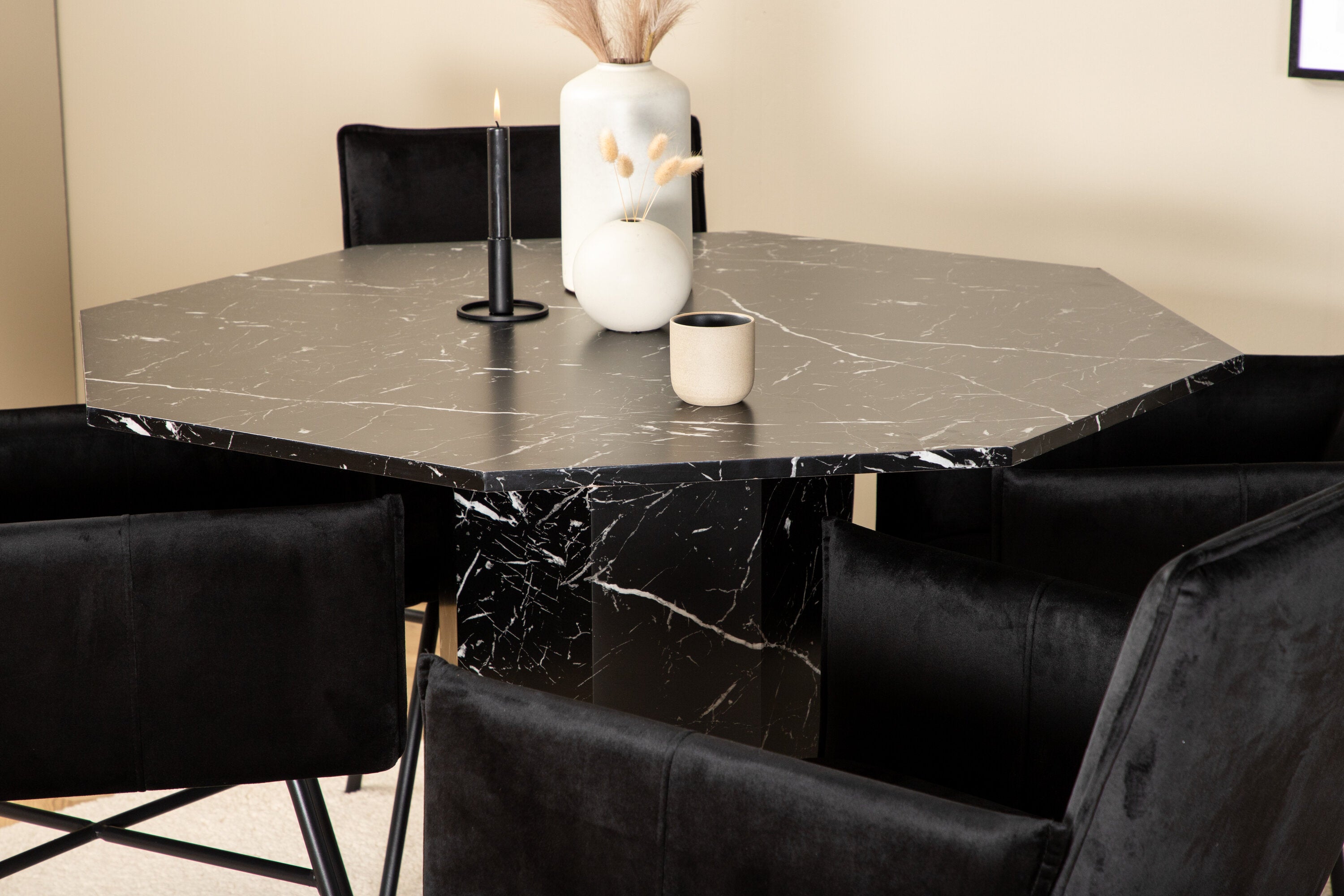 Vytvořte poutač, který zaujme! Jídelní židle Petra mají lahodný design s rovnými severskými tvary, jemnou sametovou látkou v černé barvě a nohami židle v černém železe. Rozměry židle: Výška: 87 cm, výška sedáku: 48 cm, šířka: 57 cm, hloubka: 60 cm. Zde jsou 4 židle kombinovány s jídelním stolem Marbs - designovým stolem s lahodným designem. Stůl má tvar osmiúhelníku a má celoplošný design s horní deskou z černého mramorového skla se skvrnitým bílým vzorem a nohou stolu z MDF a mramorového papíru. Rozměry stolu: Průměr: 110 cm, Výška: 75 cm.