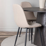 Zemité tóny a jemné tvary! Náš nádherný kulatý jídelní stůl Lanzo má celkový design z hnědé MDF s tenkou deskou a zkrouceným válcovým rámem, který je vycentrován pod středem stolu. Zde v moderní kombinaci s béžovými jídelními židlemi ze série Polar. Židle má celočalouněný design, nohy z kovu s černým práškovým nástřikem a zaoblené opěradlo a sedák z béžové boucle látky s měkkým polstrováním. Už to nebude lepší než tohle! Průměr stolu: 120 cm.
