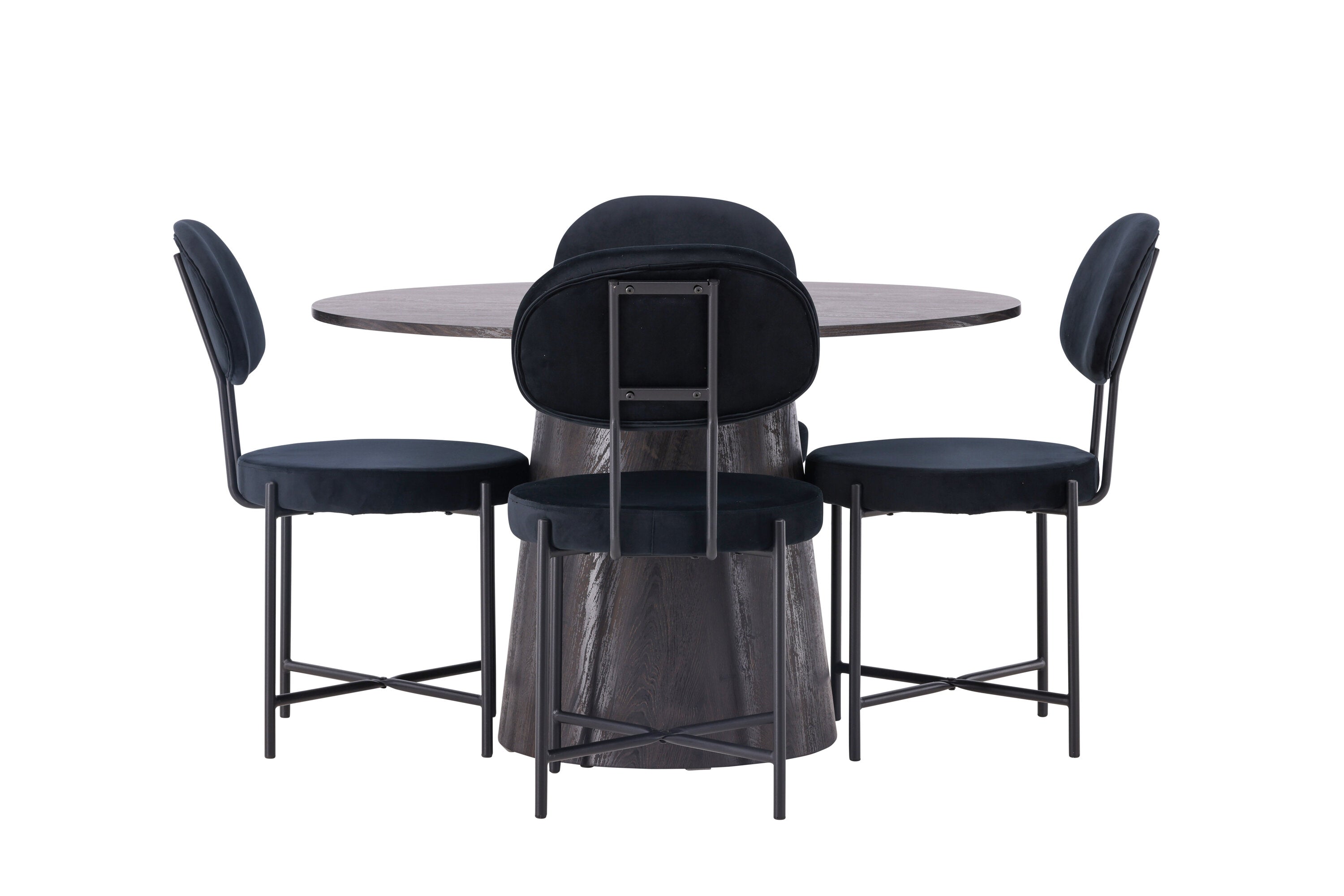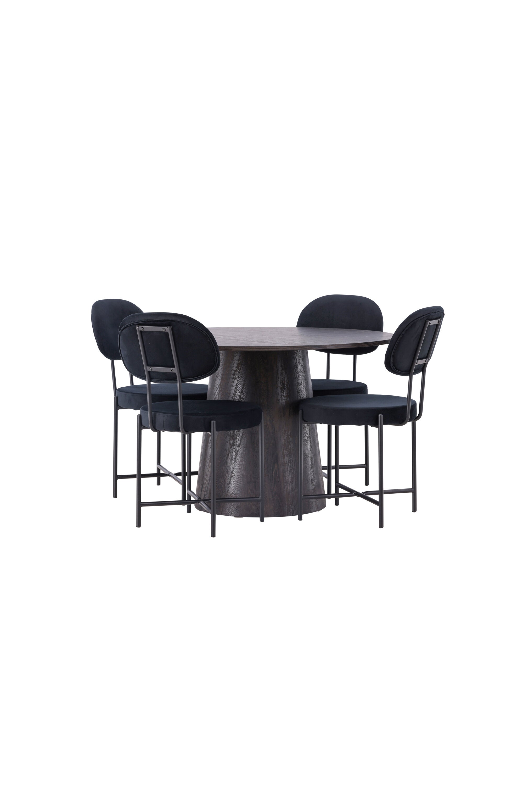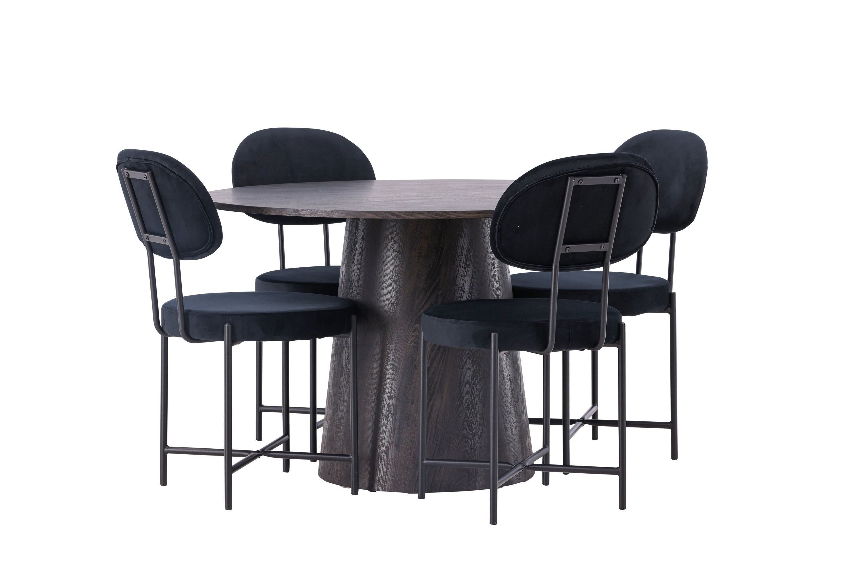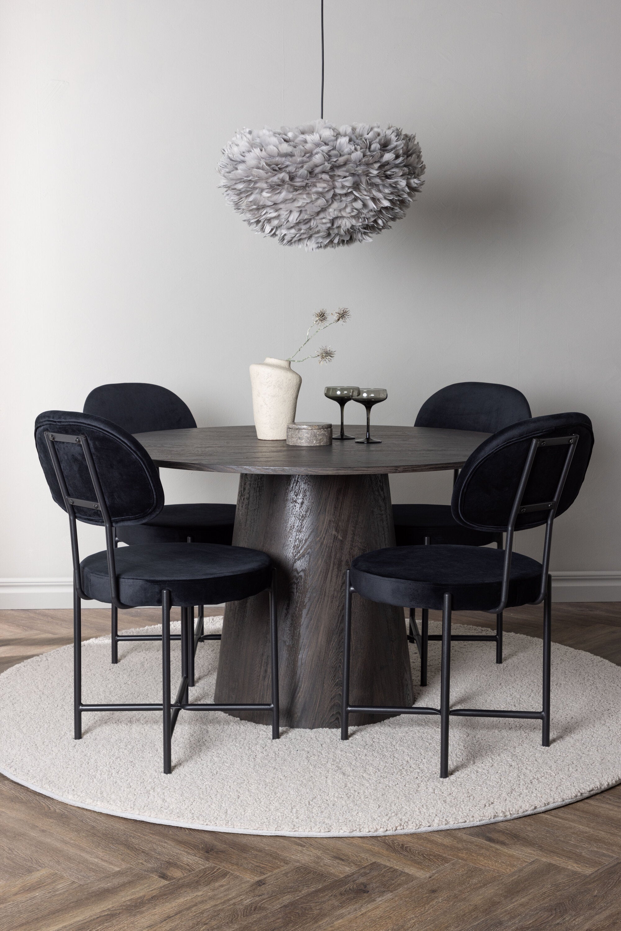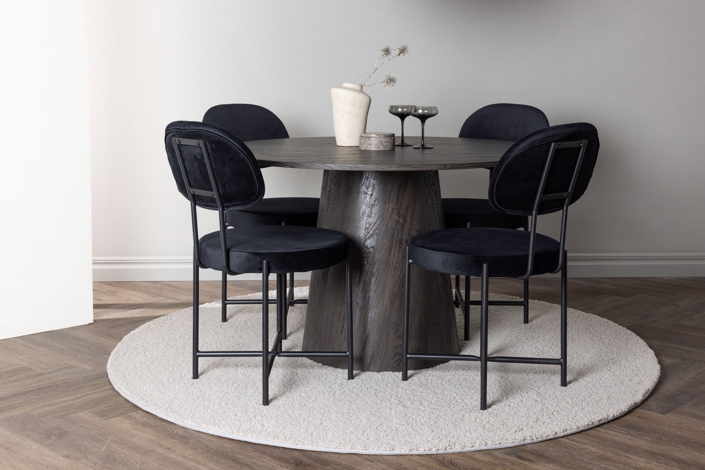 Kulaté tvary vytvářejí příjemnou atmosféru! Náš nádherný kulatý jídelní stůl Lanzo má celkový design z hnědé MDF s tenkou deskou a zkrouceným válcovým rámem, který je vycentrován pod středem stolu. zde s našimi luxusními jídelními židlemi ze série Stella. Židle má trendy skandinávský design s kulatým sedákem a opěradlem z černé sametové látky a minimalistickými nohami židle z černé oceli. Pohodlně se usaďte – tady nikdo neskončí na hraně! Průměr stolu: 120 cm.
