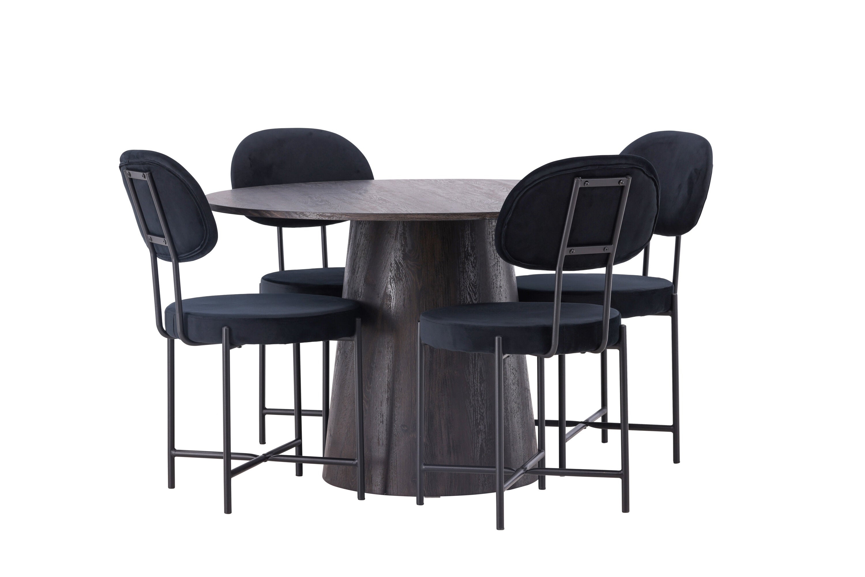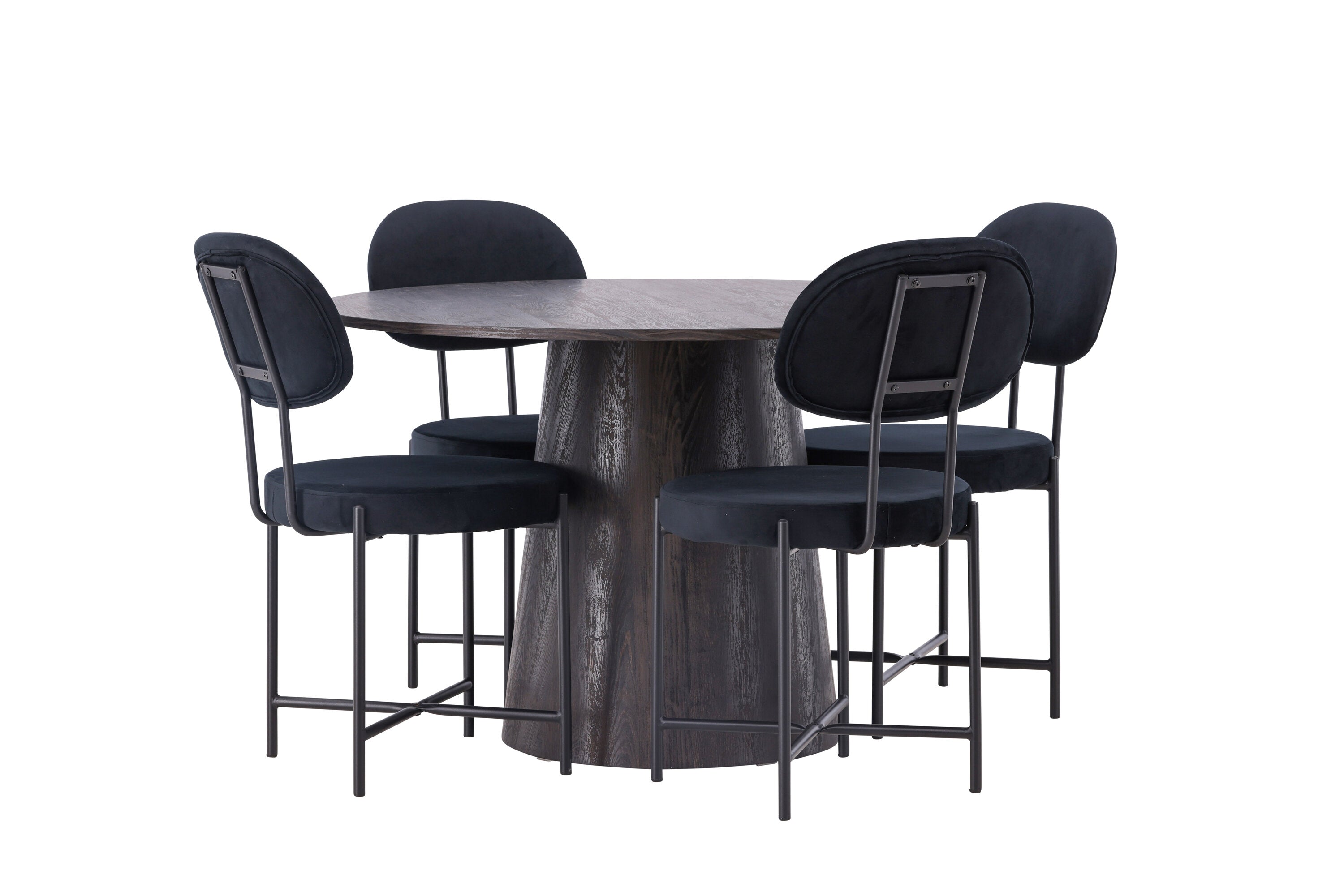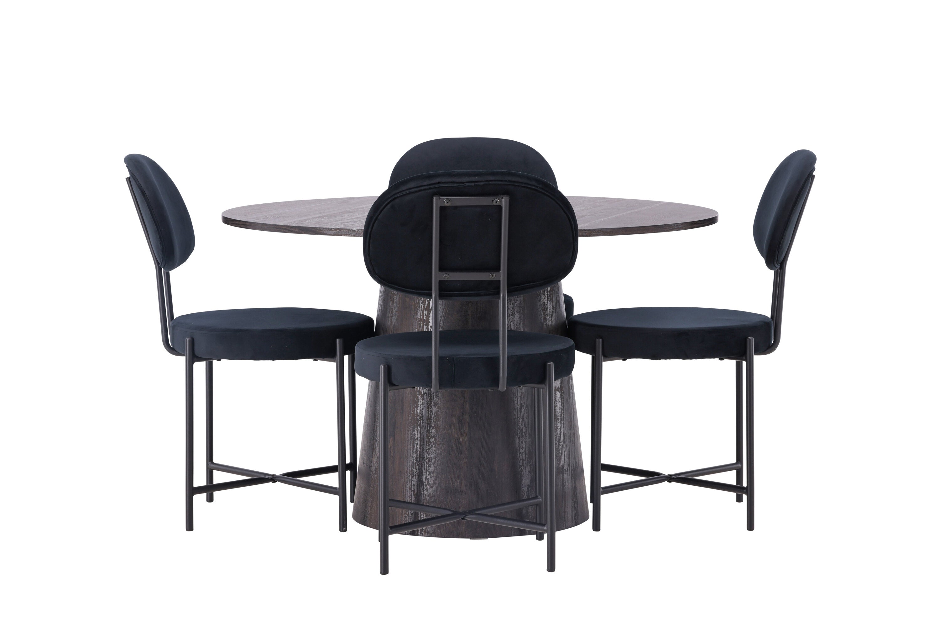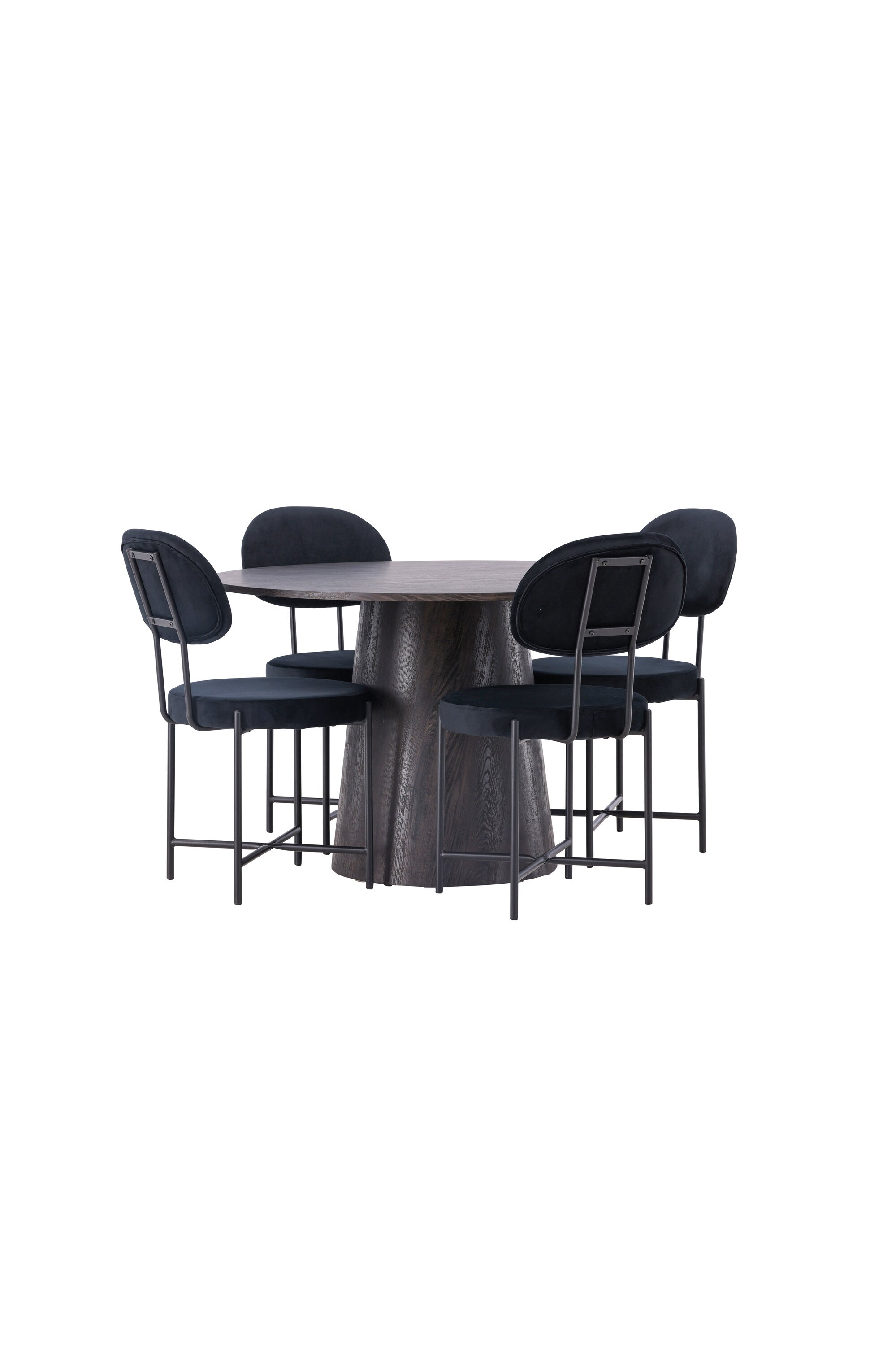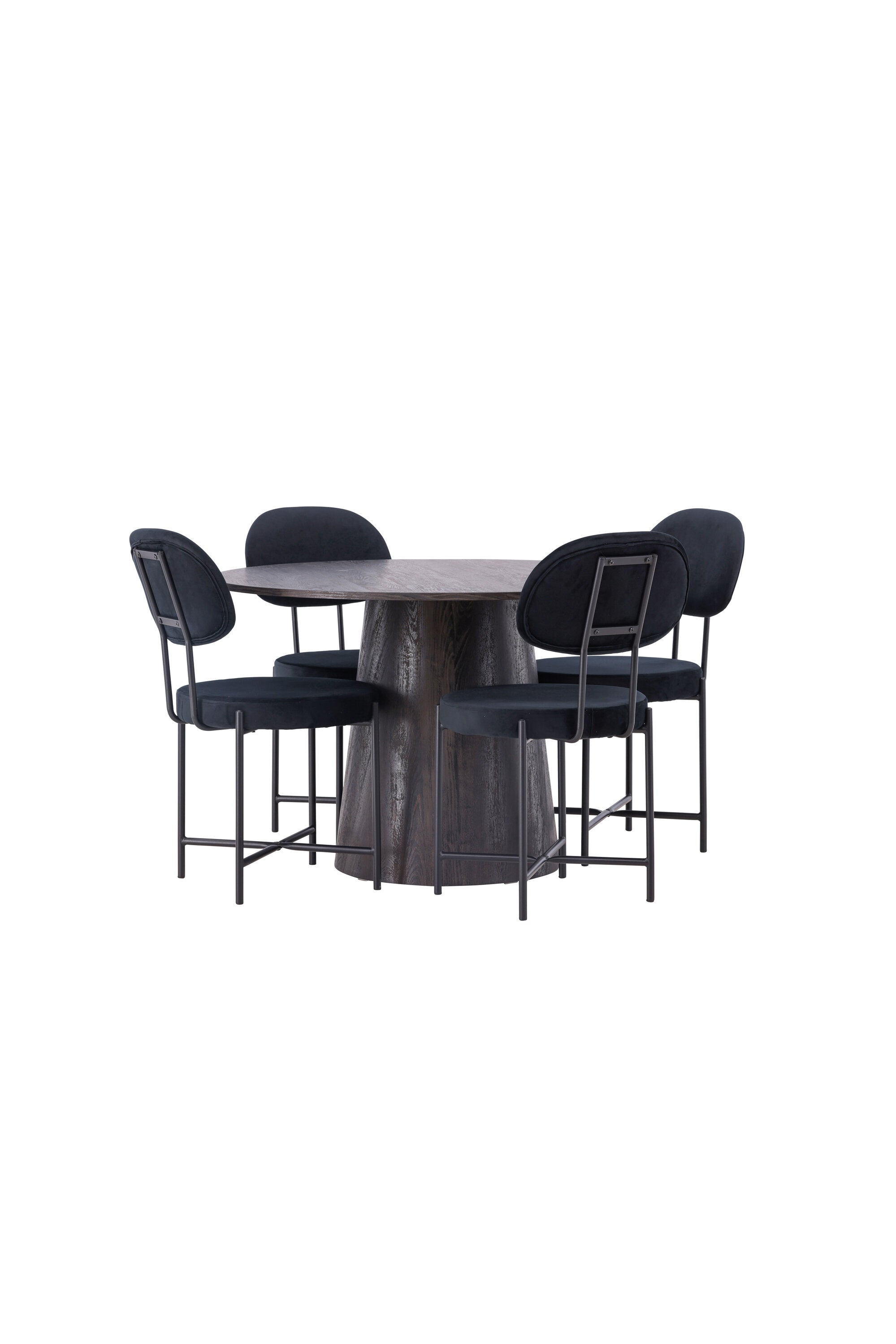 Kulaté tvary vytvářejí příjemnou atmosféru! Náš nádherný kulatý jídelní stůl Lanzo má celkový design z hnědé MDF s tenkou deskou a zkrouceným válcovým rámem, který je vycentrován pod středem stolu. zde s našimi luxusními jídelními židlemi ze série Stella. Židle má trendy skandinávský design s kulatým sedákem a opěradlem z černé sametové látky a minimalistickými nohami židle z černé oceli. Pohodlně se usaďte – tady nikdo neskončí na hraně! Průměr stolu: 120 cm.
