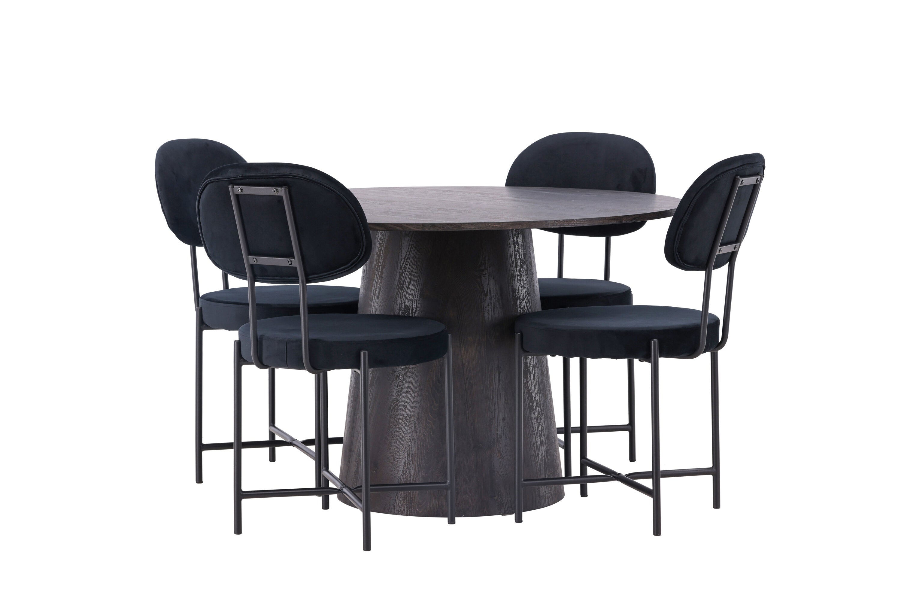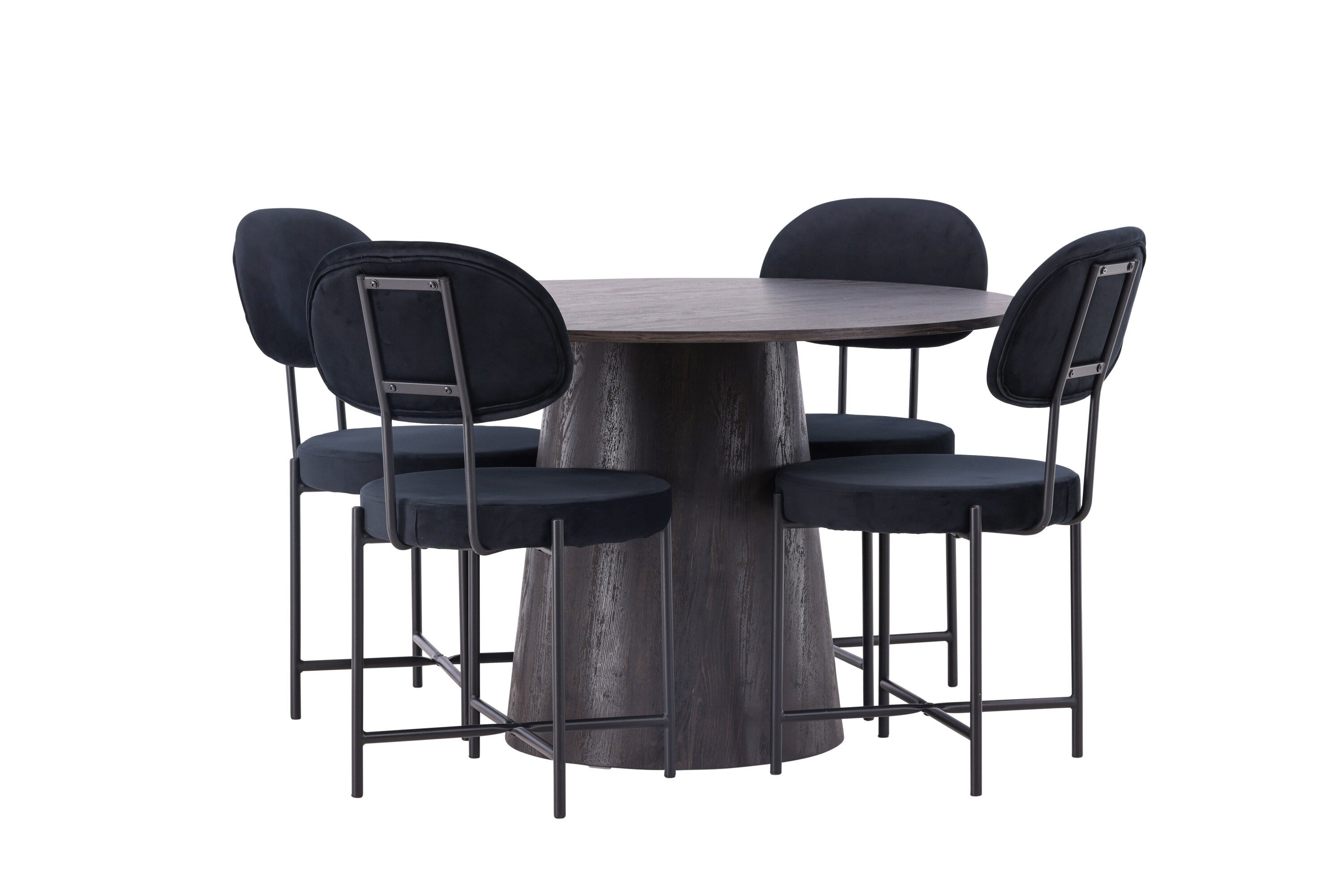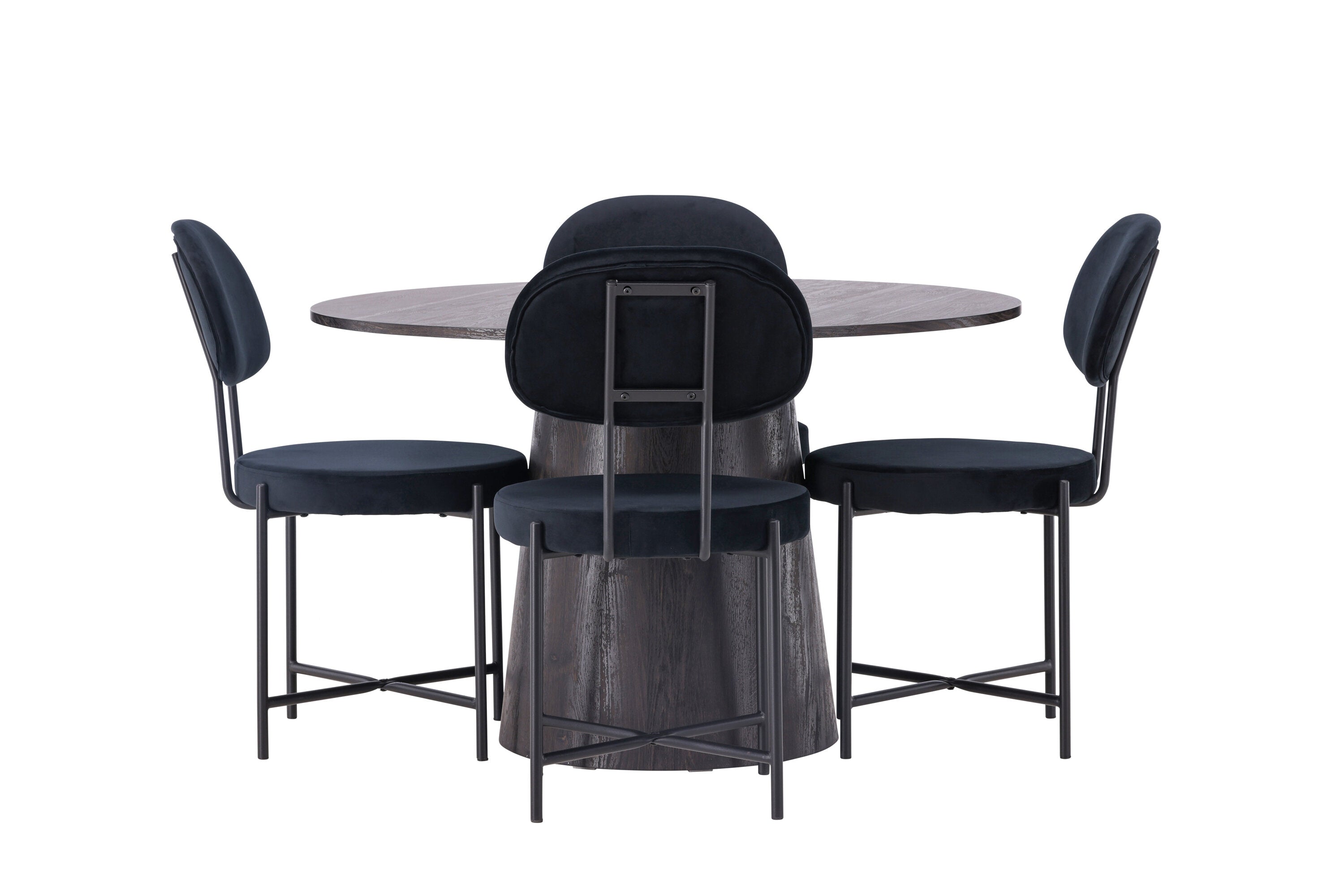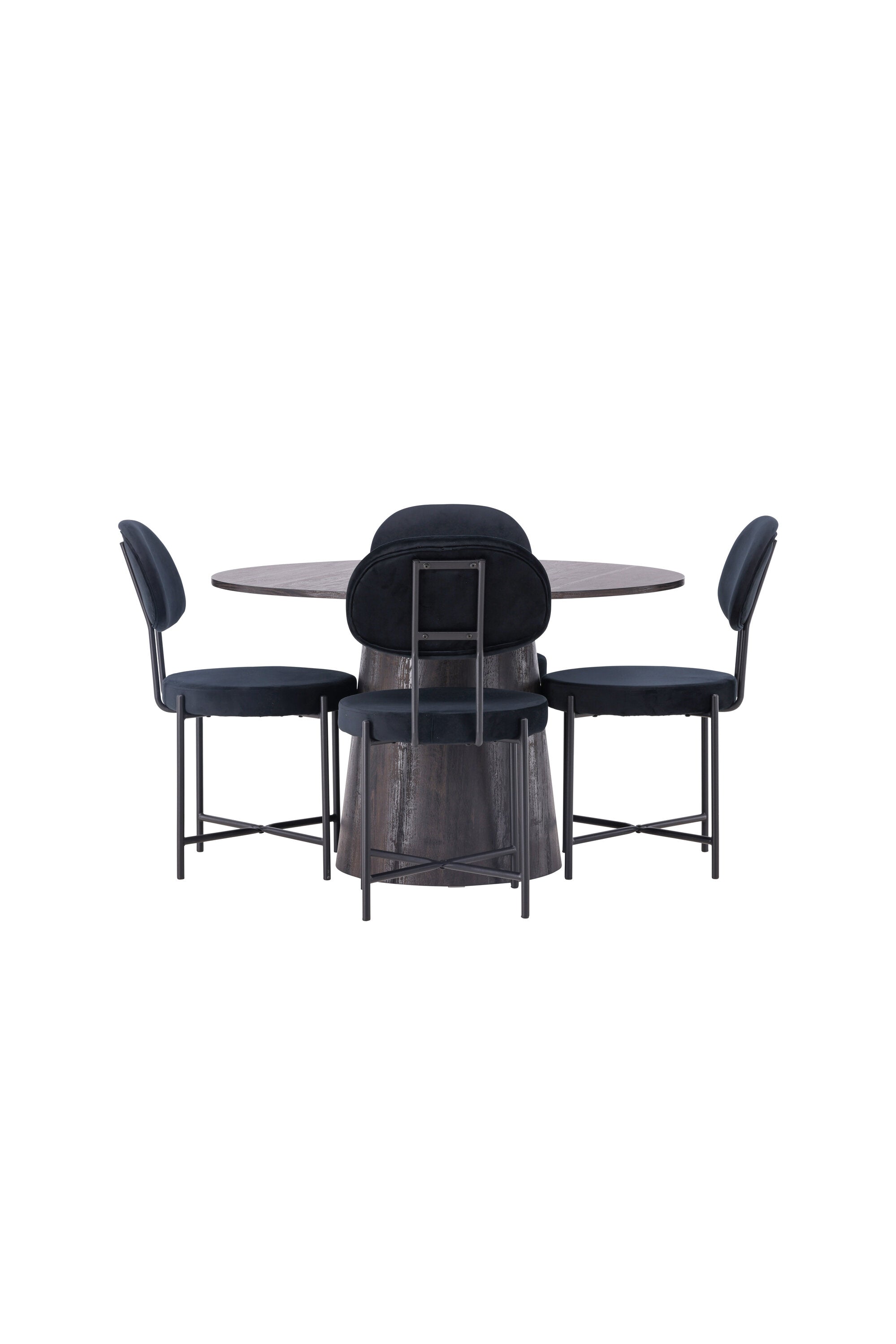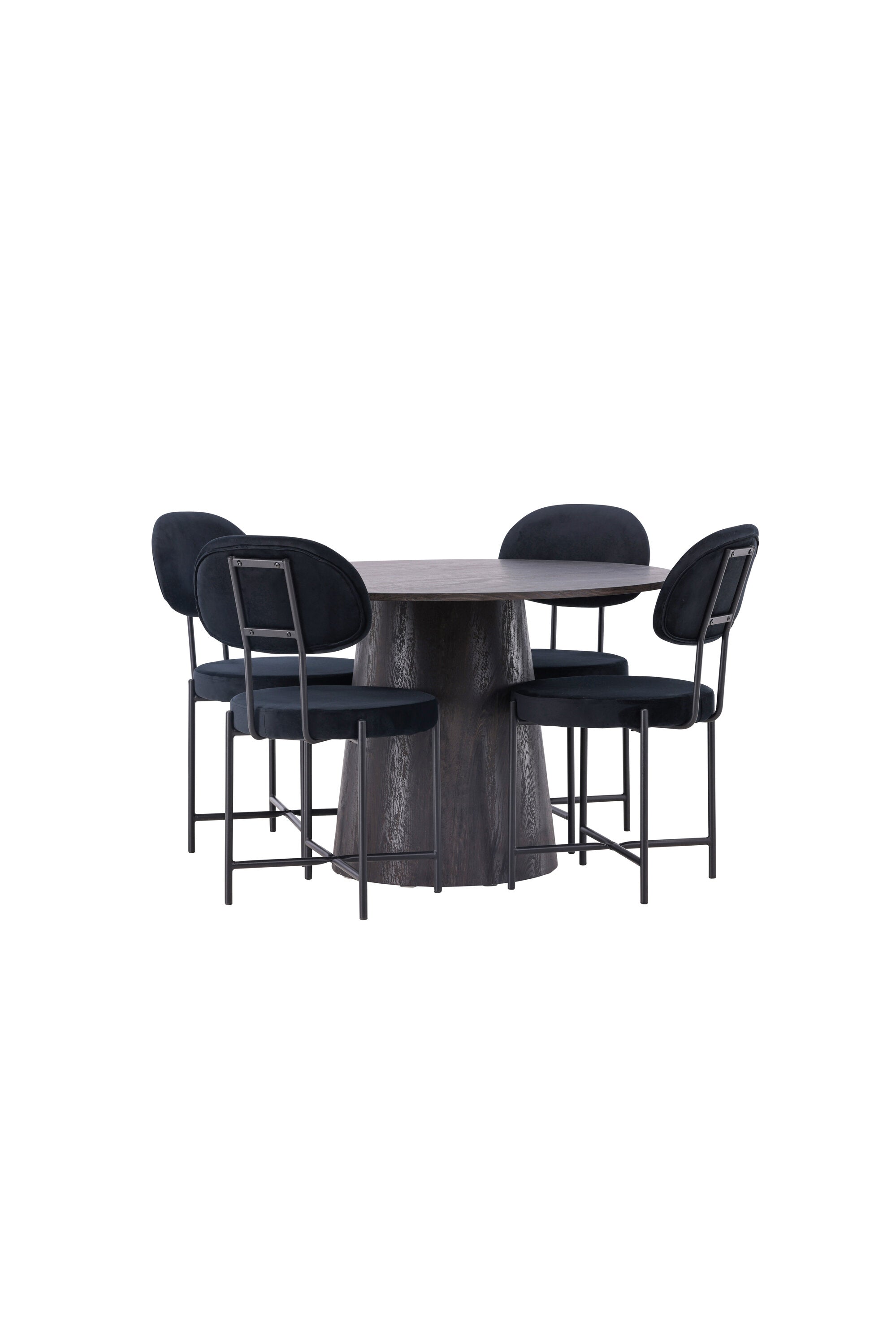 Kulaté tvary vytvářejí příjemnou atmosféru! Náš nádherný kulatý jídelní stůl Lanzo má celkový design z hnědé MDF s tenkou deskou a zkrouceným válcovým rámem, který je vycentrován pod středem stolu. zde s našimi luxusními jídelními židlemi ze série Stella. Židle má trendy skandinávský design s kulatým sedákem a opěradlem z černé sametové látky a minimalistickými nohami židle z černé oceli. Pohodlně se usaďte – tady nikdo neskončí na hraně! Průměr stolu: 120 cm.