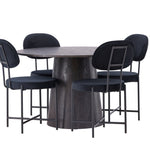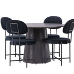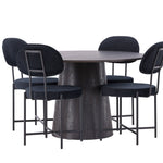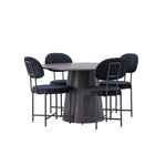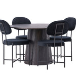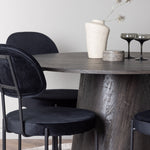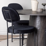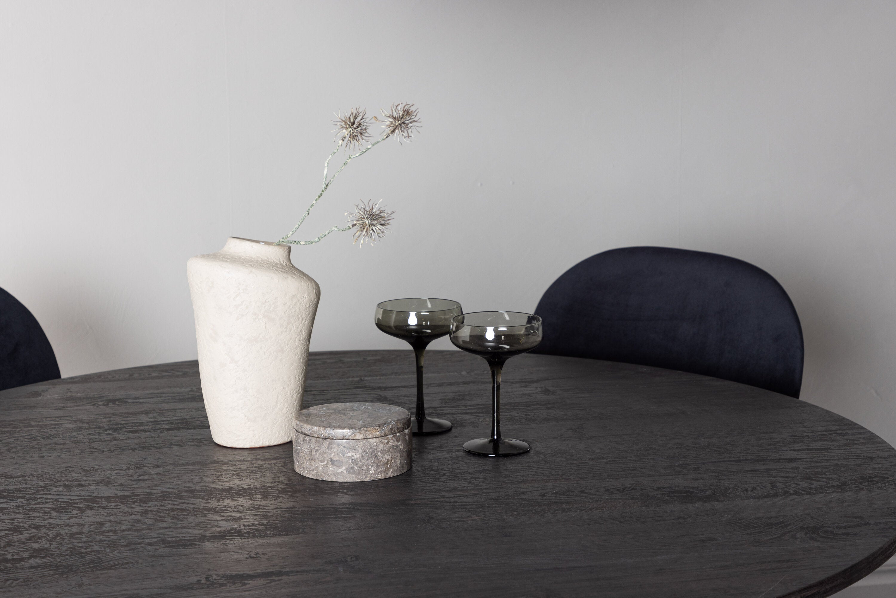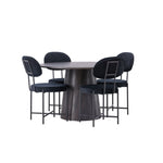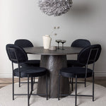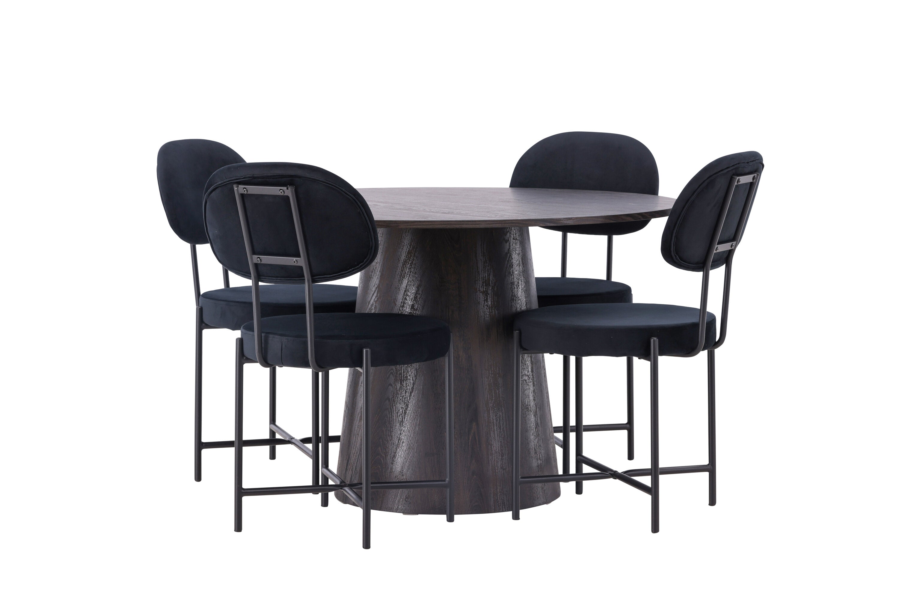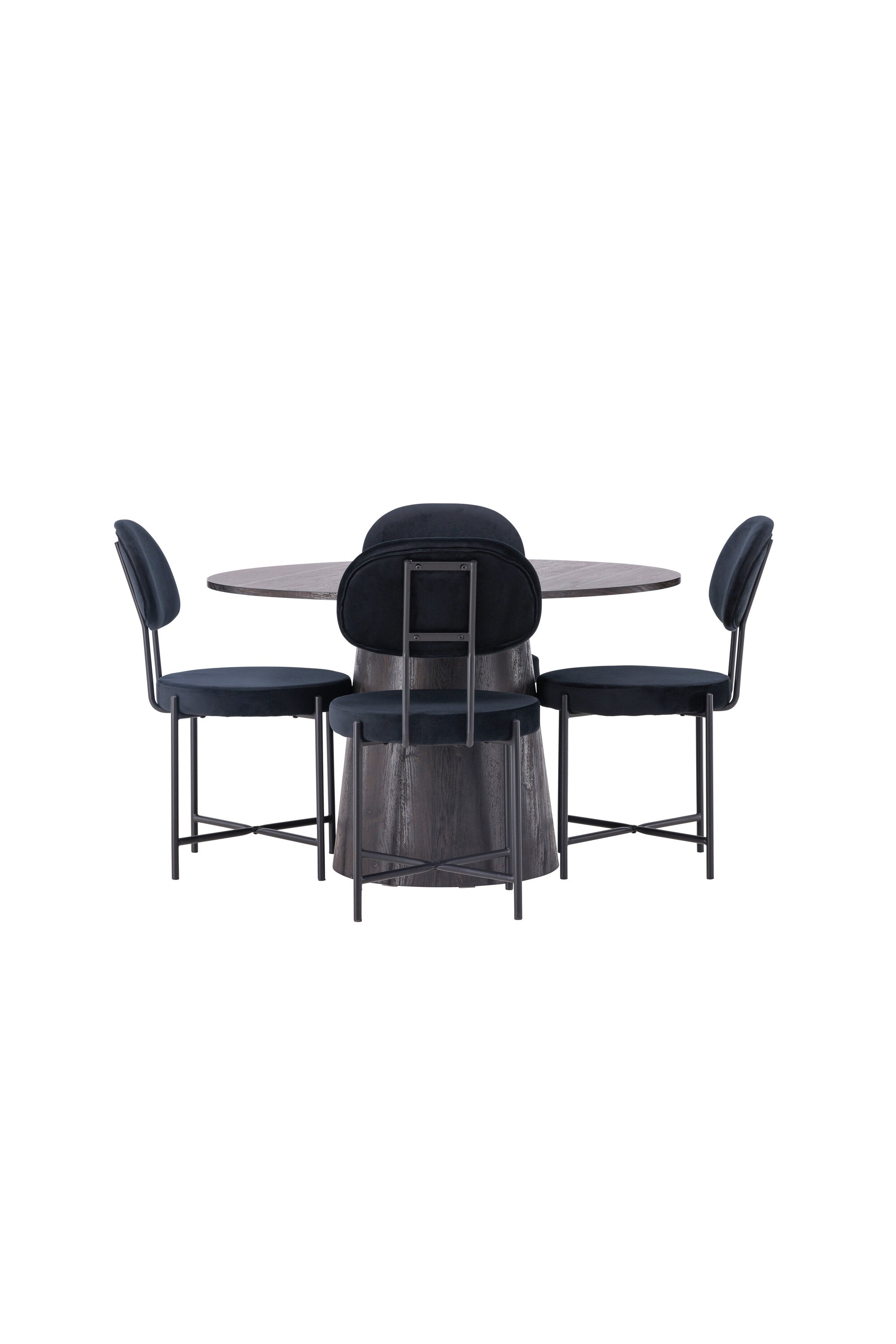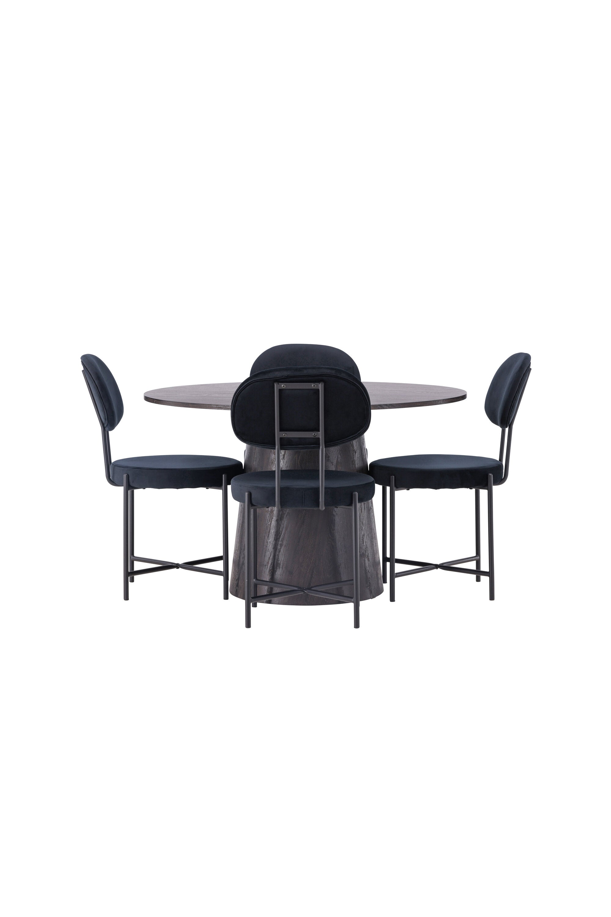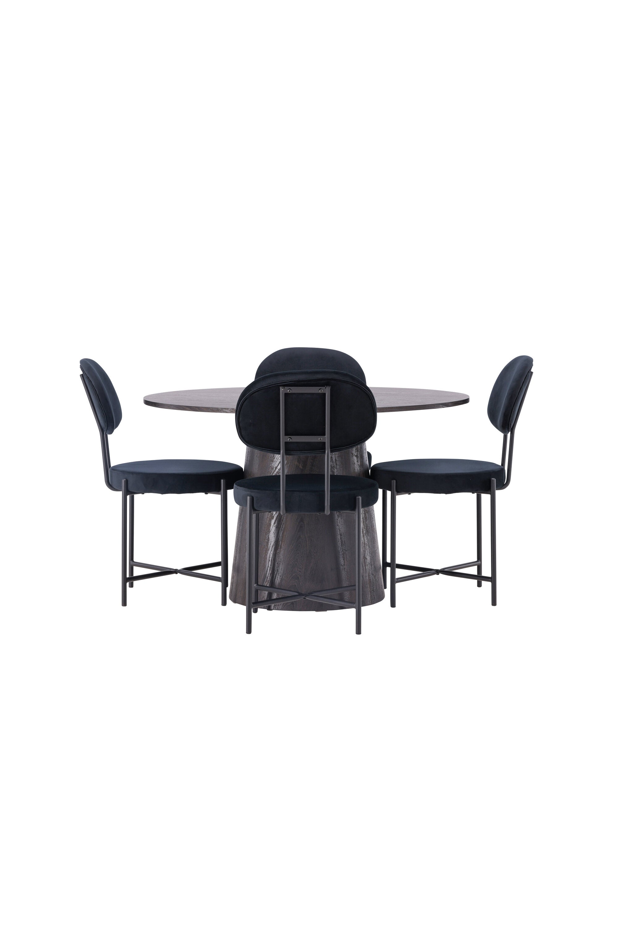 Kulaté tvary vytvářejí příjemnou atmosféru! Náš nádherný kulatý jídelní stůl Lanzo má celkový design z hnědé MDF s tenkou deskou a zkrouceným válcovým rámem, který je vycentrován pod středem stolu. zde s našimi luxusními jídelními židlemi ze série Stella. Židle má trendy skandinávský design s kulatým sedákem a opěradlem z černé sametové látky a minimalistickými nohami židle z černé oceli. Pohodlně se usaďte – tady nikdo neskončí na hraně! Průměr stolu: 120 cm.