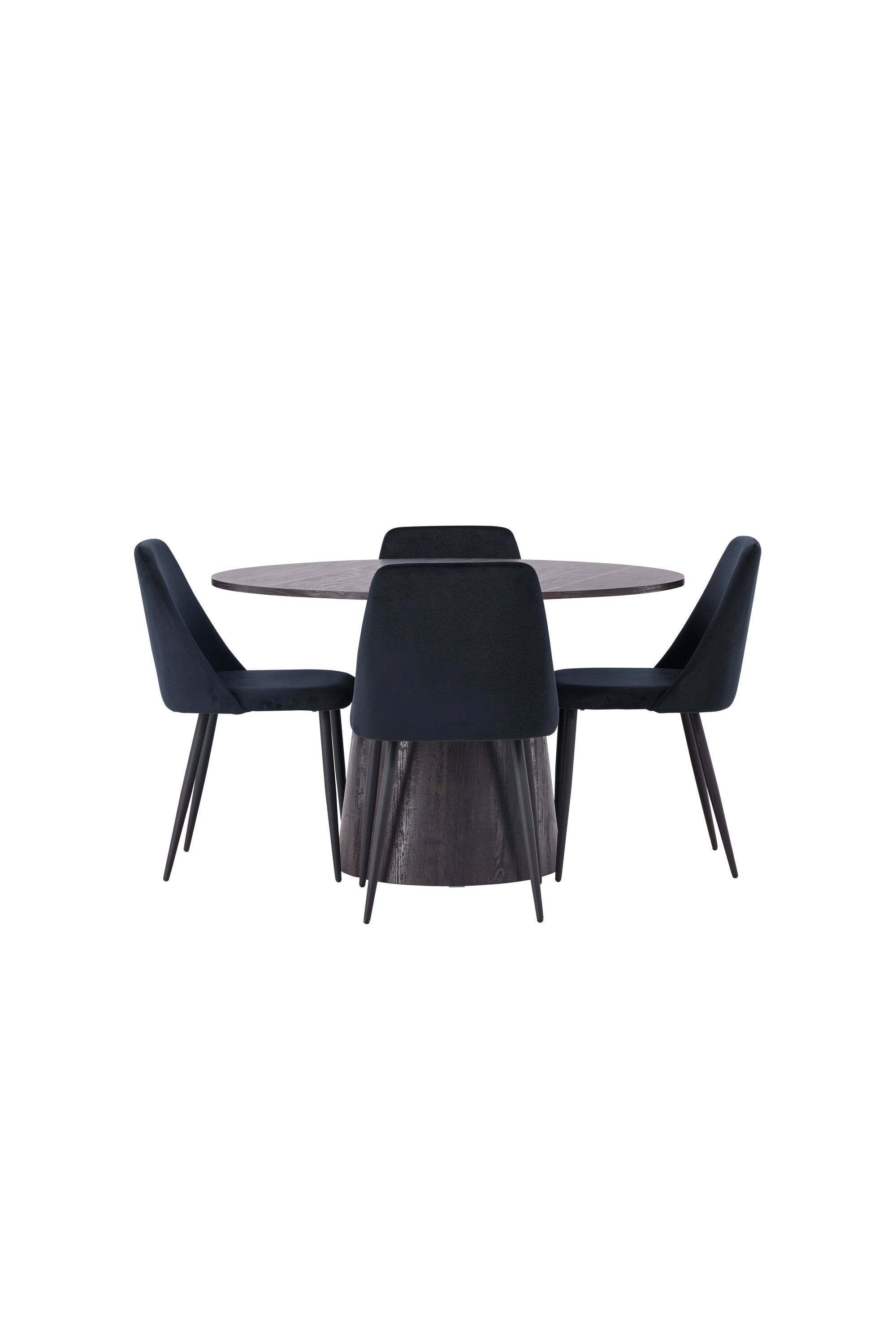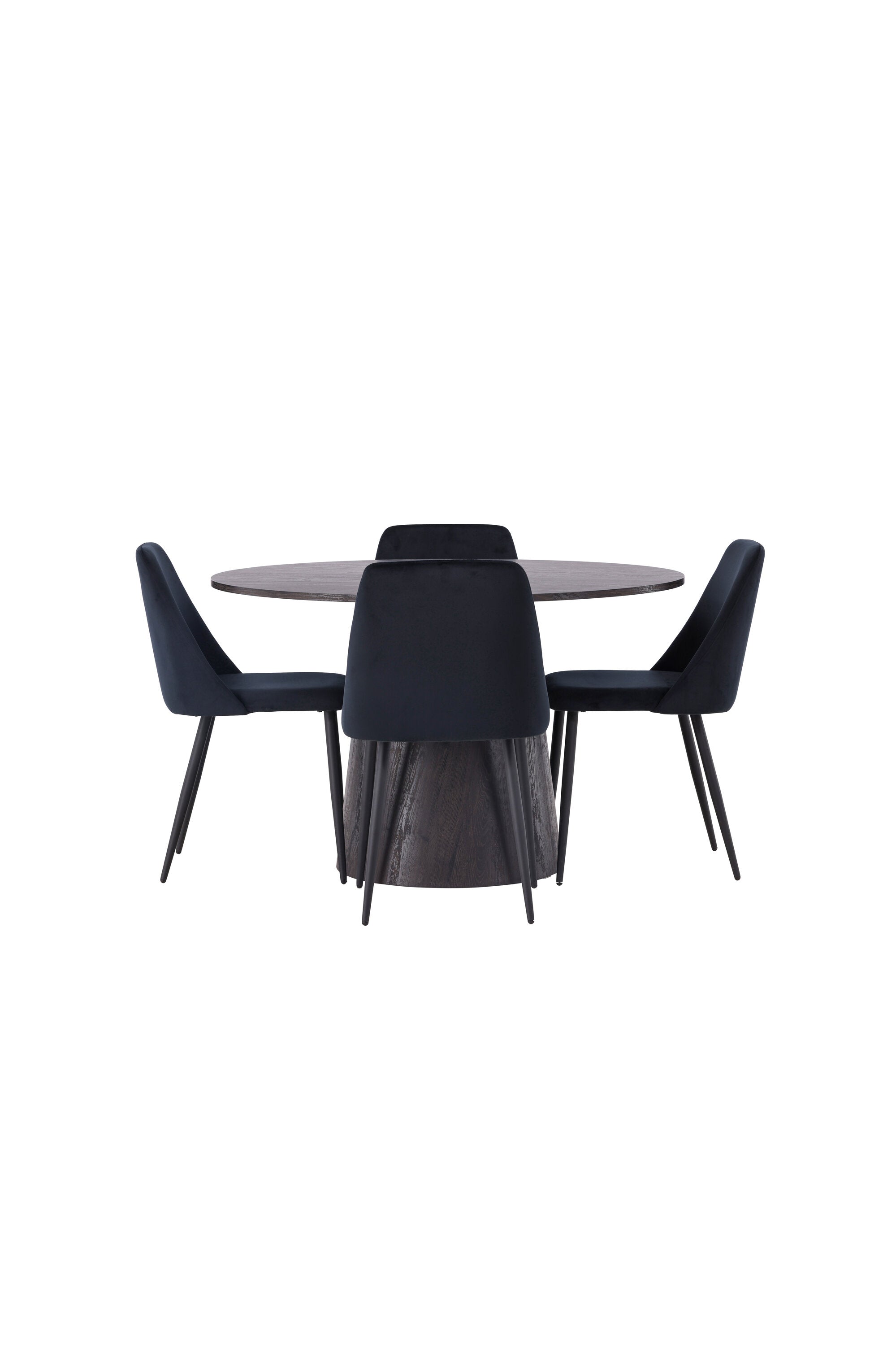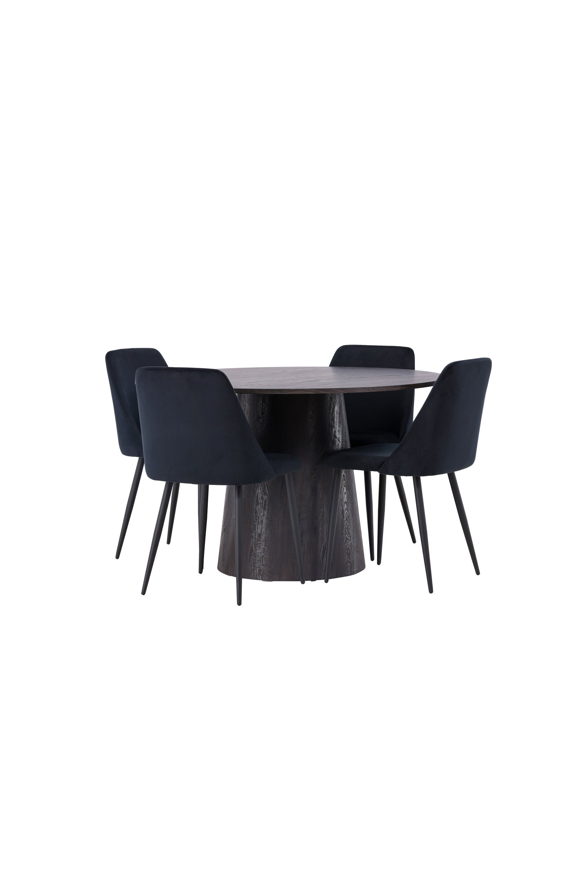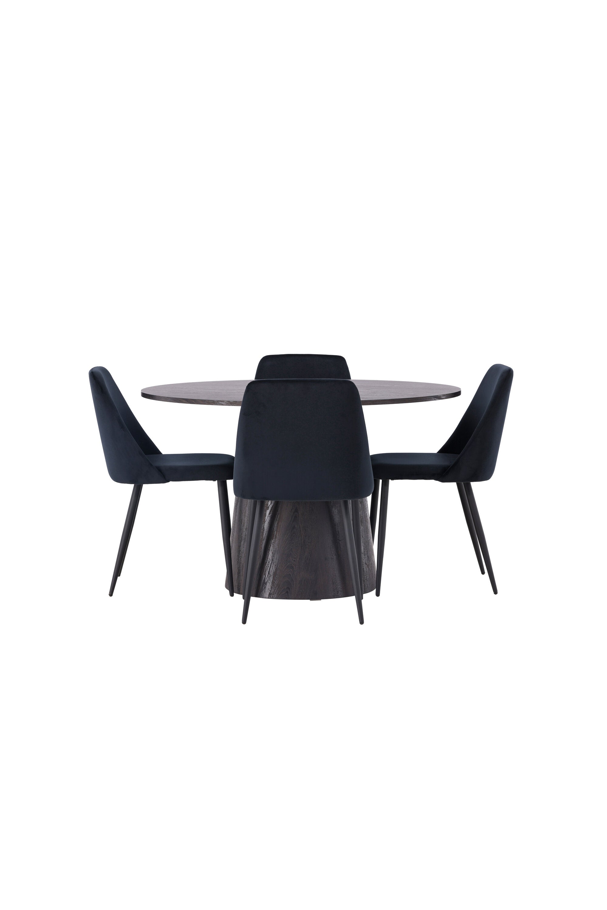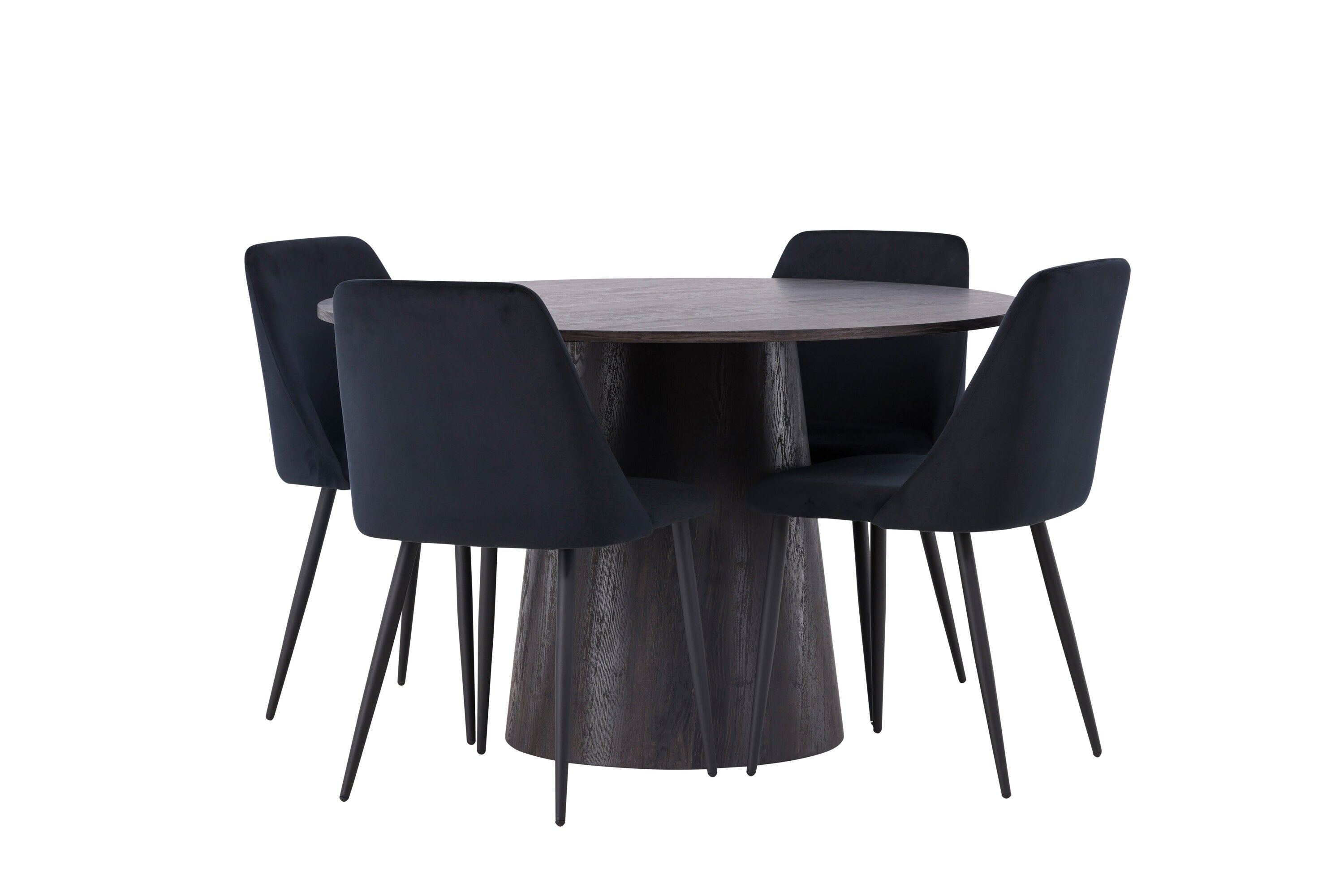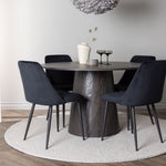 Vytvořte příjemnou atmosféru! Náš nádherný kulatý jídelní stůl Lanzo má celkový design z hnědé MDF s tenkou deskou a zkrouceným válcovým rámem, který je vycentrován pod středem stolu. Zde v dokonalé kombinaci s černými jídelními židlemi ze série Night. Židle má celočalouněný sedák v černé sametové látce a nohy v odpovídající černé barvě. Tady se sedí pohodlně jako moderní! Průměr stolu: 120 cm.