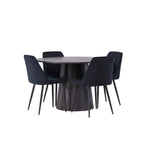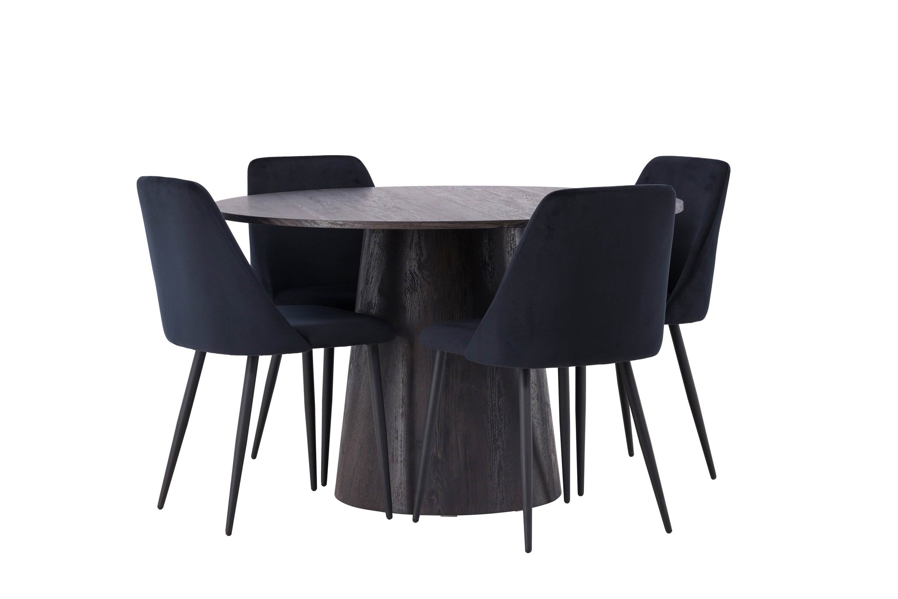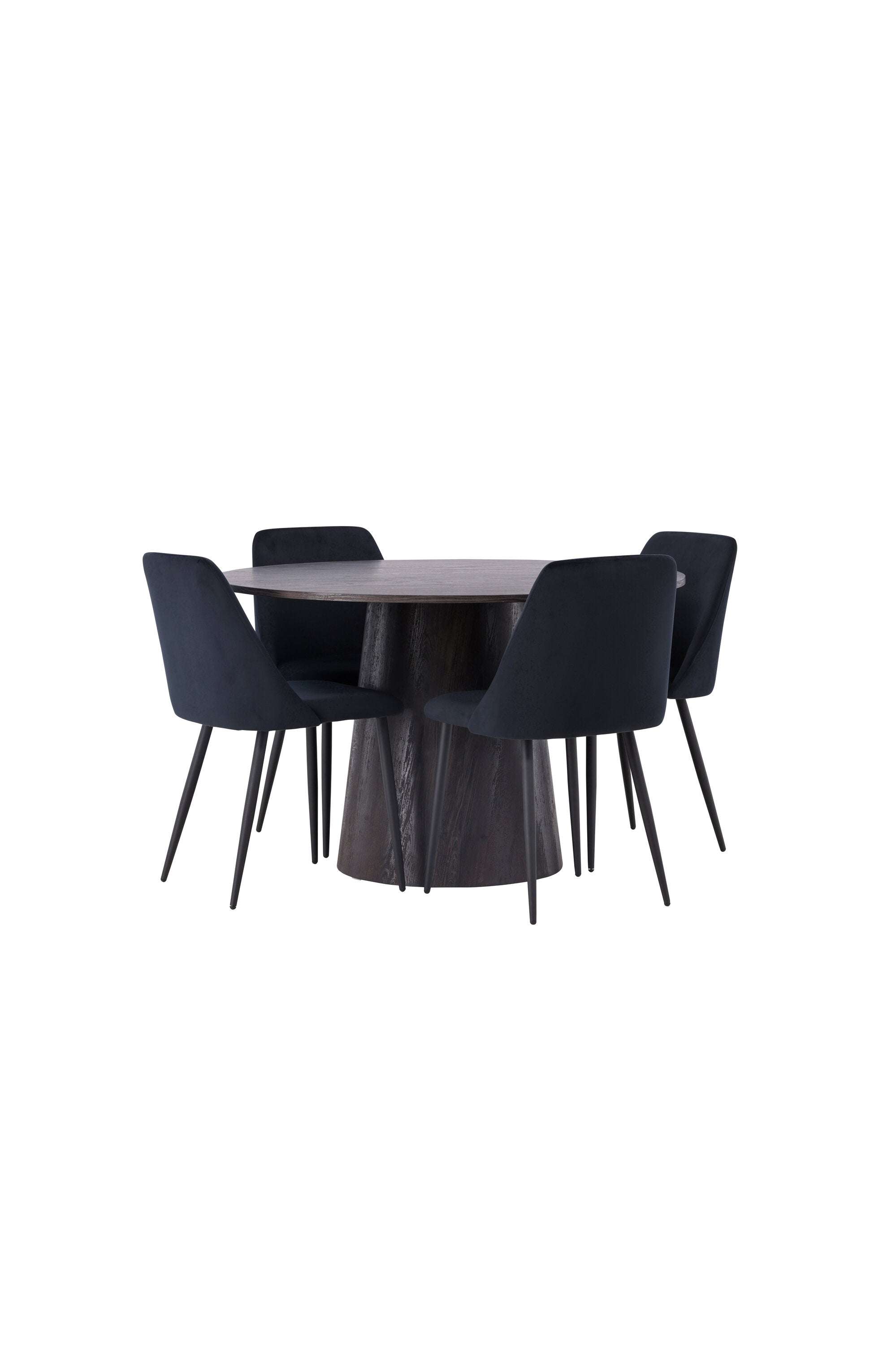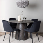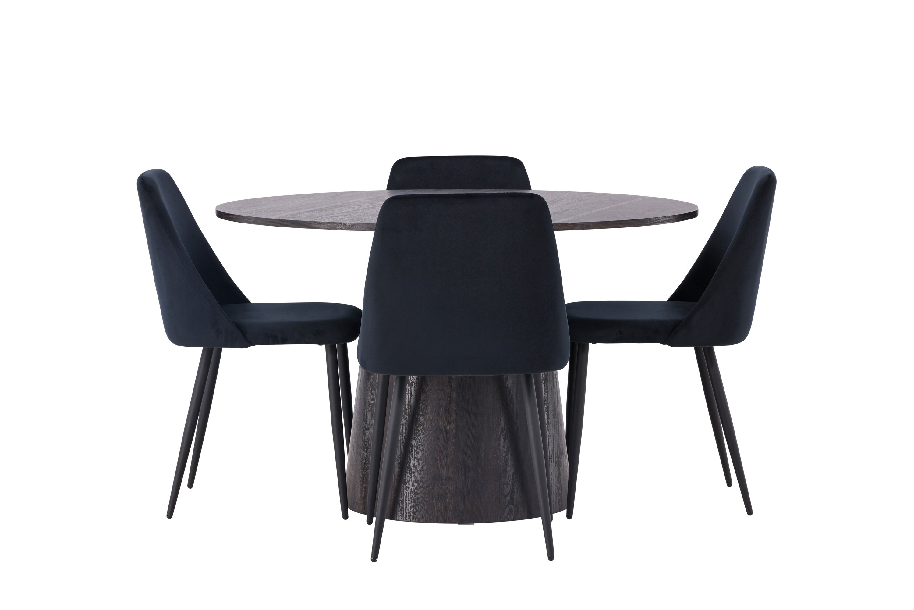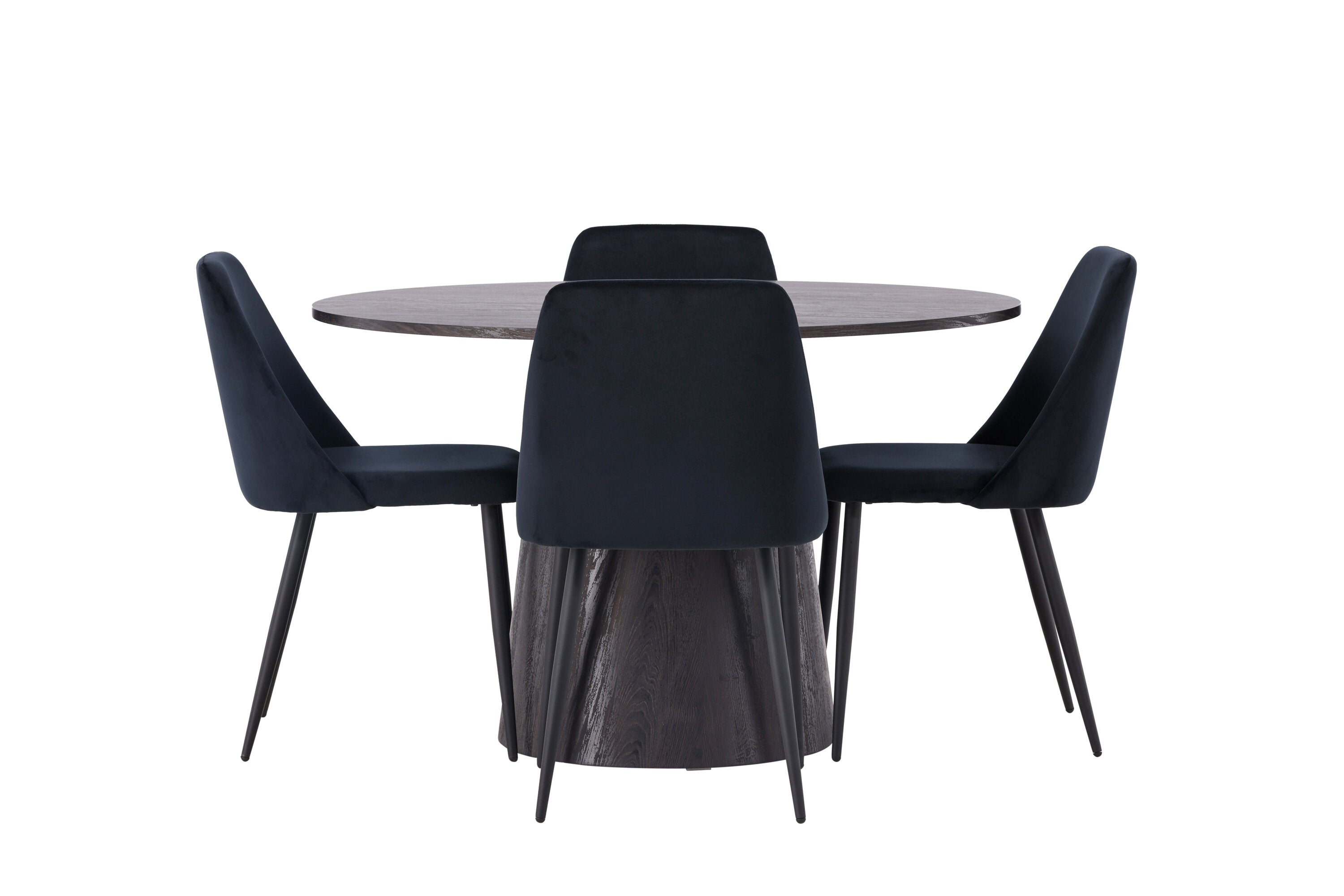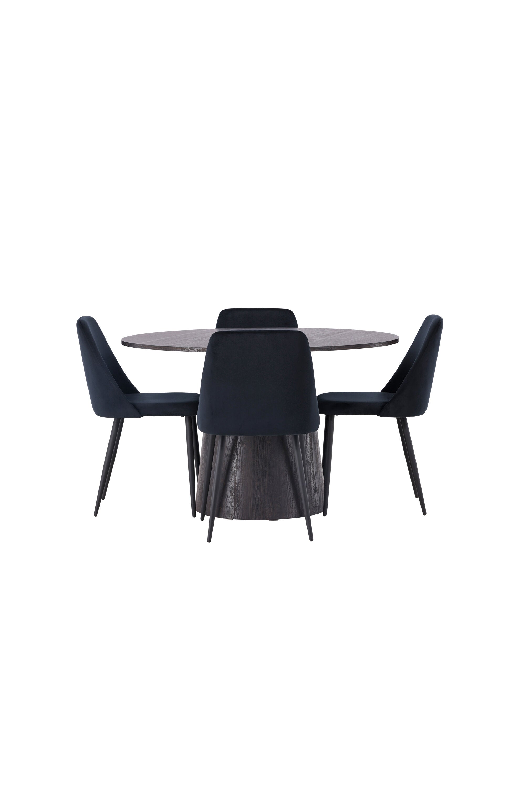 Vytvořte příjemnou atmosféru! Náš nádherný kulatý jídelní stůl Lanzo má celkový design z hnědé MDF s tenkou deskou a zkrouceným válcovým rámem, který je vycentrován pod středem stolu. Zde v dokonalé kombinaci s černými jídelními židlemi ze série Night. Židle má celočalouněný sedák v černé sametové látce a nohy v odpovídající černé barvě. Tady se sedí pohodlně jako moderní! Průměr stolu: 120 cm.