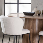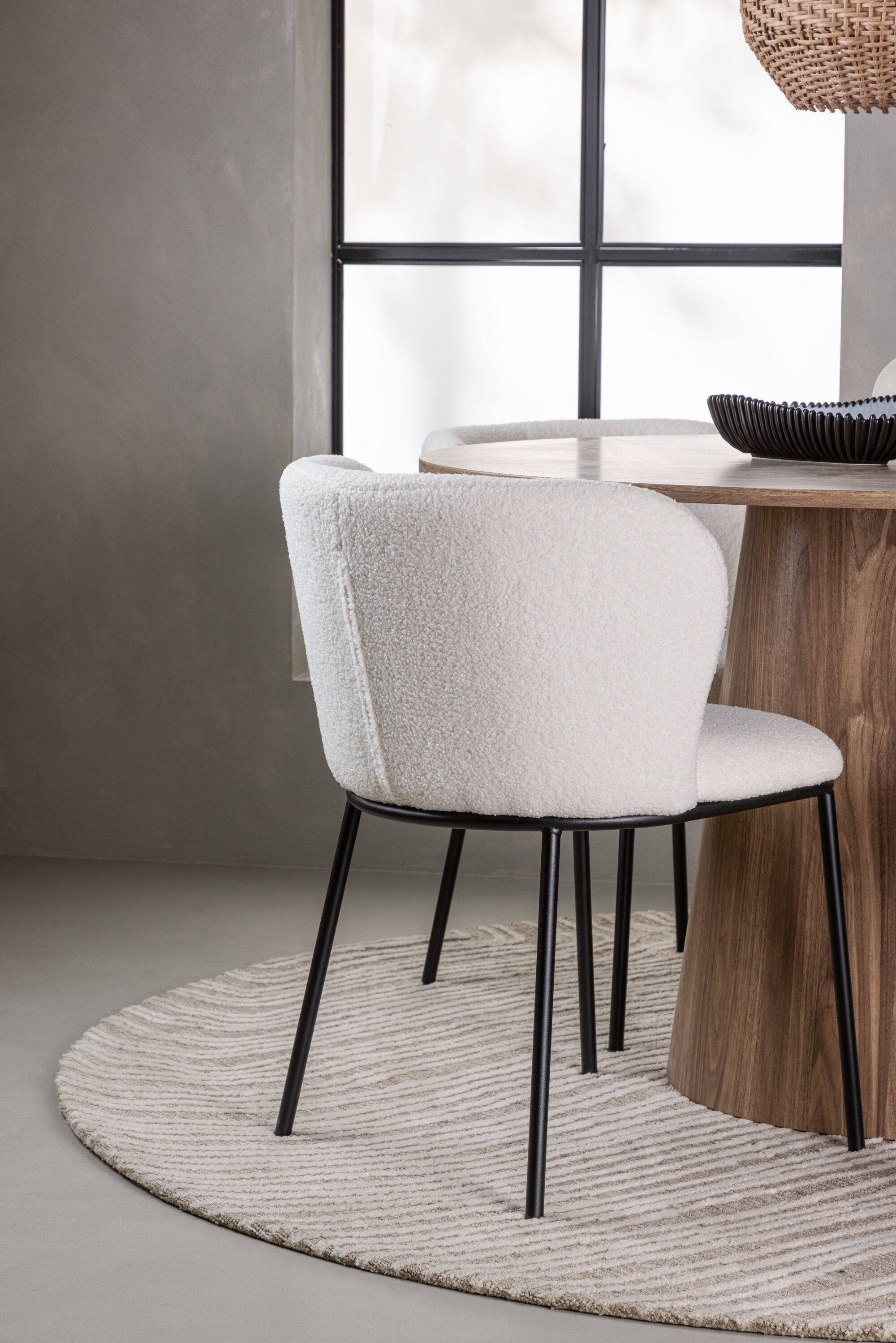 Zde jsme jídelní stůl spárovali s našimi bílými látkovými jídelními židlemi boucle ze série Edina. Edina skutečně zachycuje nejnovější trendy. S flexibilním a plně čalouněným sedákem v bílé buklé tkanině a minimalistickými černými kovovými nohami židle kombinuje tato jídelní židle elegantní design s úžasným pohodlím.