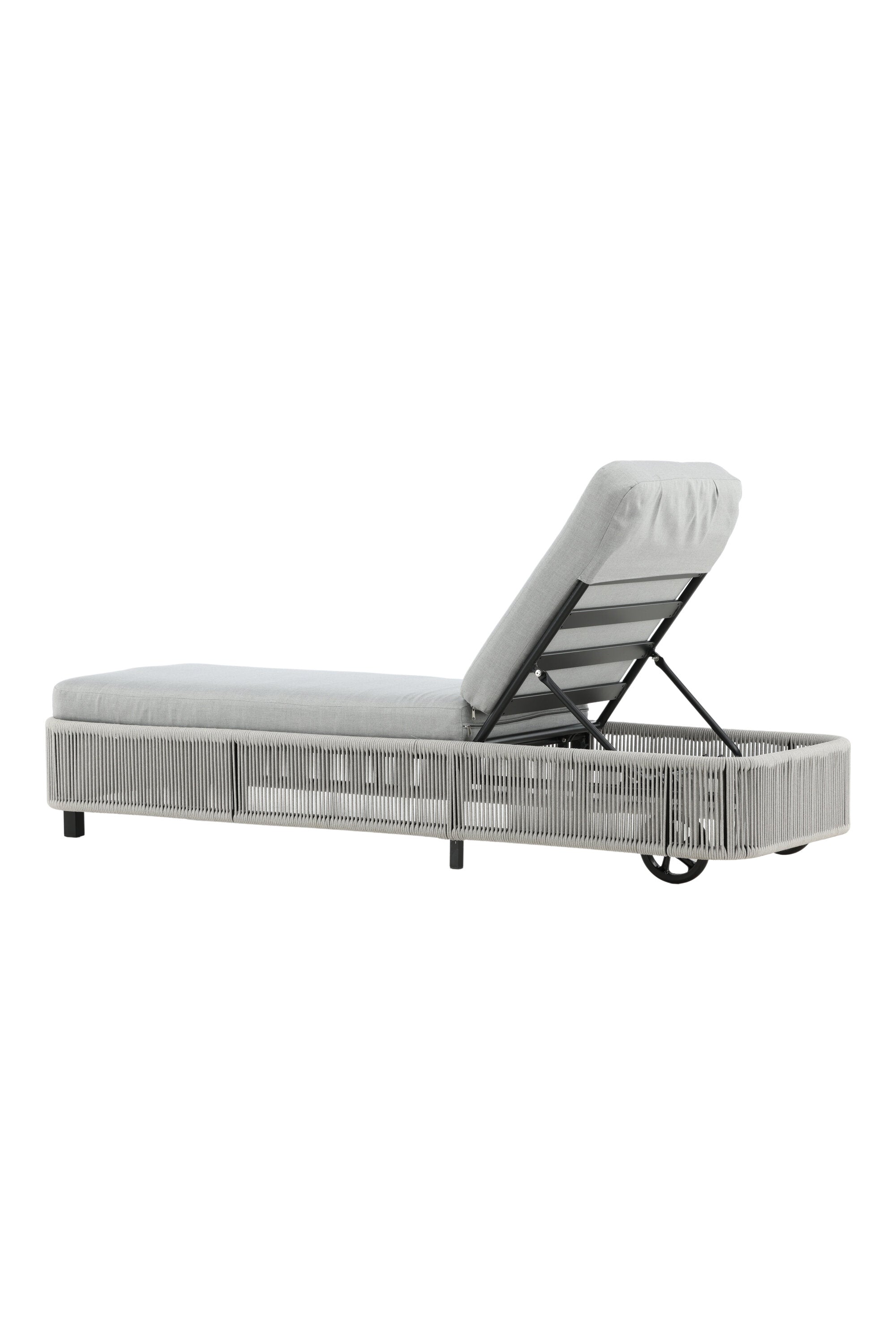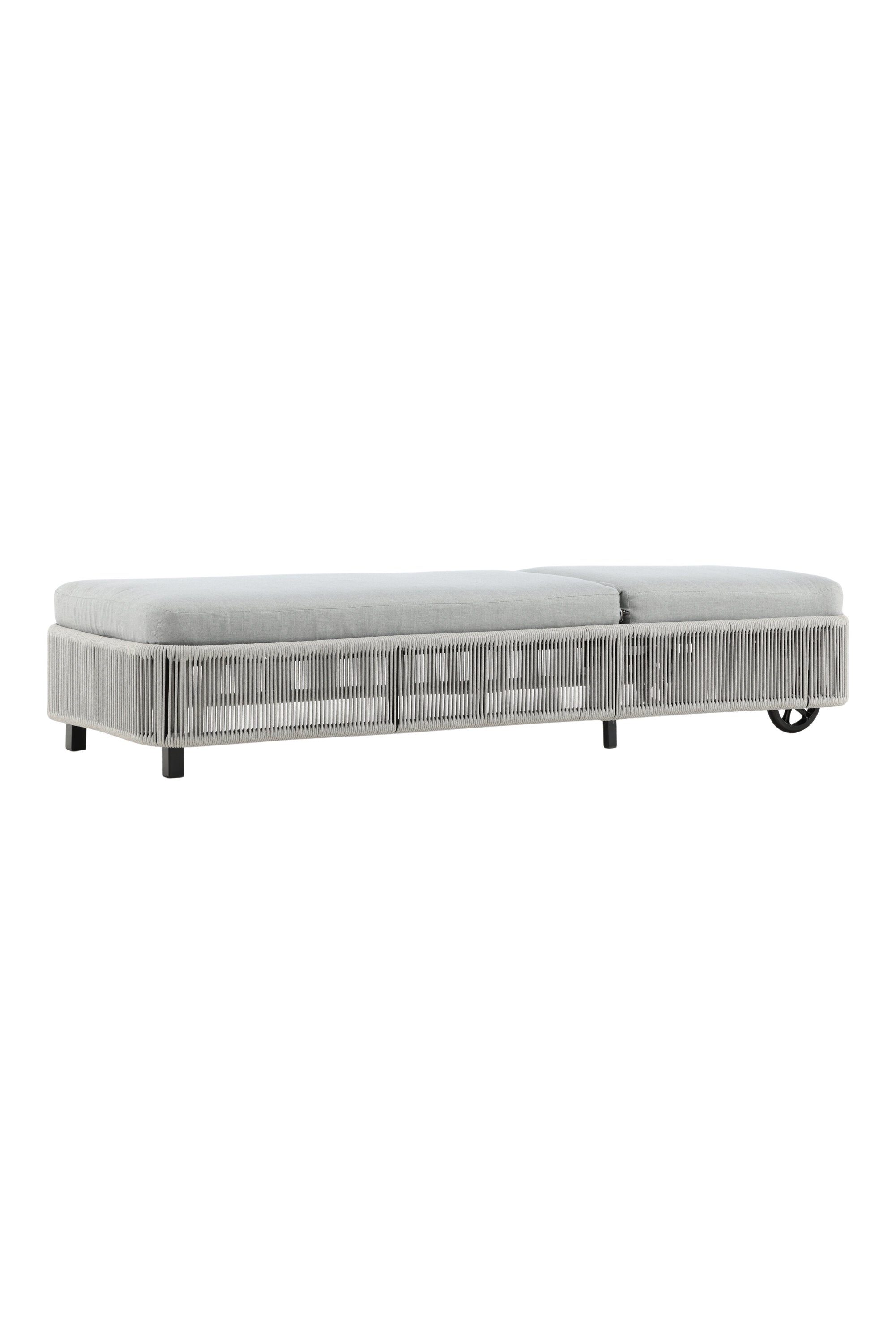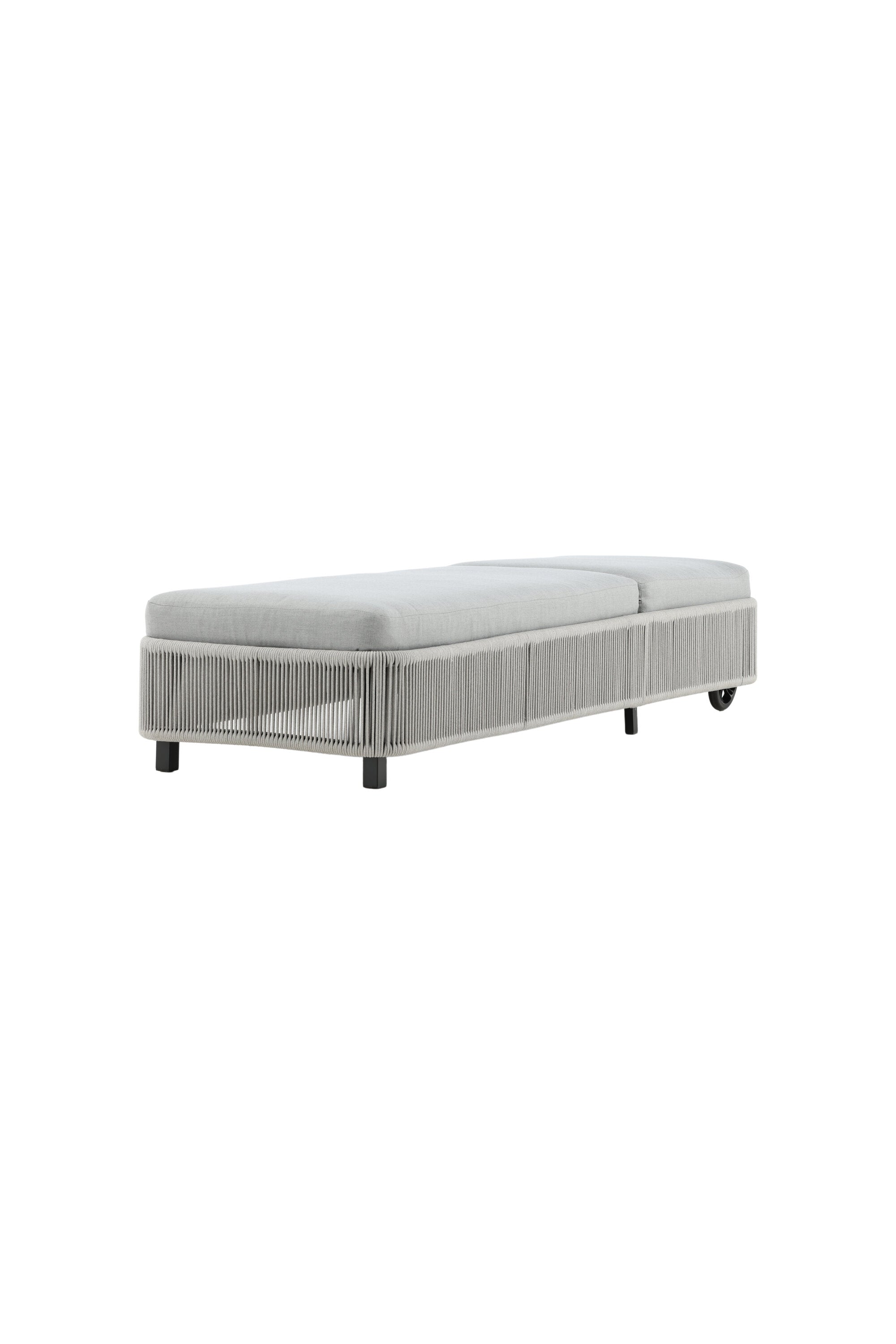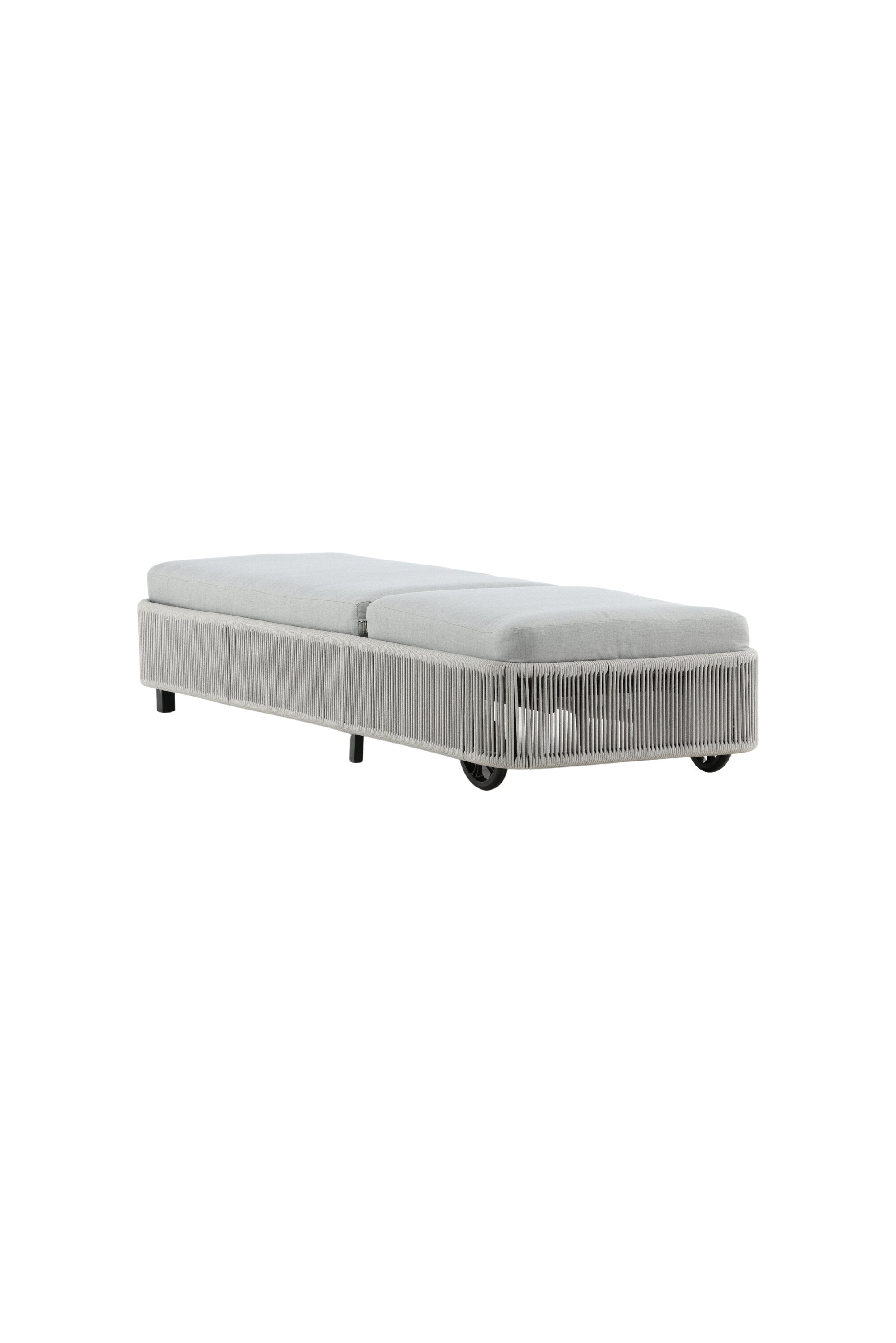 Klasické solárium vyrobené z šedých lan s přidruženými polštáři. Umístěte přesně tam, kde chcete být snadno přemístěni pomocí kolečka. Užijte si zde horký letní den na slunci!