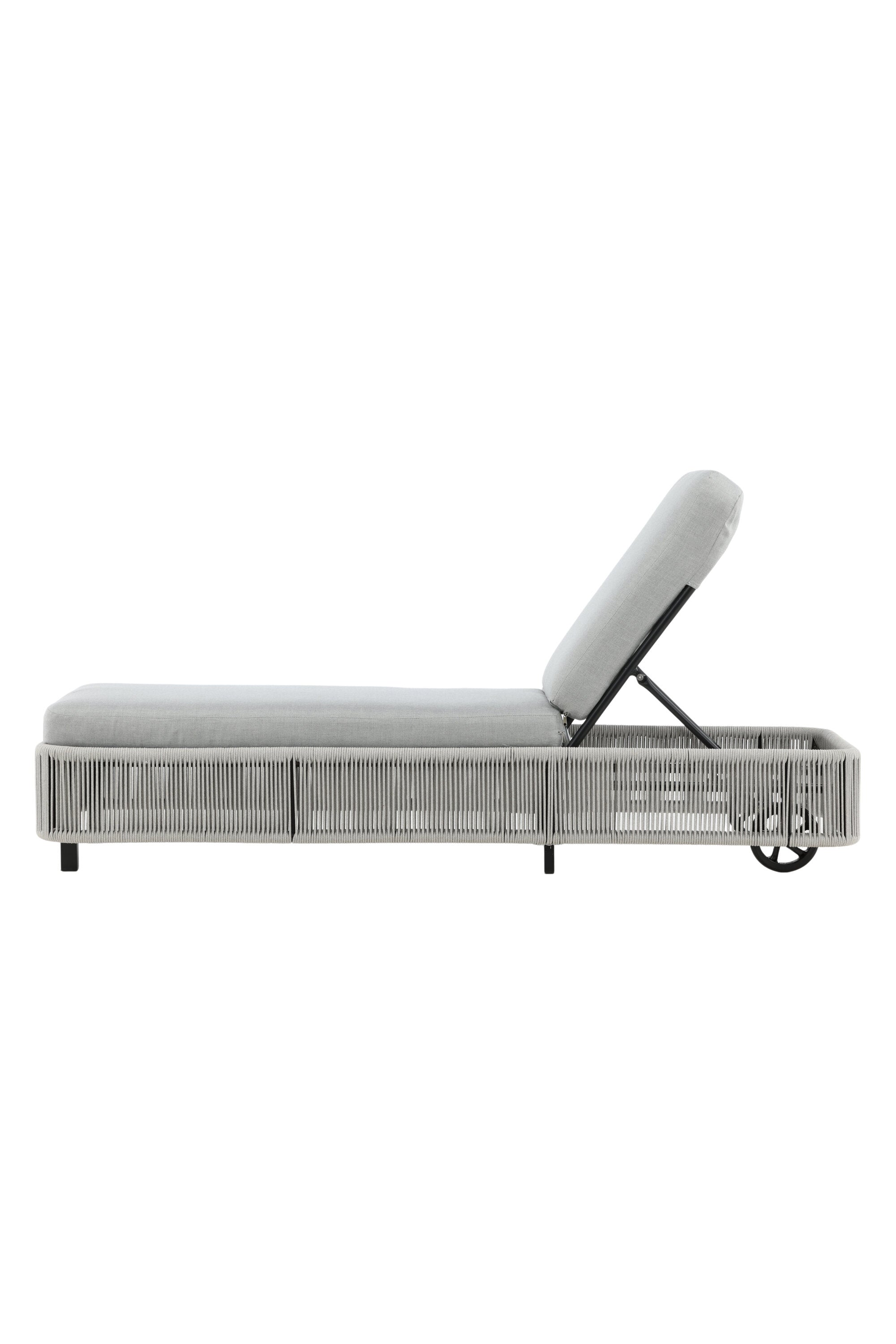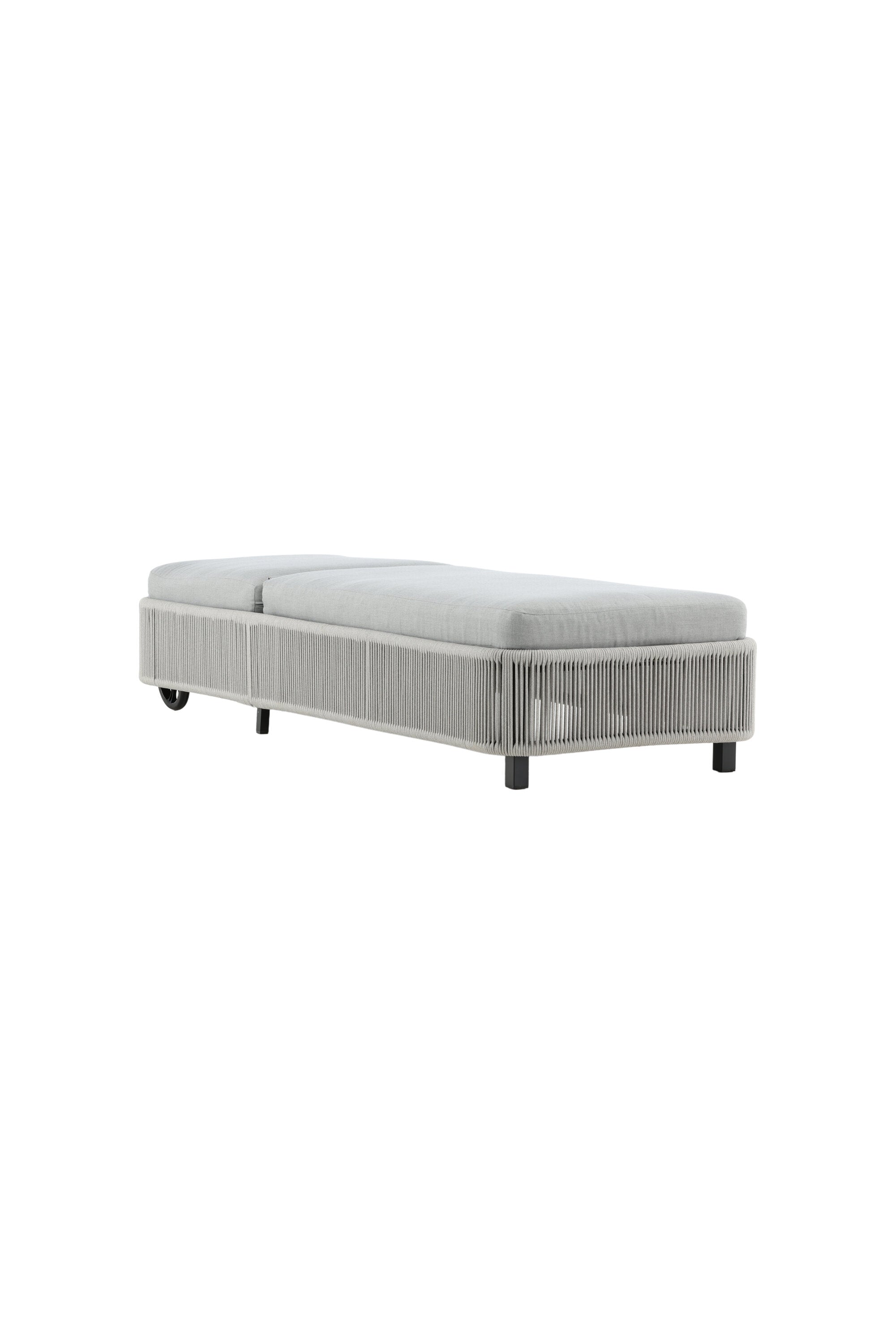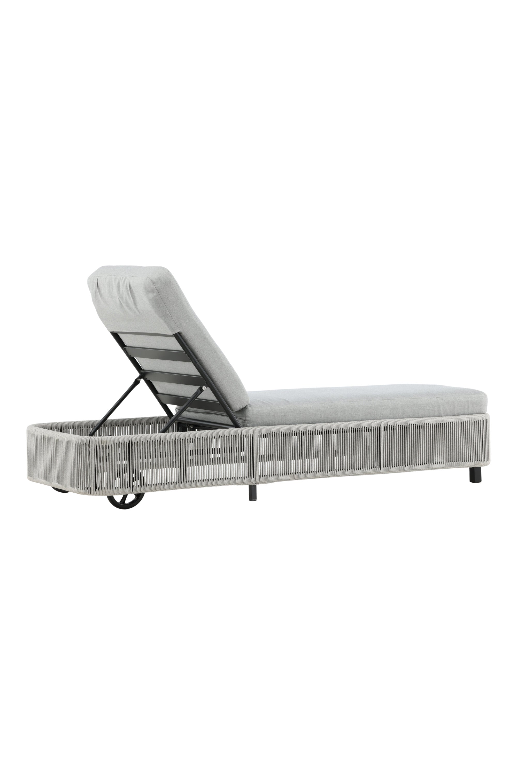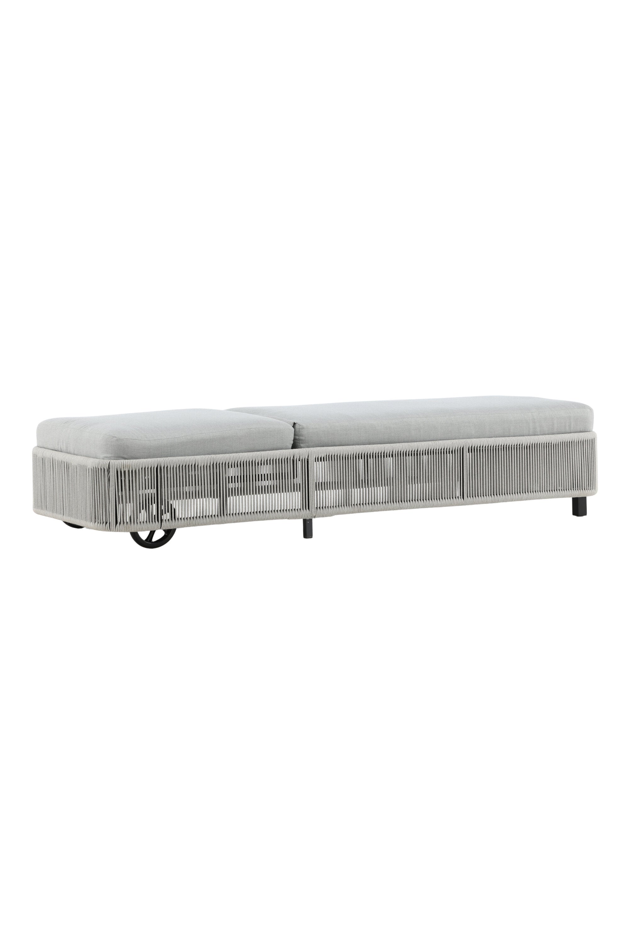 Klasické solárium vyrobené z šedých lan s přidruženými polštáři. Umístěte přesně tam, kde chcete být snadno přemístěni pomocí kolečka. Užijte si zde horký letní den na slunci!