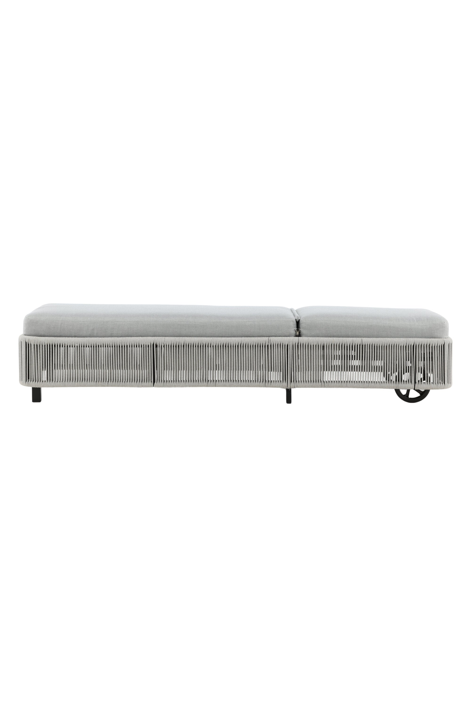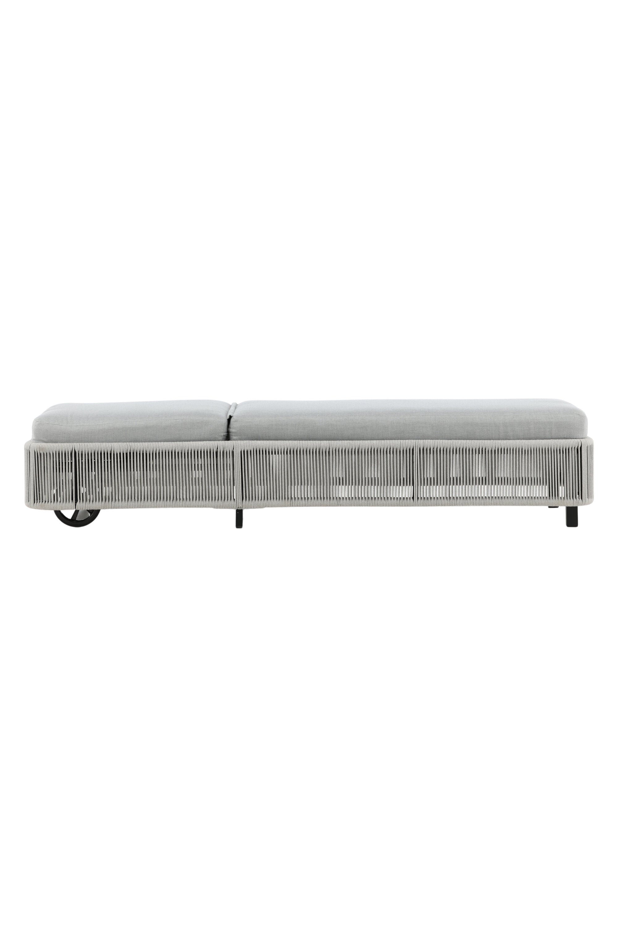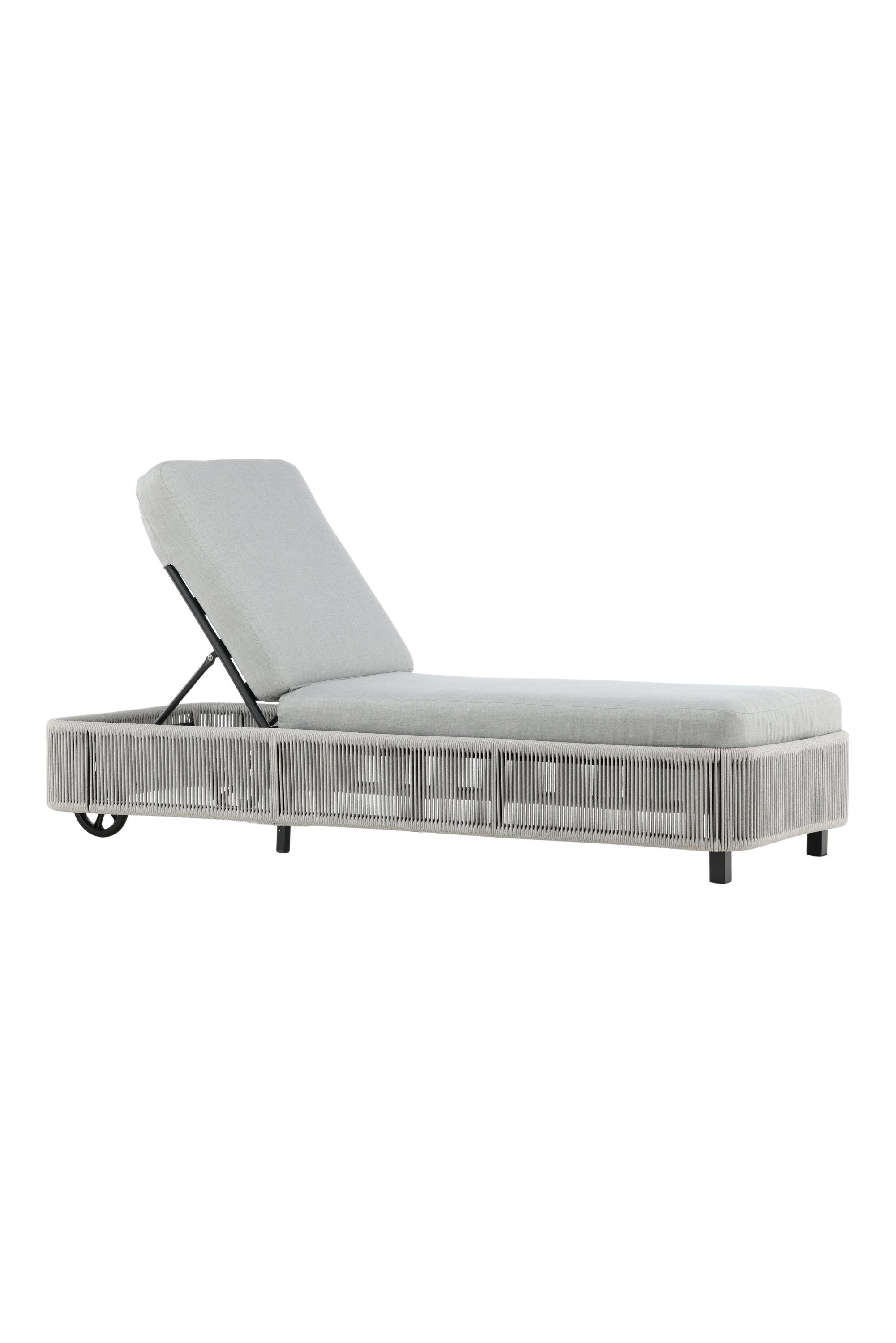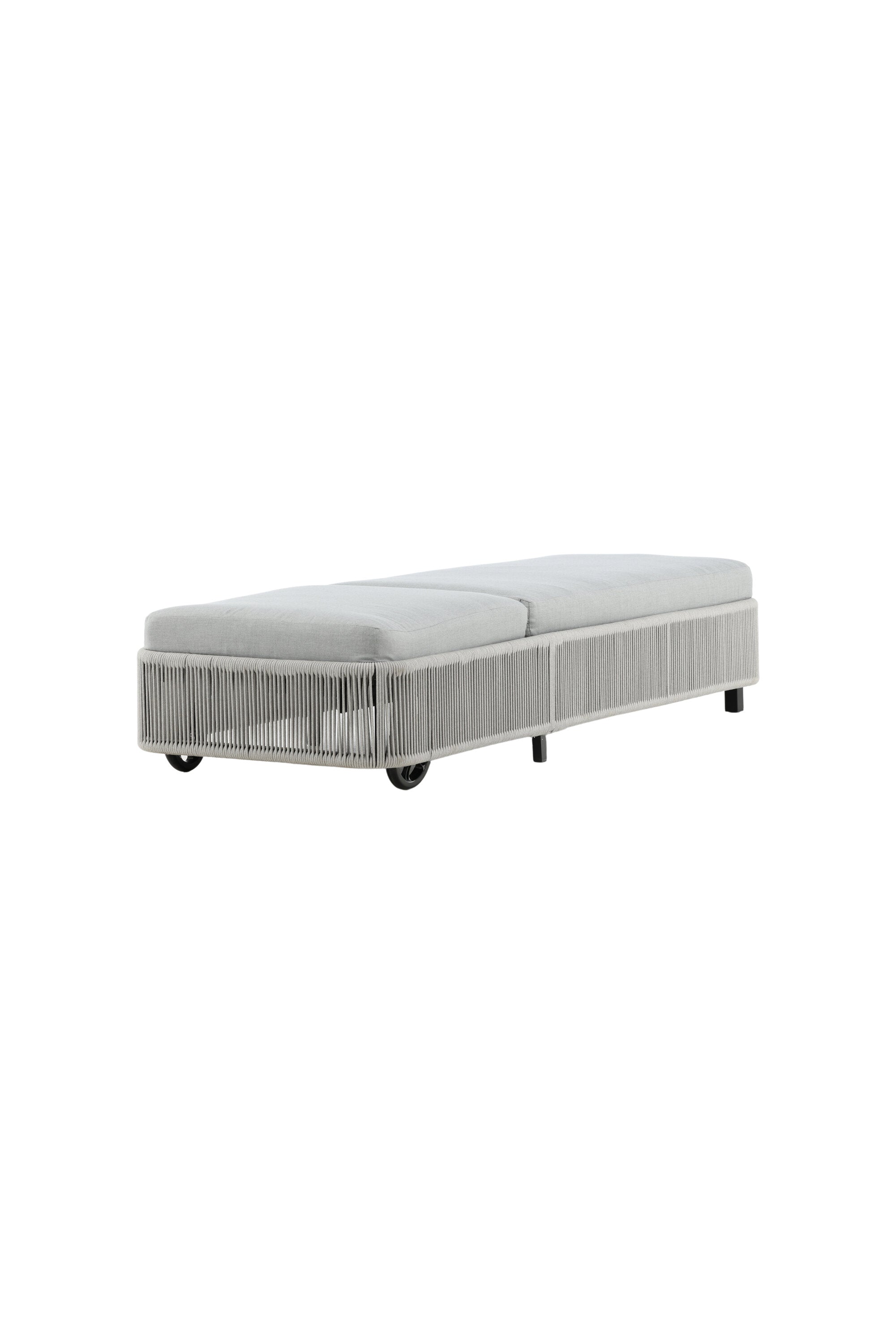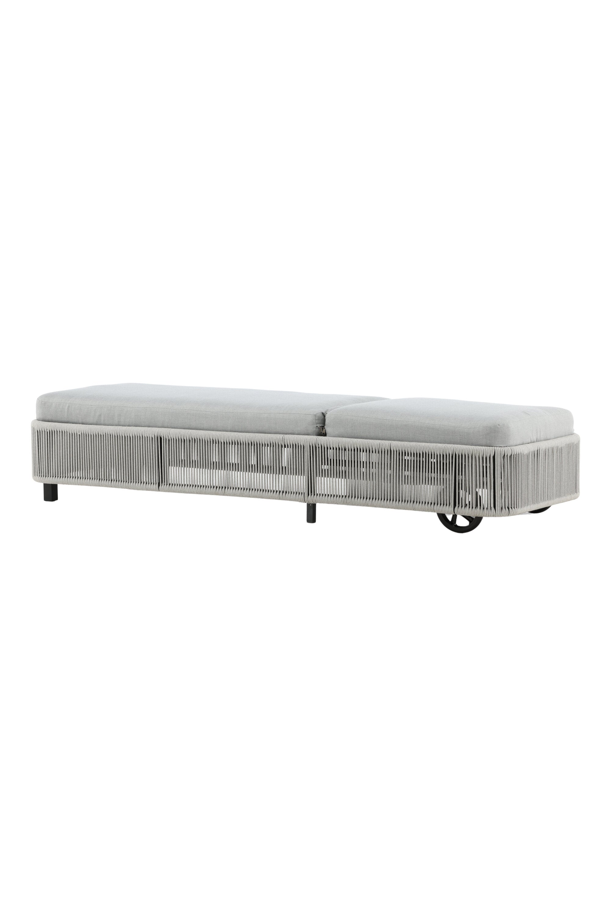 Klasické solárium vyrobené z šedých lan s přidruženými polštáři. Umístěte přesně tam, kde chcete být snadno přemístěni pomocí kolečka. Užijte si zde horký letní den na slunci!