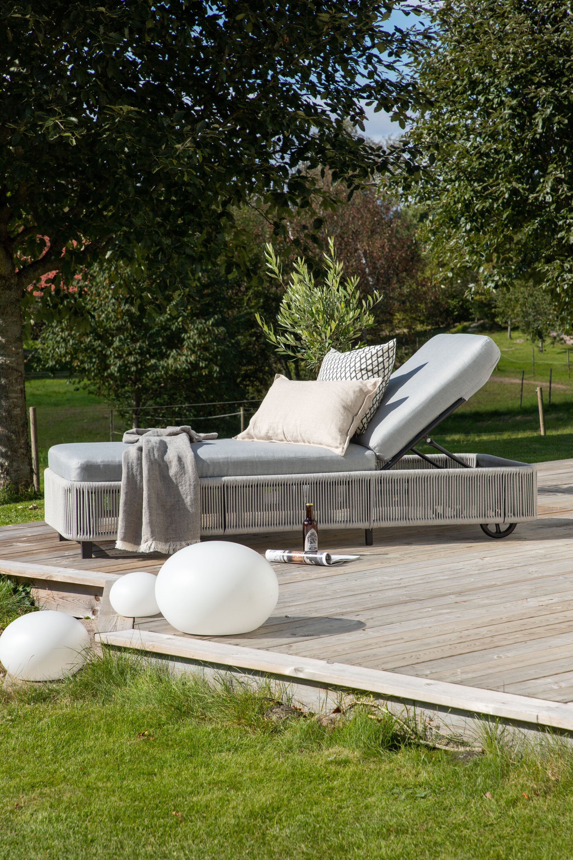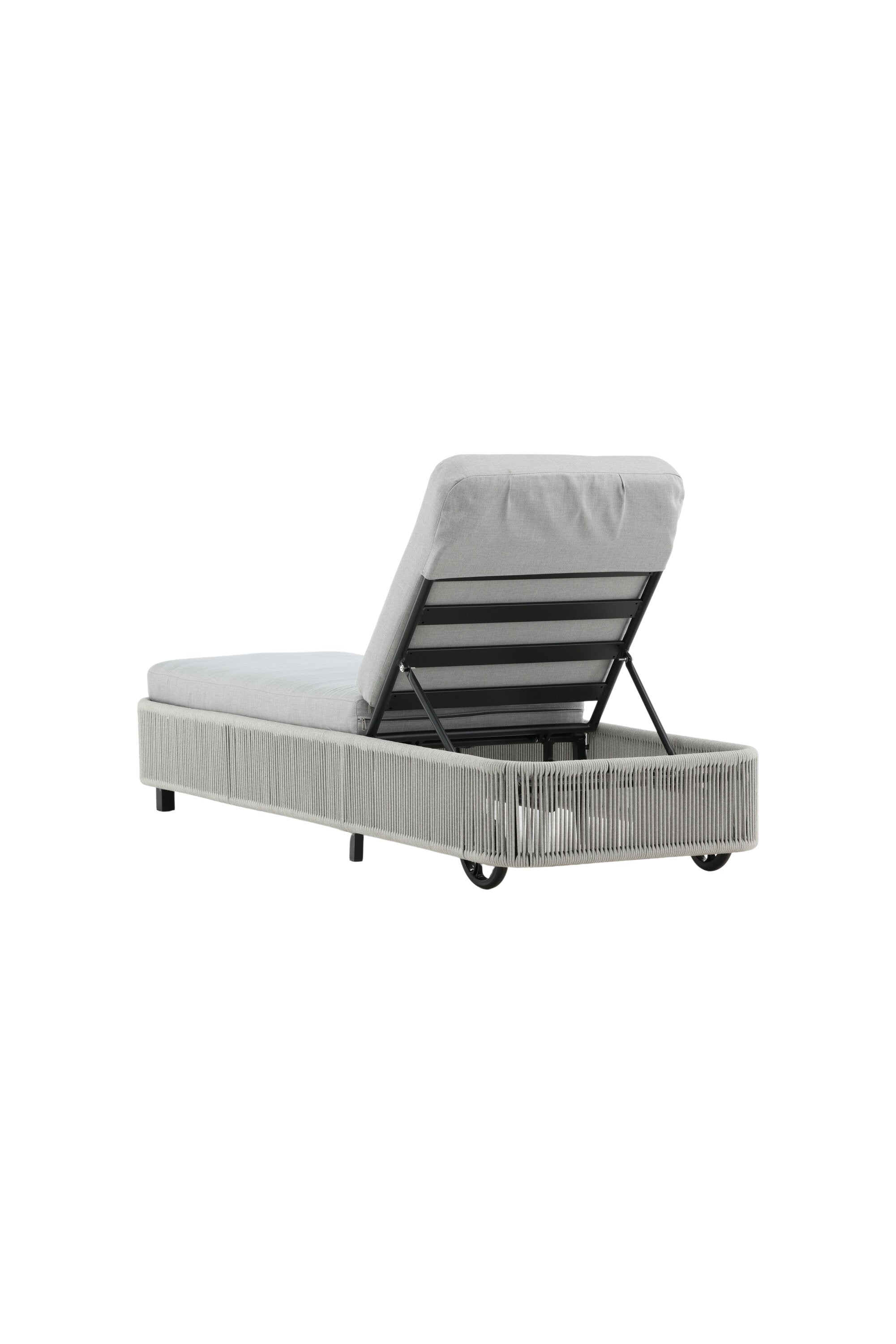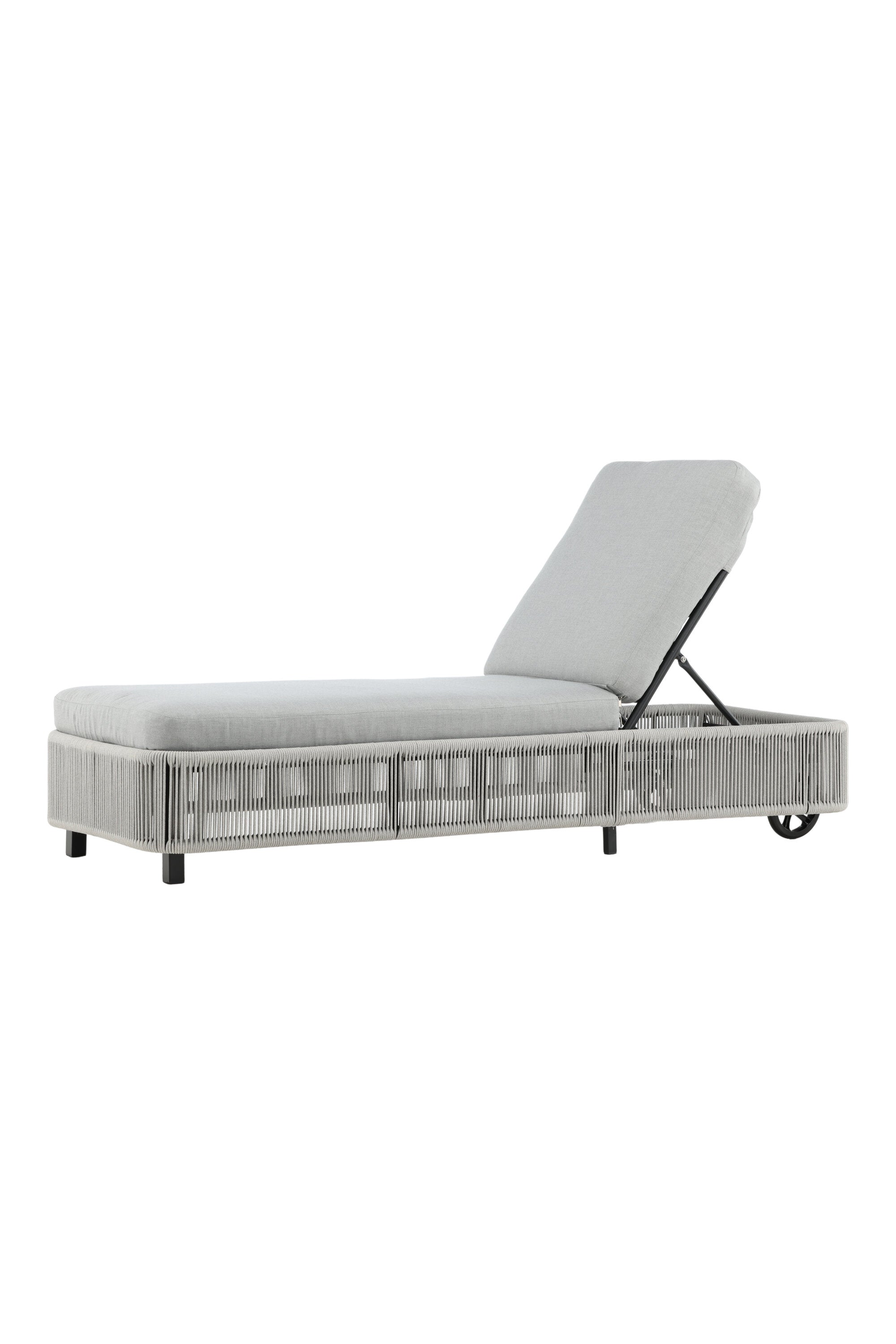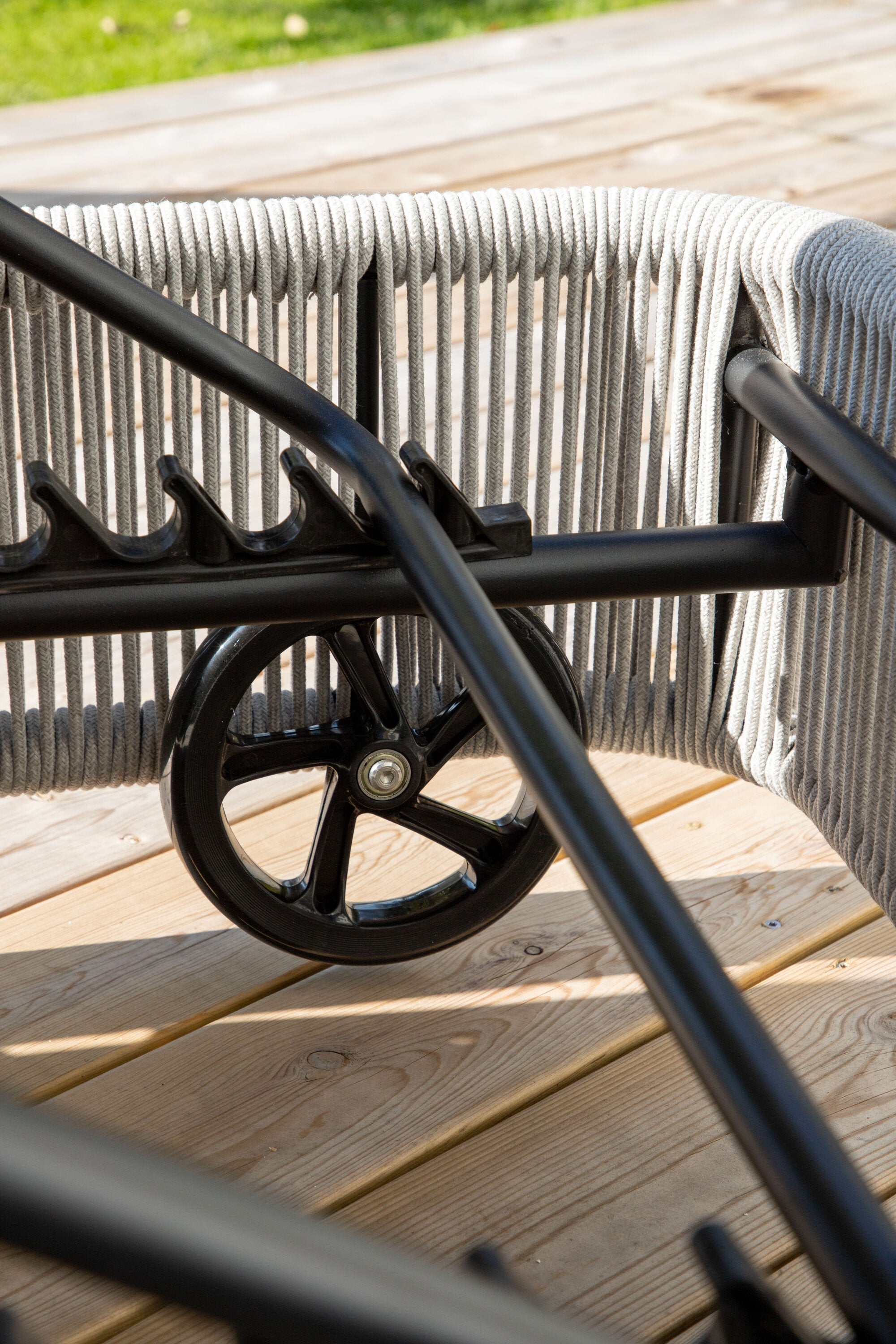 Klasické solárium vyrobené z šedých lan s přidruženými polštáři. Umístěte přesně tam, kde chcete být snadno přemístěni pomocí kolečka. Užijte si zde horký letní den na slunci!