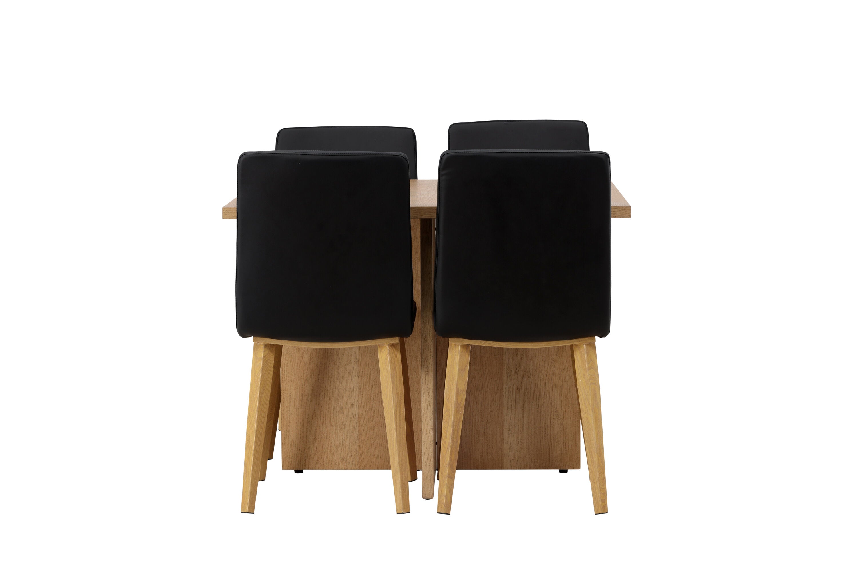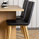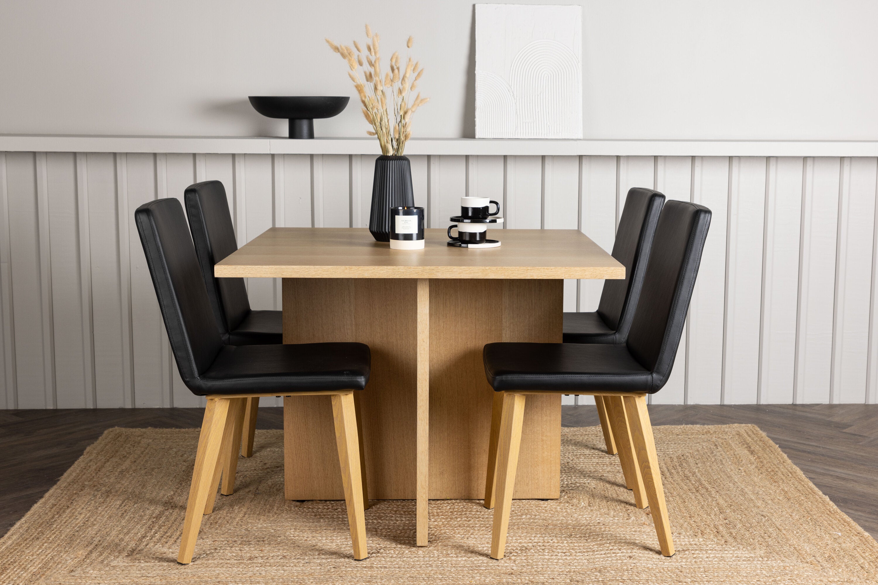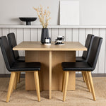 Spárováno s našimi černými jídelními židlemi Dnes se tato jídelní souprava stává dokonalou kombinací stylu a pohodlí. Tato židle se pyšní rovnými severskými liniemi s celočalouněným sedákem z černé umělé kůže. Nohy židle se jemně rozprostírají v přírodním dřevě, což poskytuje stabilitu a skvěle ladí s jídelním stolem.