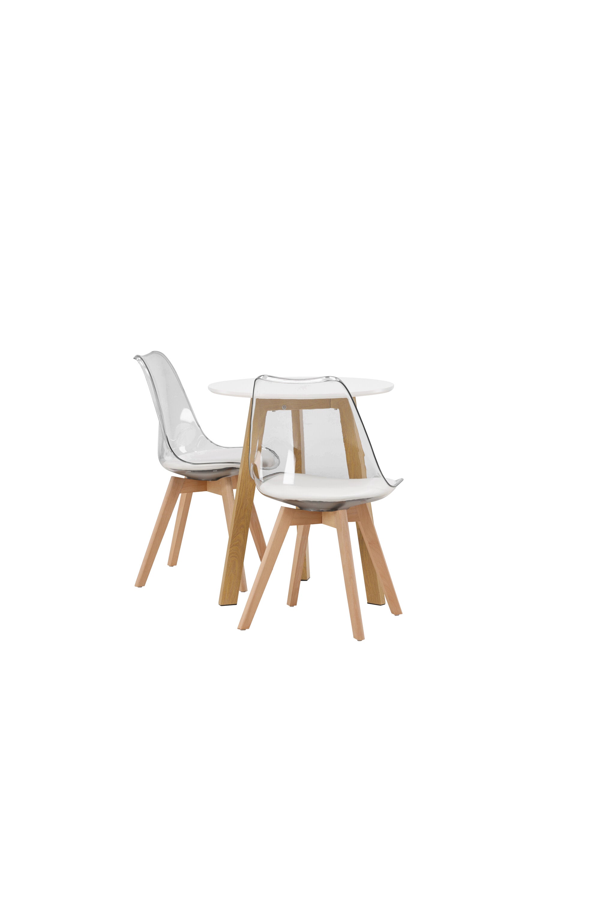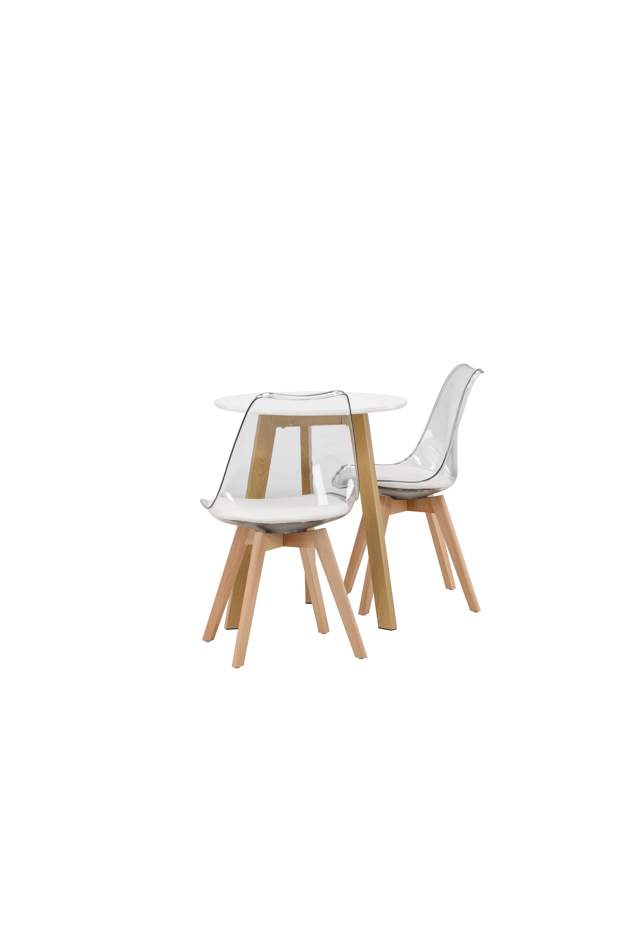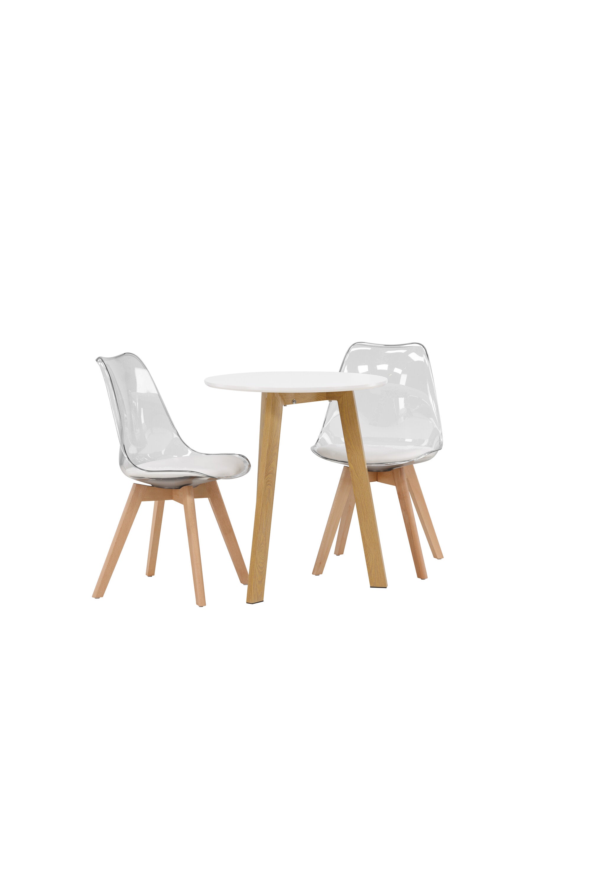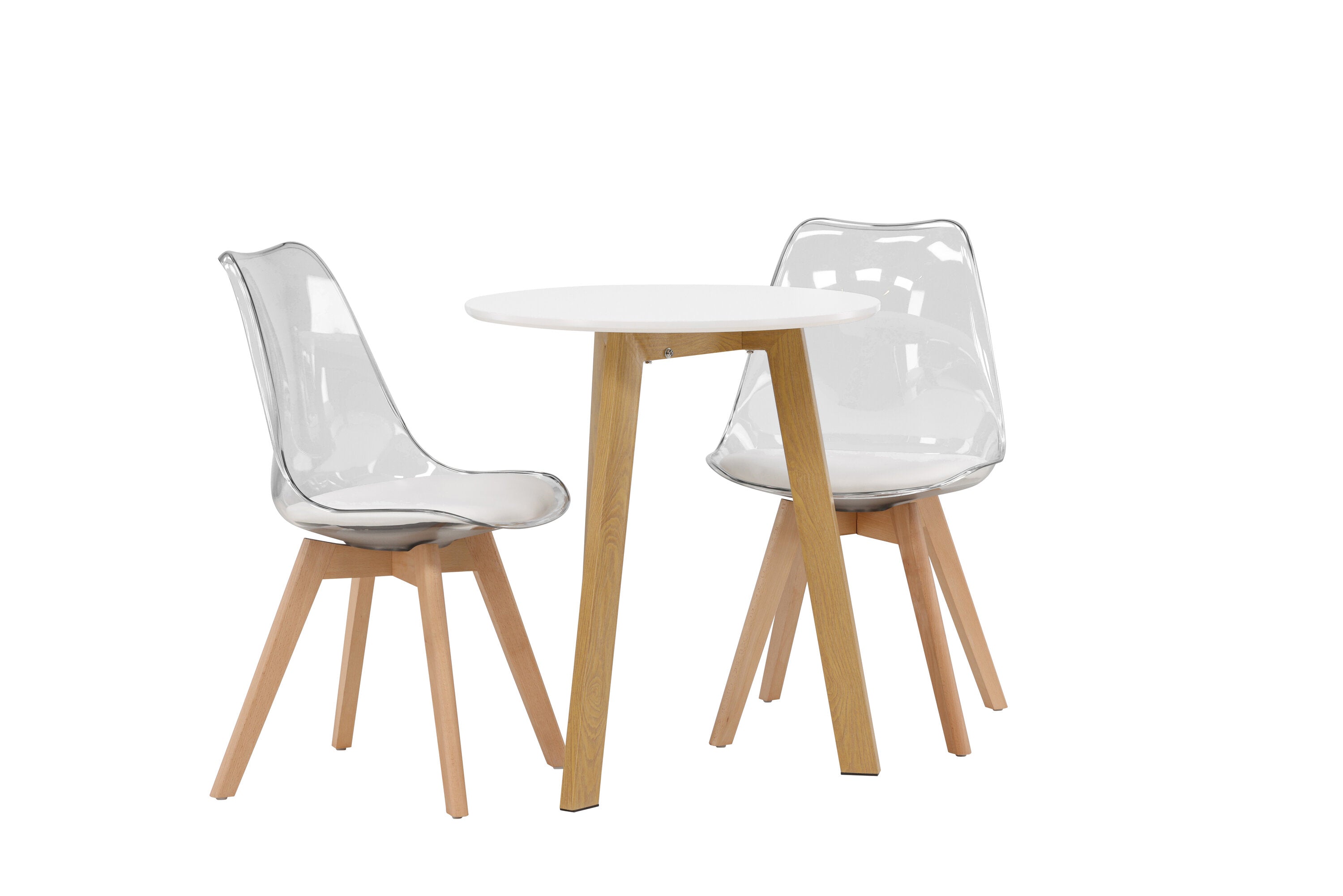 Vytvořte si u vás doma módní atmosféru! Kulatý jídelní stůl Leonora má kulatou desku z bílé MDF a třínohý rám v krásném dubovém vzhledu. Zde společně s chytrými a trendy jídelními židlemi ze série Edvin. Transparentní sedák je z PET s bílým sedákem pro větší pohodlí a nohy židle jsou mírně rozšířené v přírodním dřevě. Tato kombinace vyzařuje trendy! Průměr stolu: 65 cm.