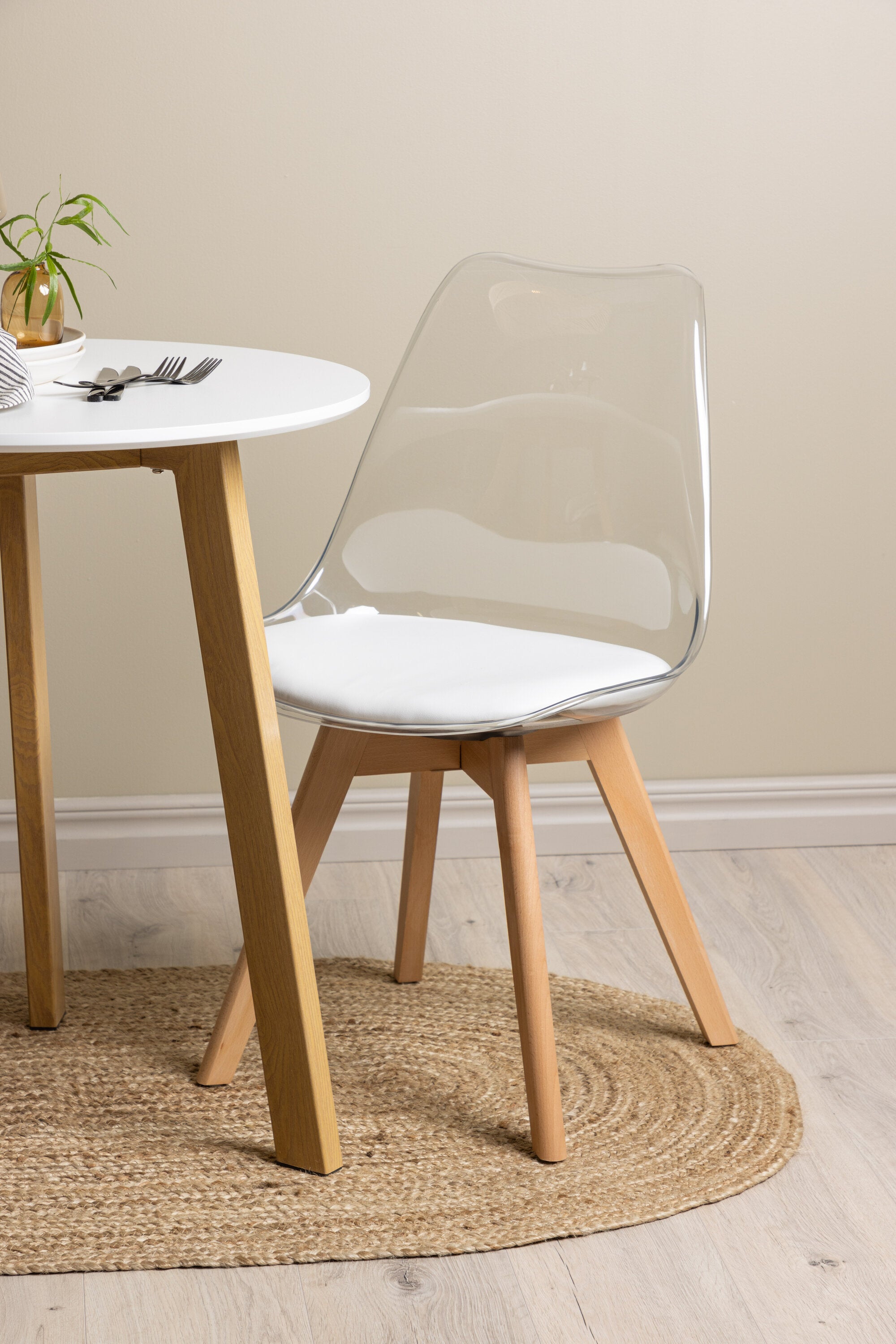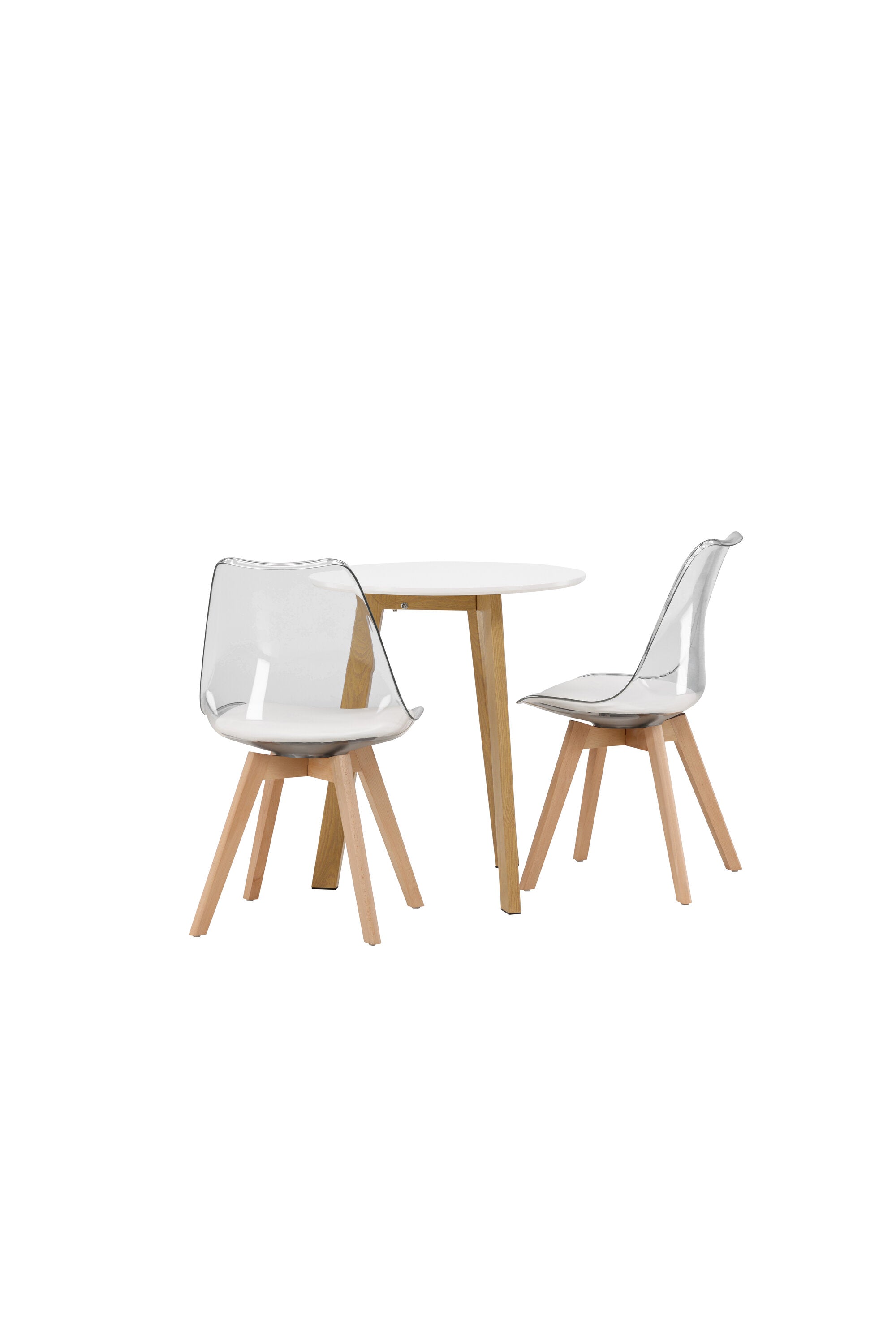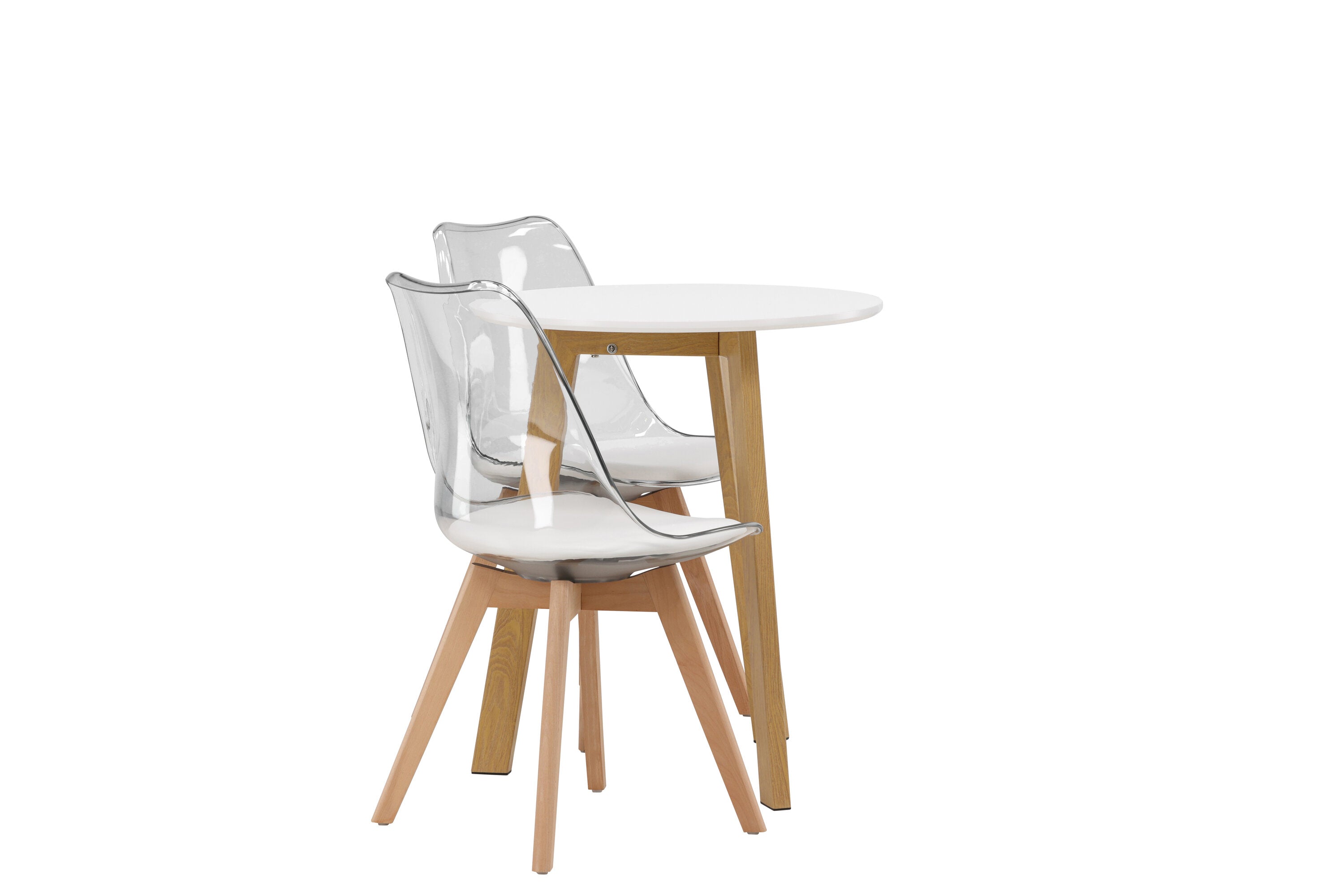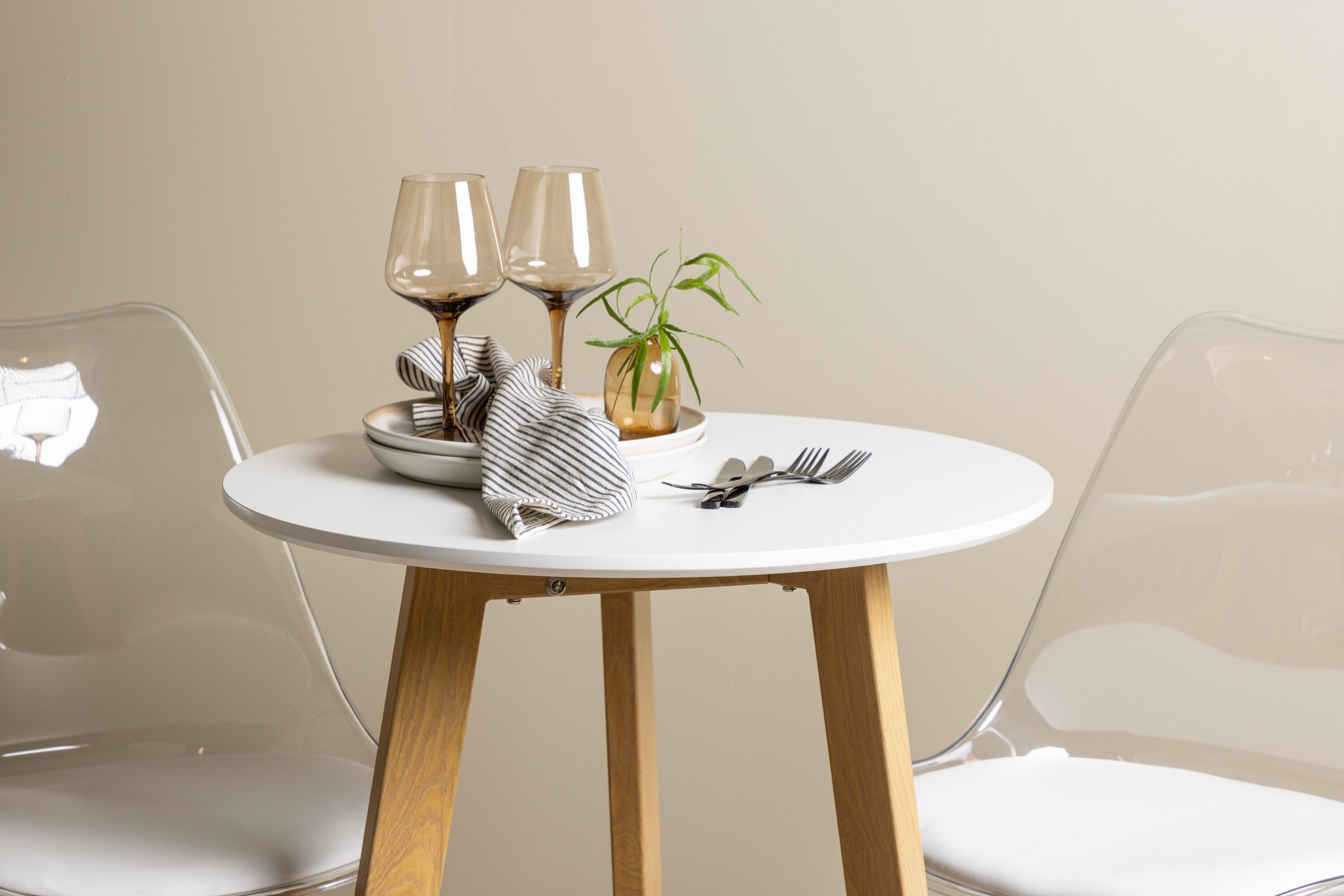 Vytvořte si u vás doma módní atmosféru! Kulatý jídelní stůl Leonora má kulatou desku z bílé MDF a třínohý rám v krásném dubovém vzhledu. Zde společně s chytrými a trendy jídelními židlemi ze série Edvin. Transparentní sedák je z PET s bílým sedákem pro větší pohodlí a nohy židle jsou mírně rozšířené v přírodním dřevě. Tato kombinace vyzařuje trendy! Průměr stolu: 65 cm.