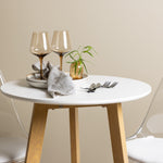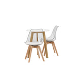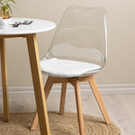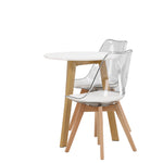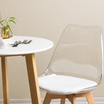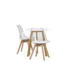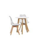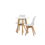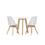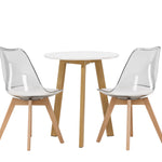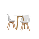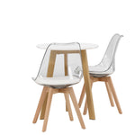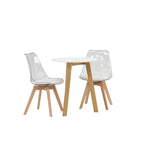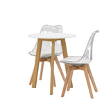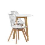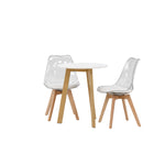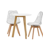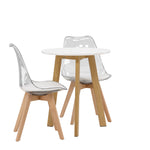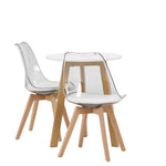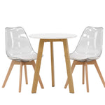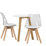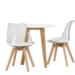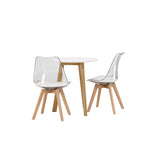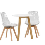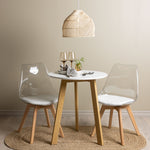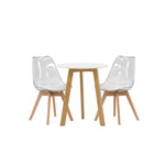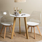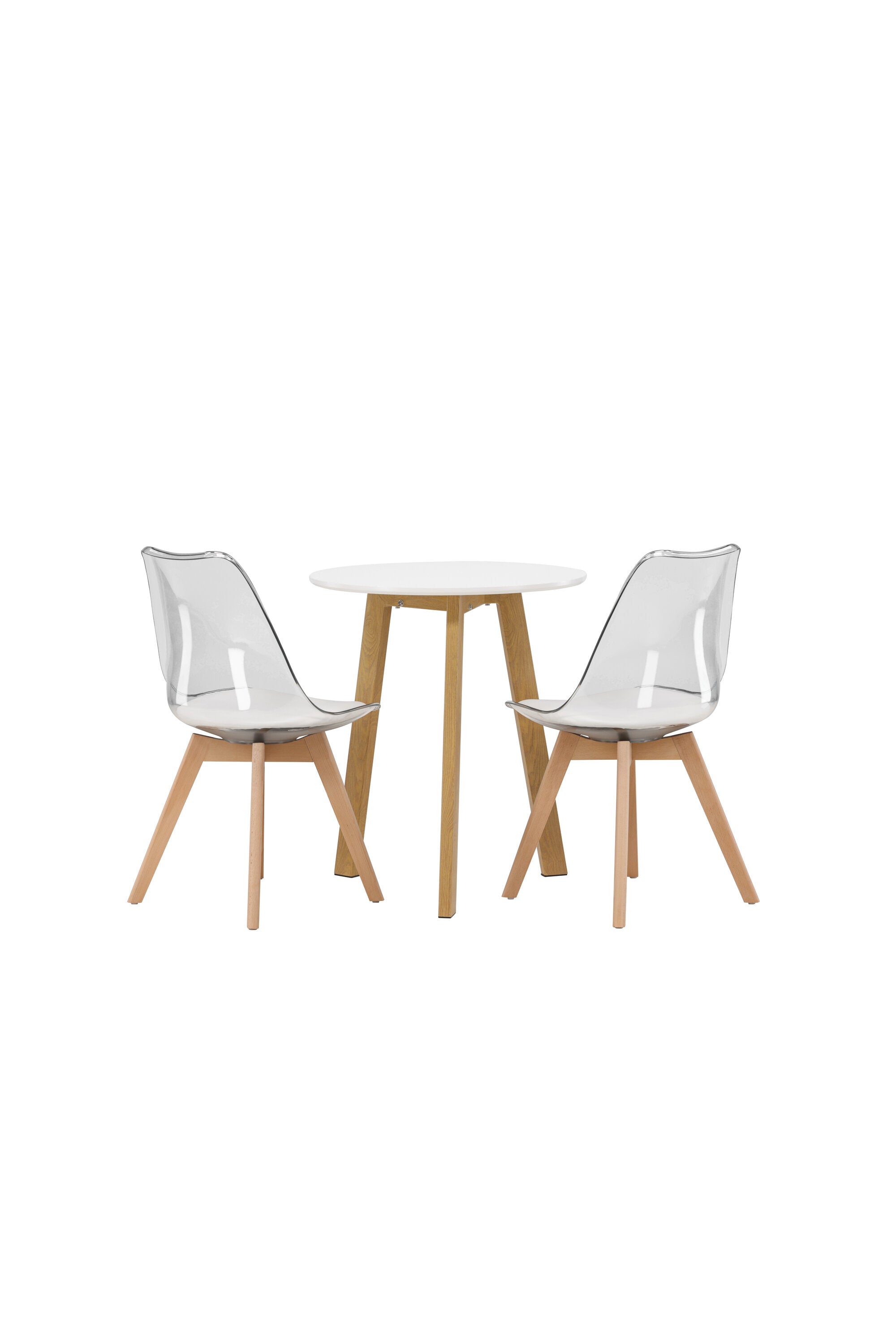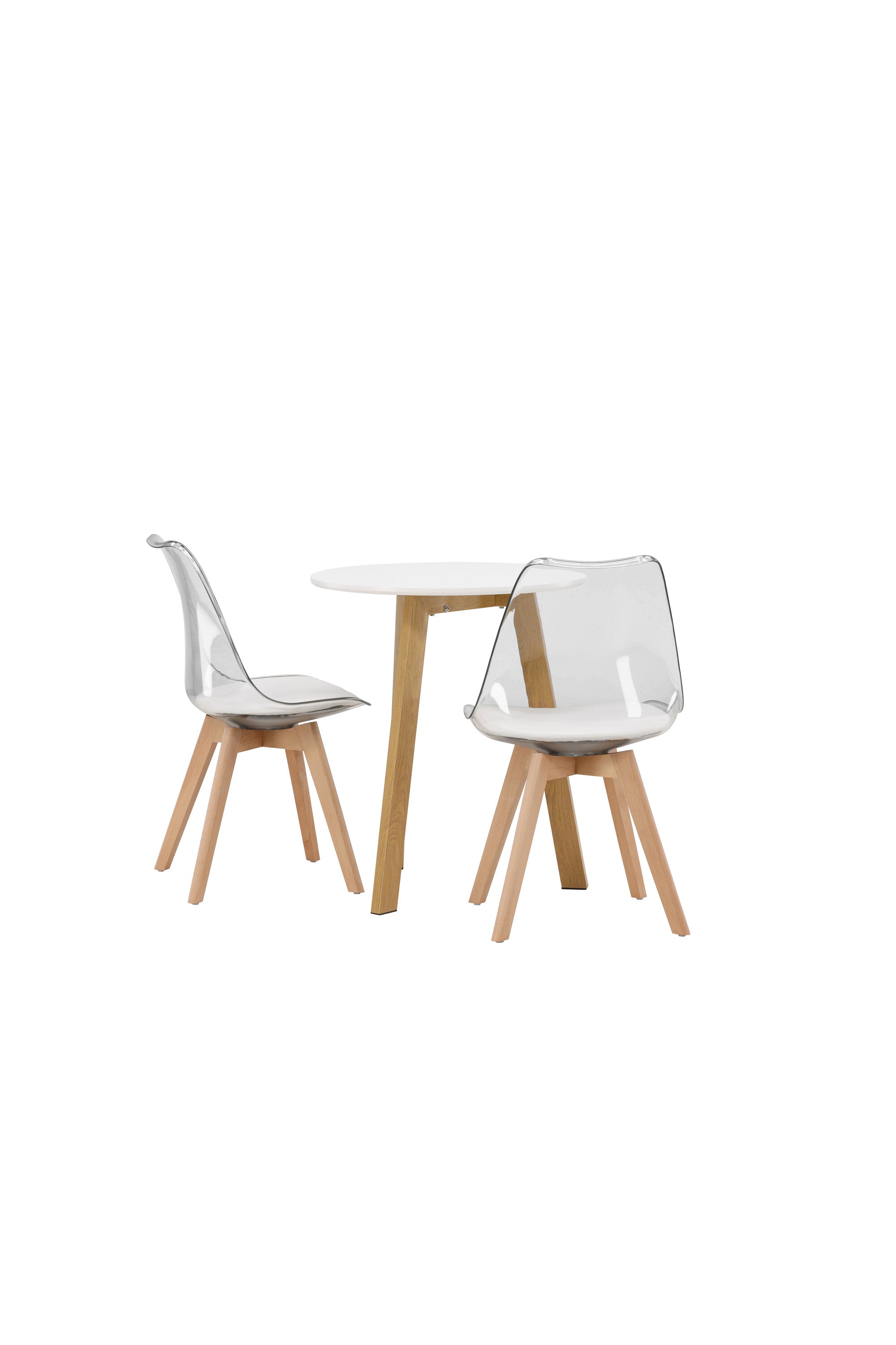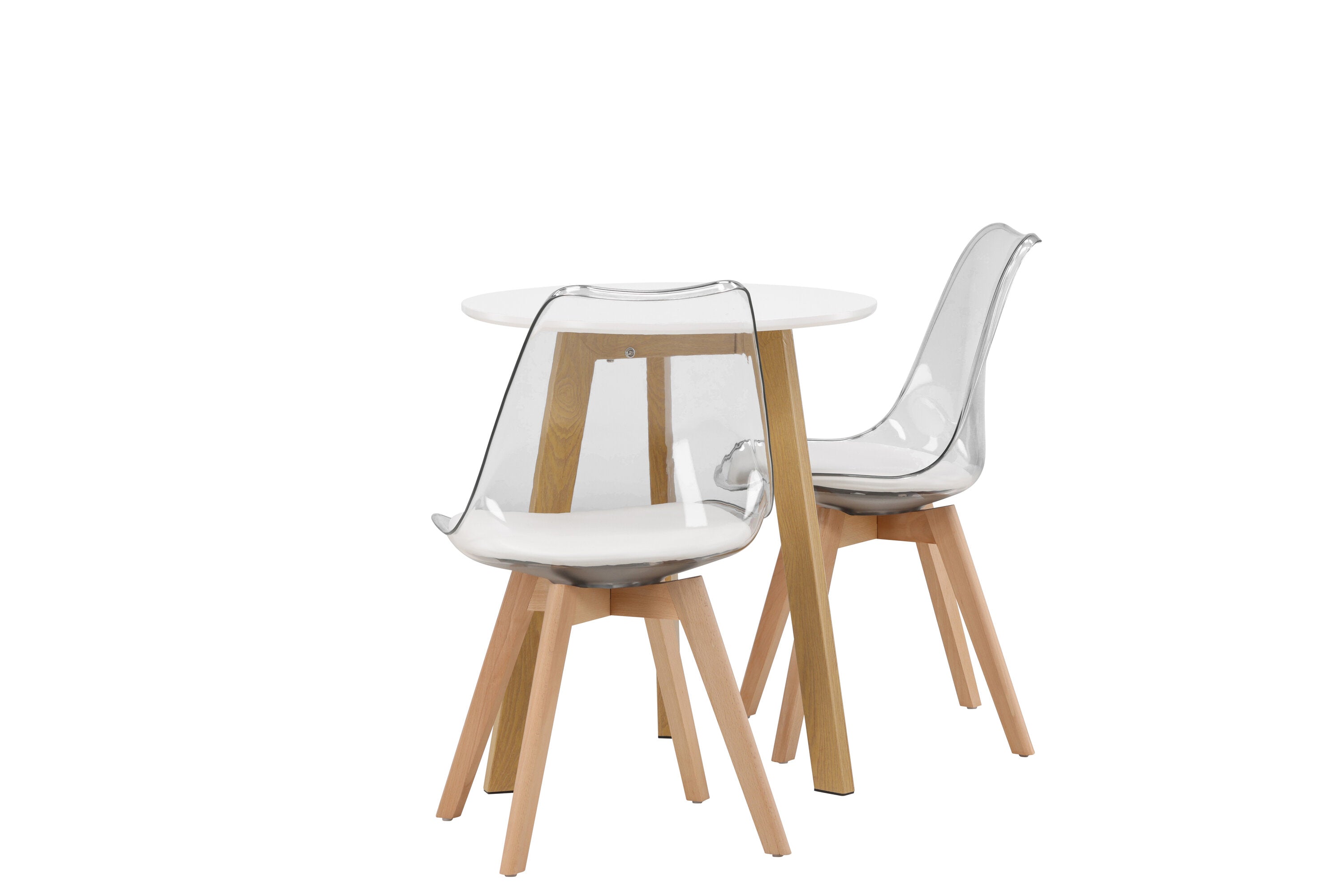 Vytvořte si u vás doma módní atmosféru! Kulatý jídelní stůl Leonora má kulatou desku z bílé MDF a třínohý rám v krásném dubovém vzhledu. Zde společně s chytrými a trendy jídelními židlemi ze série Edvin. Transparentní sedák je z PET s bílým sedákem pro větší pohodlí a nohy židle jsou mírně rozšířené v přírodním dřevě. Tato kombinace vyzařuje trendy! Průměr stolu: 65 cm.